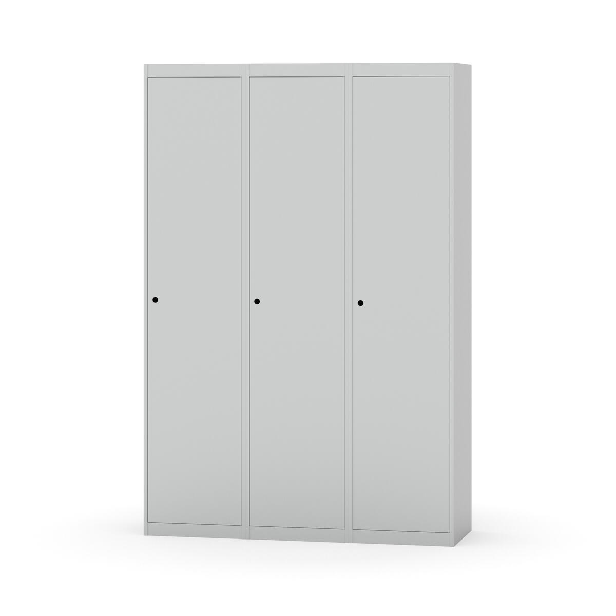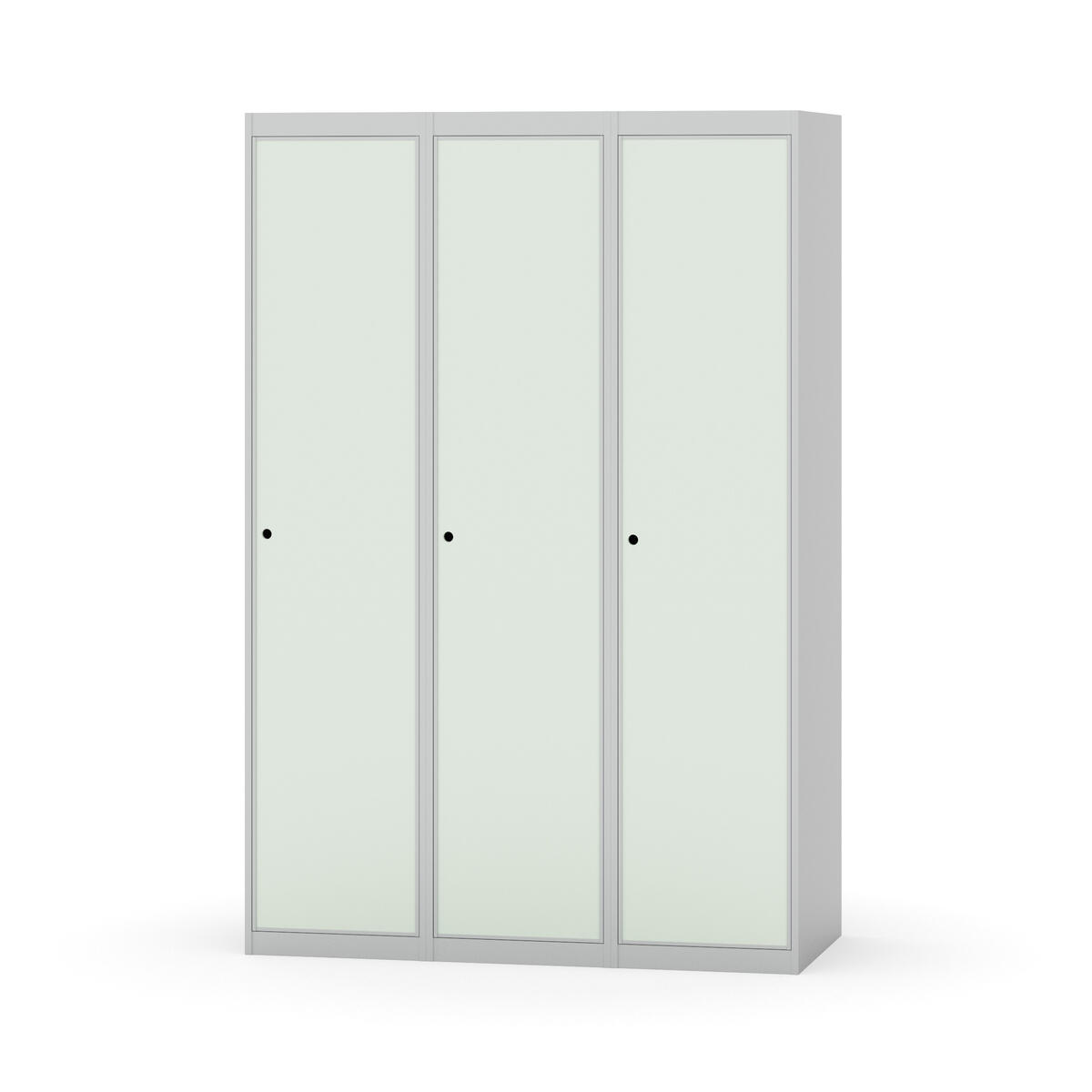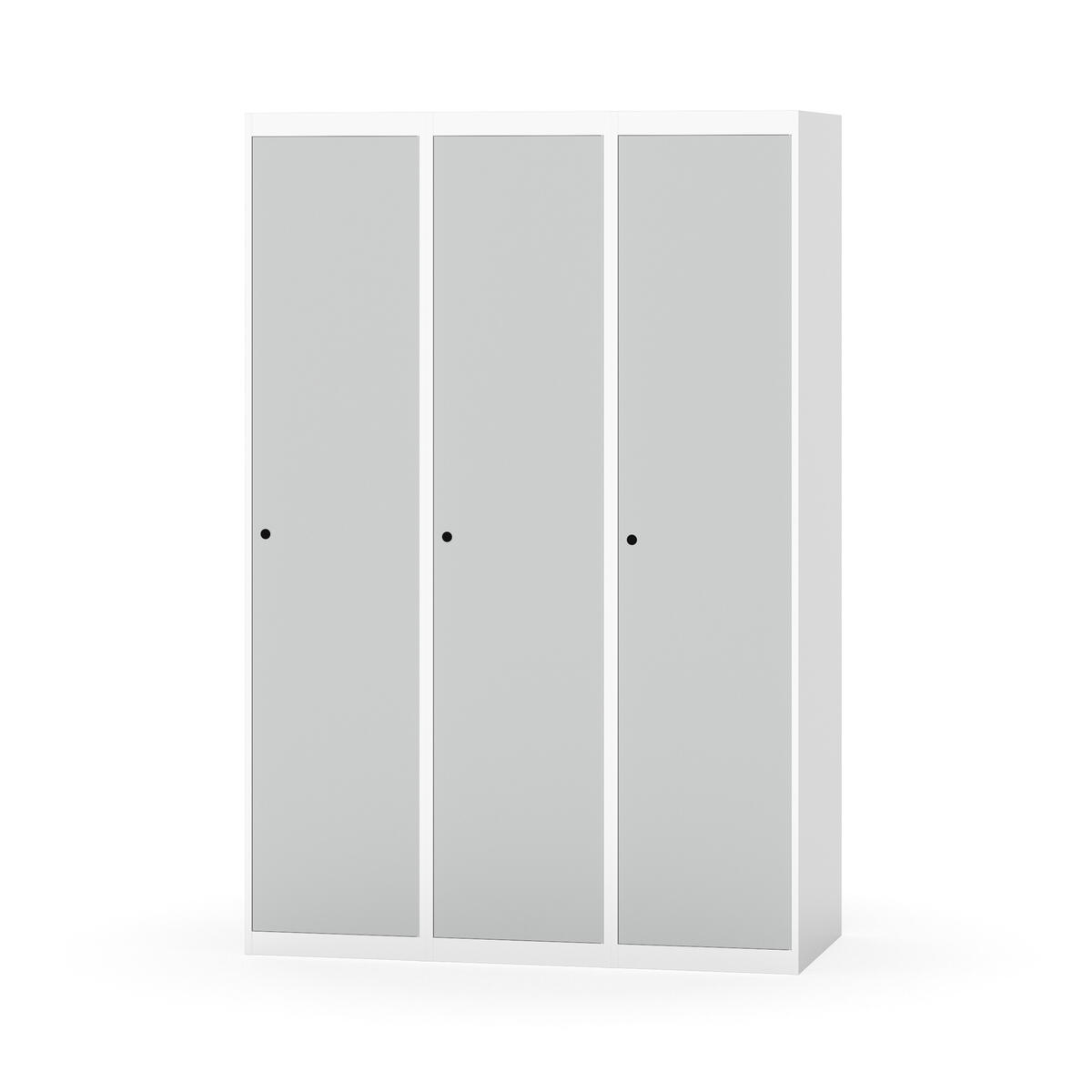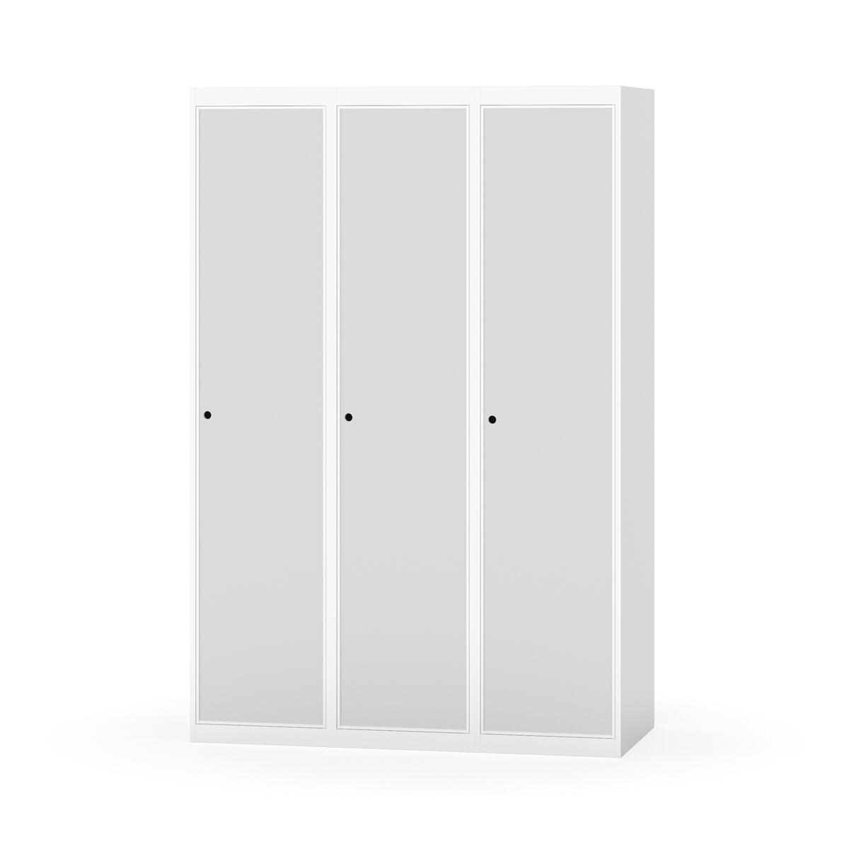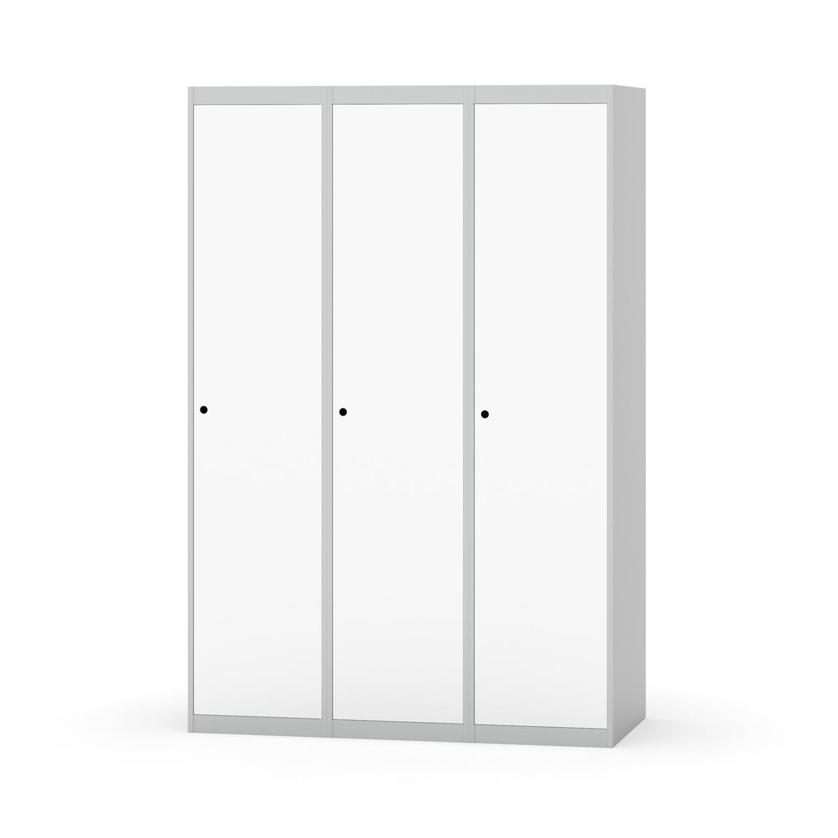 Klädskåp med helsvetsad stomme. Välj mellan plåt eller laminatdörr. Plåtdörren är försedd med dörrstopp i stål och infälld förstärkning kring låshålet. Laminatdörr infälld i stålram försedd med dörrstopp i stål. Dörrar är öppningsbara 90 grader. Inredning: Hyllplan och klädstång med två ankarkrokar. Slät golvyta utan tröskel. Ventilation genom hål i tak-/bottenplåt. Observera att lås och underrede beställs på separata artikelnummer. Lås kommer att vara monterade på skåp vid leverans. Valt underrede monteras på plats.