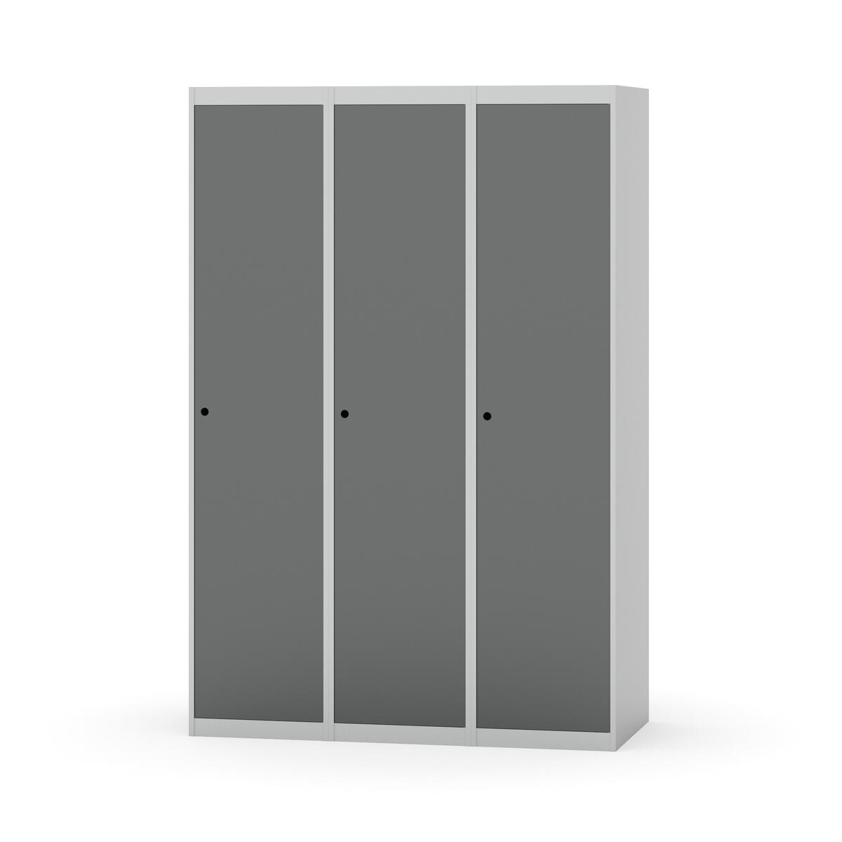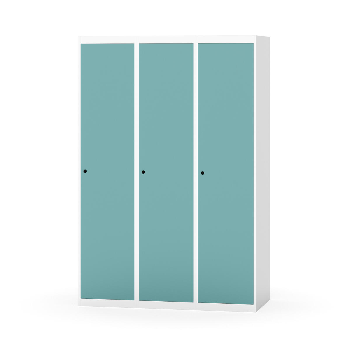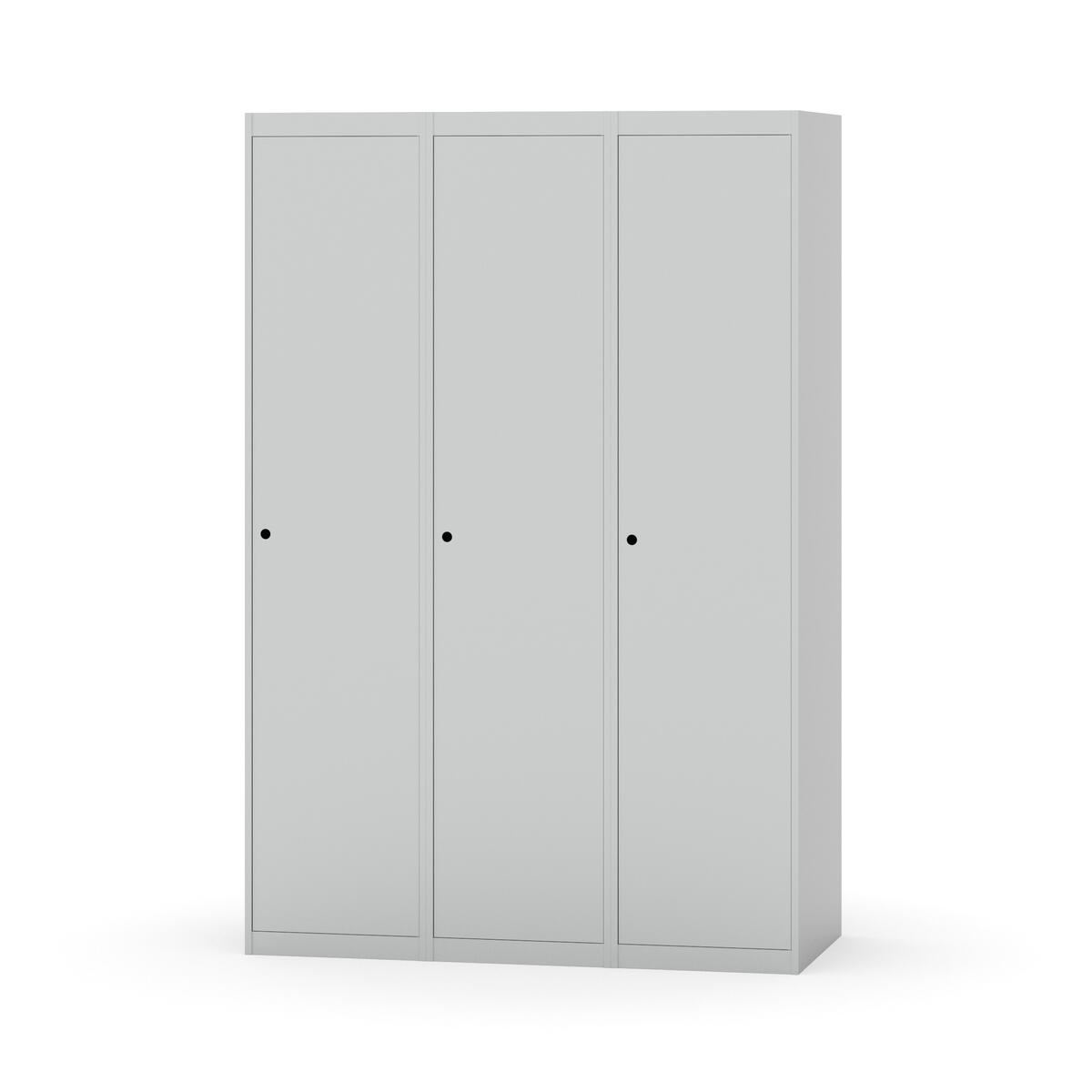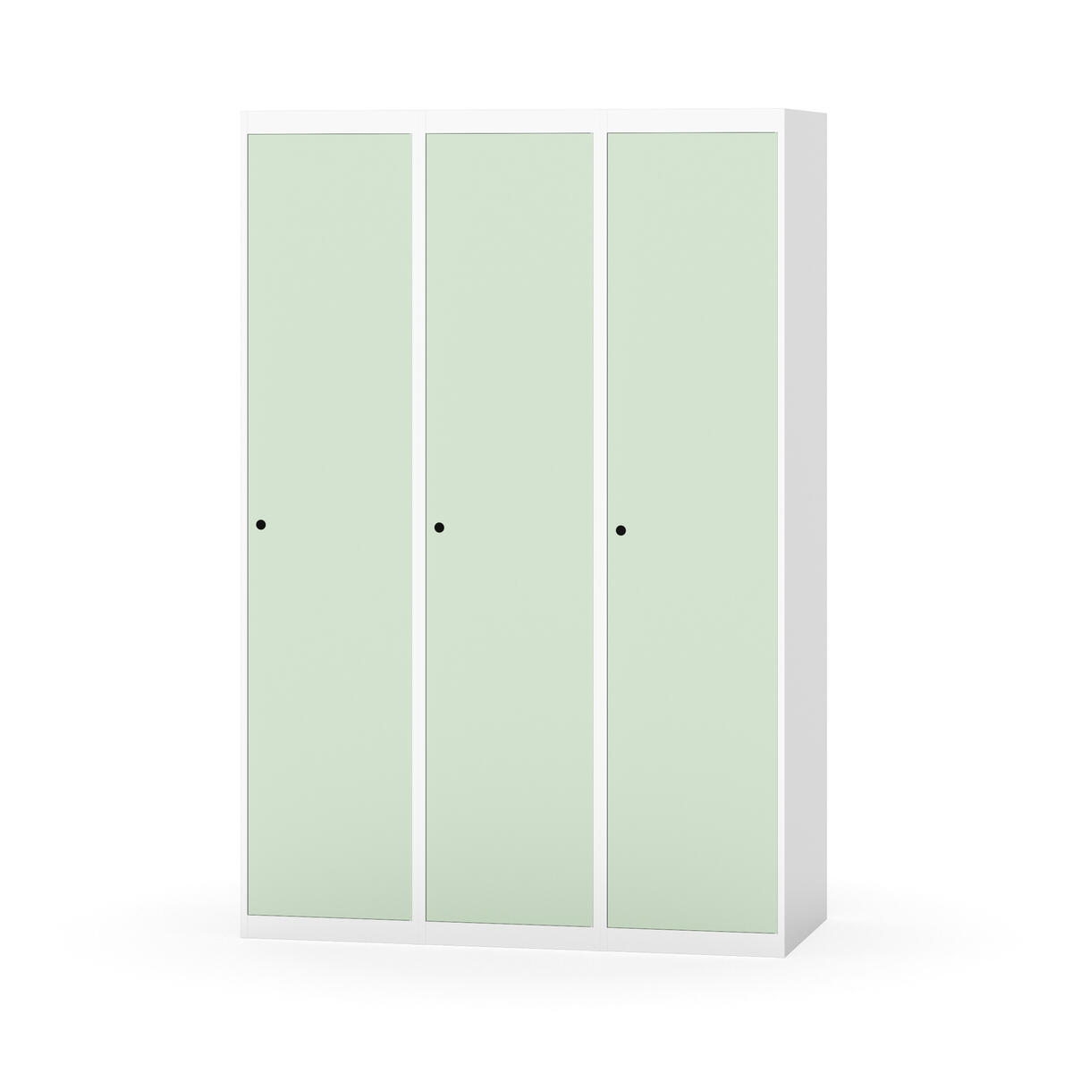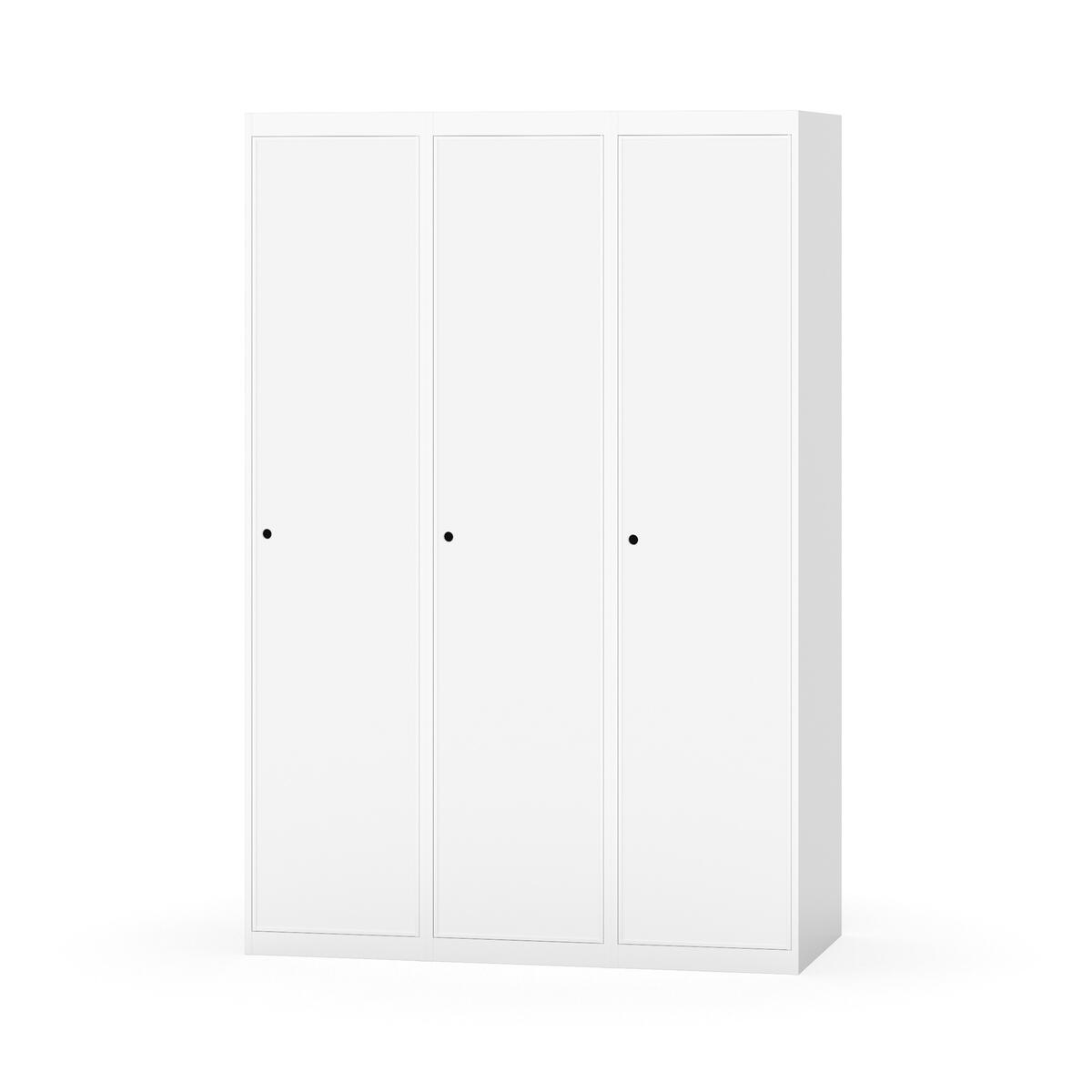 Klädskåp med helsvetsad stomme. Välj mellan plåt eller laminatdörr. Plåtdörren är försedd med dörrstopp i stål och infälld förstärkning kring låshålet. Laminatdörr infälld i stålram försedd med dörrstopp i stål. Dörrar är öppningsbara 90 grader. Inredning: Hyllplan och klädstång med två ankarkrokar. Slät golvyta utan tröskel. Ventilation genom hål i tak-/bottenplåt. Observera att lås och underrede beställs på separata artikelnummer. Lås kommer att vara monterade på skåp vid leverans. Valt underrede monteras på plats.