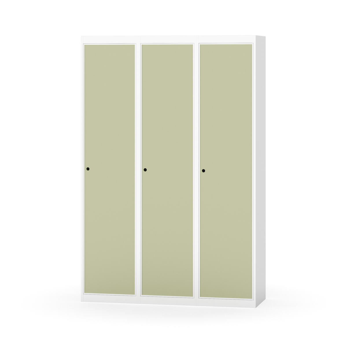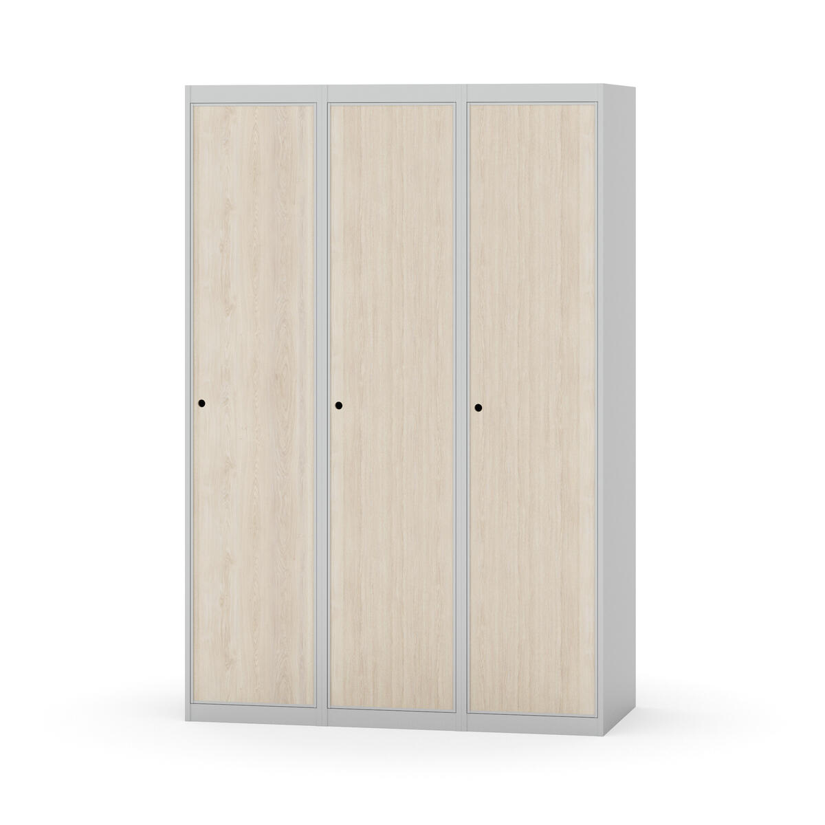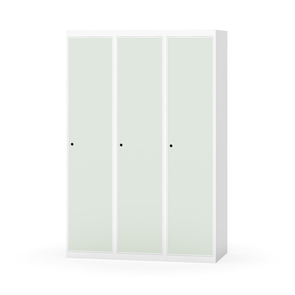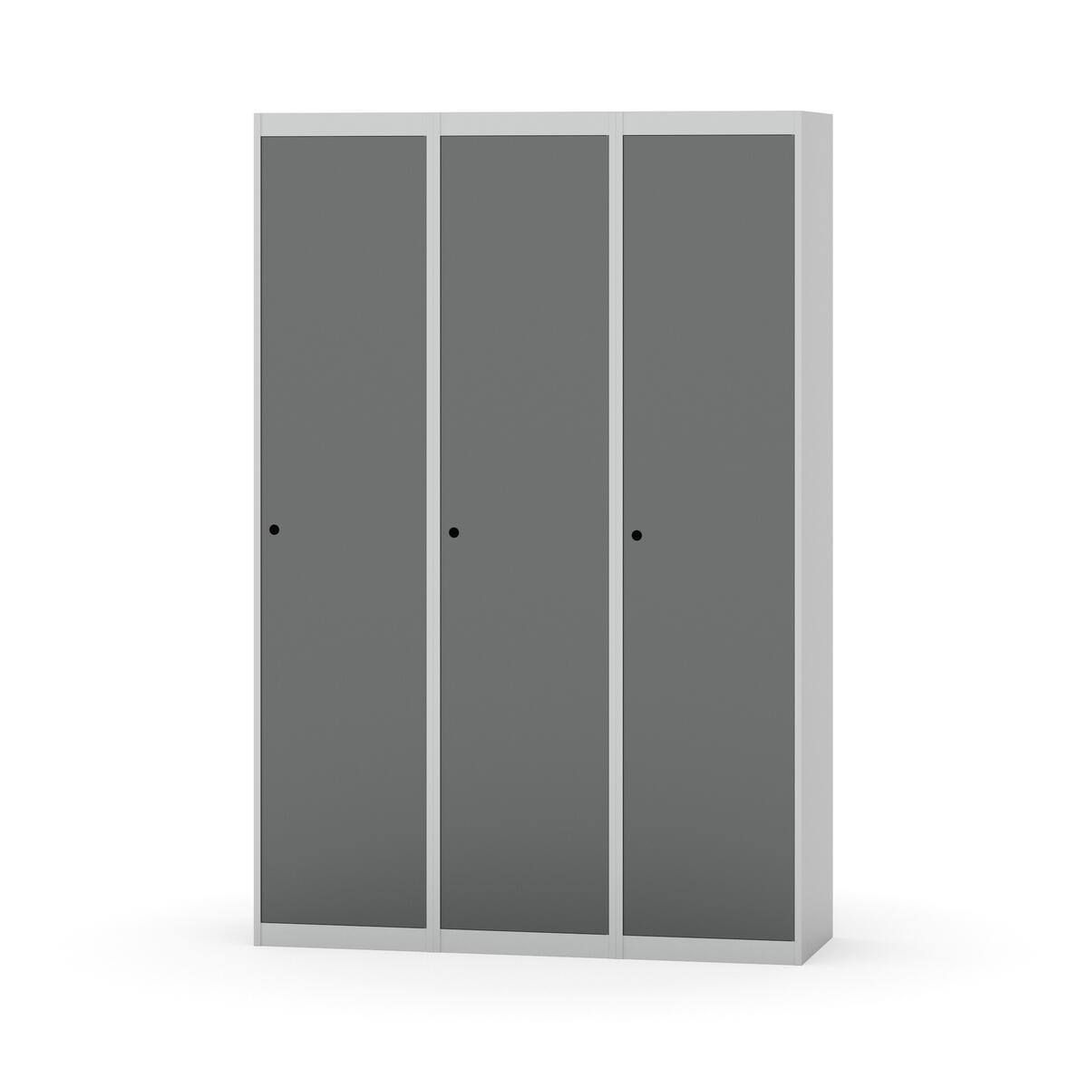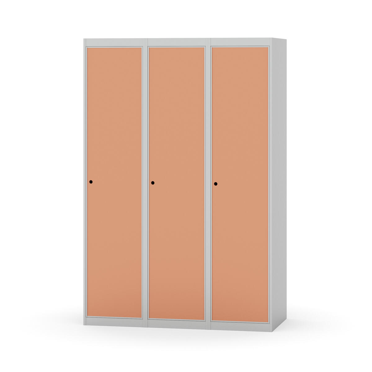 Klädskåp med helsvetsad stomme. Välj mellan plåt eller laminatdörr. Plåtdörren är försedd med dörrstopp i stål och infälld förstärkning kring låshålet. Laminatdörr infälld i stålram försedd med dörrstopp i stål. Dörrar är öppningsbara 90 grader. Inredning: Hyllplan och klädstång med två ankarkrokar. Slät golvyta utan tröskel. Ventilation genom hål i tak-/bottenplåt. Observera att lås och underrede beställs på separata artikelnummer. Lås kommer att vara monterade på skåp vid leverans. Valt underrede monteras på plats.