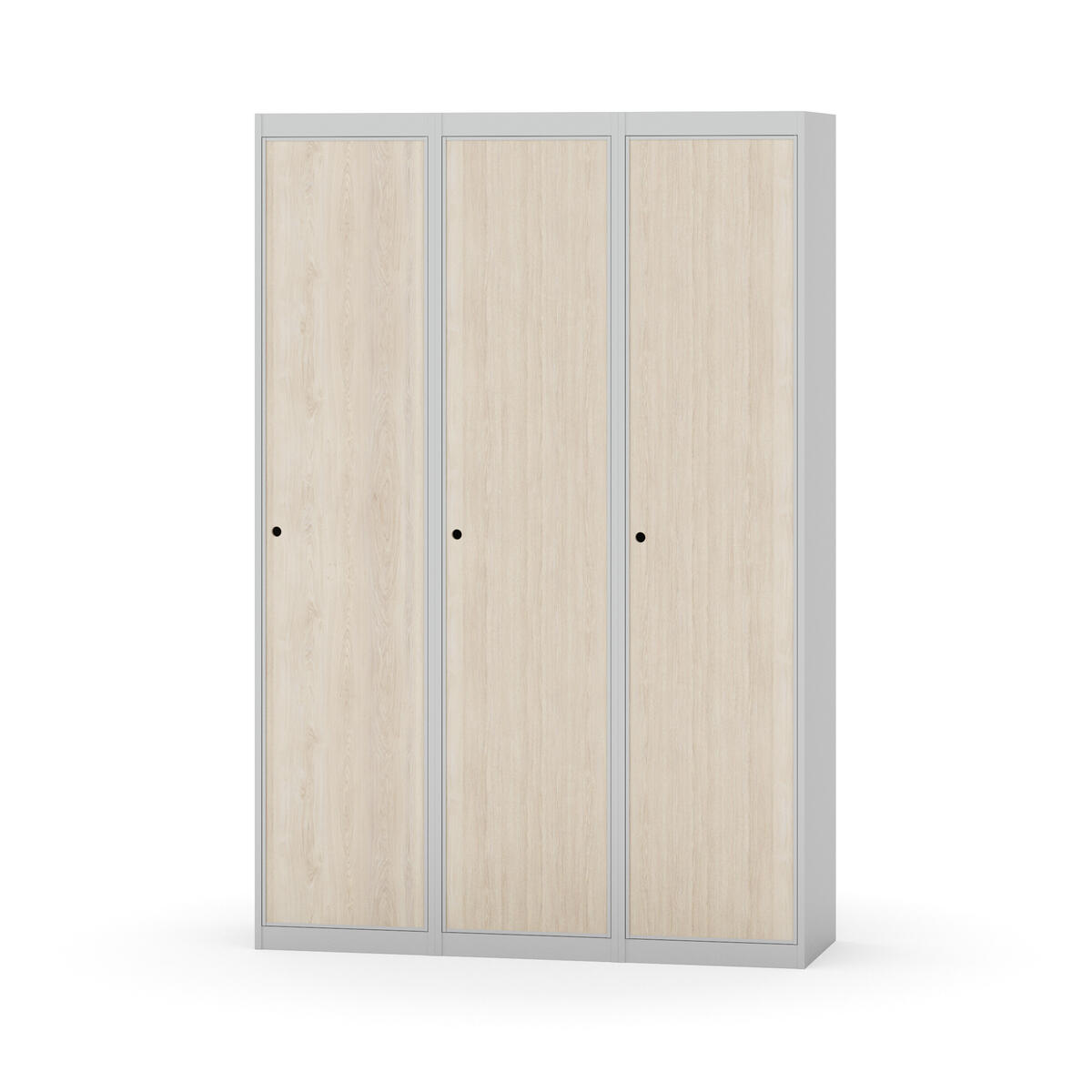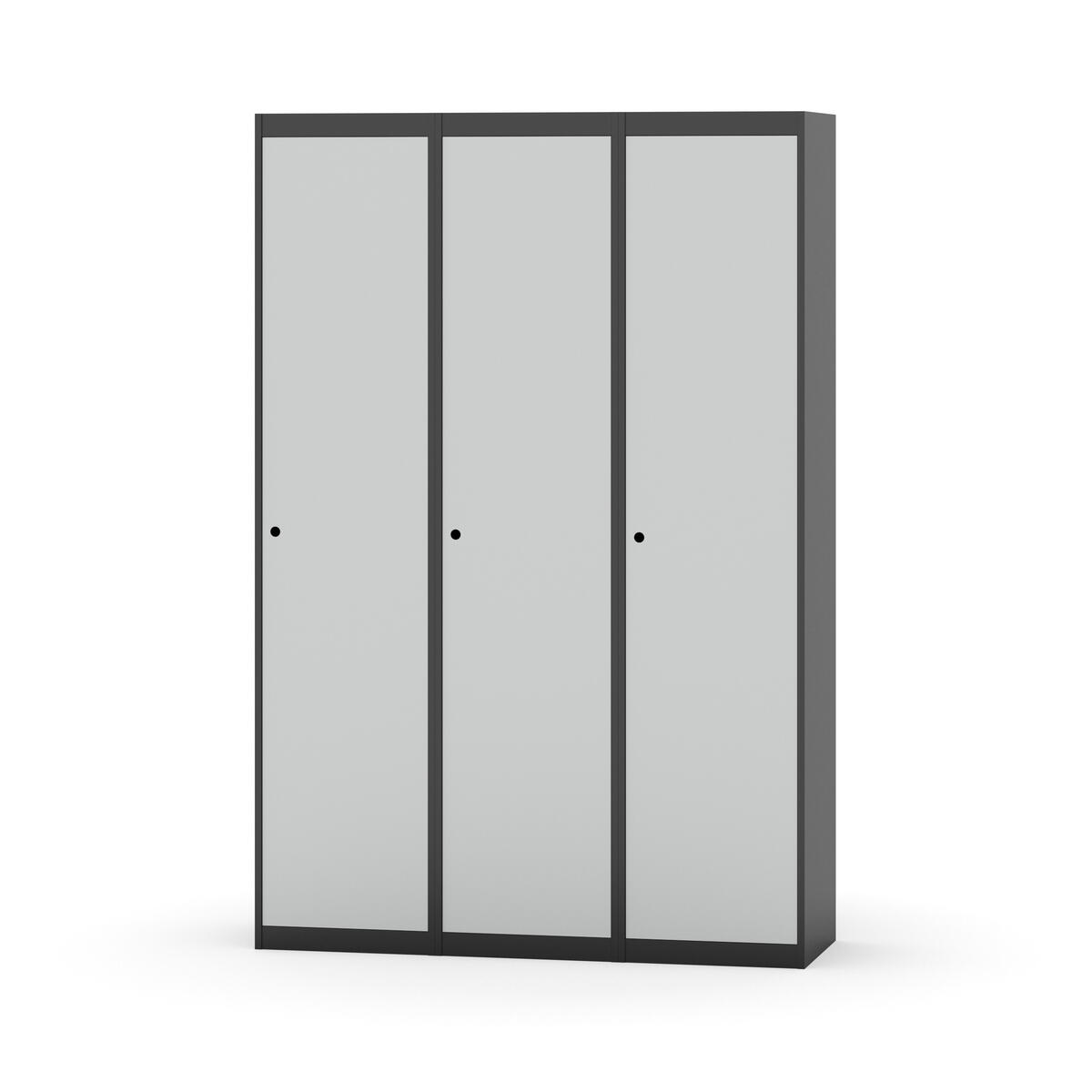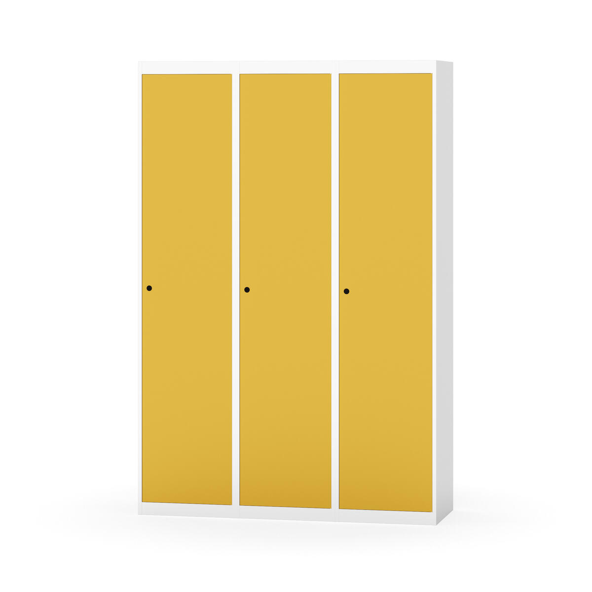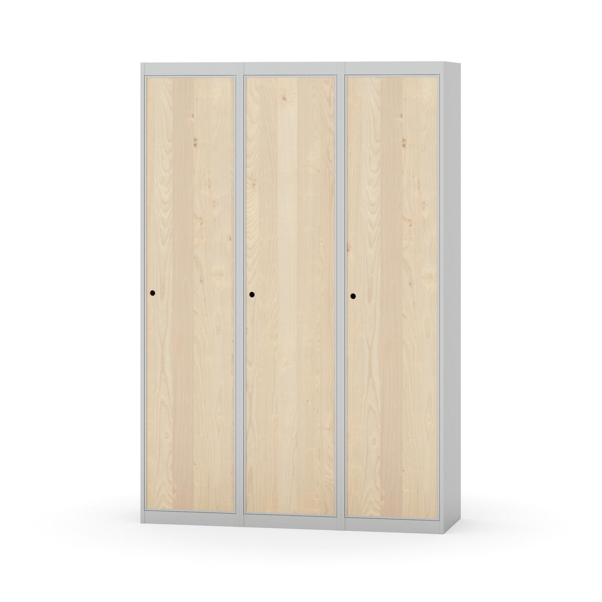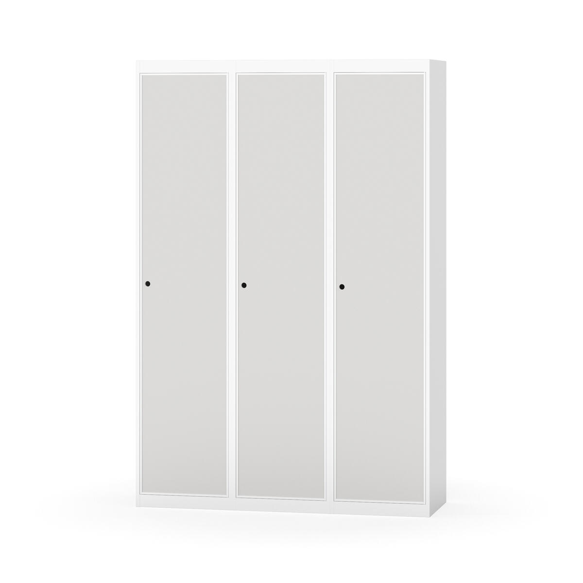 Klädskåp med helsvetsad stomme. Välj mellan plåt eller laminatdörr. Plåtdörren är försedd med dörrstopp i stål och infälld förstärkning kring låshålet. Laminatdörr infälld i stålram försedd med dörrstopp i stål. Dörrar är öppningsbara 90 grader. Inredning: Hyllplan och klädstång med två ankarkrokar. Slät golvyta utan tröskel. Ventilation genom hål i tak-/bottenplåt. Observera att lås och underrede beställs på separata artikelnummer. Lås kommer att vara monterade på skåp vid leverans. Valt underrede monteras på plats.