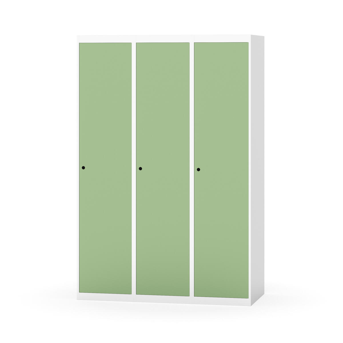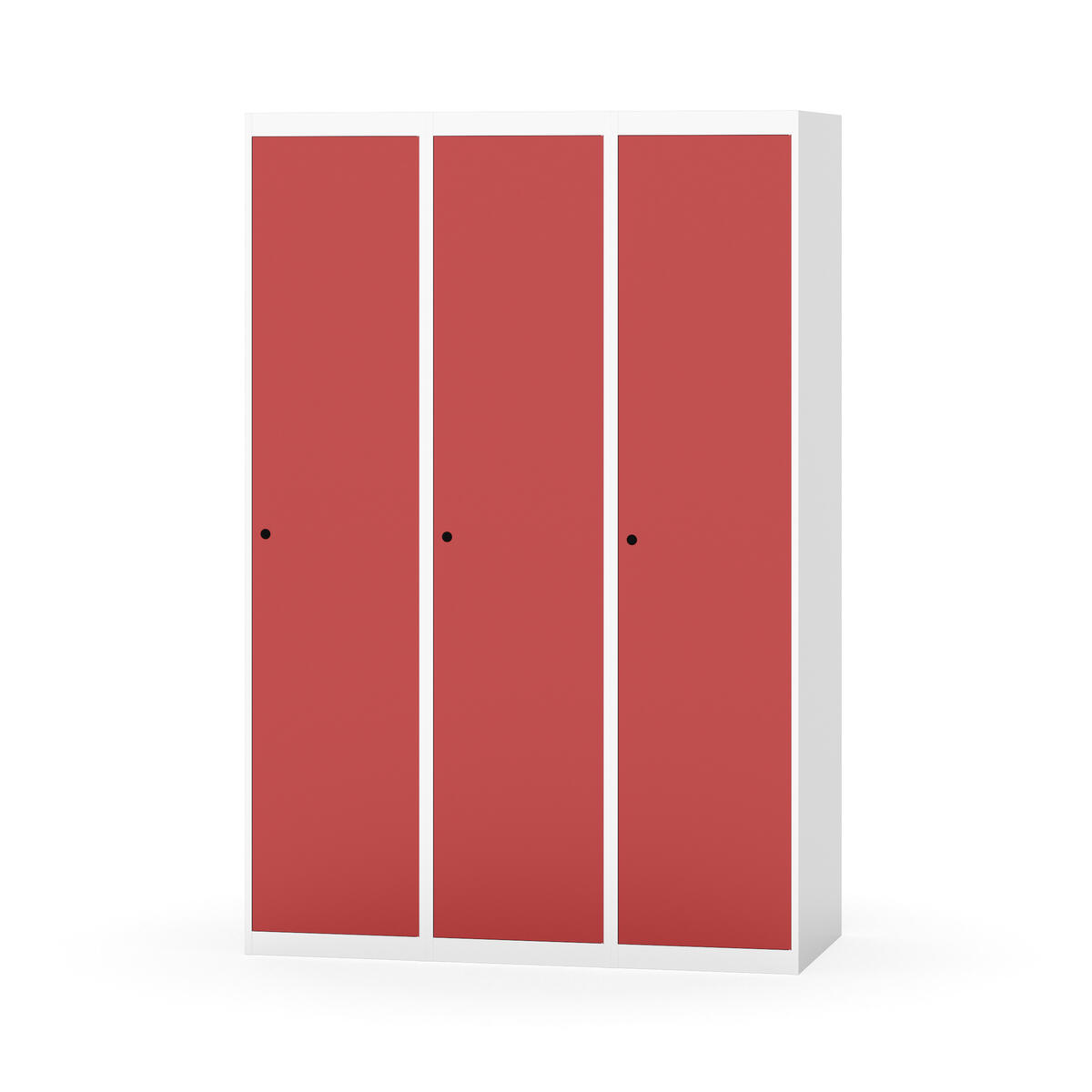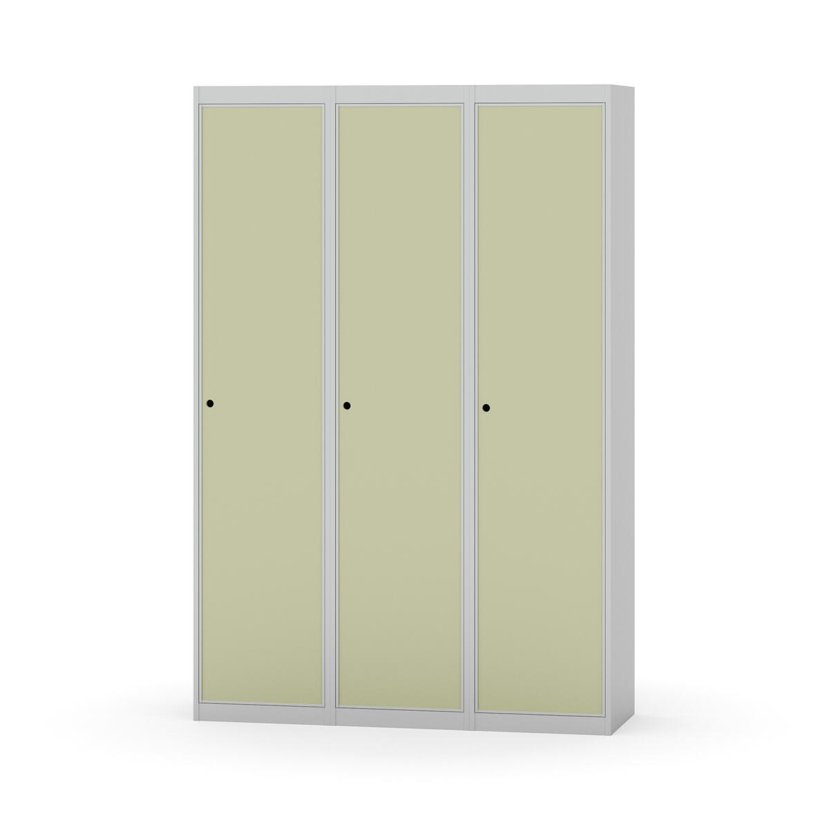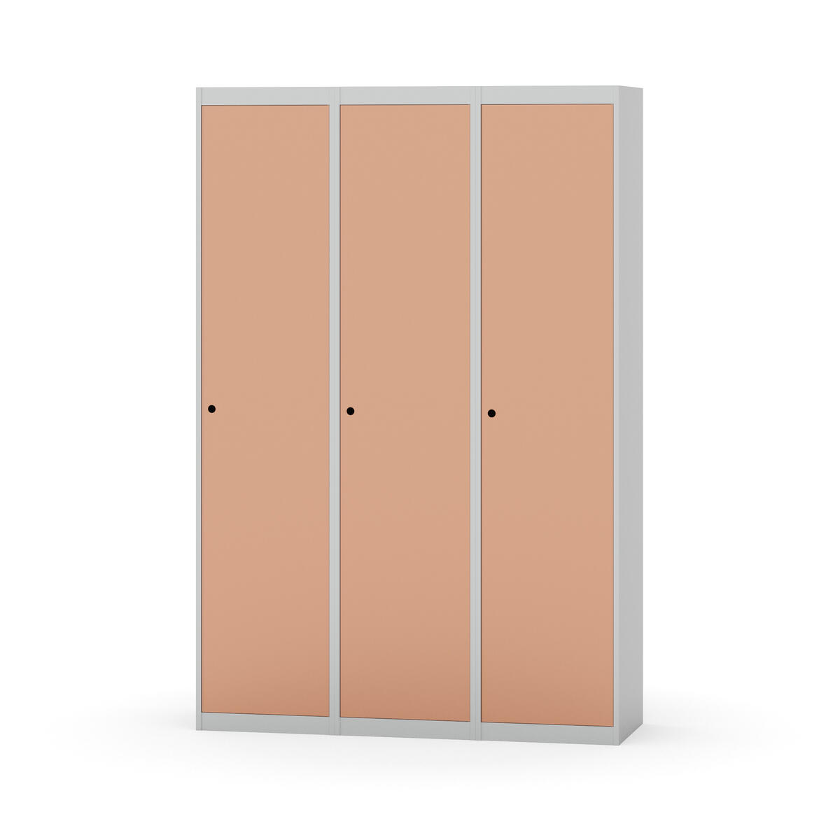 Klädskåp med helsvetsad stomme. Välj mellan plåt eller laminatdörr. Plåtdörren är försedd med dörrstopp i stål och infälld förstärkning kring låshålet. Laminatdörr infälld i stålram försedd med dörrstopp i stål. Dörrar är öppningsbara 90 grader. Inredning: Klädstång med ankarkrok. Slät golvyta utan tröskel. Ventilation genom hål i tak-/bottenplåt. Observera att lås och underrede beställs på separata artikelnummer. Lås kommer att vara monterade på skåp vid leverans. Valt underrede monteras på plats.