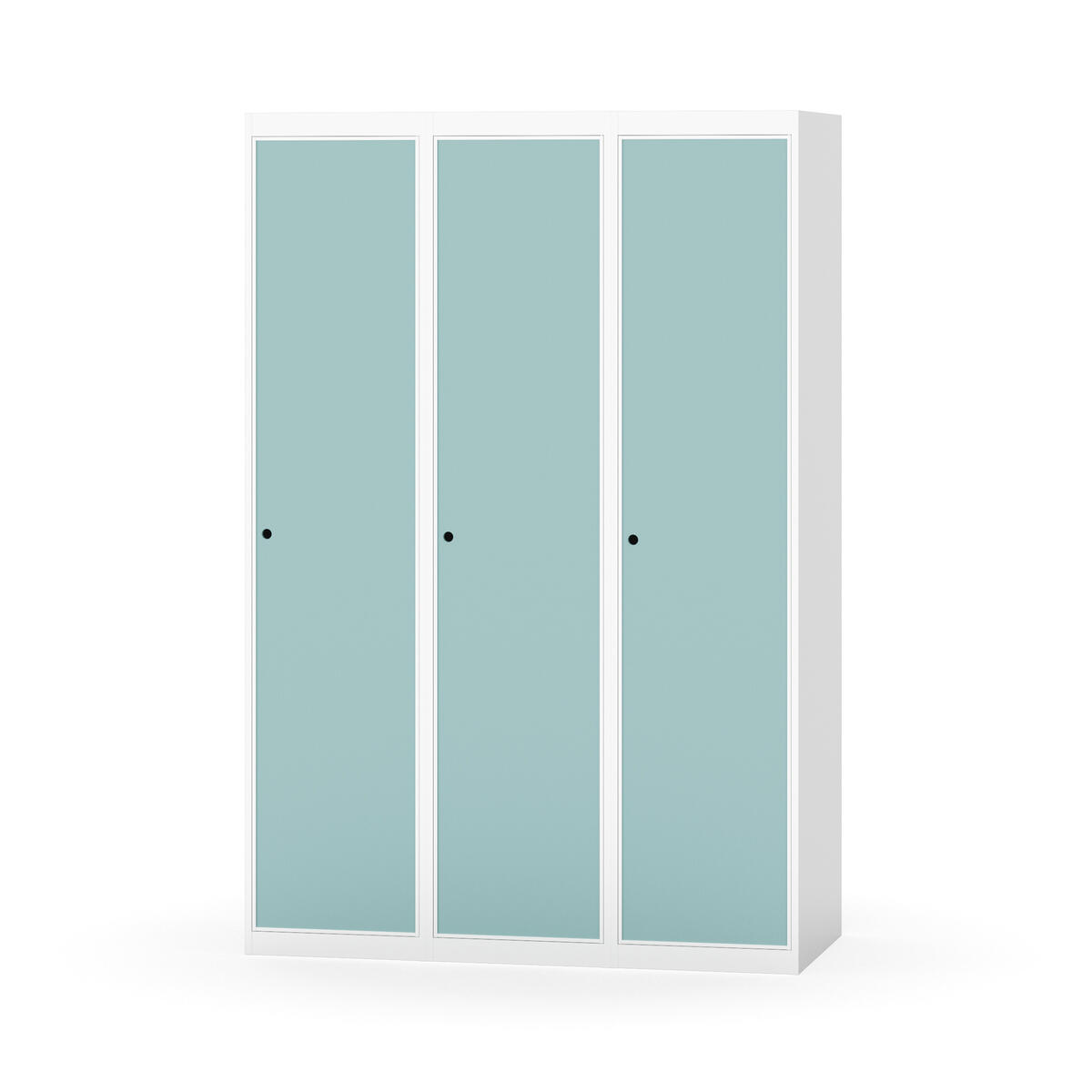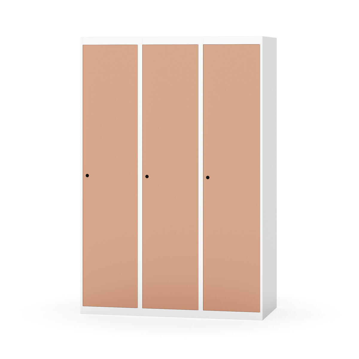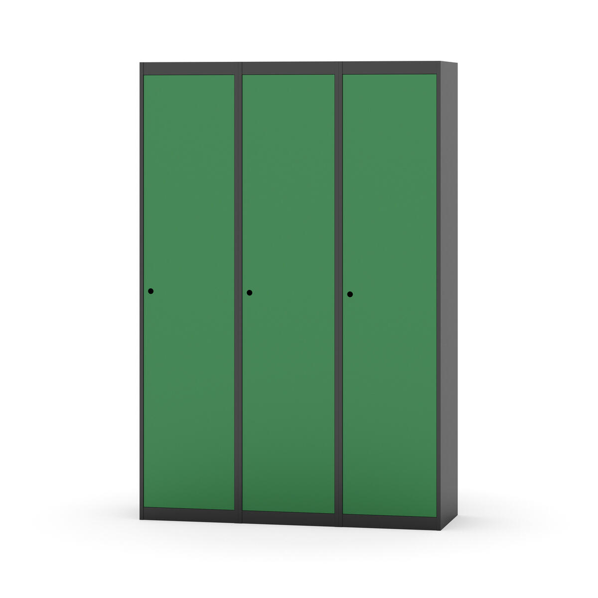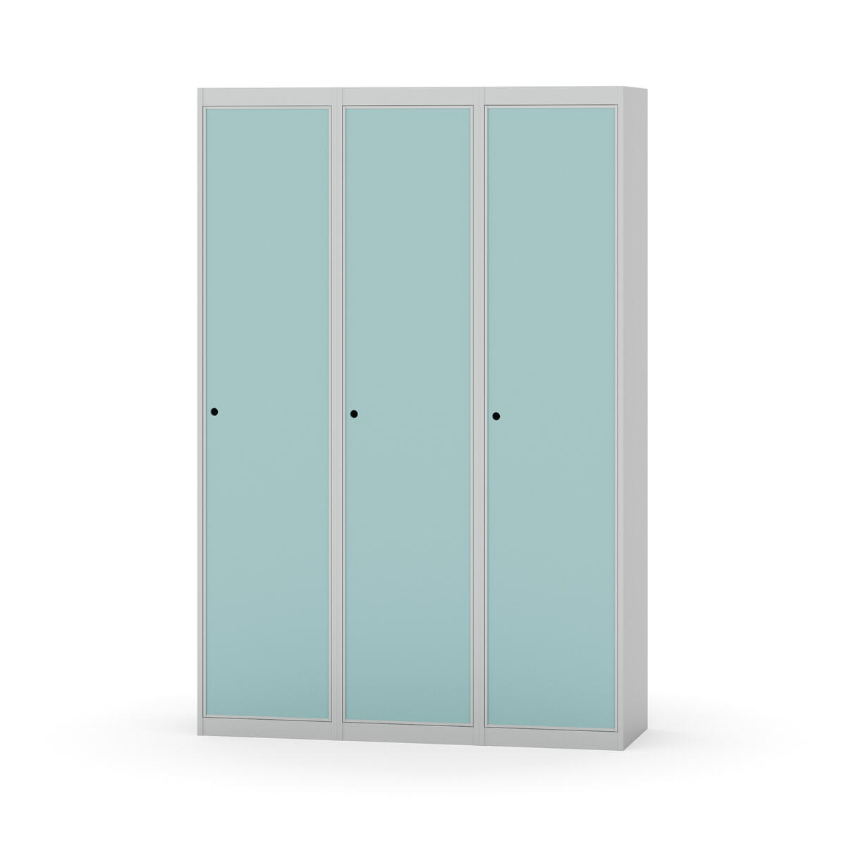 Klädskåp med helsvetsad stomme. Välj mellan plåt eller laminatdörr. Plåtdörren är försedd med dörrstopp i stål och infälld förstärkning kring låshålet. Laminatdörr infälld i stålram försedd med dörrstopp i stål. Dörrar är öppningsbara 90 grader. Inredning: Klädstång med ankarkrok. Slät golvyta utan tröskel. Ventilation genom hål i tak-/bottenplåt. Observera att lås och underrede beställs på separata artikelnummer. Lås kommer att vara monterade på skåp vid leverans. Valt underrede monteras på plats.