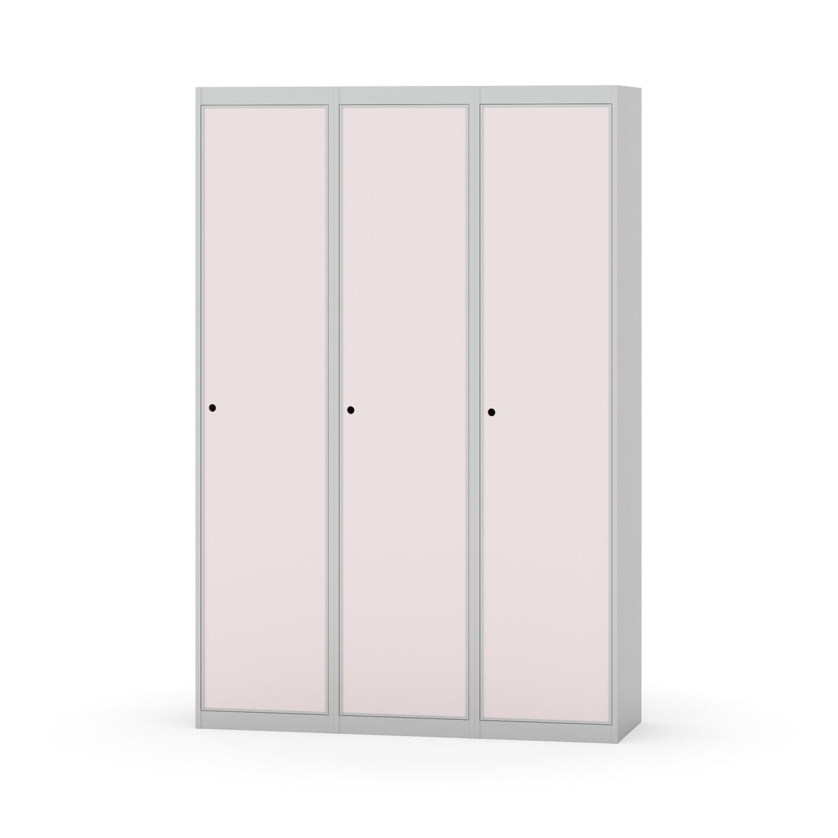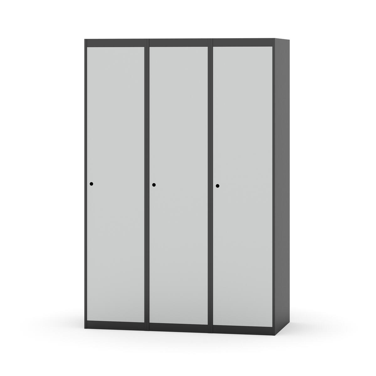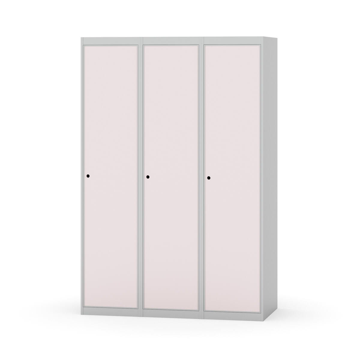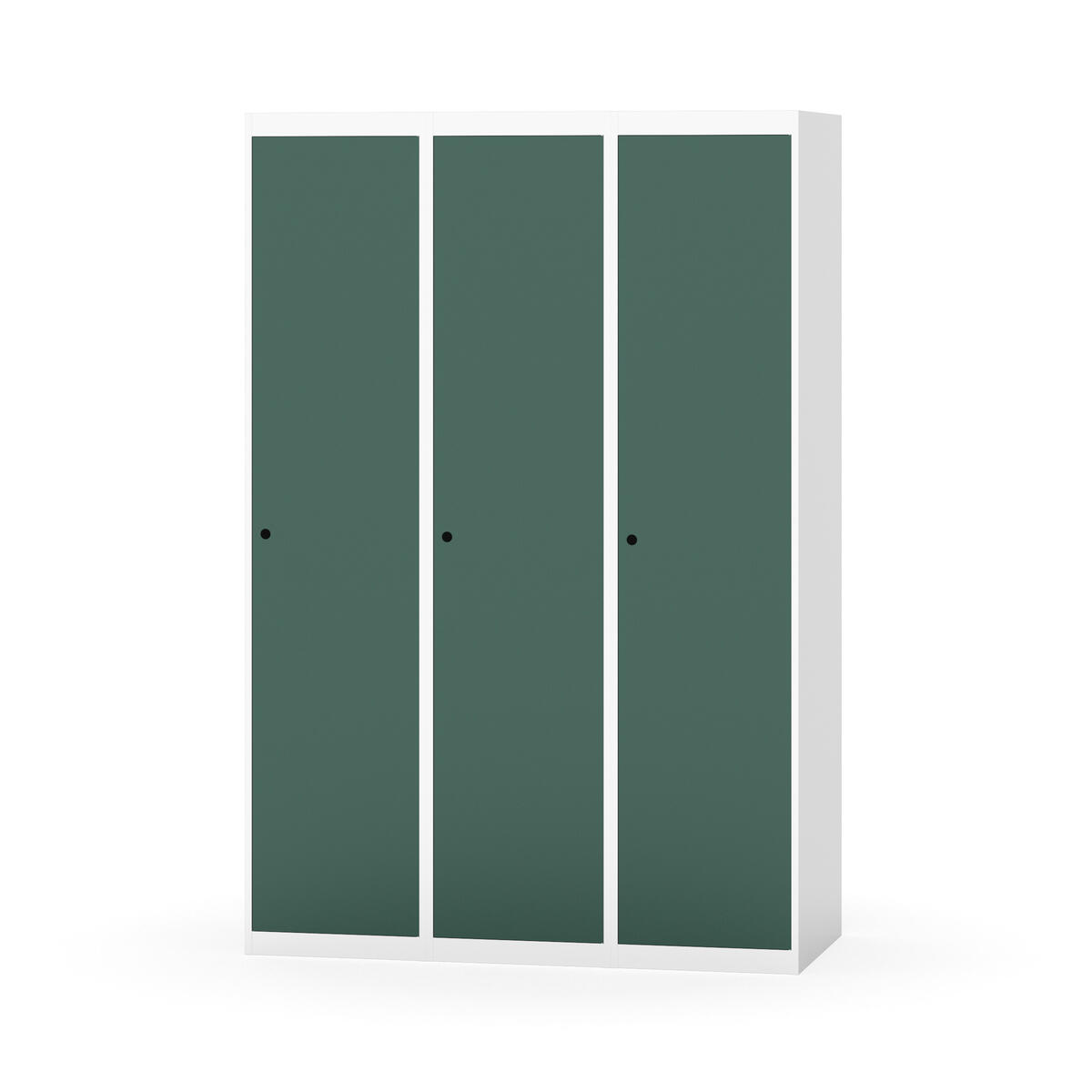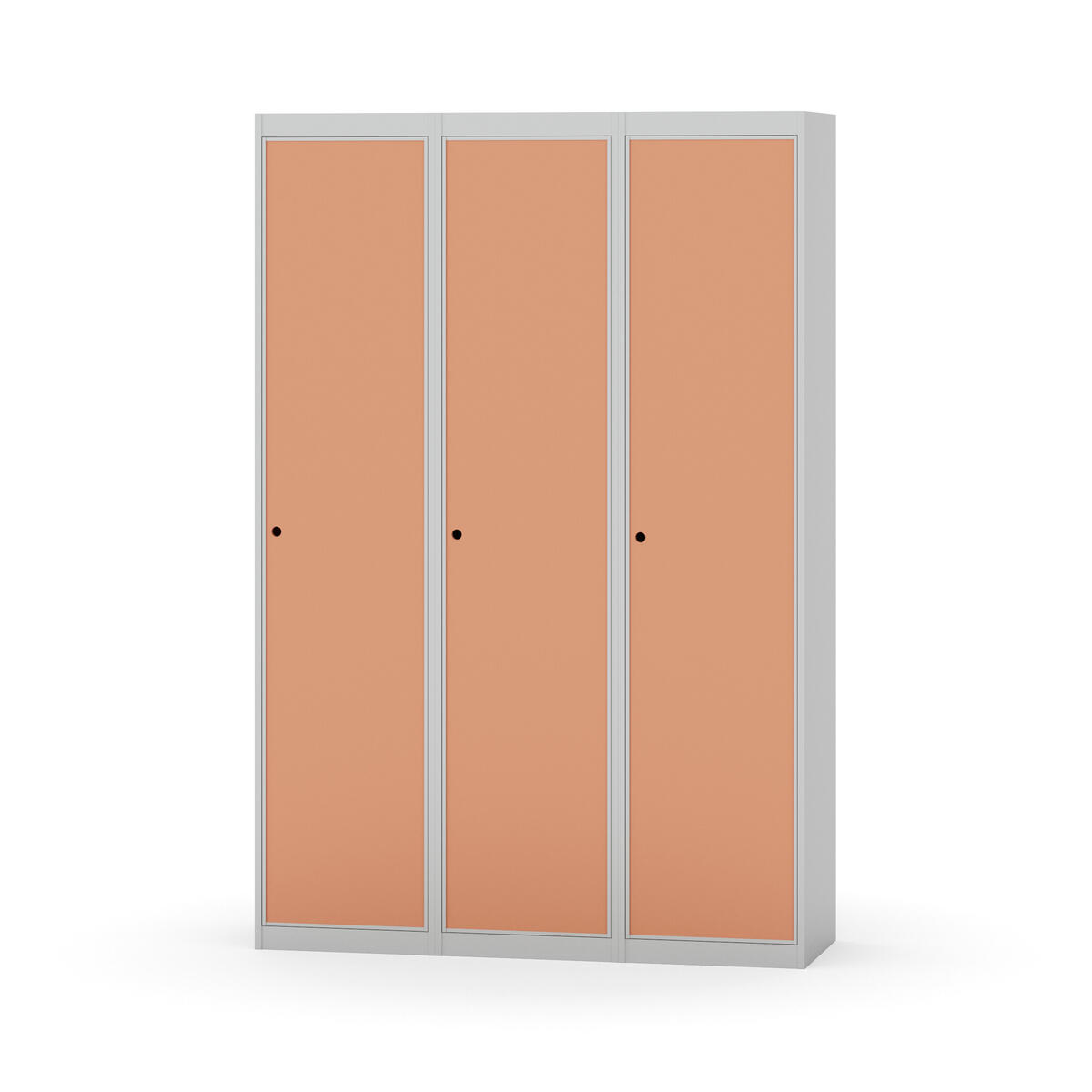 Klädskåp med helsvetsad stomme. Välj mellan plåt eller laminatdörr. Plåtdörren är försedd med dörrstopp i stål och infälld förstärkning kring låshålet. Laminatdörr infälld i stålram försedd med dörrstopp i stål. Dörrar är öppningsbara 90 grader. Inredning: Klädstång med ankarkrok. Slät golvyta utan tröskel. Ventilation genom hål i tak-/bottenplåt. Observera att lås och underrede beställs på separata artikelnummer. Lås kommer att vara monterade på skåp vid leverans. Valt underrede monteras på plats.