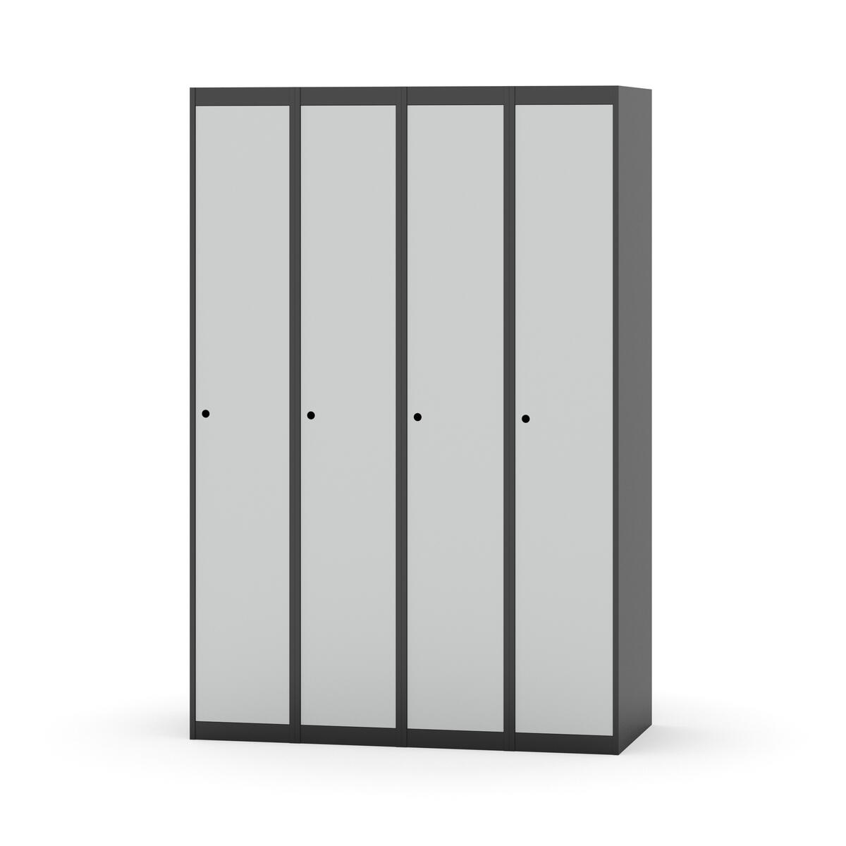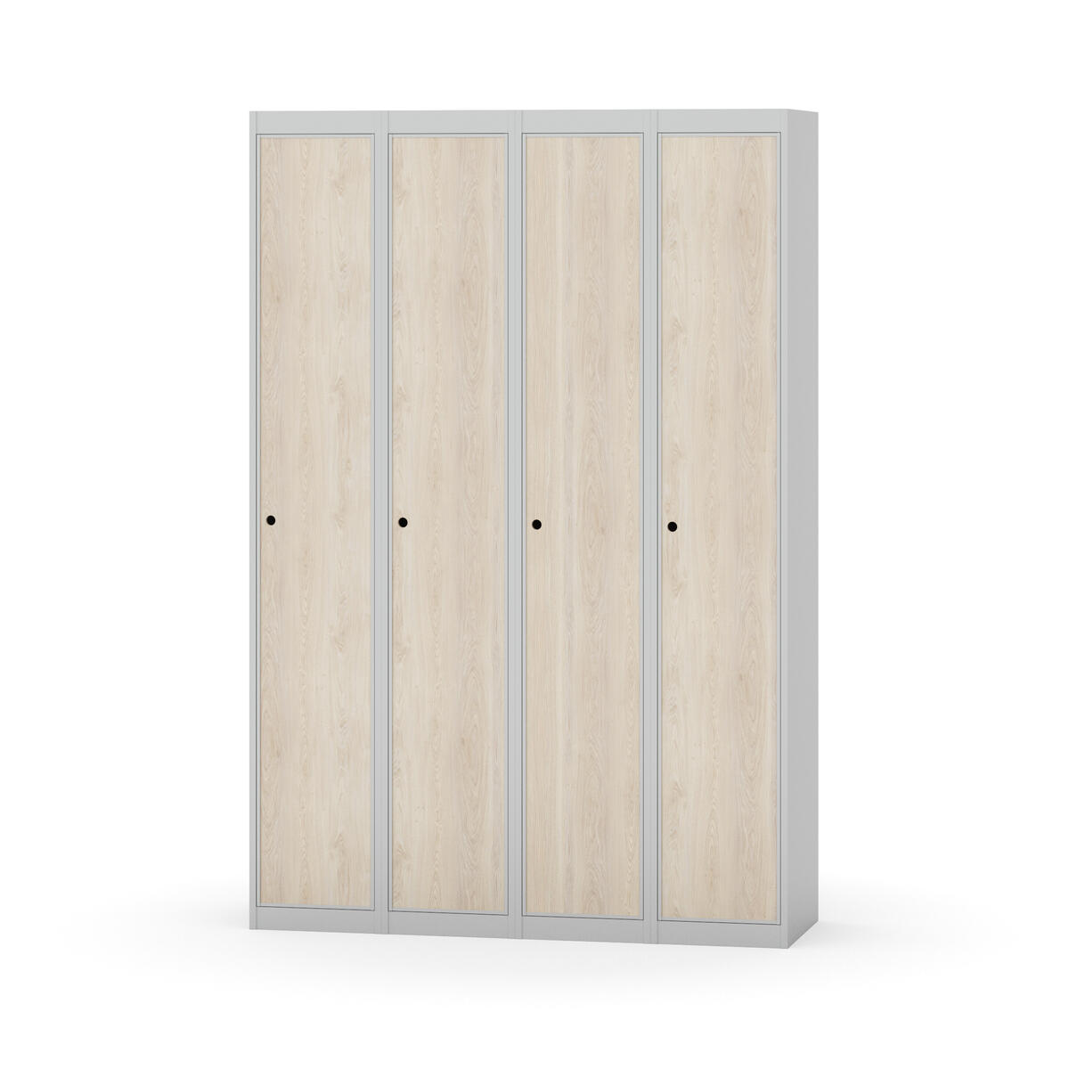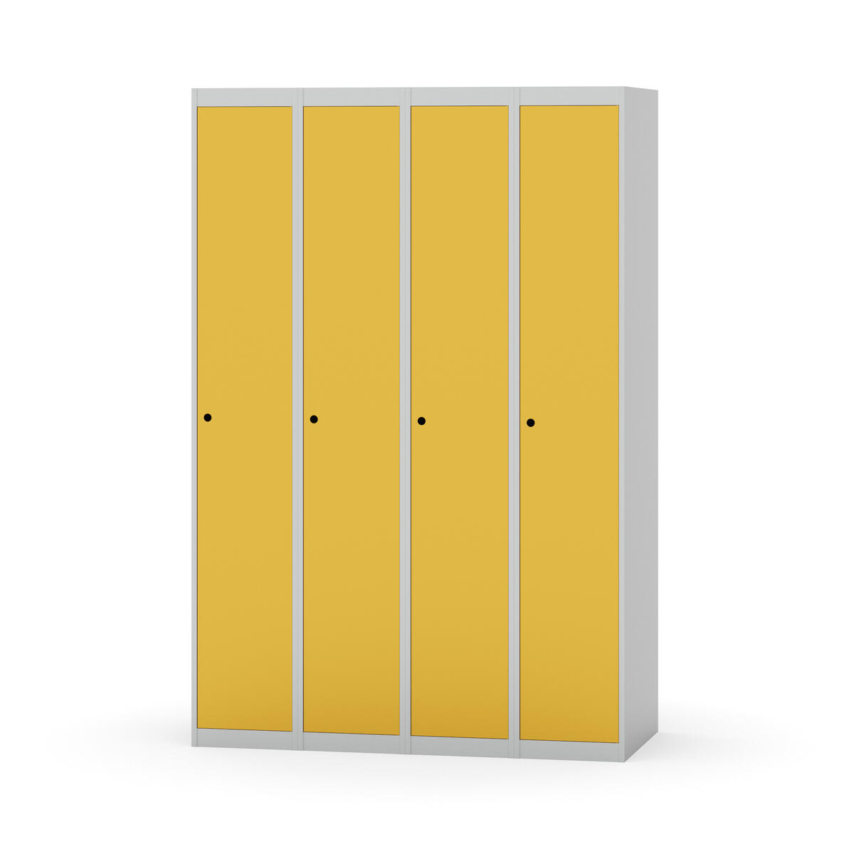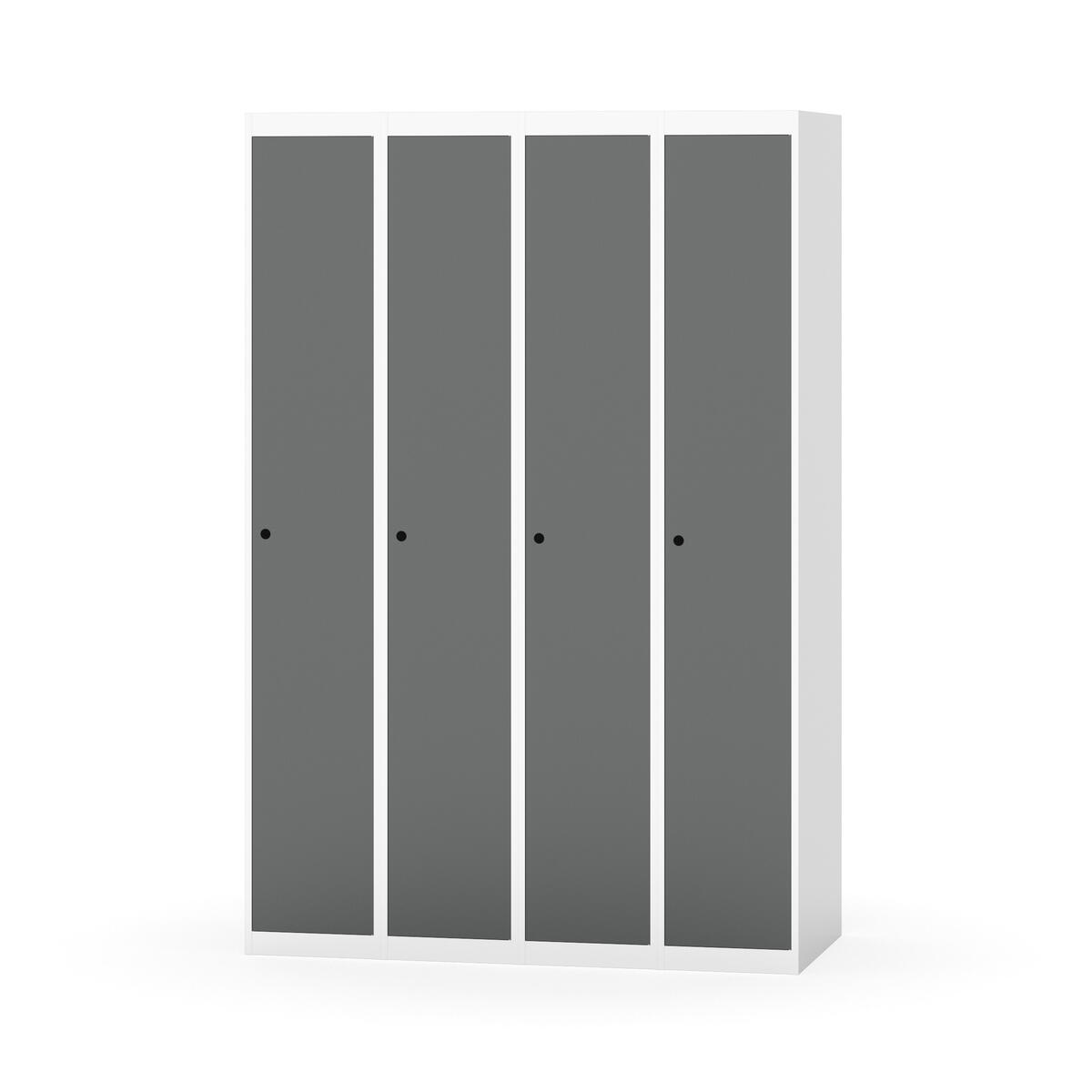 Klädskåp med helsvetsad stomme. Välj mellan plåt eller laminatdörr. Plåtdörren är försedd med dörrstopp i stål och infälld förstärkning kring låshålet. Laminatdörr infälld i stålram försedd med dörrstopp i stål. Dörrar är öppningsbara 90 grader. Inredning: Klädstång med ankarkrok. Slät golvyta utan tröskel. Ventilation genom hål i tak-/bottenplåt. Observera att lås och underrede beställs på separata artikelnummer. Lås kommer att vara monterade på skåp vid leverans. Valt underrede monteras på plats.