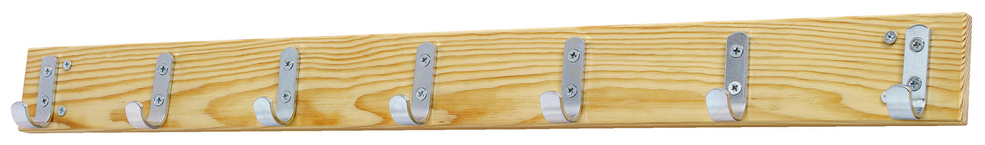 Kroklist med 8 st enkelkrokar. Skruvar för att fästa krokarna på listen medföljer. Listen fästes direkt på väggen. Skruvar för att fästa på vägg medföljer ej. Krok i metall, list i massiv björk. Mått: 144x10 cm.