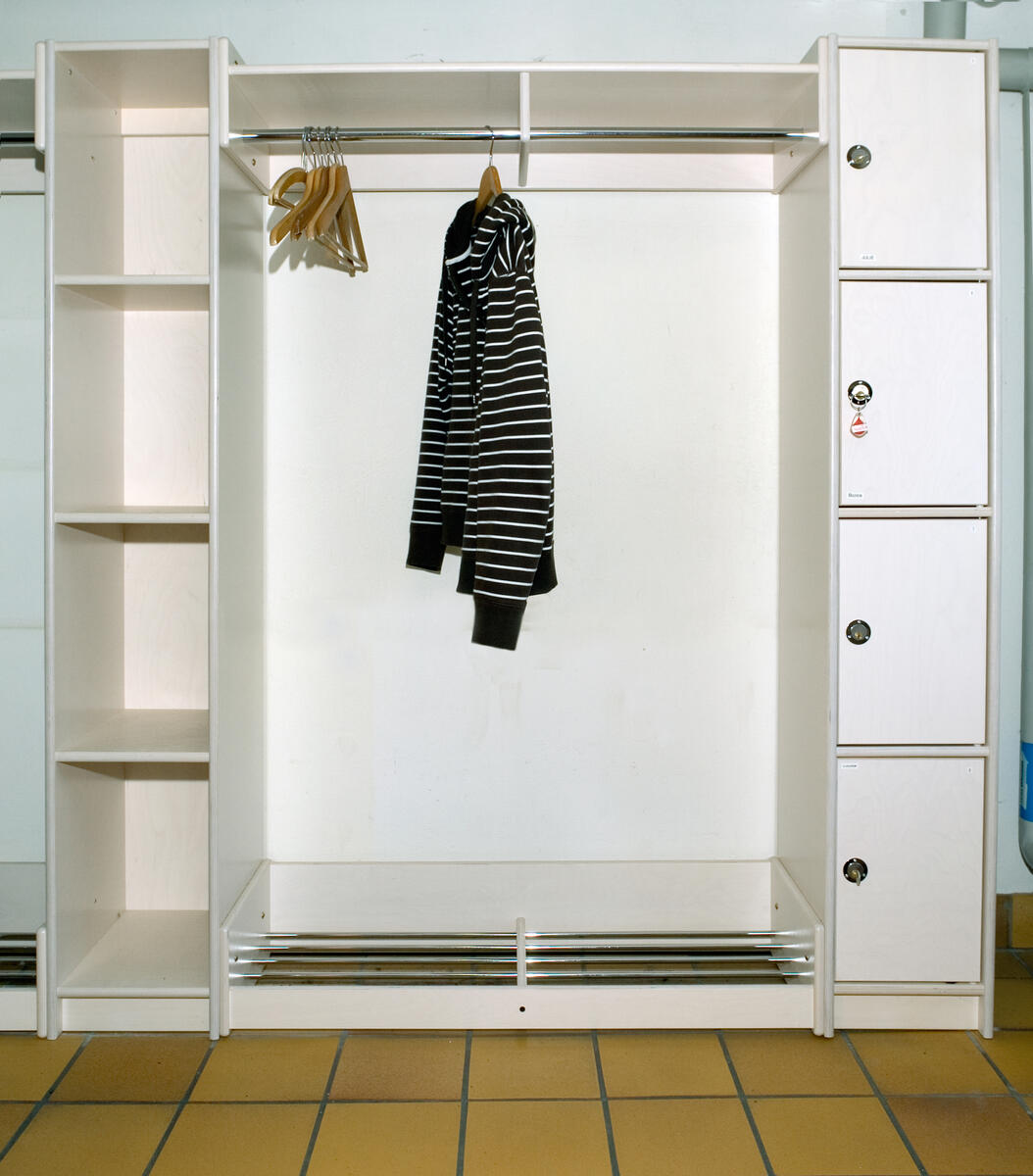 Låsbart personalskåp i vitpigmenterat björkkryssfaner. Skåpen finns med tre, fyra eller fem dörrar. Storlek: B31xD40xH183 cm. Skåpen kan kompletteras med hatt- och skohylla i önskade längder. 3 dörrar. Invändig skåpsstorlek: B27,5xD40xH32 cm.