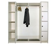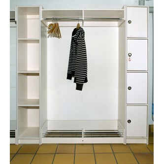 Låsbart personalskåp i vitpigmenterad björkkryssfaner. Skåpen finns med 3, 4 eller 5 dörrar och kan kompletteras med hatt- och skohylla i önskade längder. Mått: B31xD40xH183 cm. 4 fack med invändiga mått: B27,5xD40xH41 cm.