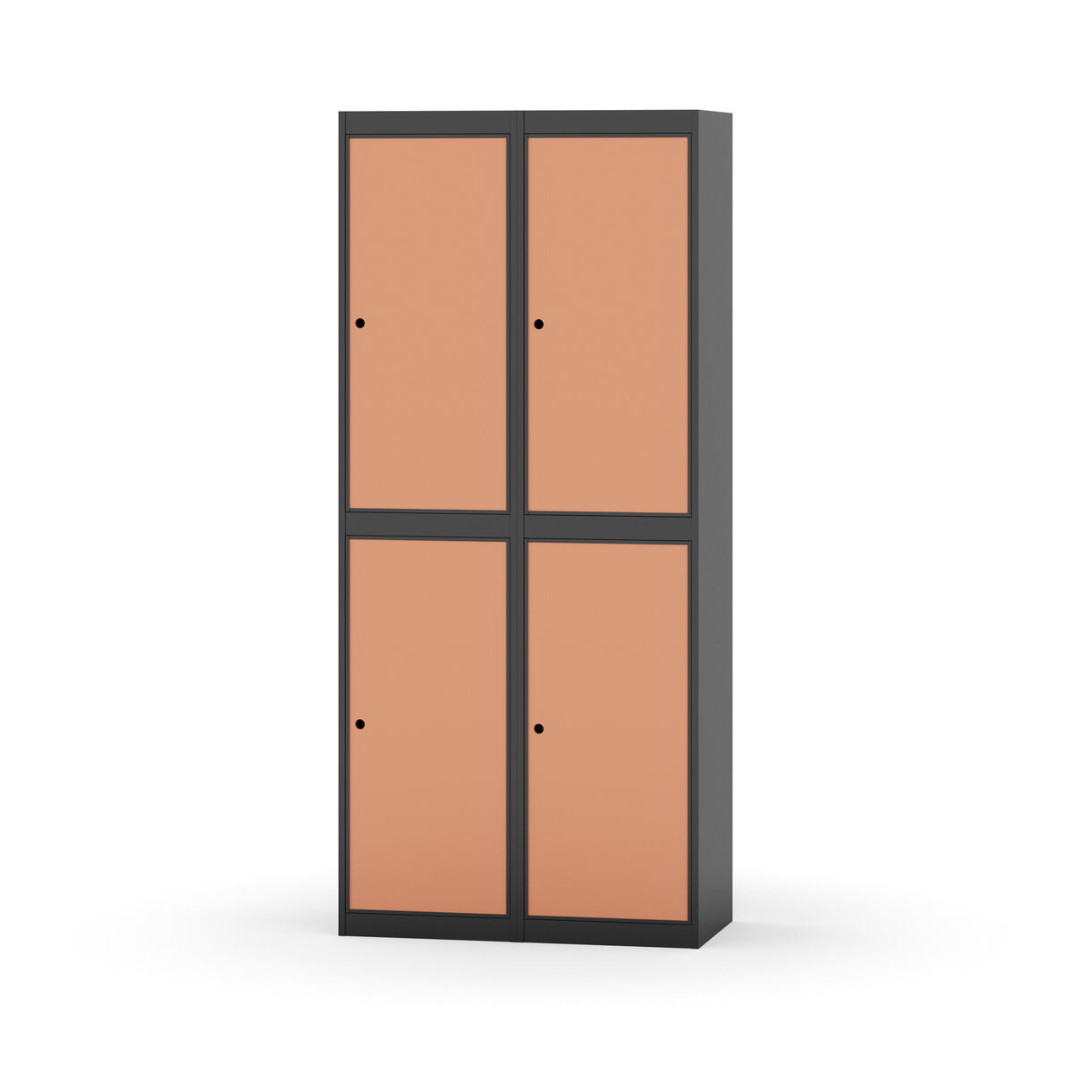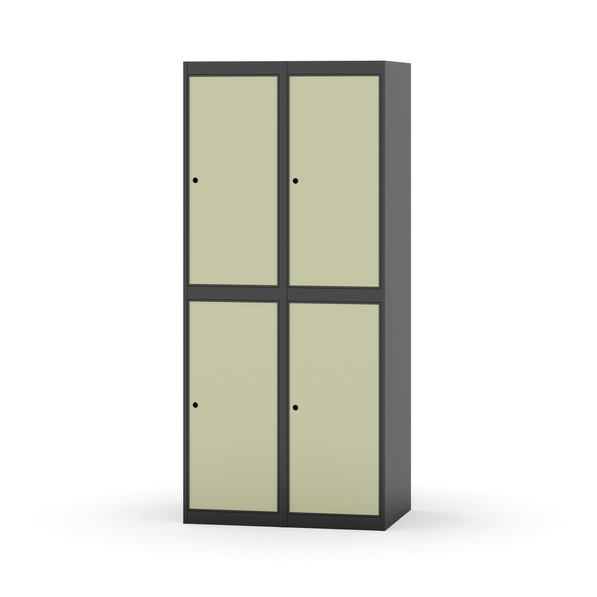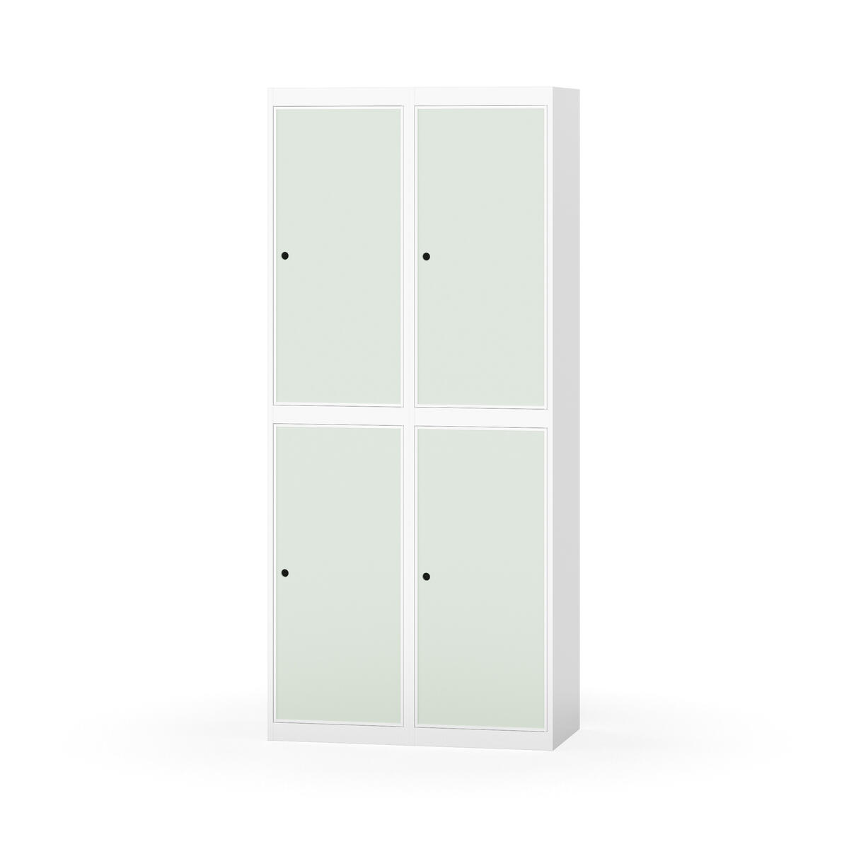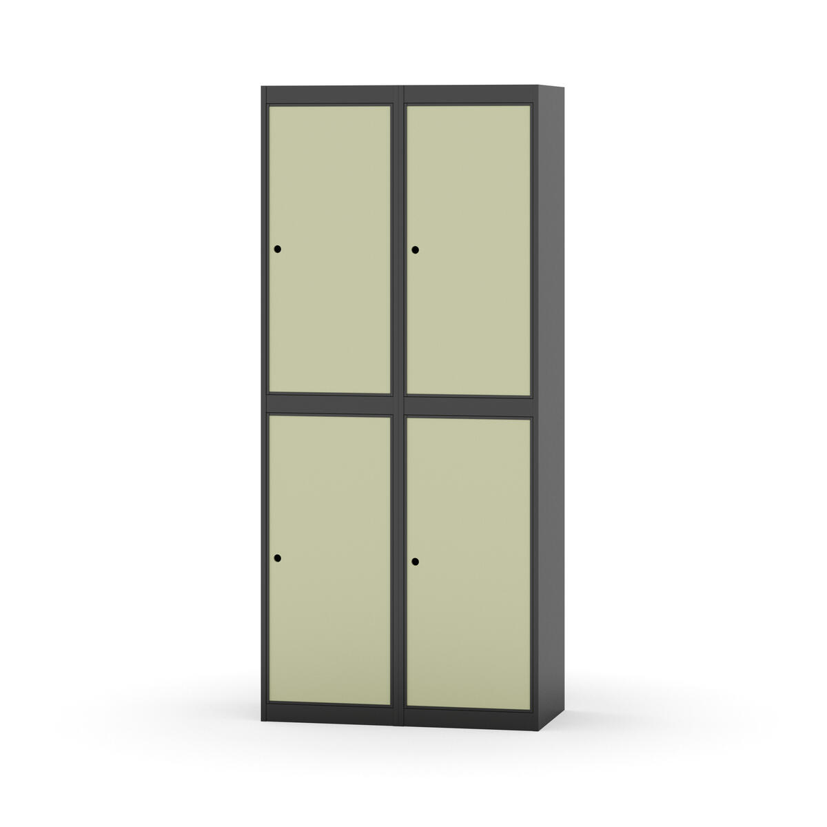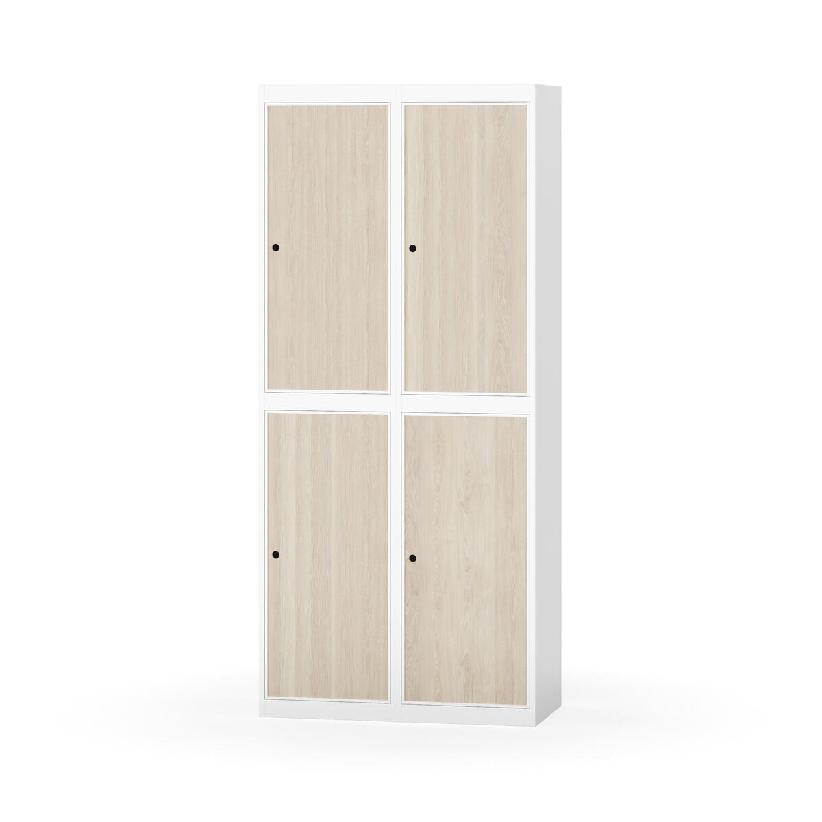 Klädskåp med helsvetsad stomme. Välj mellan plåt eller laminatdörr. Plåtdörren är försedd med dörrstopp i stål och infälld förstärkning kring låshålet. Laminatdörr infälld i stålram försedd med dörrstopp i stål. Dörrar är öppningsbara 90 grader. Inredning: Hyllplan och klädstång med två ankarkrokar. Slät golvyta utan tröskel. Ventilation genom hål i tak-/bottenplåt. Observera att lås och underrede beställs på separata artikelnummer. Lås kommer att vara monterade på skåp vid leverans. Valt underrede monteras på plats.