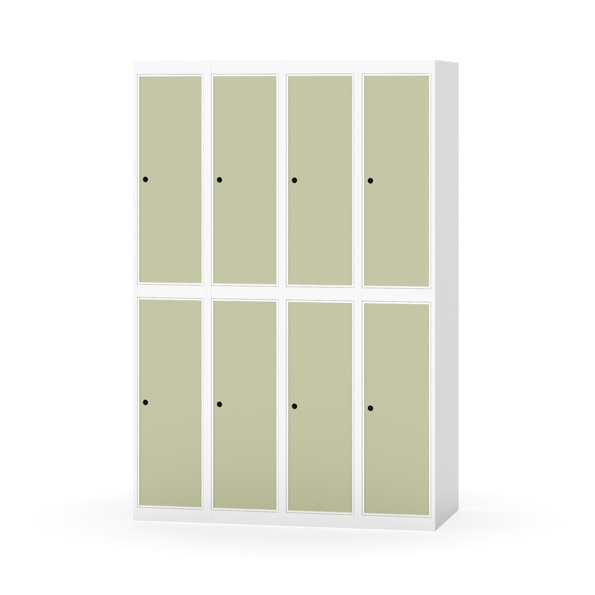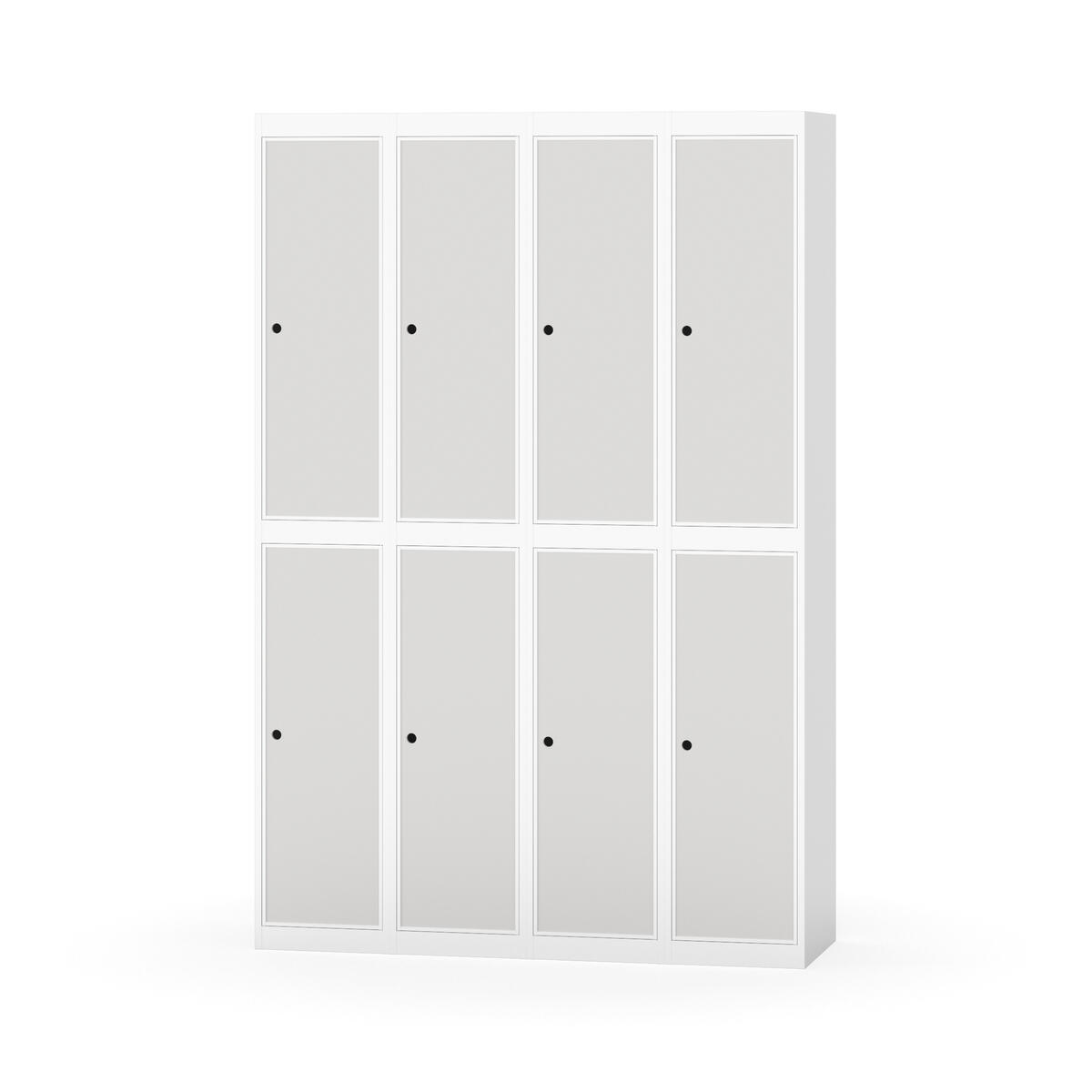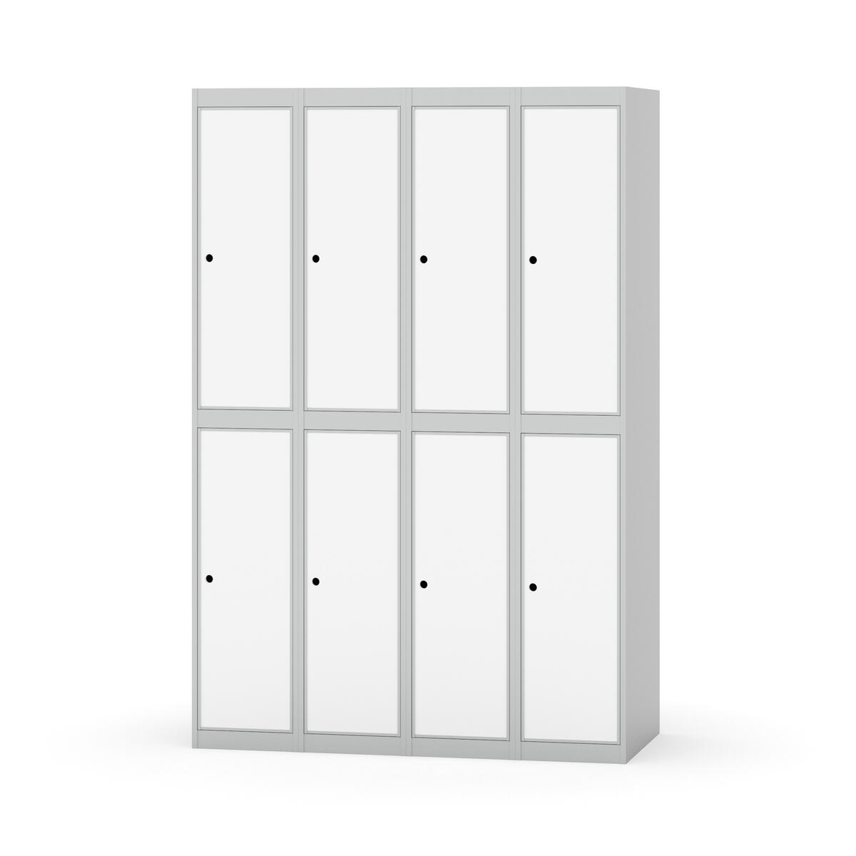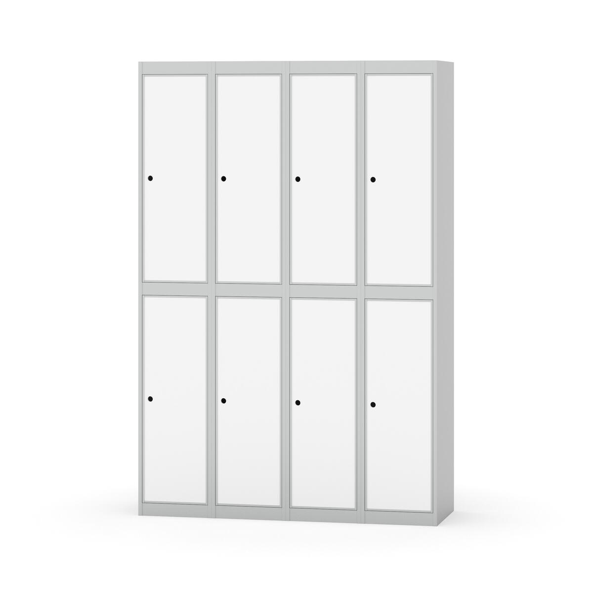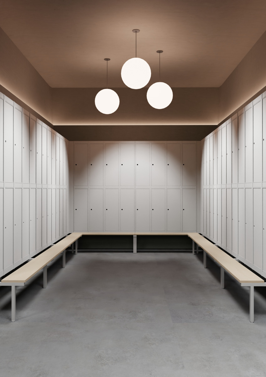 Klädskåp med helsvetsad stomme. Välj mellan plåt eller laminatdörr. Plåtdörren är försedd med dörrstopp i stål och infälld förstärkning kring låshålet. Laminatdörr infälld i stålram försedd med dörrstopp i stål. Dörrar är öppningsbara 90 grader. Inredning: Hyllplan och klädstång med två ankarkrokar. Slät golvyta utan tröskel. Ventilation genom hål i tak-/bottenplåt. Observera att lås och underrede beställs på separata artikelnummer. Lås kommer att vara monterade på skåp vid leverans. Valt underrede monteras på plats.