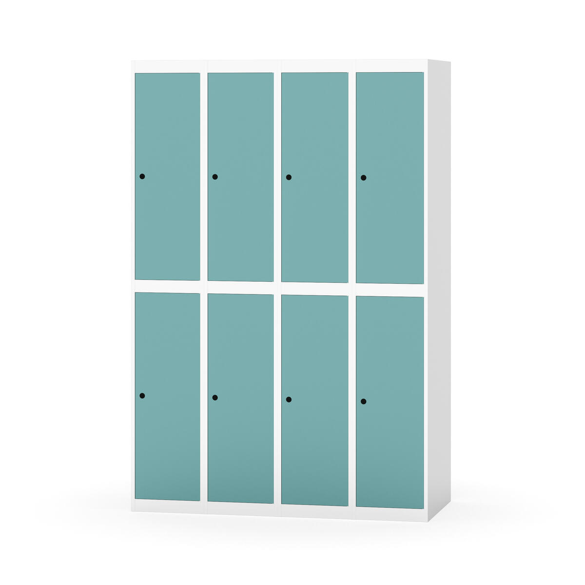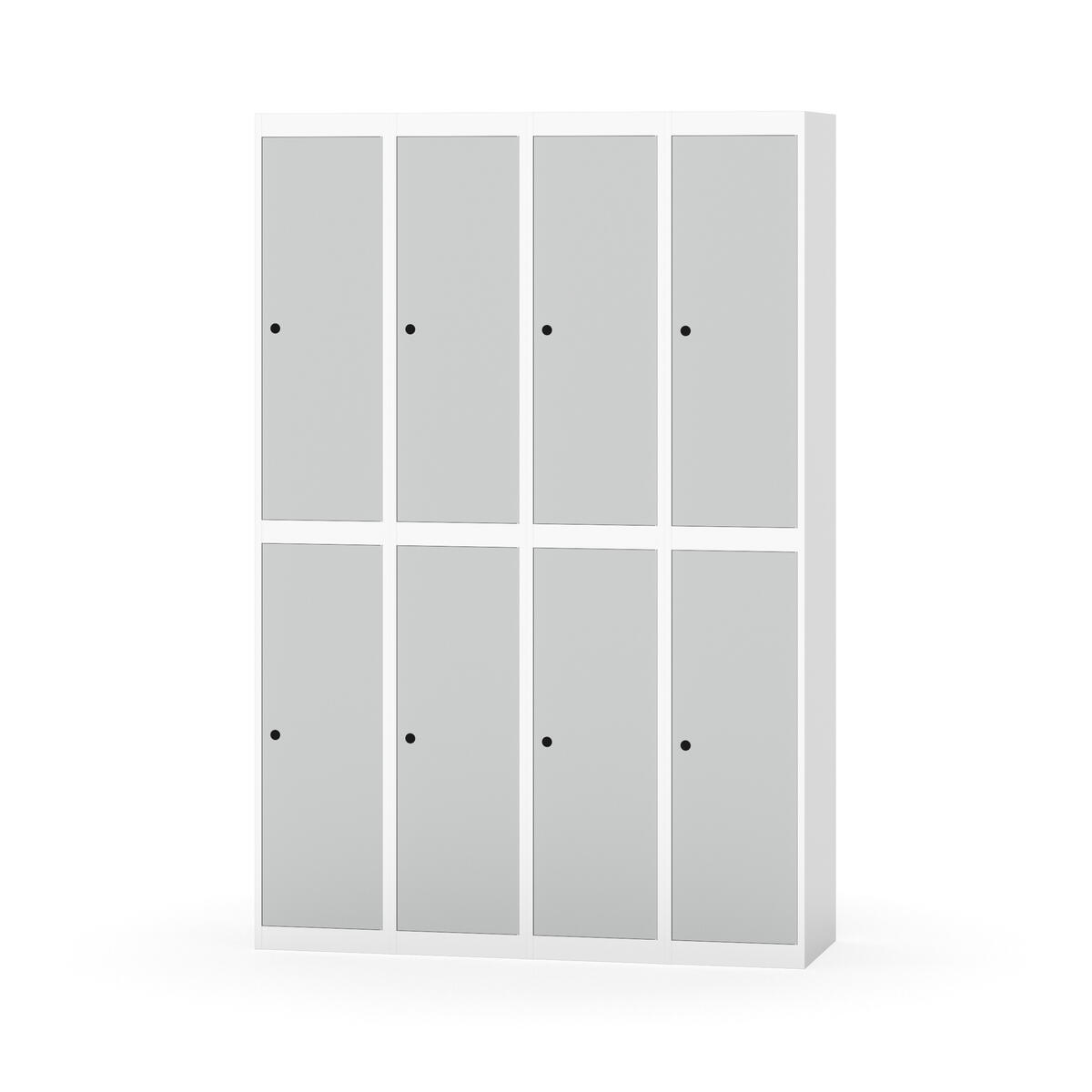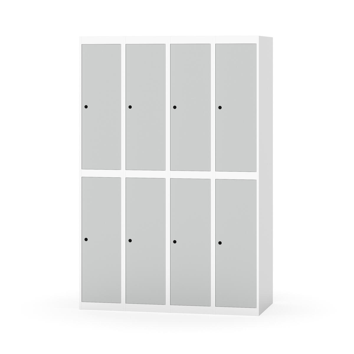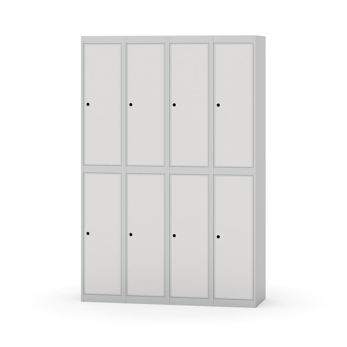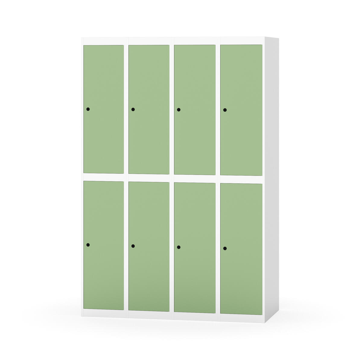 Klädskåp med helsvetsad stomme. Välj mellan plåt eller laminatdörr. Plåtdörren är försedd med dörrstopp i stål och infälld förstärkning kring låshålet. Laminatdörr infälld i stålram försedd med dörrstopp i stål. Dörrar är öppningsbara 90 grader. Inredning: Hyllplan och klädstång med två ankarkrokar. Slät golvyta utan tröskel. Ventilation genom hål i tak-/bottenplåt. Observera att lås och underrede beställs på separata artikelnummer. Lås kommer att vara monterade på skåp vid leverans. Valt underrede monteras på plats.