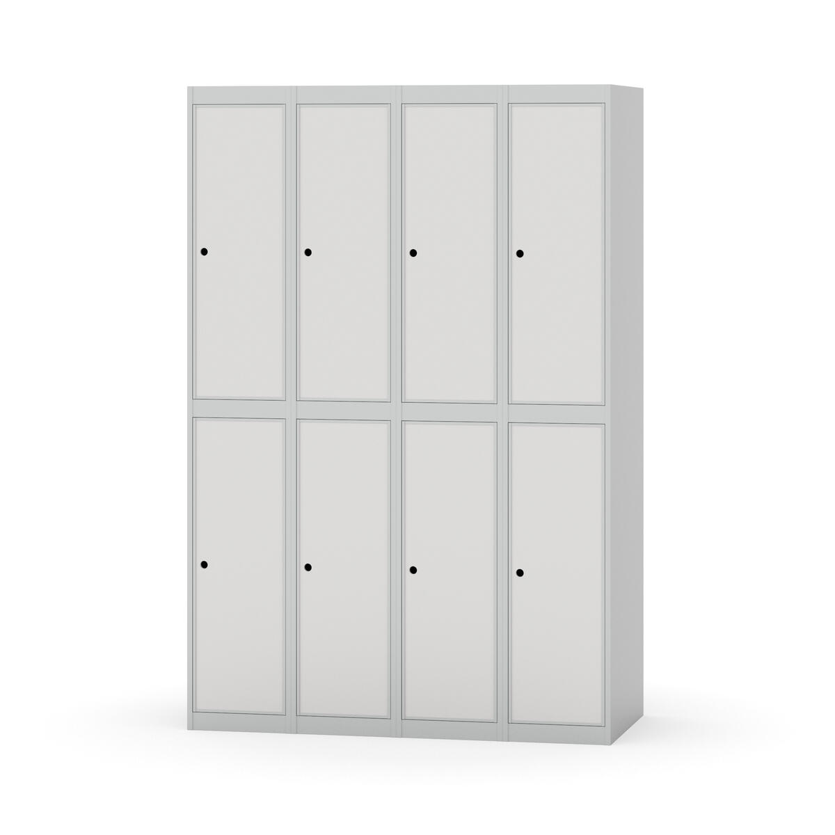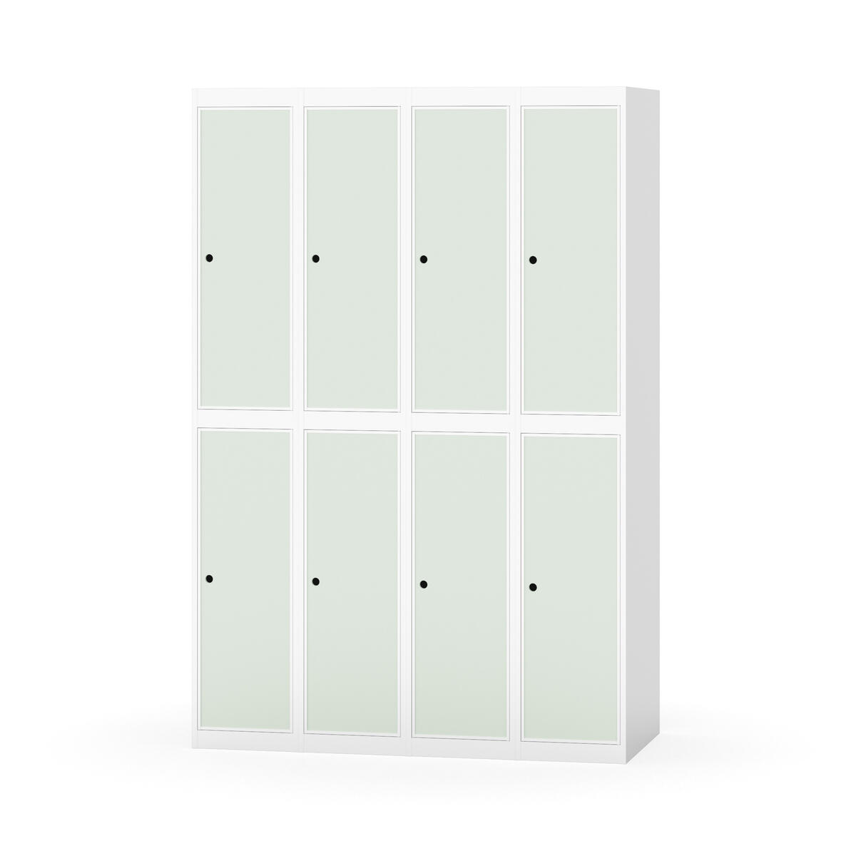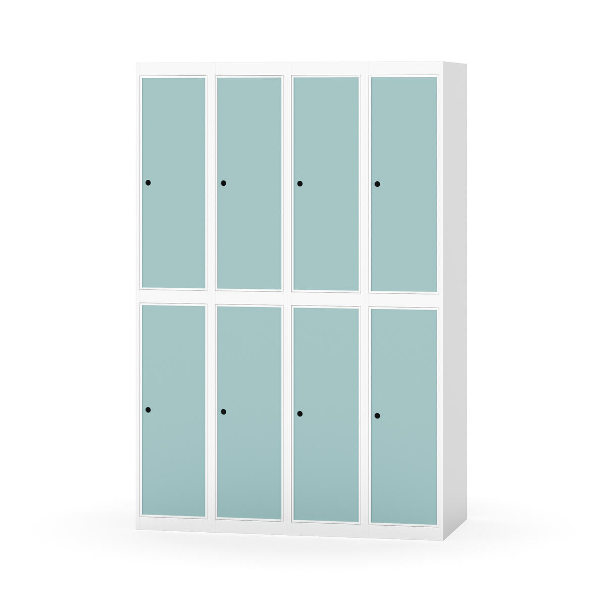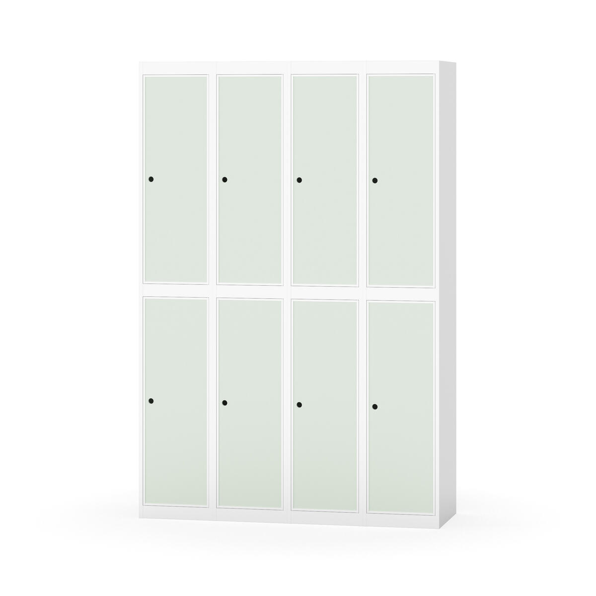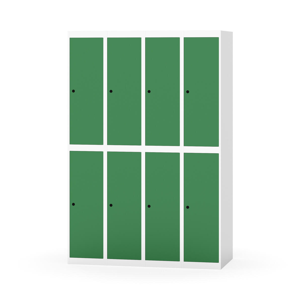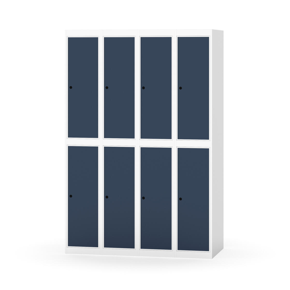 Klädskåp med helsvetsad stomme. Välj mellan plåt eller laminatdörr. Plåtdörren är försedd med dörrstopp i stål och infälld förstärkning kring låshålet. Laminatdörr infälld i stålram försedd med dörrstopp i stål. Dörrar är öppningsbara 90 grader. Inredning: Hyllplan och klädstång med två ankarkrokar. Slät golvyta utan tröskel. Ventilation genom hål i tak-/bottenplåt. Observera att lås och underrede beställs på separata artikelnummer. Lås kommer att vara monterade på skåp vid leverans. Valt underrede monteras på plats.