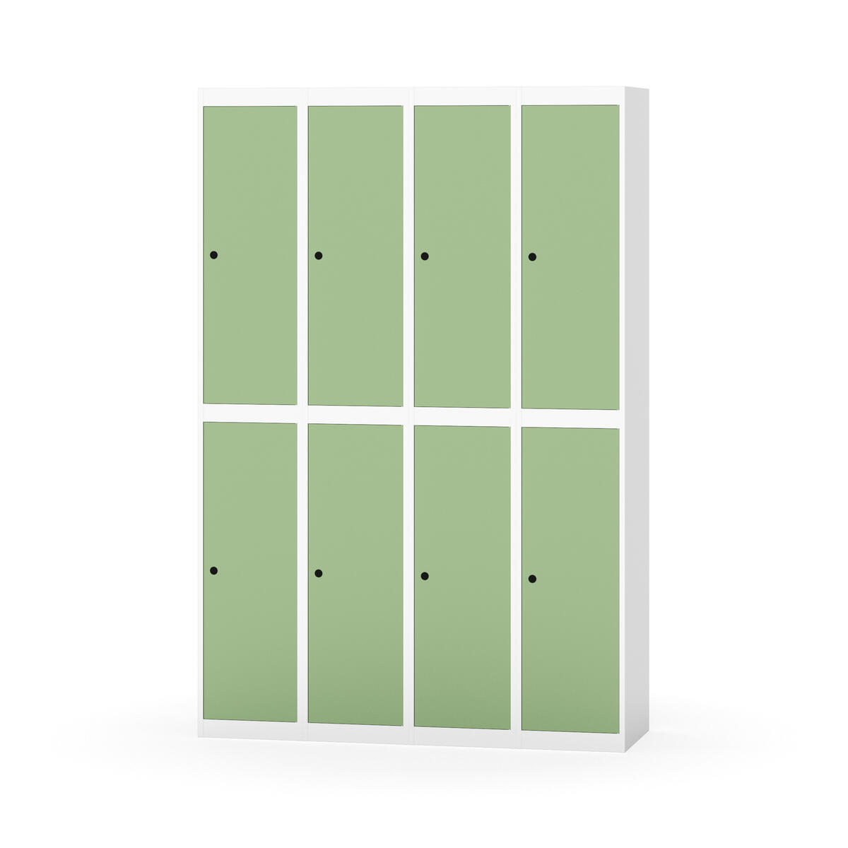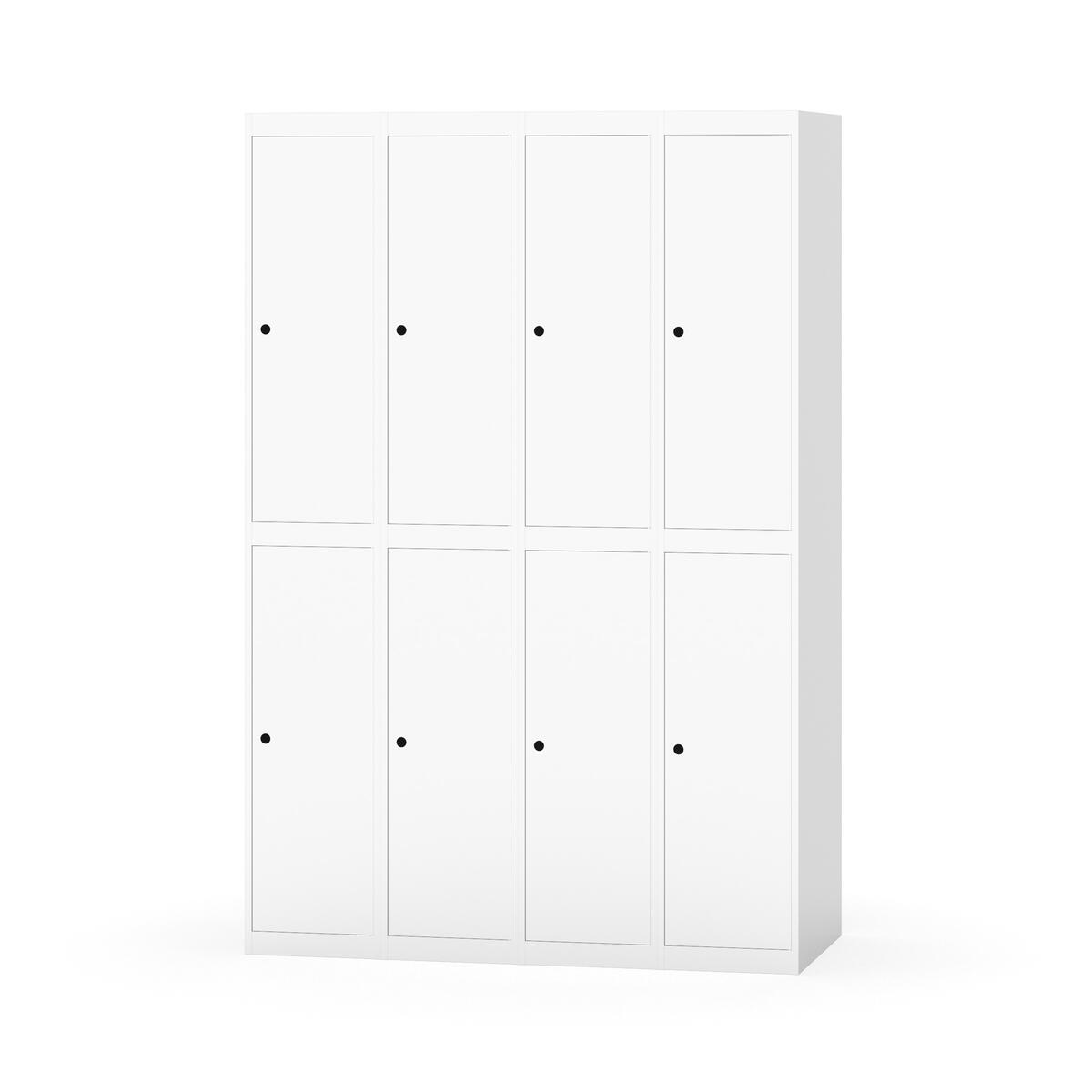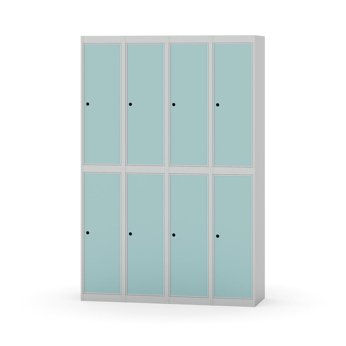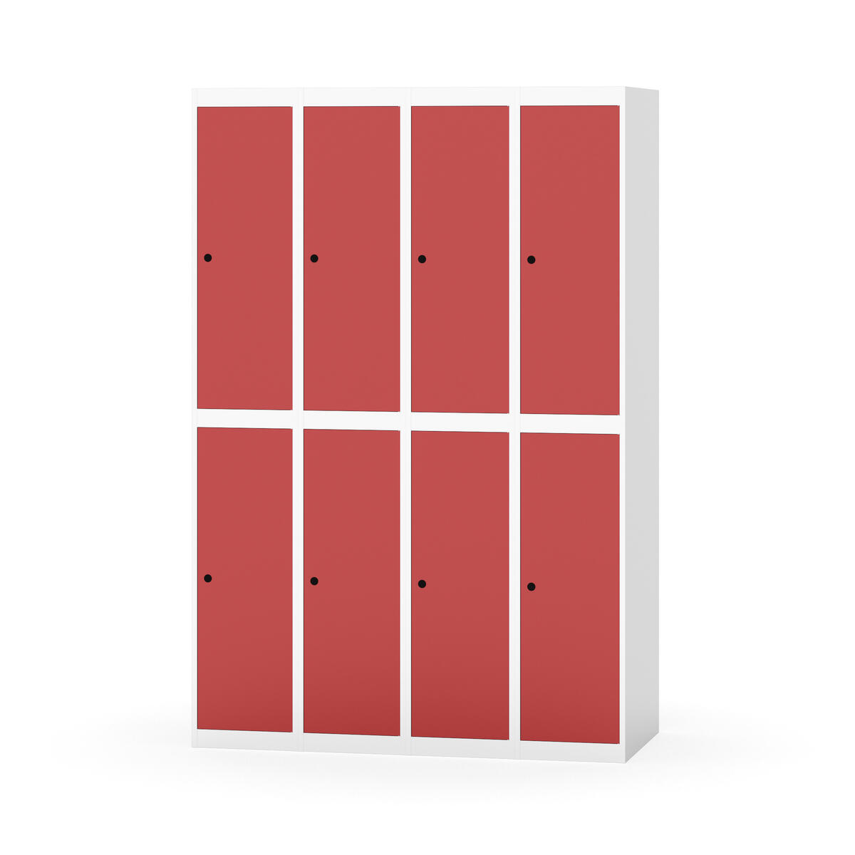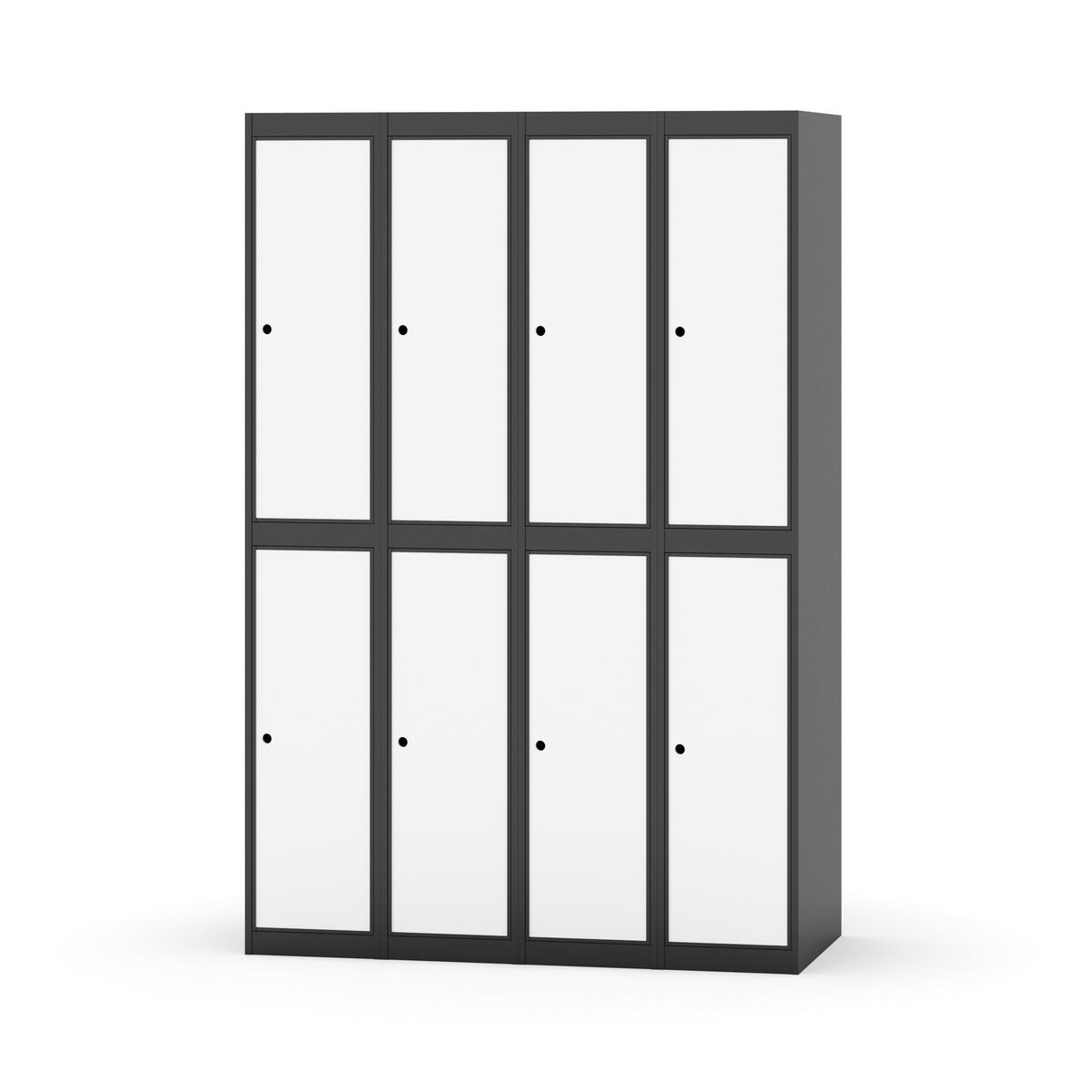 Klädskåp med helsvetsad stomme. Välj mellan plåt eller laminatdörr. Plåtdörren är försedd med dörrstopp i stål och infälld förstärkning kring låshålet. Laminatdörr infälld i stålram försedd med dörrstopp i stål. Dörrar är öppningsbara 90 grader. Inredning: Hyllplan och klädstång med två ankarkrokar. Slät golvyta utan tröskel. Ventilation genom hål i tak-/bottenplåt. Observera att lås och underrede beställs på separata artikelnummer. Lås kommer att vara monterade på skåp vid leverans. Valt underrede monteras på plats.