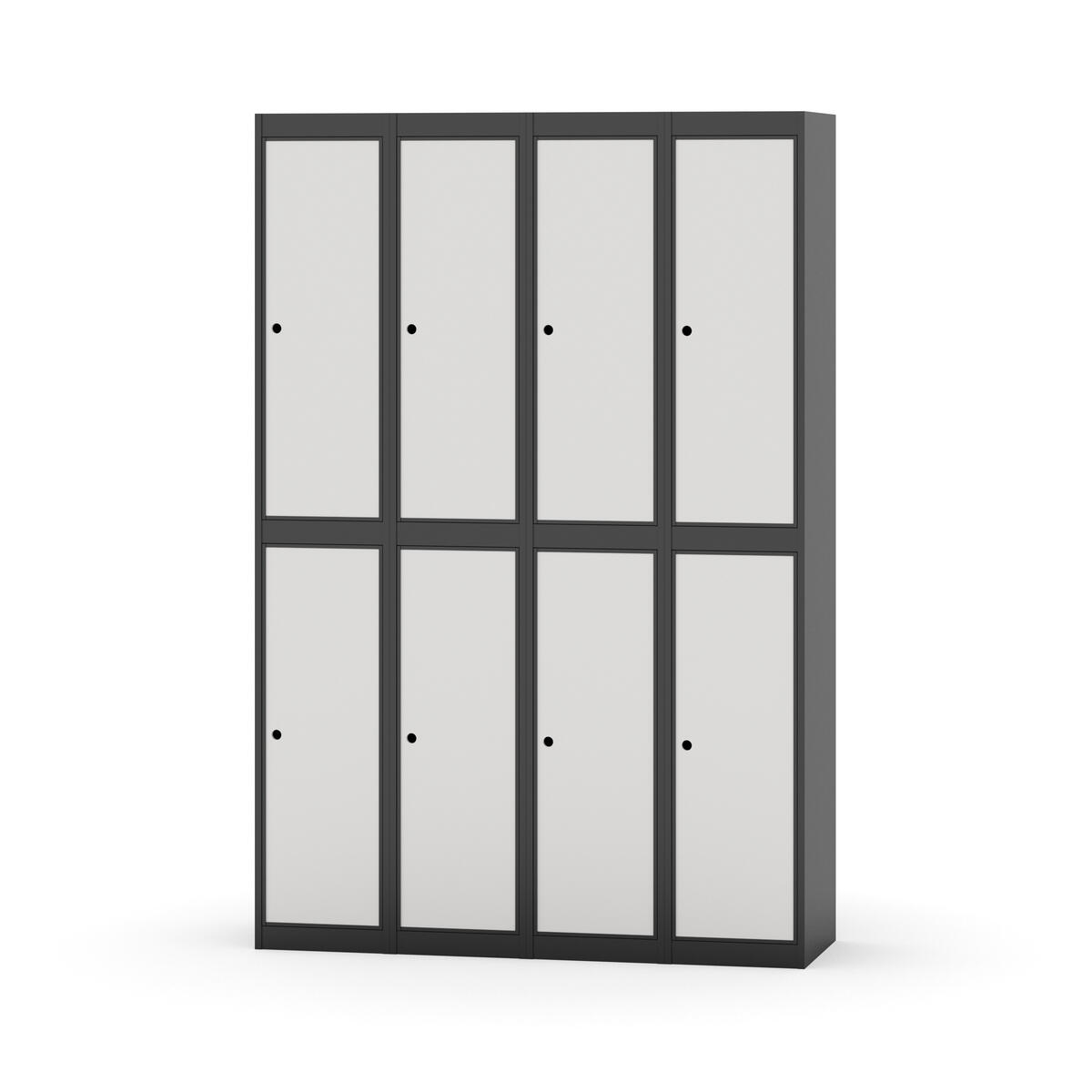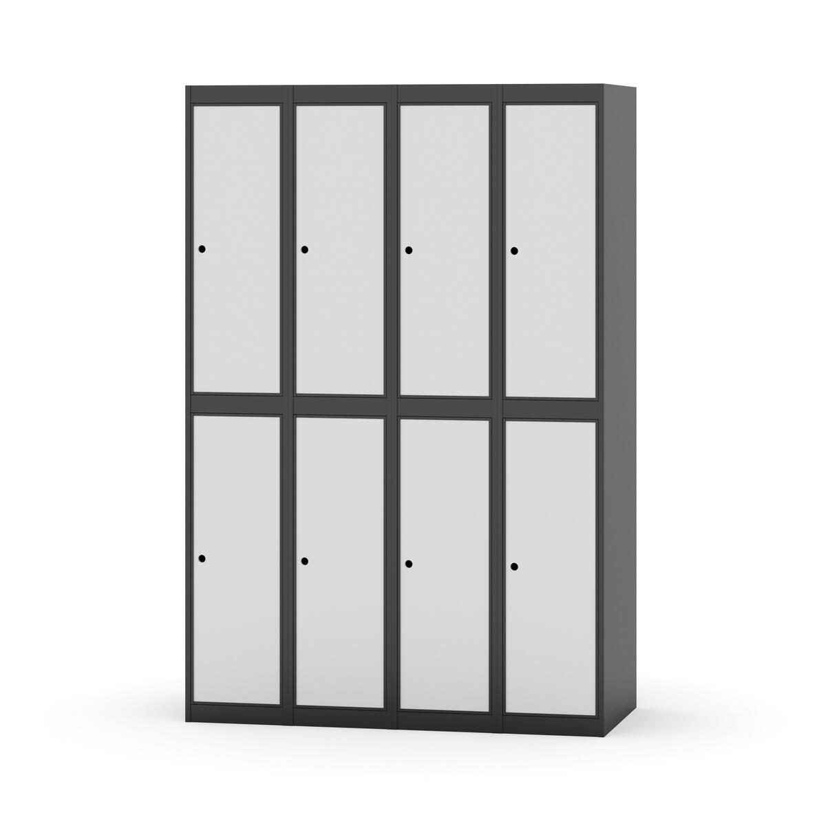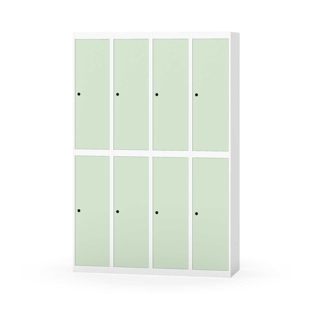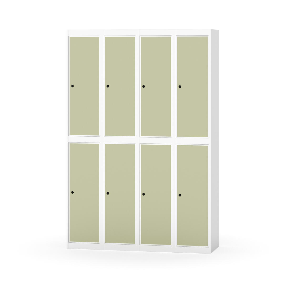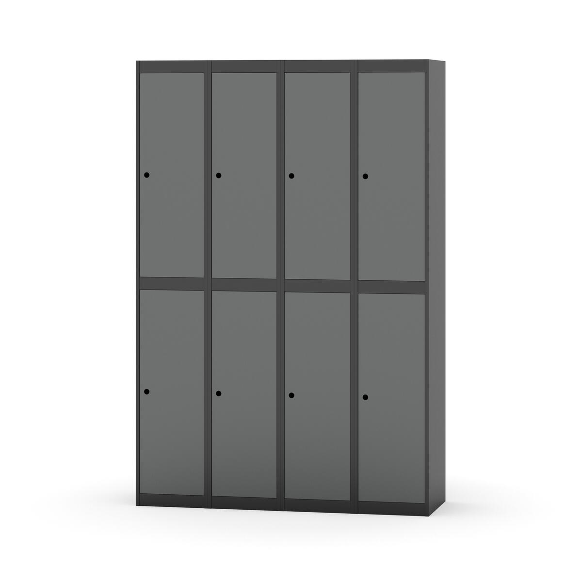 Klädskåp med helsvetsad stomme. Välj mellan plåt eller laminatdörr. Plåtdörren är försedd med dörrstopp i stål och infälld förstärkning kring låshålet. Laminatdörr infälld i stålram försedd med dörrstopp i stål. Dörrar är öppningsbara 90 grader. Inredning: Hyllplan och klädstång med två ankarkrokar. Slät golvyta utan tröskel. Ventilation genom hål i tak-/bottenplåt. Observera att lås och underrede beställs på separata artikelnummer. Lås kommer att vara monterade på skåp vid leverans. Valt underrede monteras på plats.