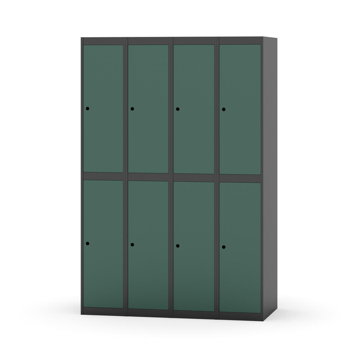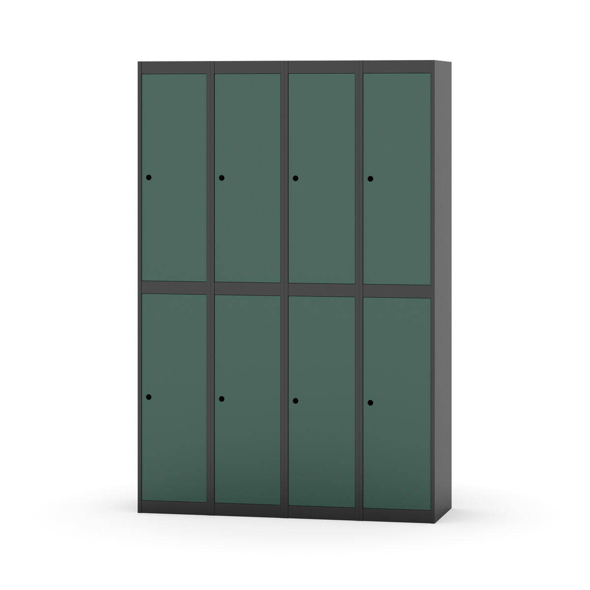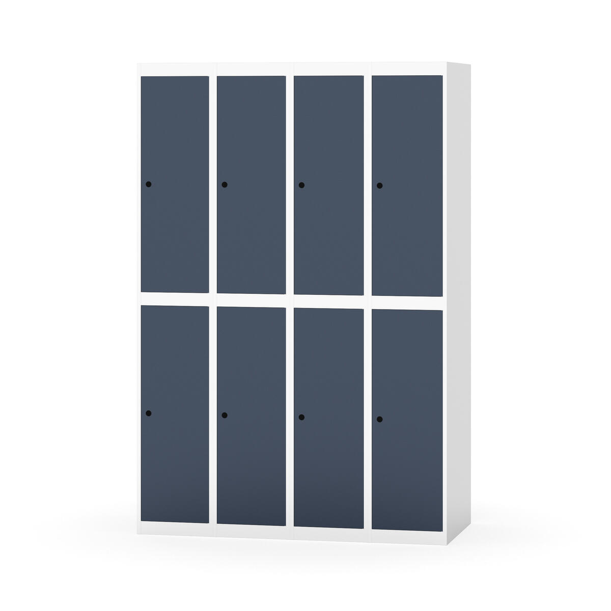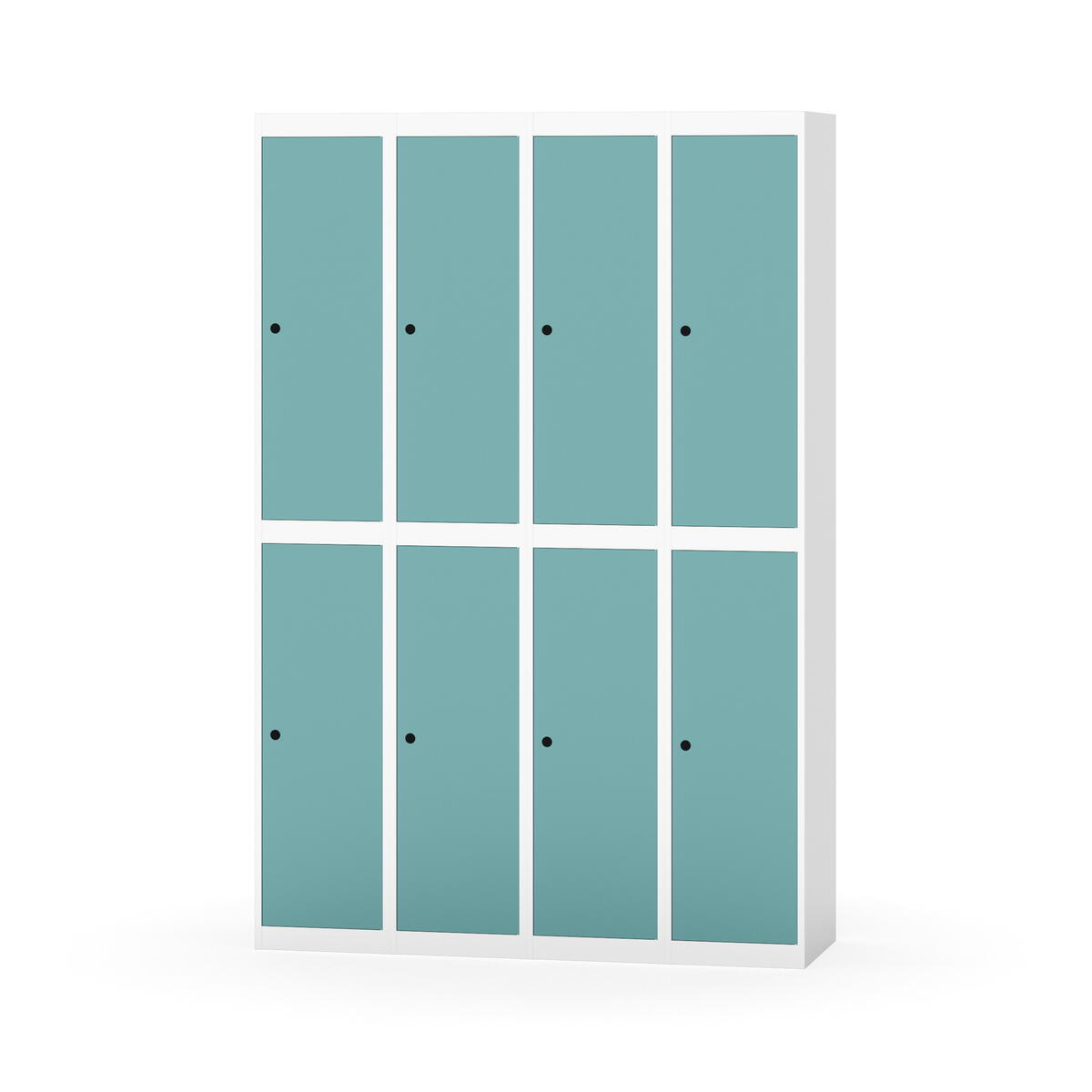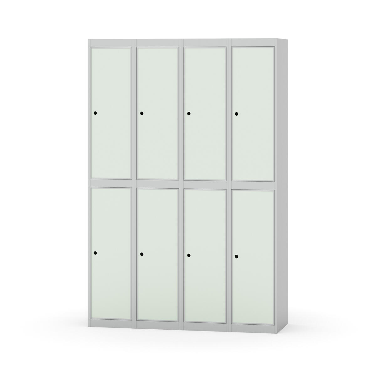 Klädskåp med helsvetsad stomme. Välj mellan plåt eller laminatdörr. Plåtdörren är försedd med dörrstopp i stål och infälld förstärkning kring låshålet. Laminatdörr infälld i stålram försedd med dörrstopp i stål. Dörrar är öppningsbara 90 grader. Inredning: Hyllplan och klädstång med två ankarkrokar. Slät golvyta utan tröskel. Ventilation genom hål i tak-/bottenplåt. Observera att lås och underrede beställs på separata artikelnummer. Lås kommer att vara monterade på skåp vid leverans. Valt underrede monteras på plats.
