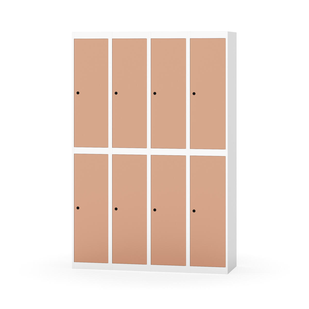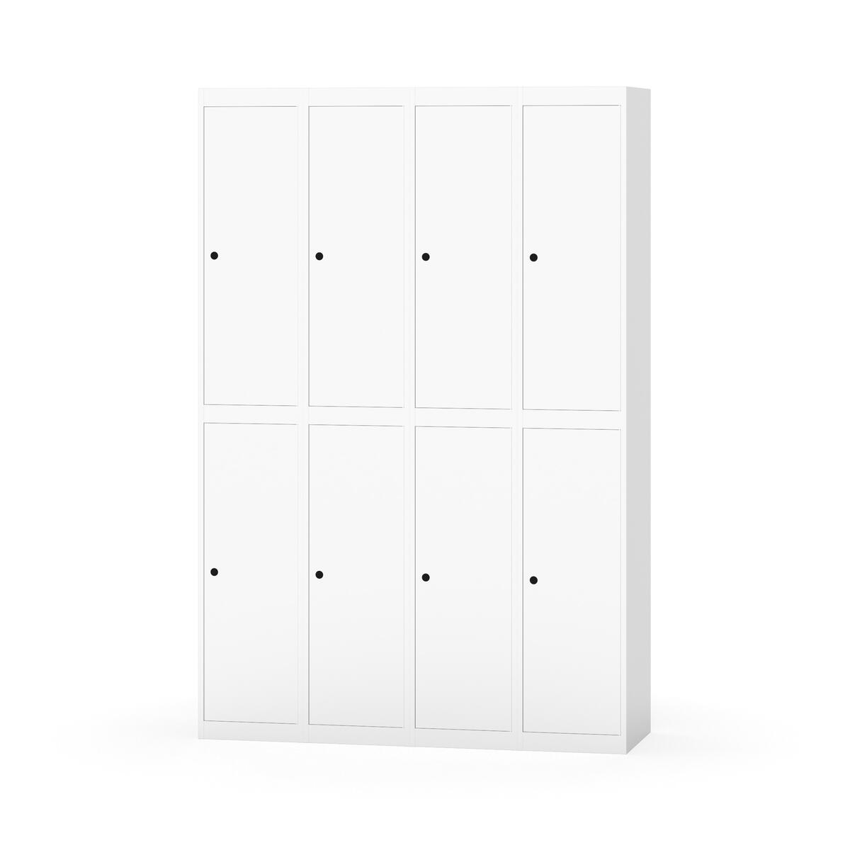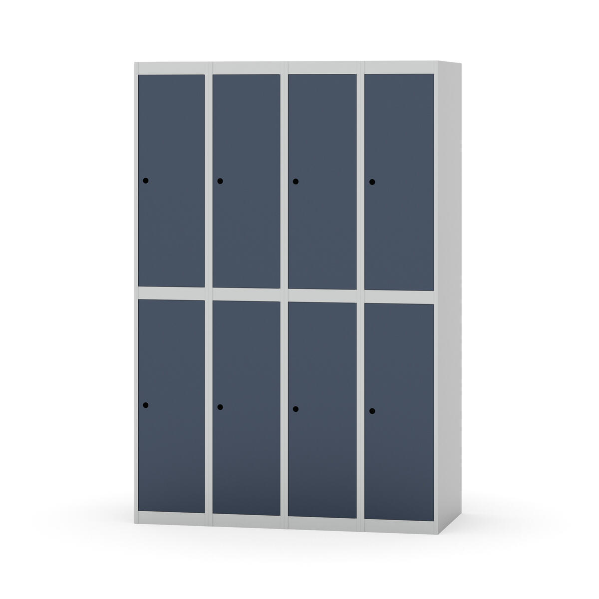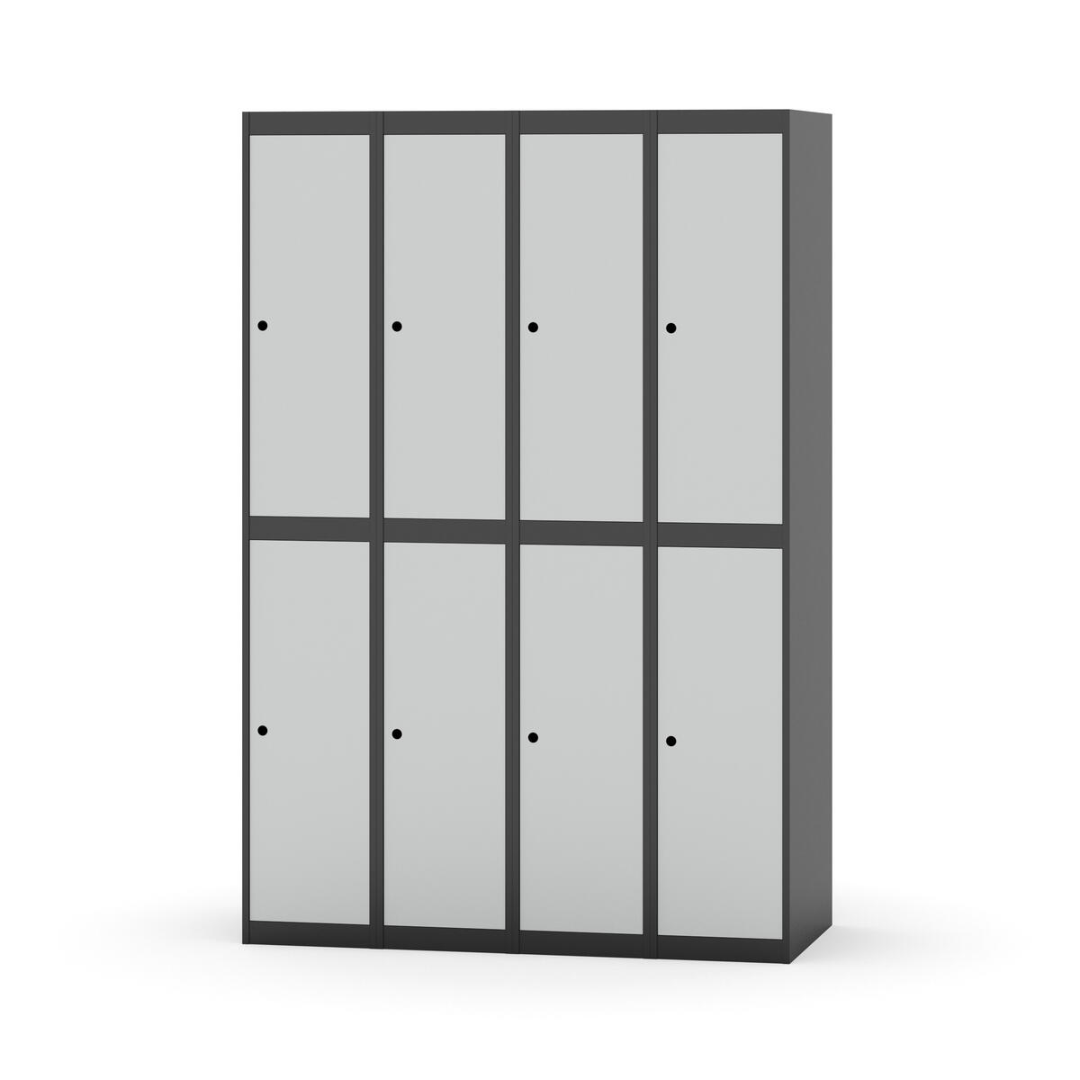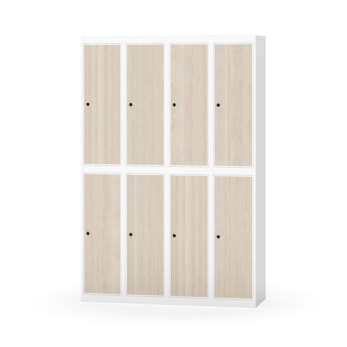 Klädskåp med helsvetsad stomme. Välj mellan plåt eller laminatdörr. Plåtdörren är försedd med dörrstopp i stål och infälld förstärkning kring låshålet. Laminatdörr infälld i stålram försedd med dörrstopp i stål. Dörrar är öppningsbara 90 grader. Inredning: Hyllplan och klädstång med två ankarkrokar. Slät golvyta utan tröskel. Ventilation genom hål i tak-/bottenplåt. Observera att lås och underrede beställs på separata artikelnummer. Lås kommer att vara monterade på skåp vid leverans. Valt underrede monteras på plats.