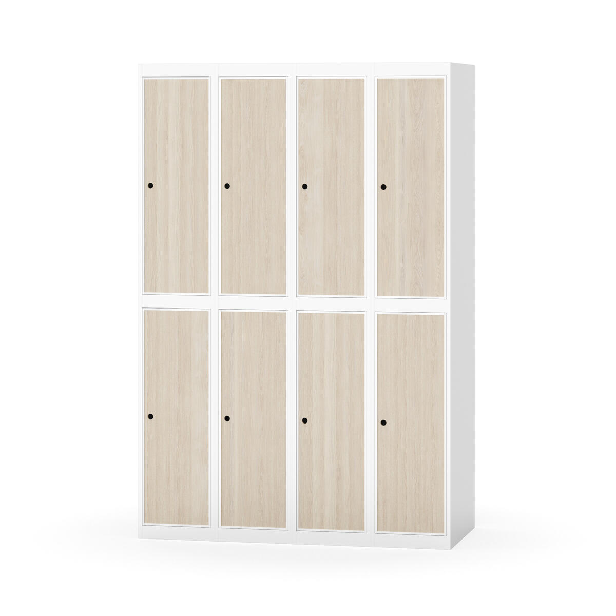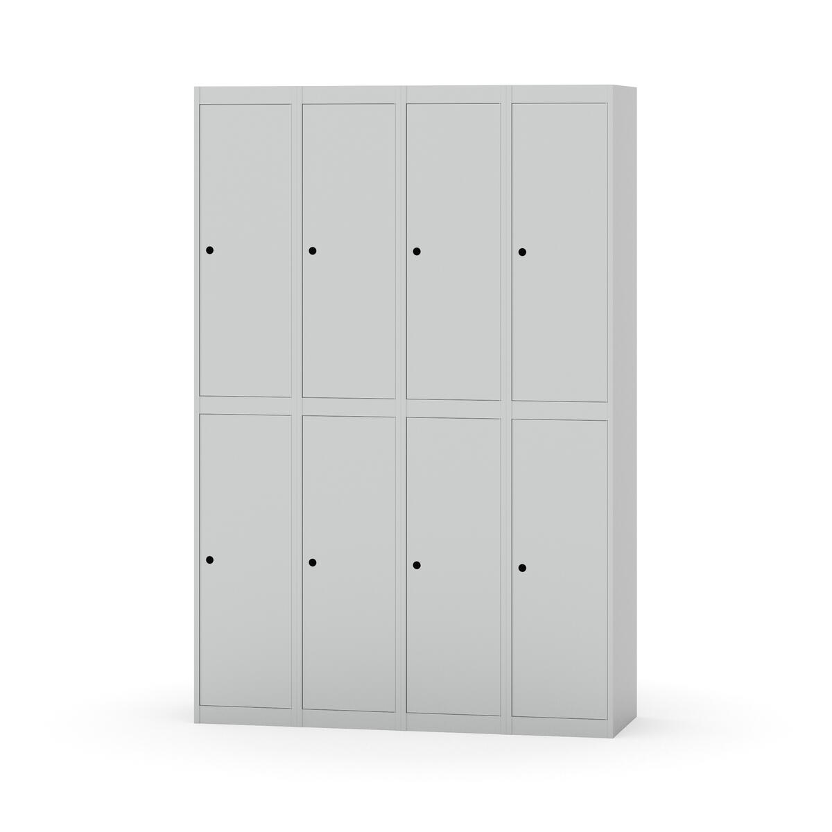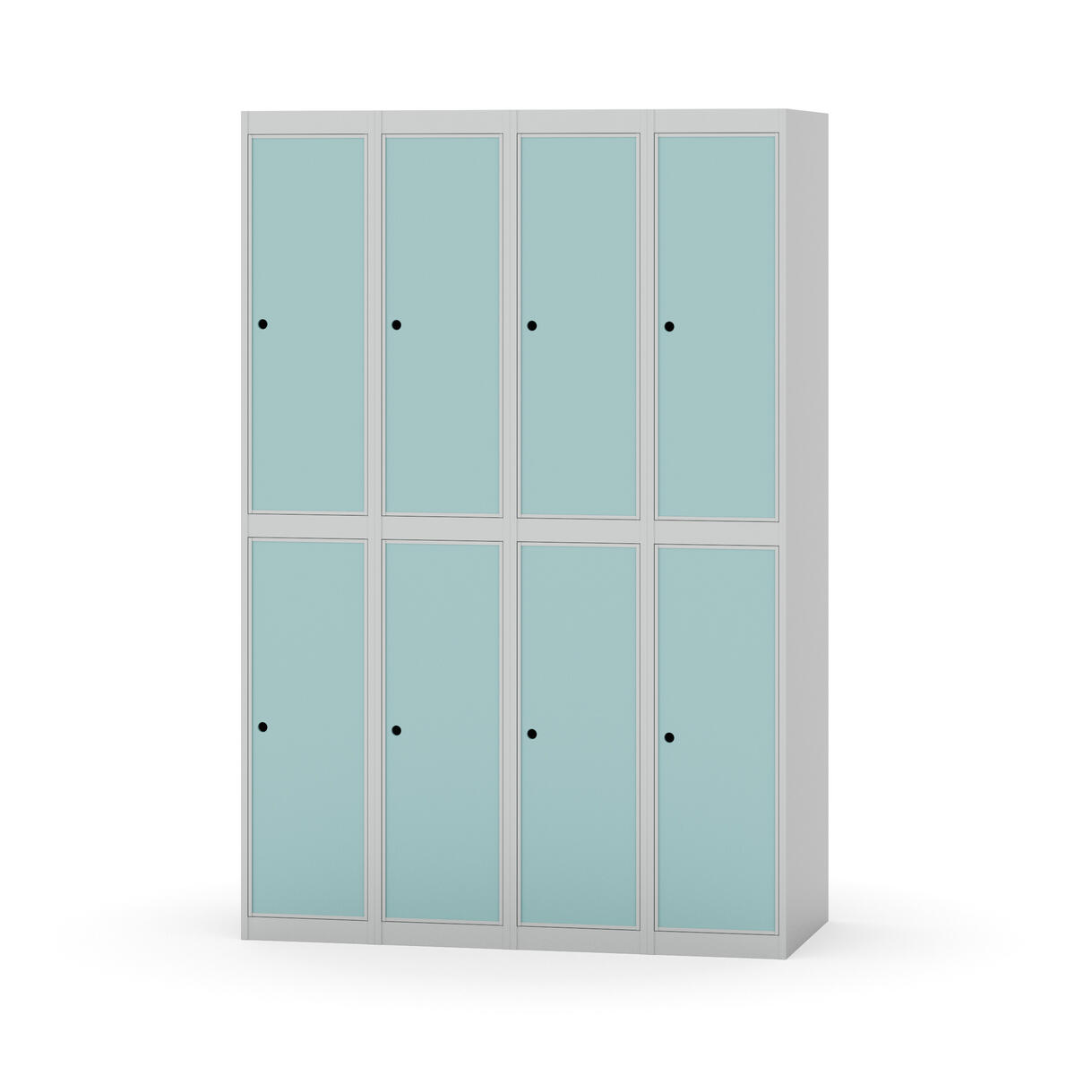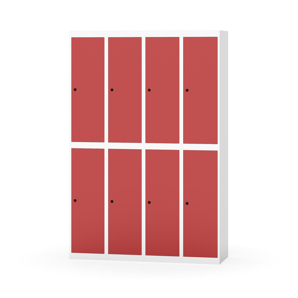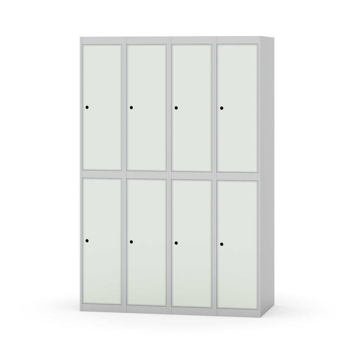 Klädskåp med helsvetsad stomme. Välj mellan plåt eller laminatdörr. Plåtdörren är försedd med dörrstopp i stål och infälld förstärkning kring låshålet. Laminatdörr infälld i stålram försedd med dörrstopp i stål. Dörrar är öppningsbara 90 grader. Inredning: Hyllplan och klädstång med två ankarkrokar. Slät golvyta utan tröskel. Ventilation genom hål i tak-/bottenplåt. Observera att lås och underrede beställs på separata artikelnummer. Lås kommer att vara monterade på skåp vid leverans. Valt underrede monteras på plats.