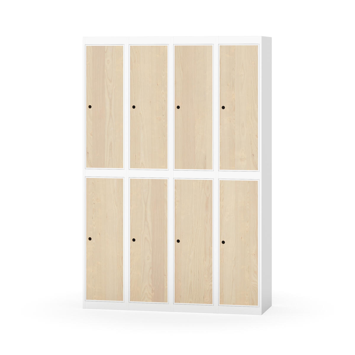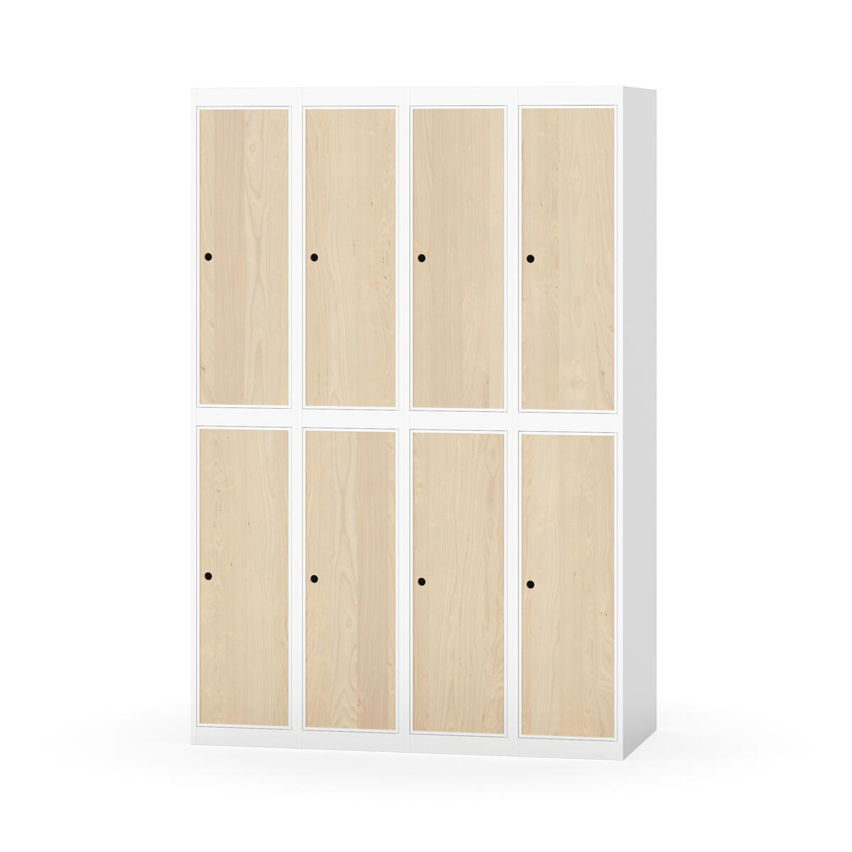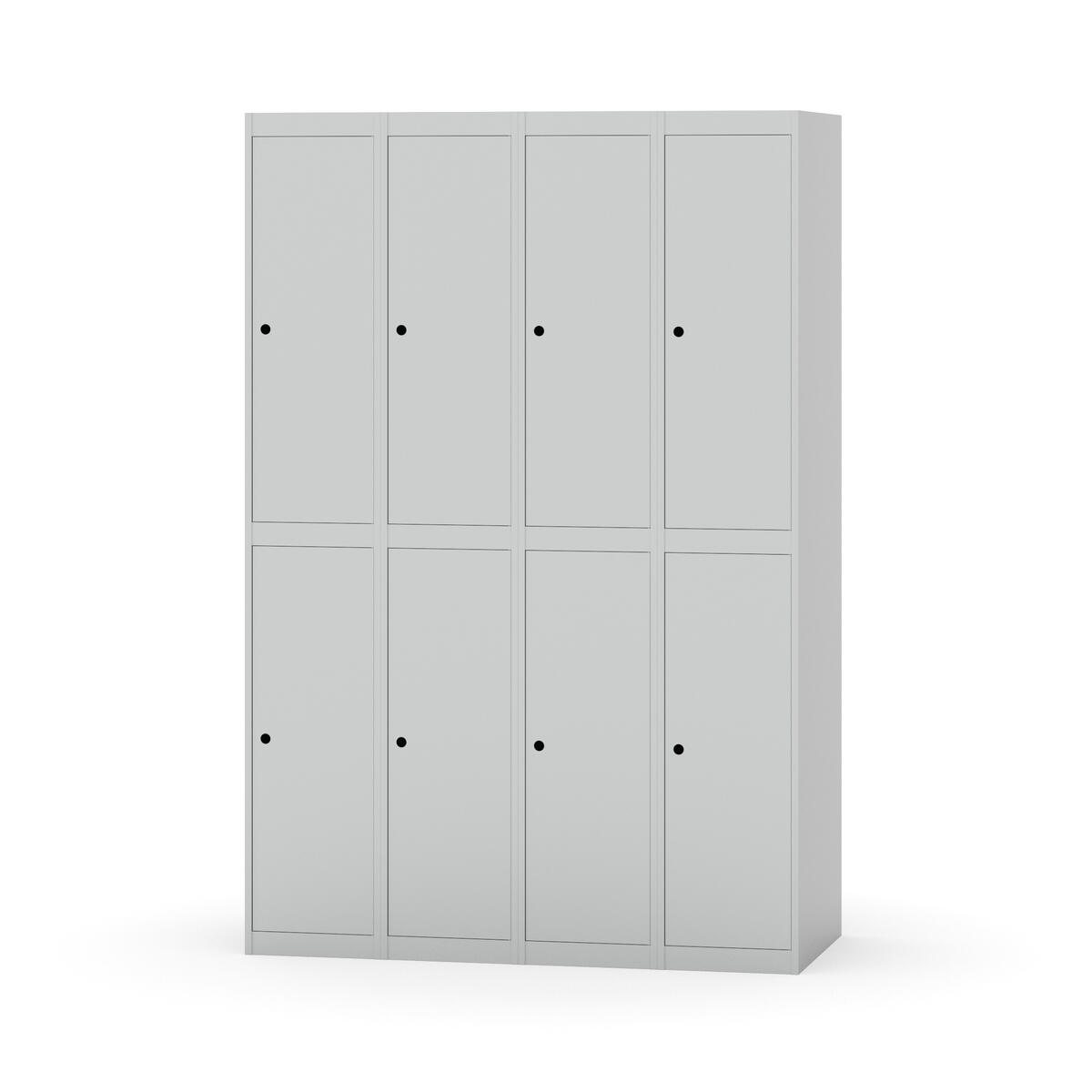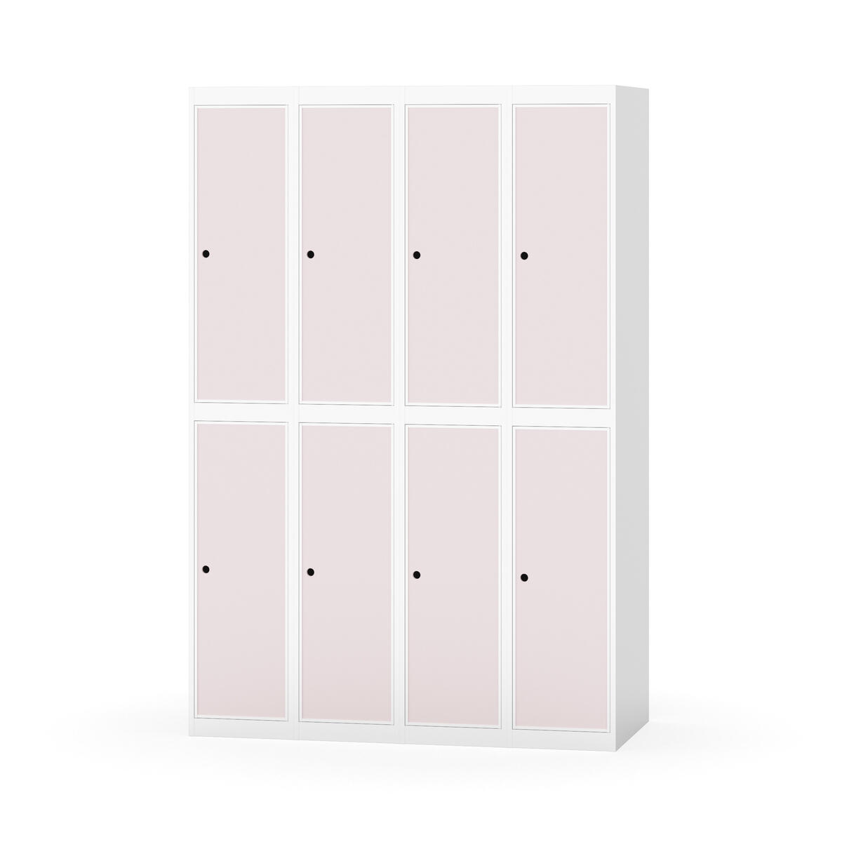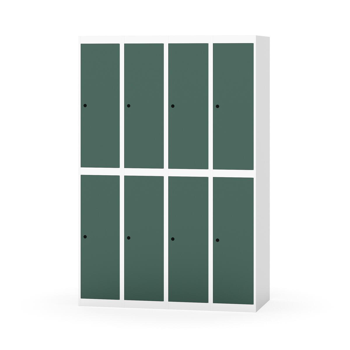 Klädskåp med helsvetsad stomme. Välj mellan plåt eller laminatdörr. Plåtdörren är försedd med dörrstopp i stål och infälld förstärkning kring låshålet. Laminatdörr infälld i stålram försedd med dörrstopp i stål. Dörrar är öppningsbara 90 grader. Inredning: Hyllplan och klädstång med två ankarkrokar. Slät golvyta utan tröskel. Ventilation genom hål i tak-/bottenplåt. Observera att lås och underrede beställs på separata artikelnummer. Lås kommer att vara monterade på skåp vid leverans. Valt underrede monteras på plats.