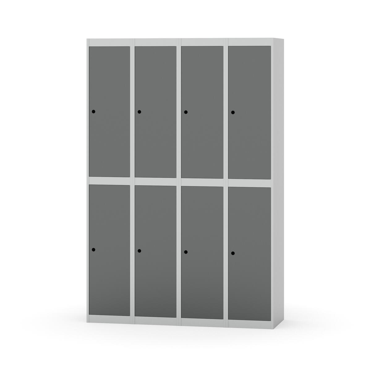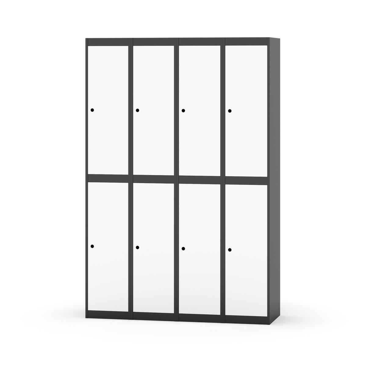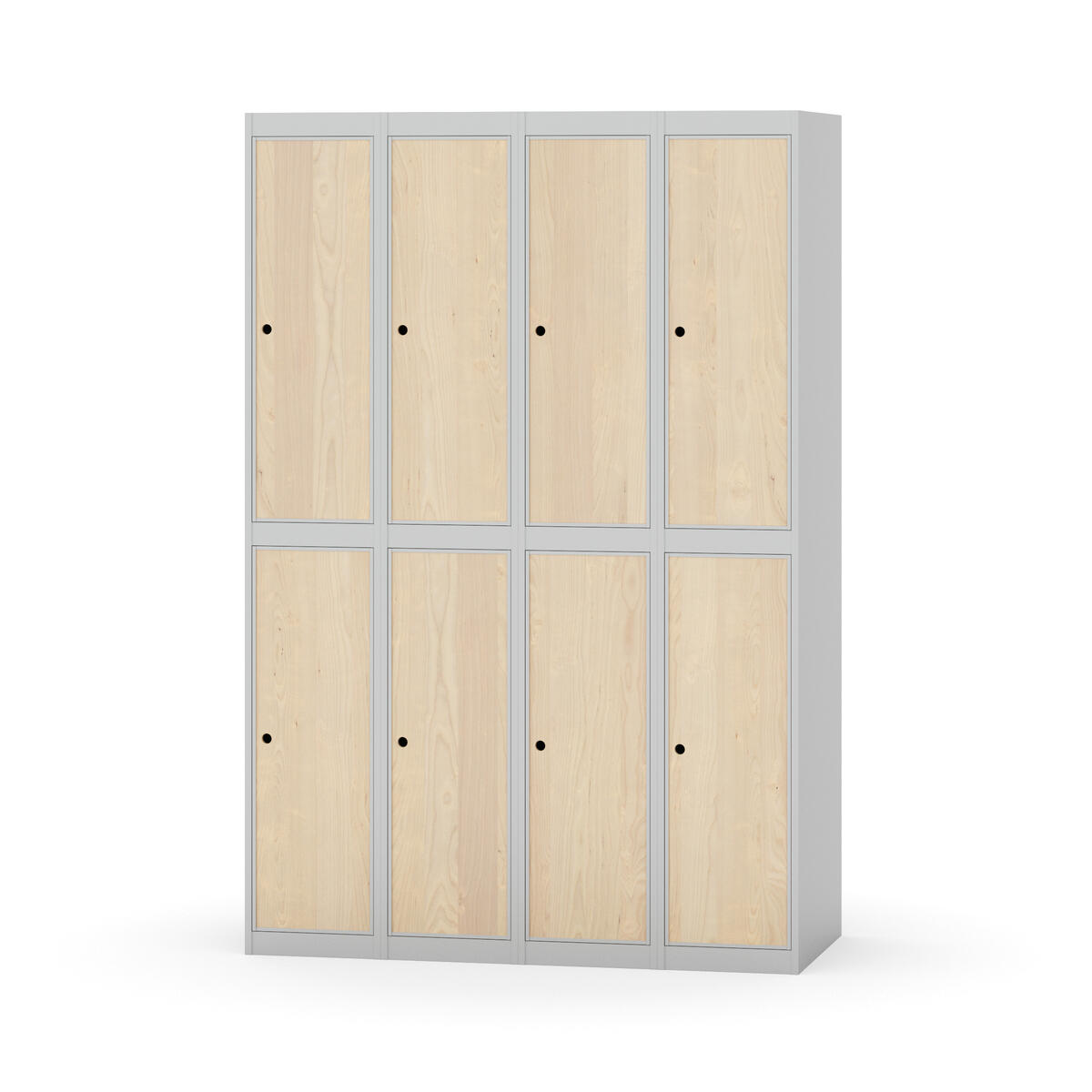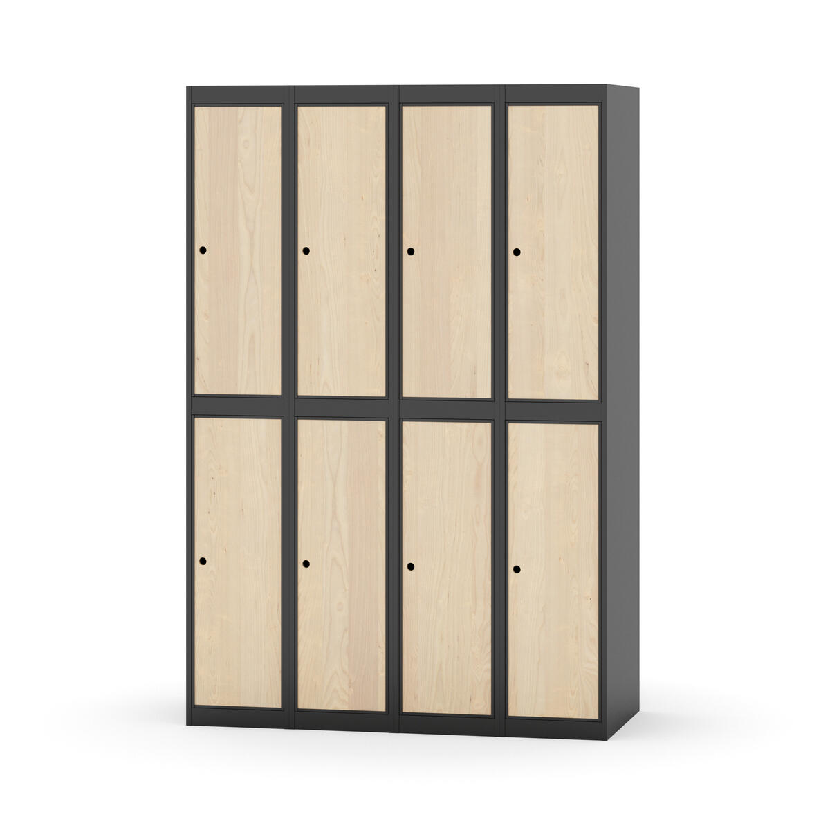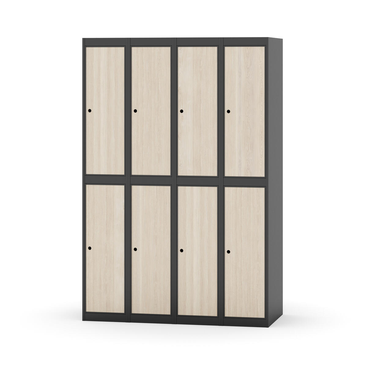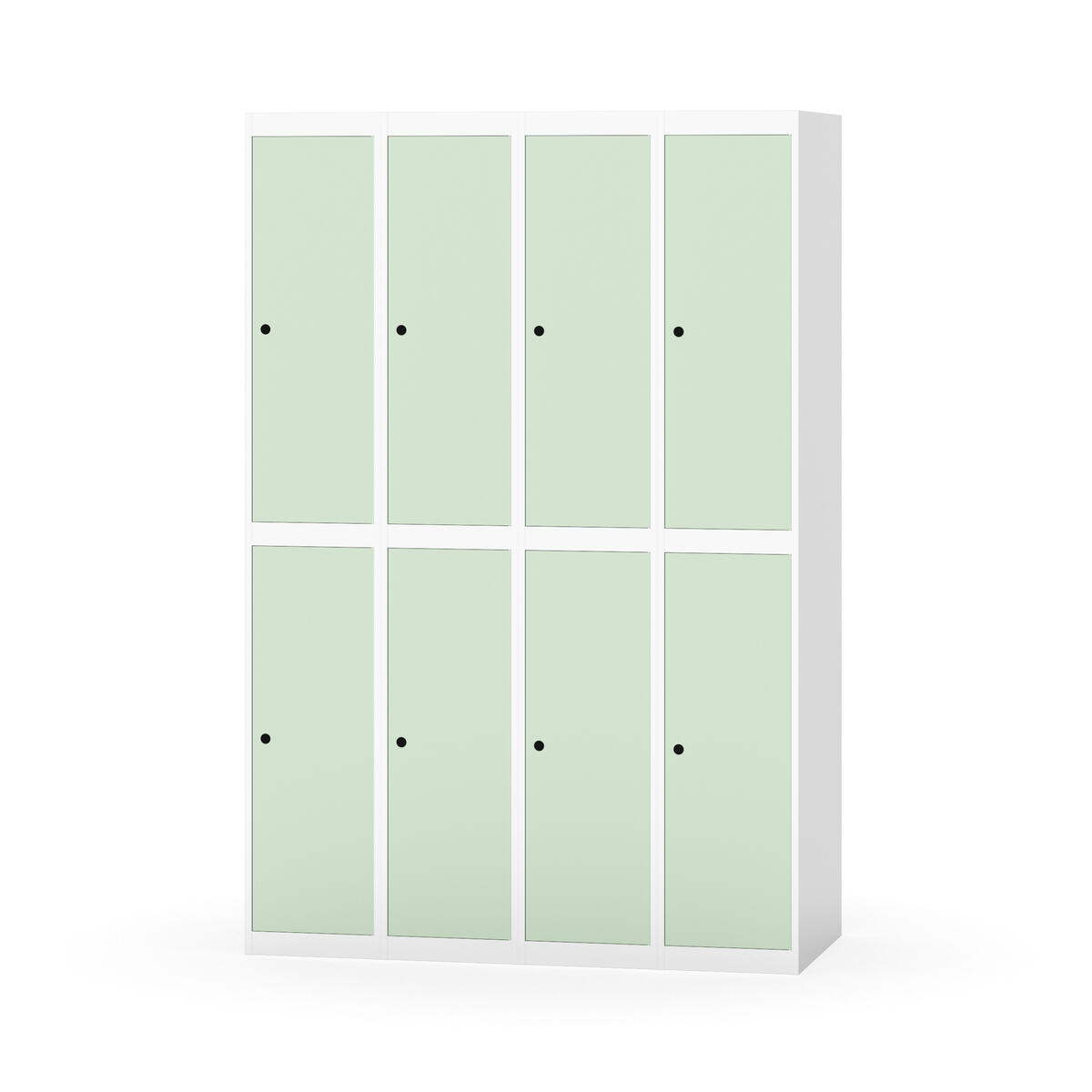 Klädskåp med helsvetsad stomme. Välj mellan plåt eller laminatdörr. Plåtdörren är försedd med dörrstopp i stål och infälld förstärkning kring låshålet. Laminatdörr infälld i stålram försedd med dörrstopp i stål. Dörrar är öppningsbara 90 grader. Inredning: Hyllplan och klädstång med två ankarkrokar. Slät golvyta utan tröskel. Ventilation genom hål i tak-/bottenplåt. Observera att lås och underrede beställs på separata artikelnummer. Lås kommer att vara monterade på skåp vid leverans. Valt underrede monteras på plats.