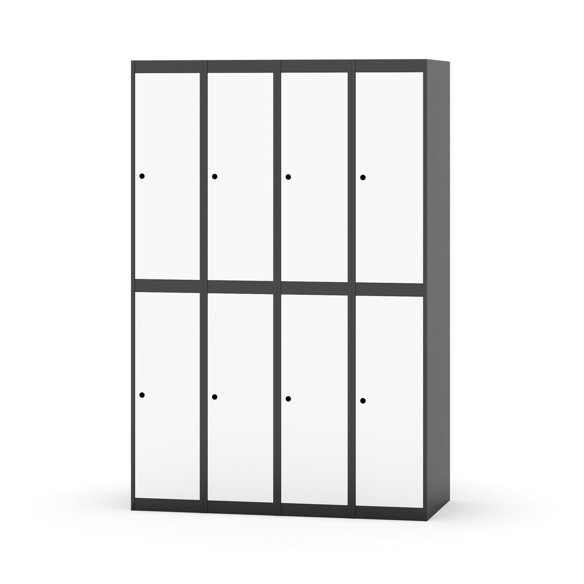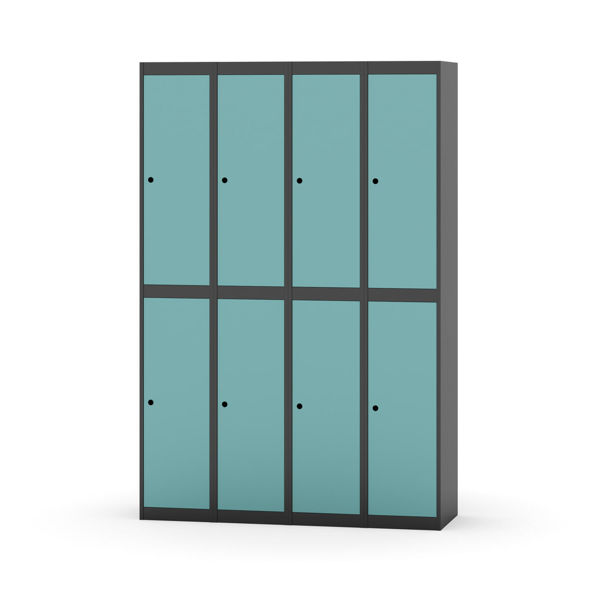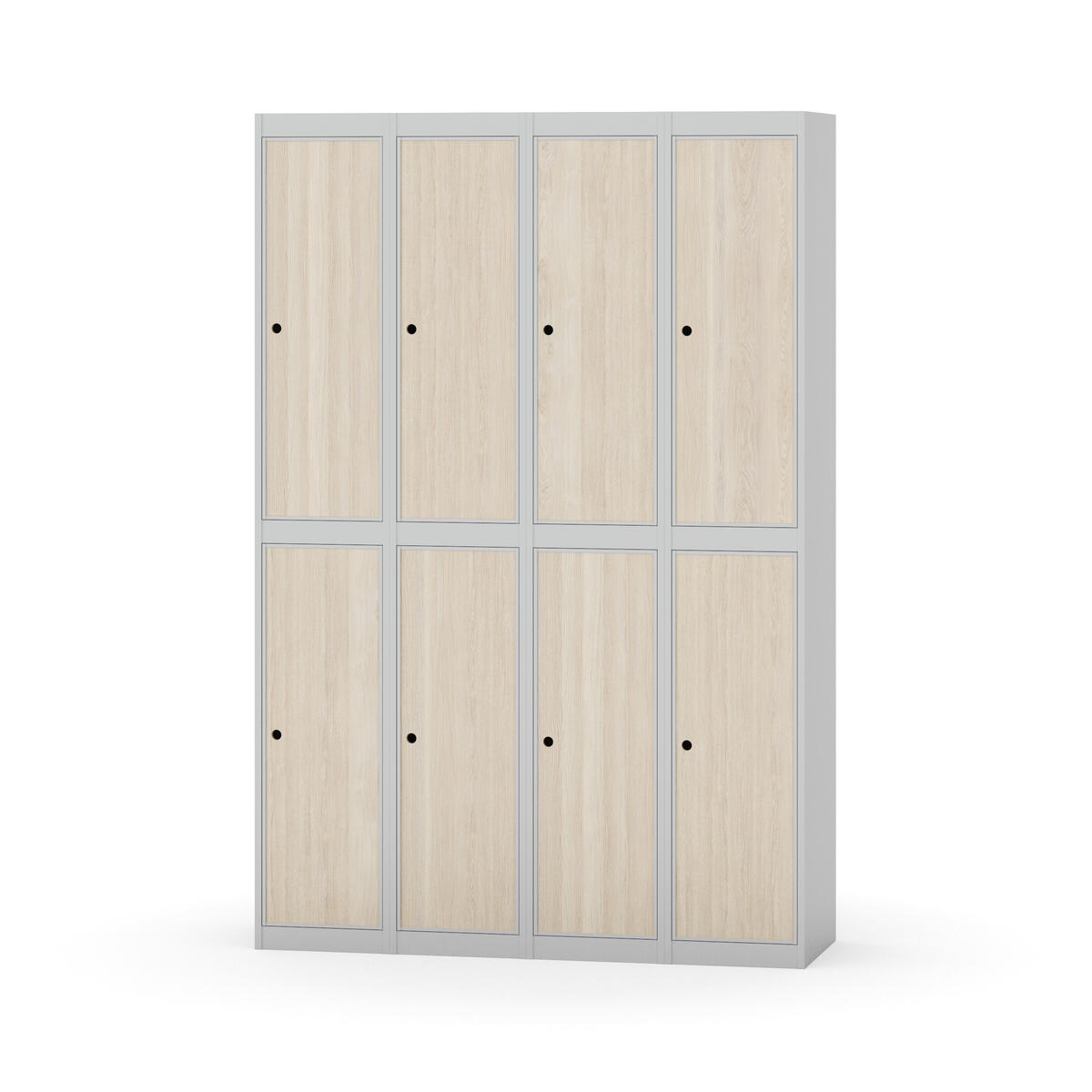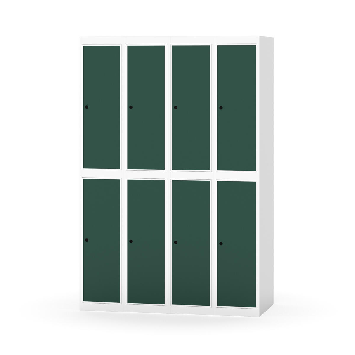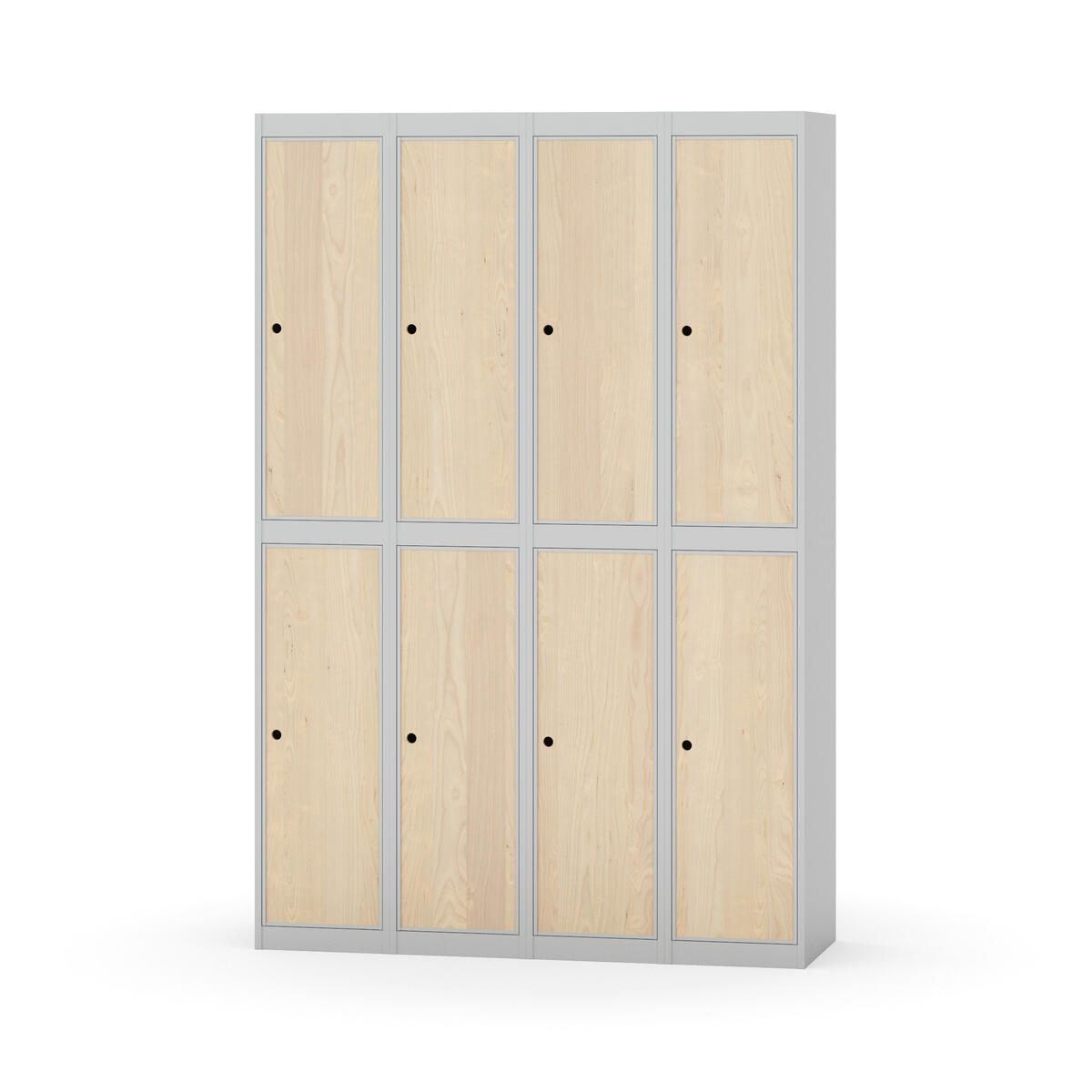 Klädskåp med helsvetsad stomme. Välj mellan plåt eller laminatdörr. Plåtdörren är försedd med dörrstopp i stål och infälld förstärkning kring låshålet. Laminatdörr infälld i stålram försedd med dörrstopp i stål. Dörrar är öppningsbara 90 grader. Inredning: Hyllplan och klädstång med två ankarkrokar. Slät golvyta utan tröskel. Ventilation genom hål i tak-/bottenplåt. Observera att lås och underrede beställs på separata artikelnummer. Lås kommer att vara monterade på skåp vid leverans. Valt underrede monteras på plats.