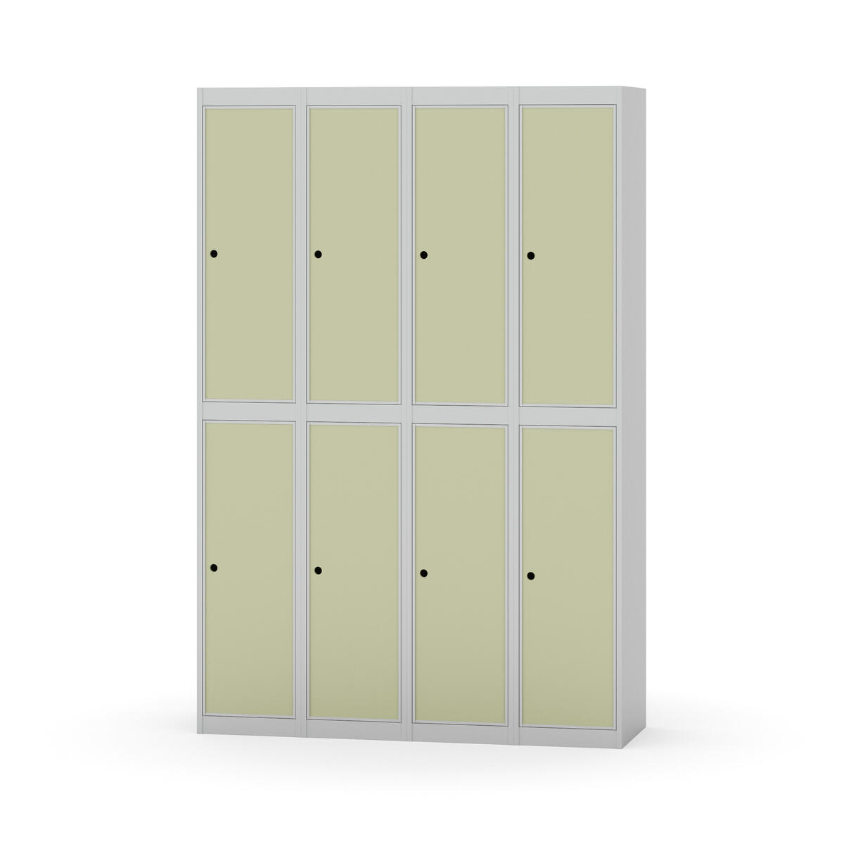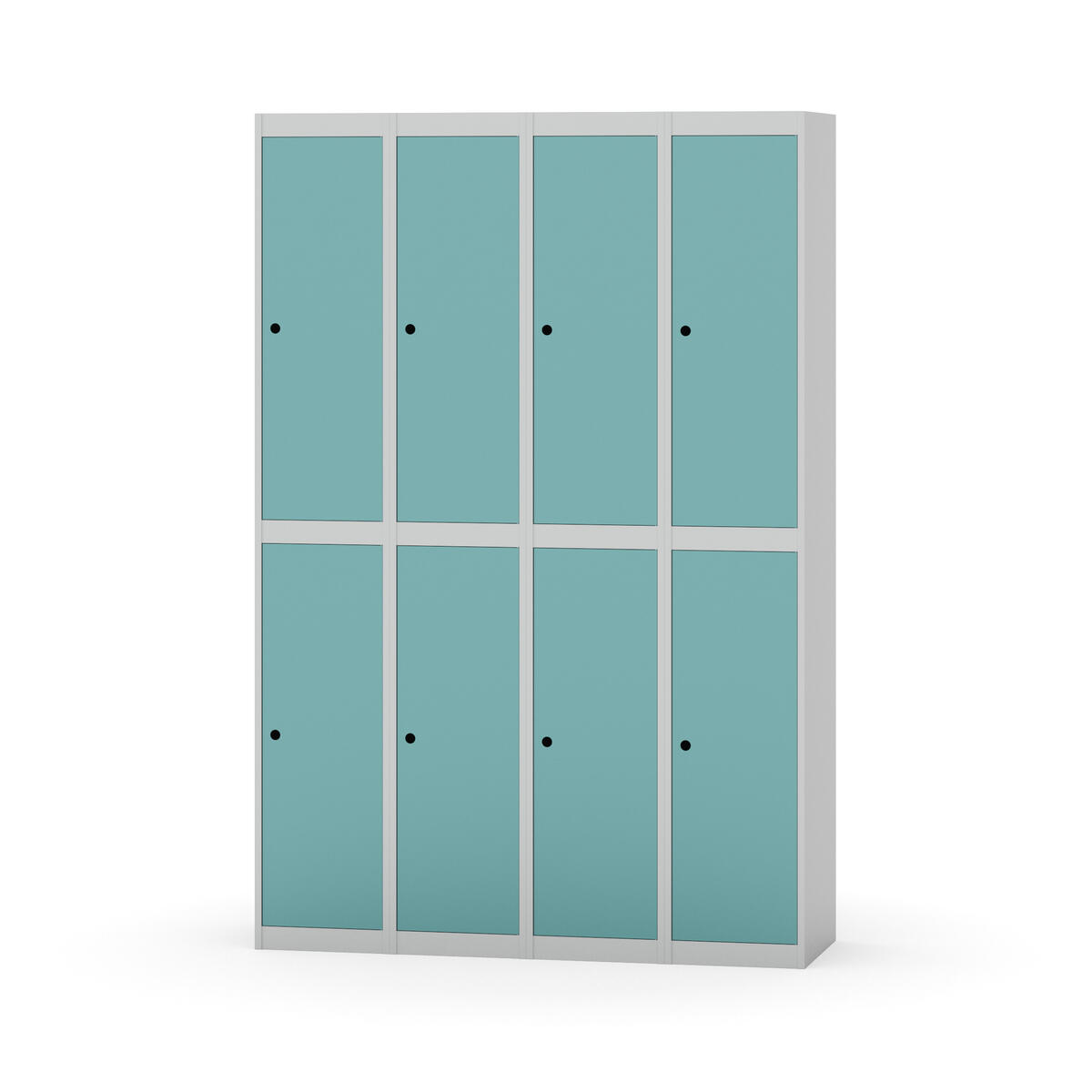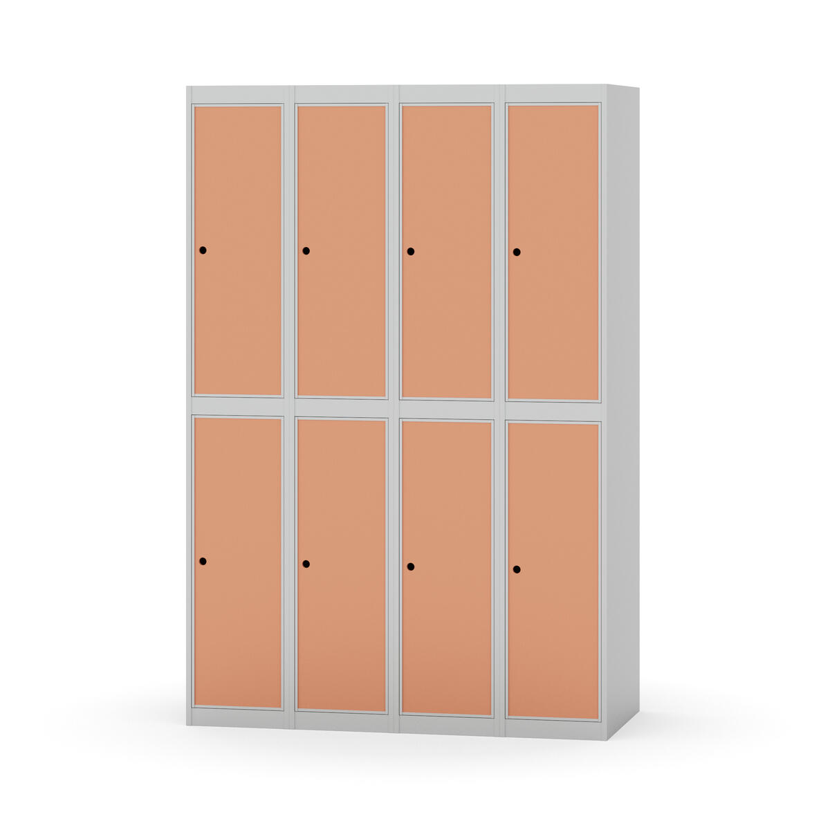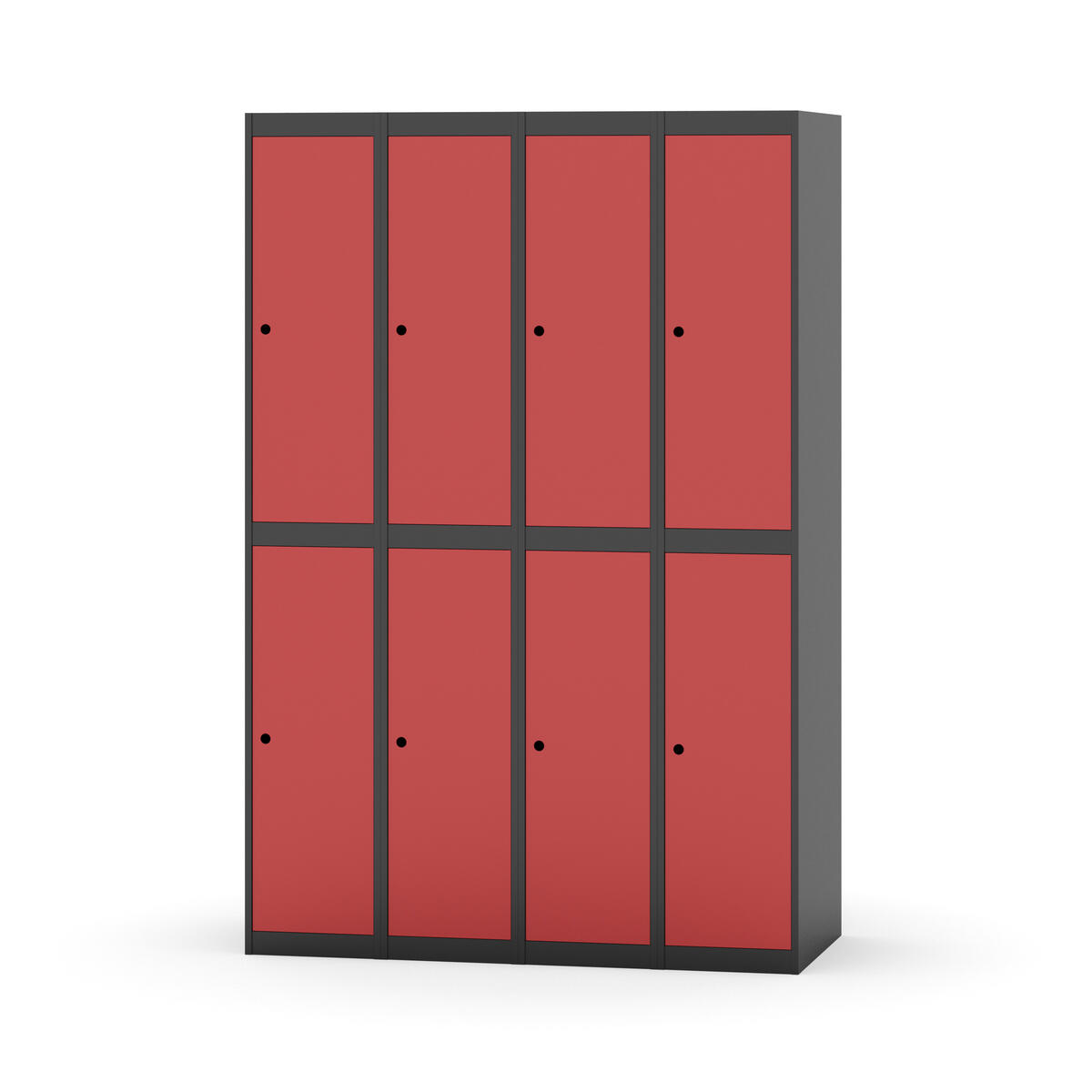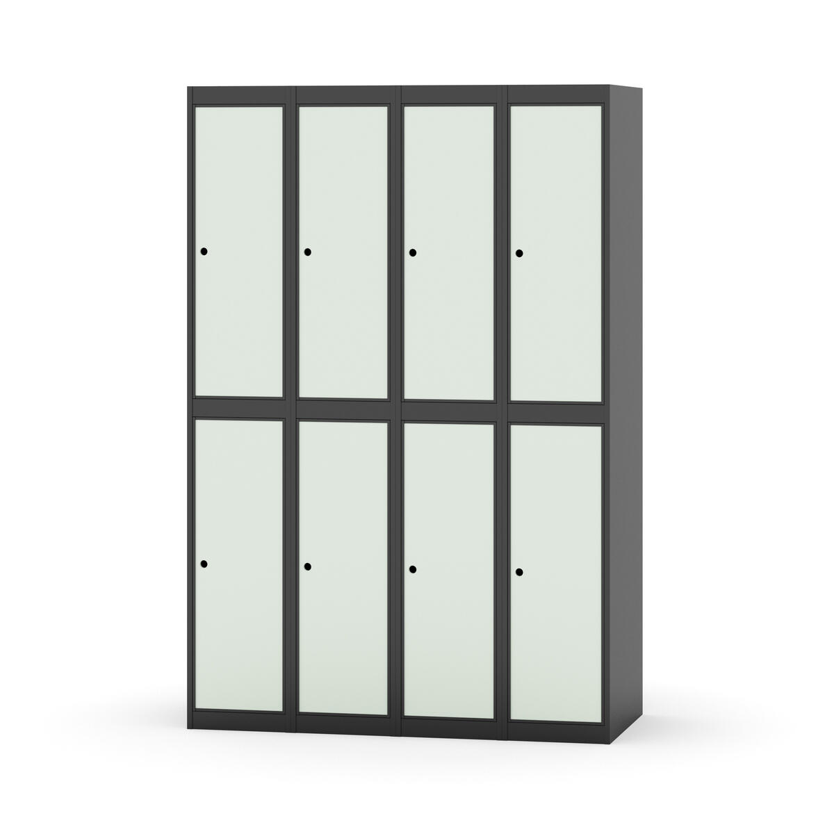 Klädskåp med helsvetsad stomme. Välj mellan plåt eller laminatdörr. Plåtdörren är försedd med dörrstopp i stål och infälld förstärkning kring låshålet. Laminatdörr infälld i stålram försedd med dörrstopp i stål. Dörrar är öppningsbara 90 grader. Inredning: Hyllplan och klädstång med två ankarkrokar. Slät golvyta utan tröskel. Ventilation genom hål i tak-/bottenplåt. Observera att lås och underrede beställs på separata artikelnummer. Lås kommer att vara monterade på skåp vid leverans. Valt underrede monteras på plats.