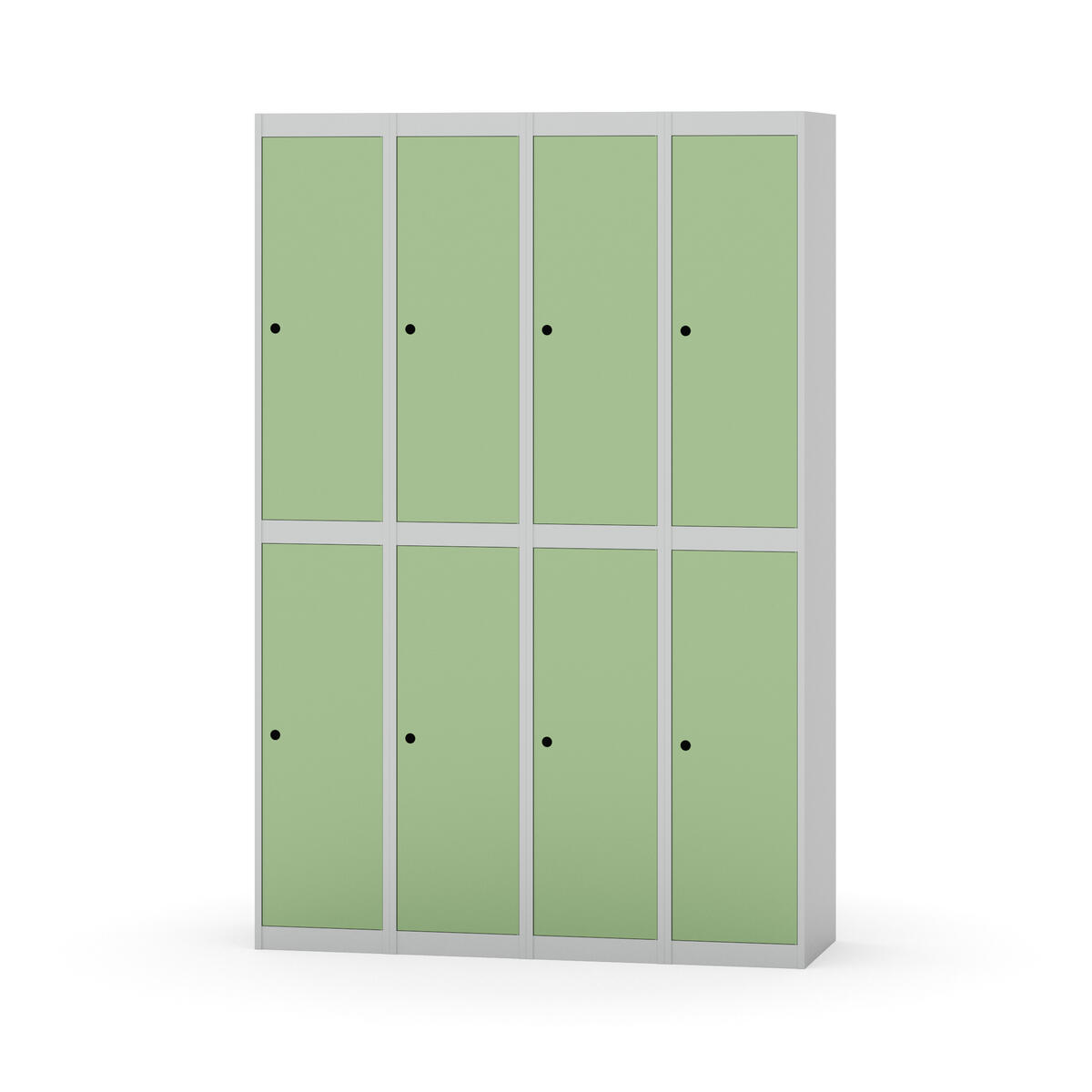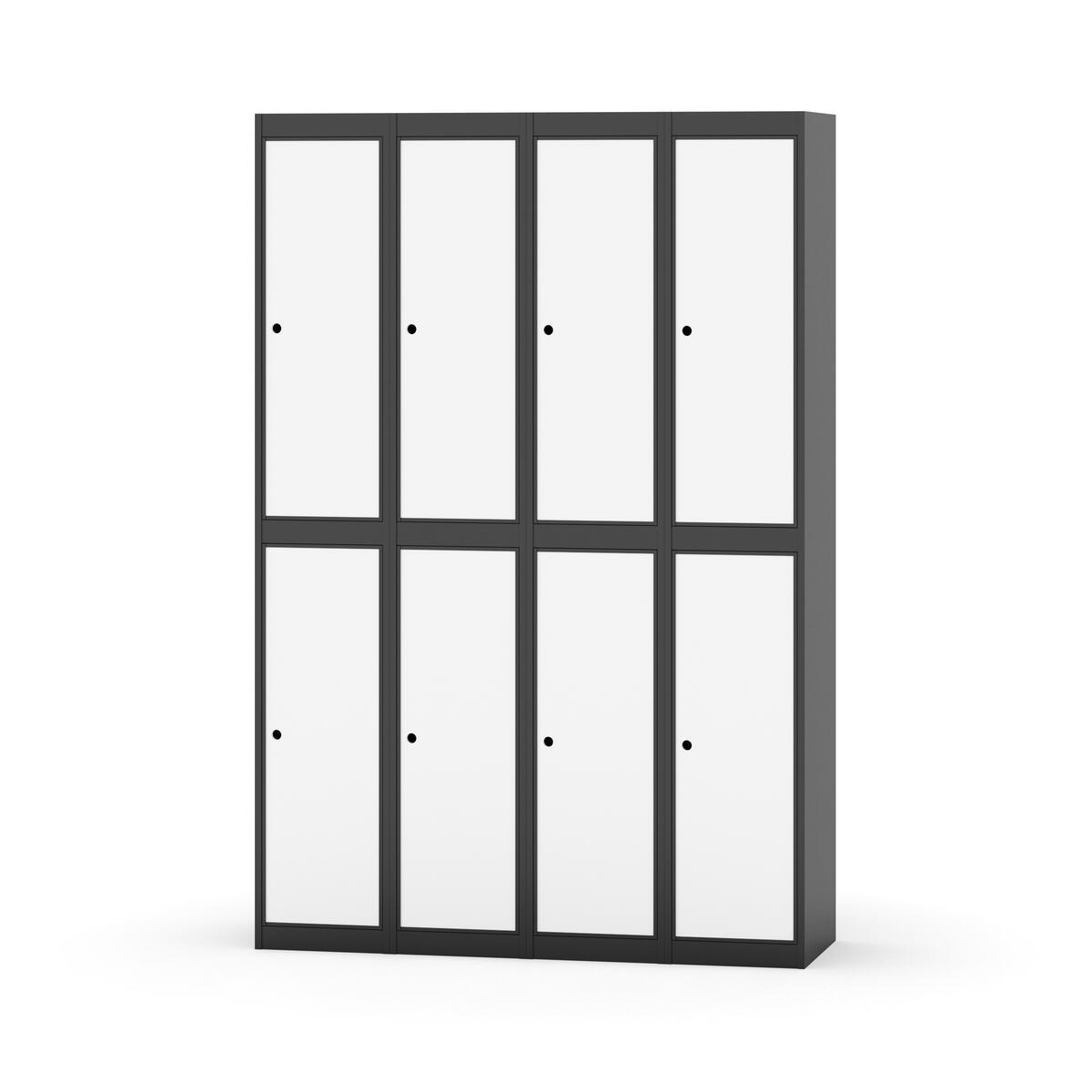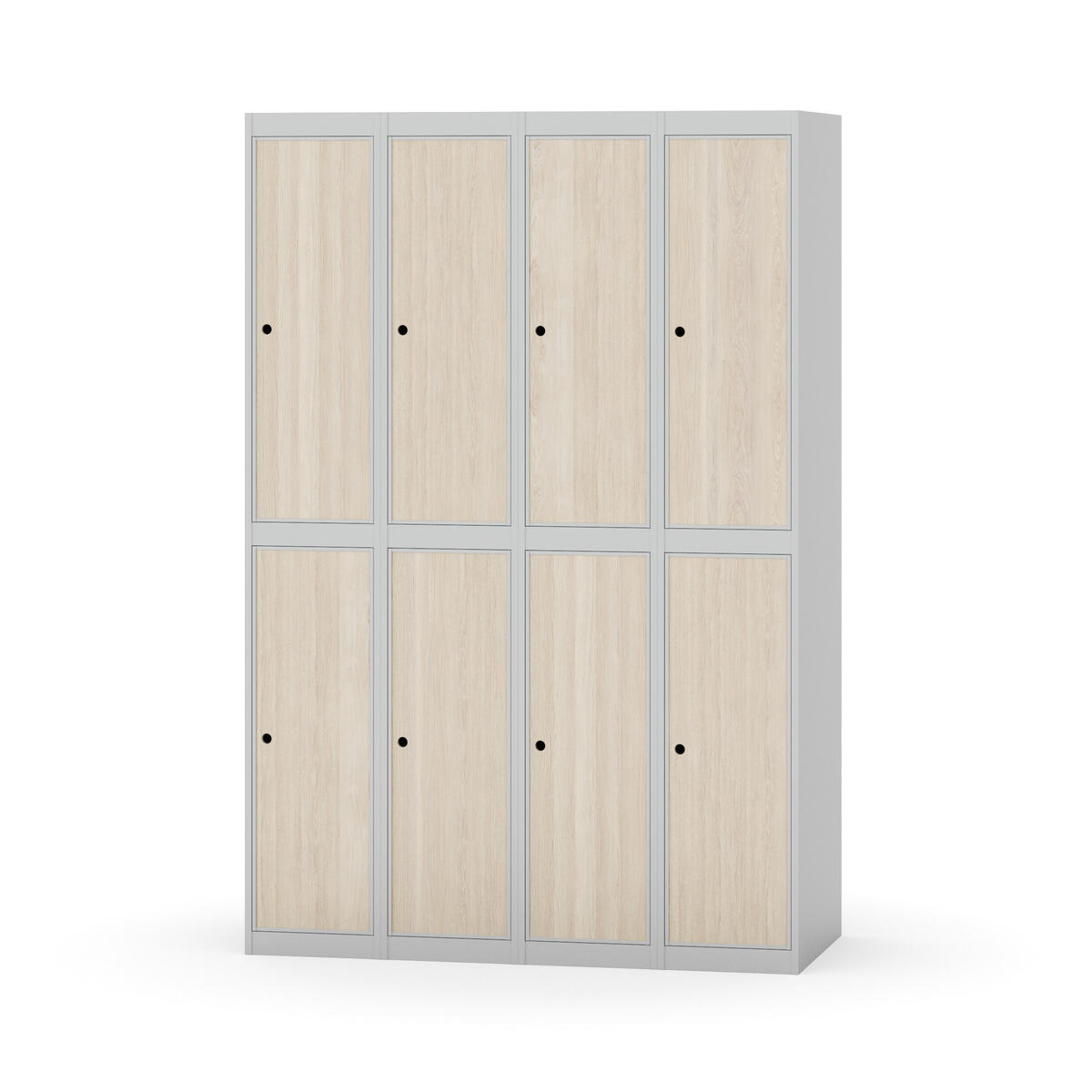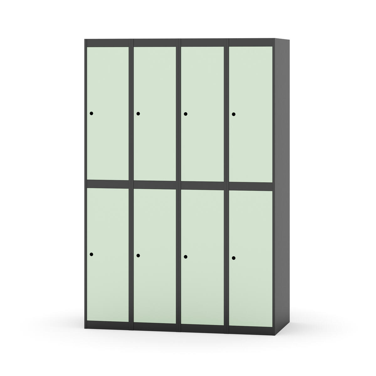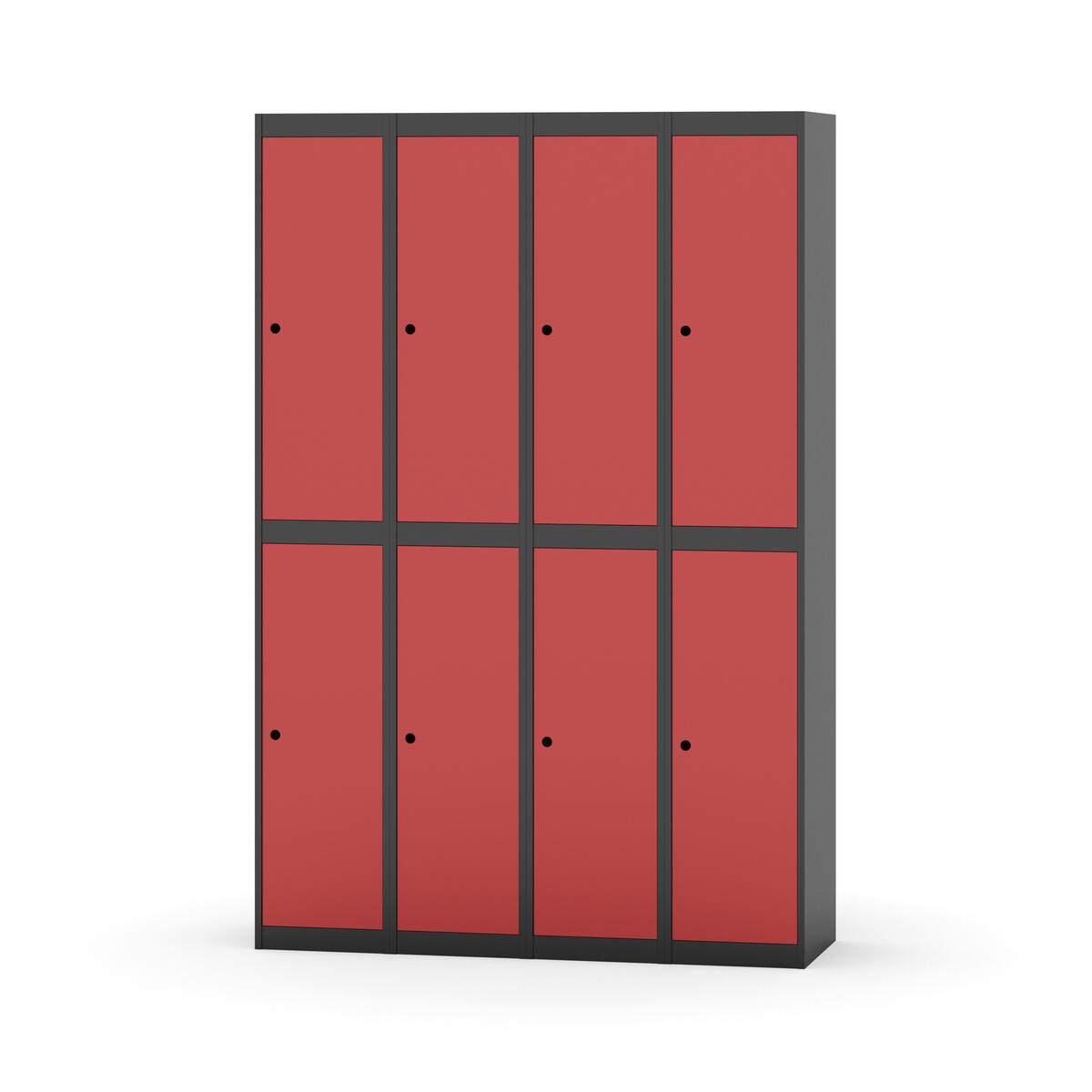 Klädskåp med helsvetsad stomme. Välj mellan plåt eller laminatdörr. Plåtdörren är försedd med dörrstopp i stål och infälld förstärkning kring låshålet. Laminatdörr infälld i stålram försedd med dörrstopp i stål. Dörrar är öppningsbara 90 grader. Inredning: Hyllplan och klädstång med två ankarkrokar. Slät golvyta utan tröskel. Ventilation genom hål i tak-/bottenplåt. Observera att lås och underrede beställs på separata artikelnummer. Lås kommer att vara monterade på skåp vid leverans. Valt underrede monteras på plats.