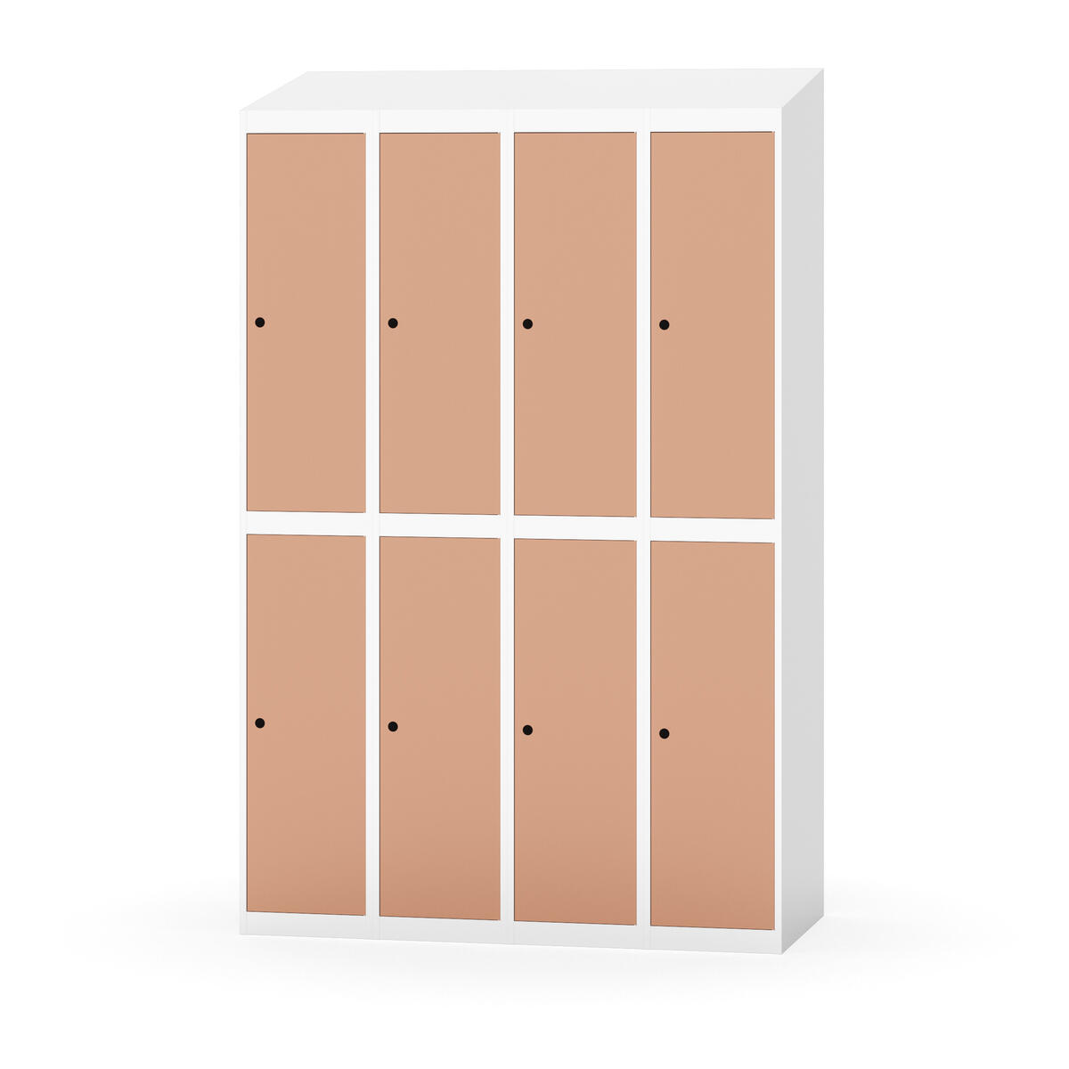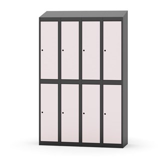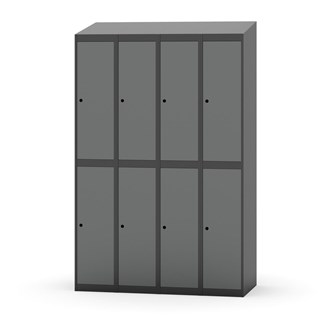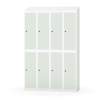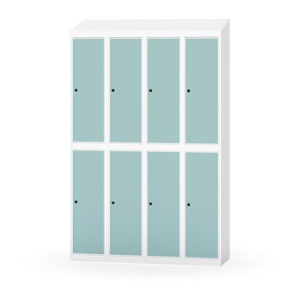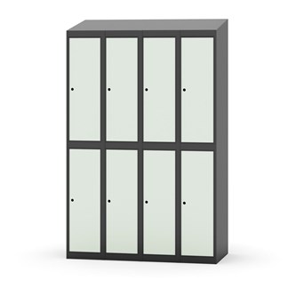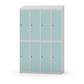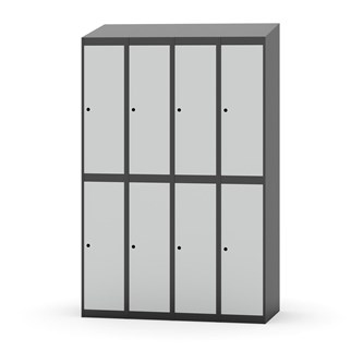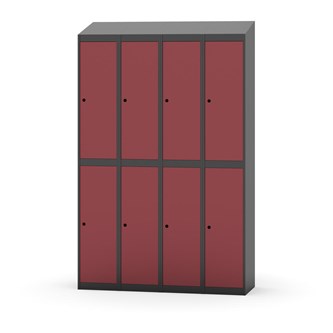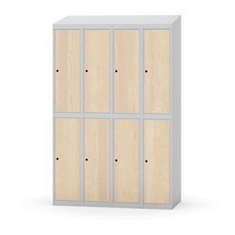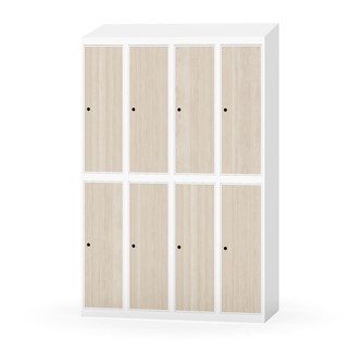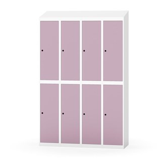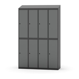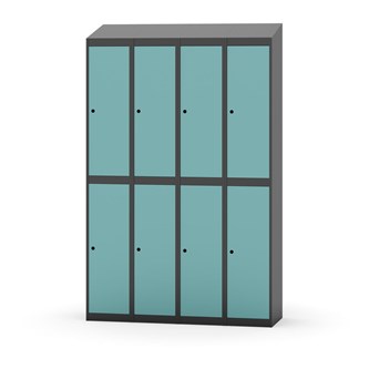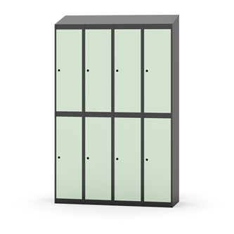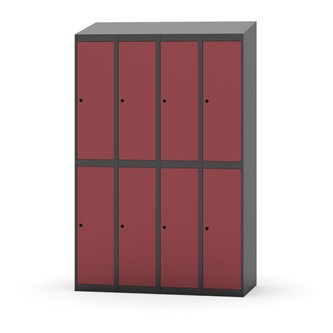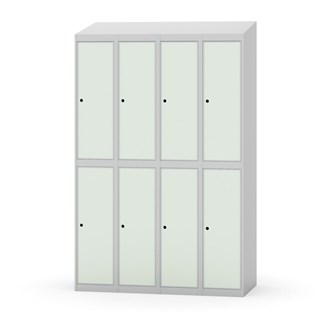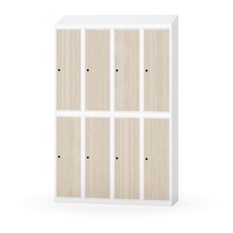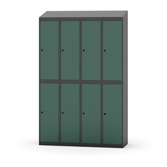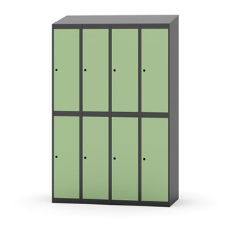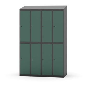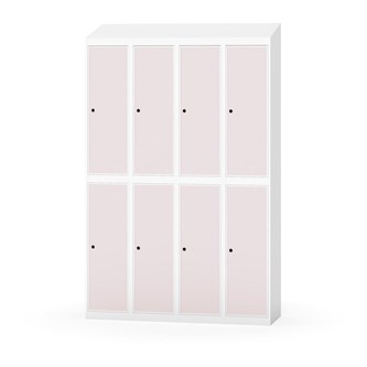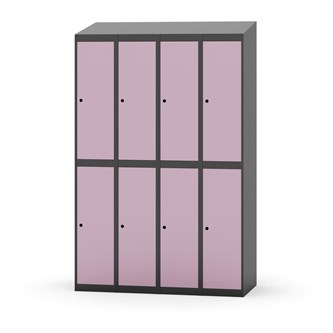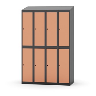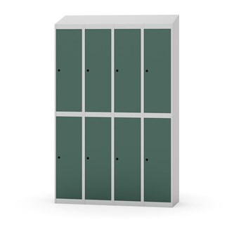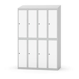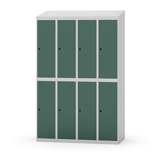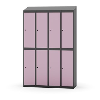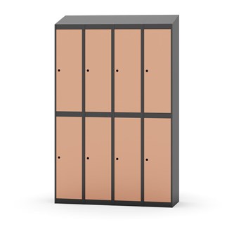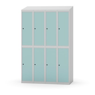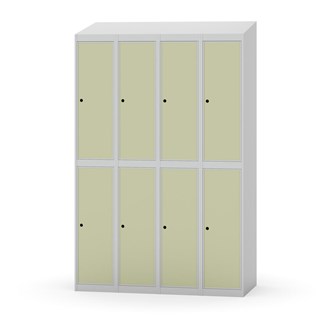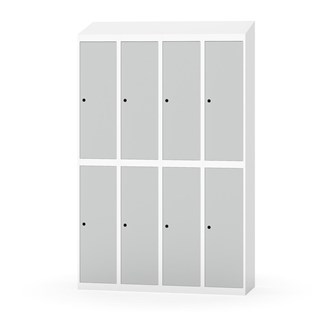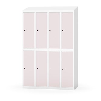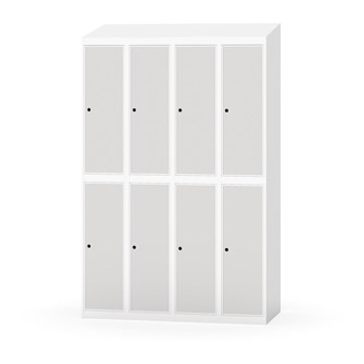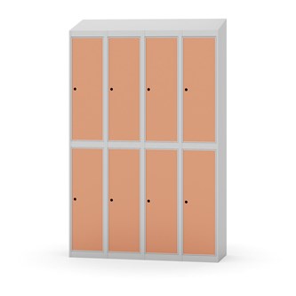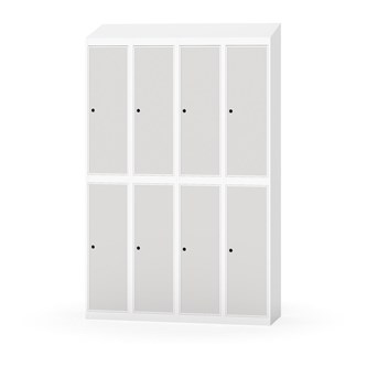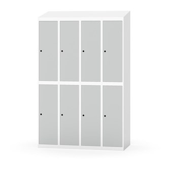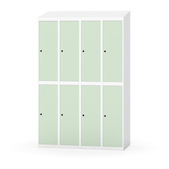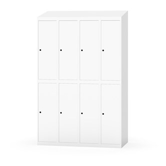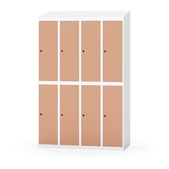 Klädskåp med helsvetsad stomme. Välj mellan plåt eller laminatdörr. Plåtdörren är försedd med dörrstopp i stål och infälld förstärkning kring låshålet. Laminatdörr infälld i stålram försedd med dörrstopp i stål. Dörrar är öppningsbara 90 grader. Inredning: Hyllplan och klädstång med två ankarkrokar. Slät golvyta utan tröskel. Ventilation genom hål i tak-/bottenplåt. Observera att lås och underrede beställs på separata artikelnummer. Lås kommer att vara monterade på skåp vid leverans. Valt underrede monteras på plats.