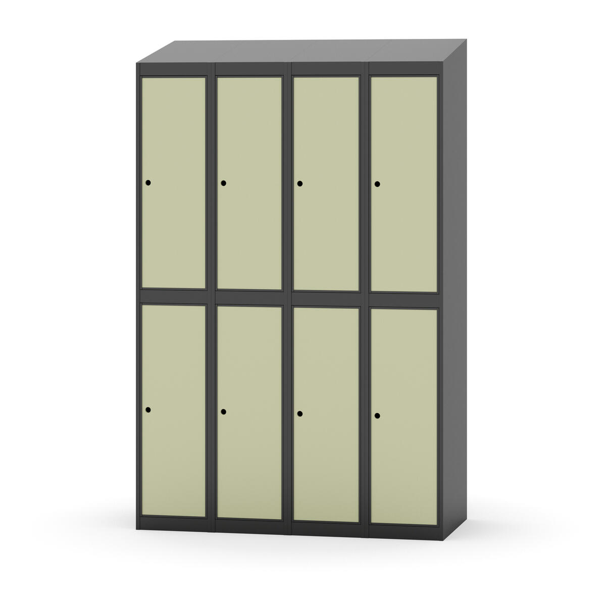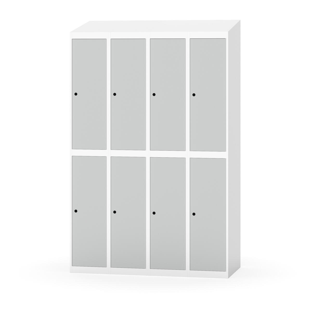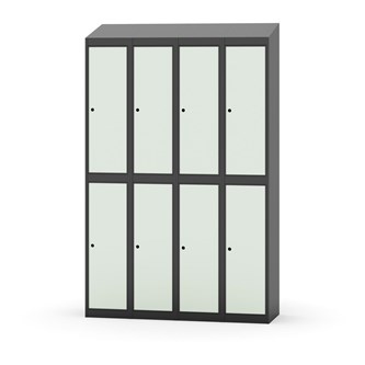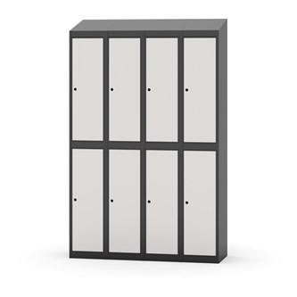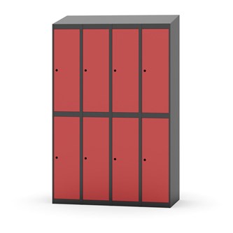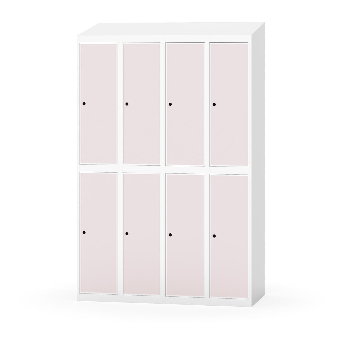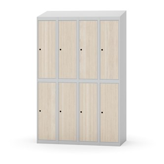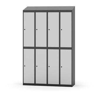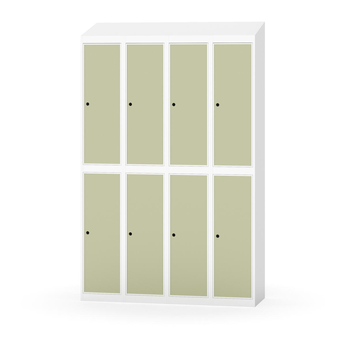 Klädskåp med helsvetsad stomme. Välj mellan plåt eller laminatdörr. Plåtdörren är försedd med dörrstopp i stål och infälld förstärkning kring låshålet. Laminatdörr infälld i stålram försedd med dörrstopp i stål. Dörrar är öppningsbara 90 grader. Inredning: Hyllplan och klädstång med två ankarkrokar. Slät golvyta utan tröskel. Ventilation genom hål i tak-/bottenplåt. Observera att lås och underrede beställs på separata artikelnummer. Lås kommer att vara monterade på skåp vid leverans. Valt underrede monteras på plats.