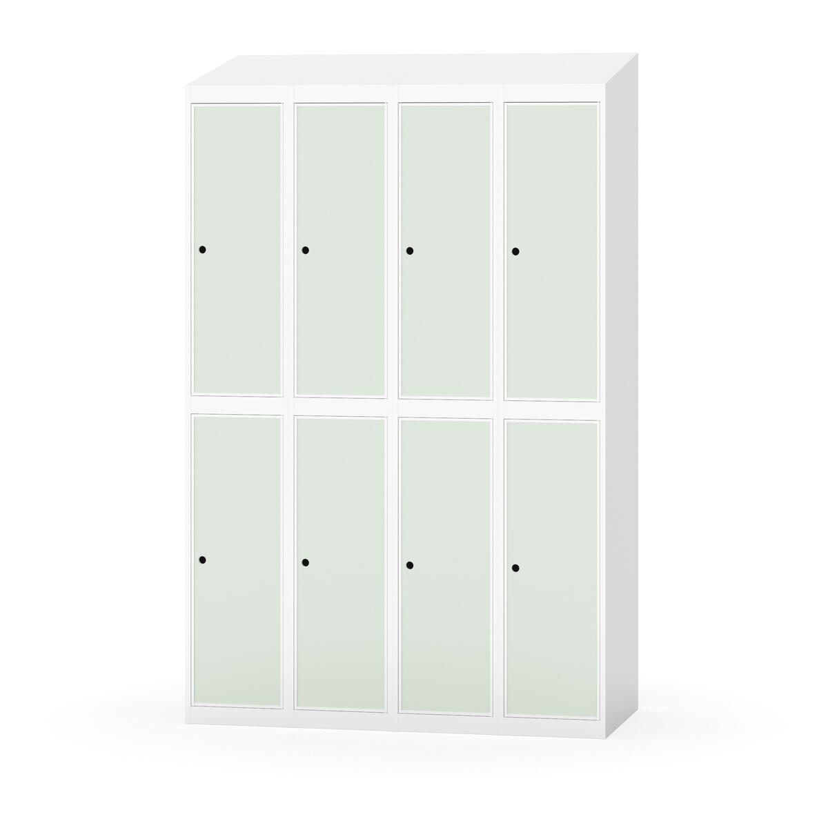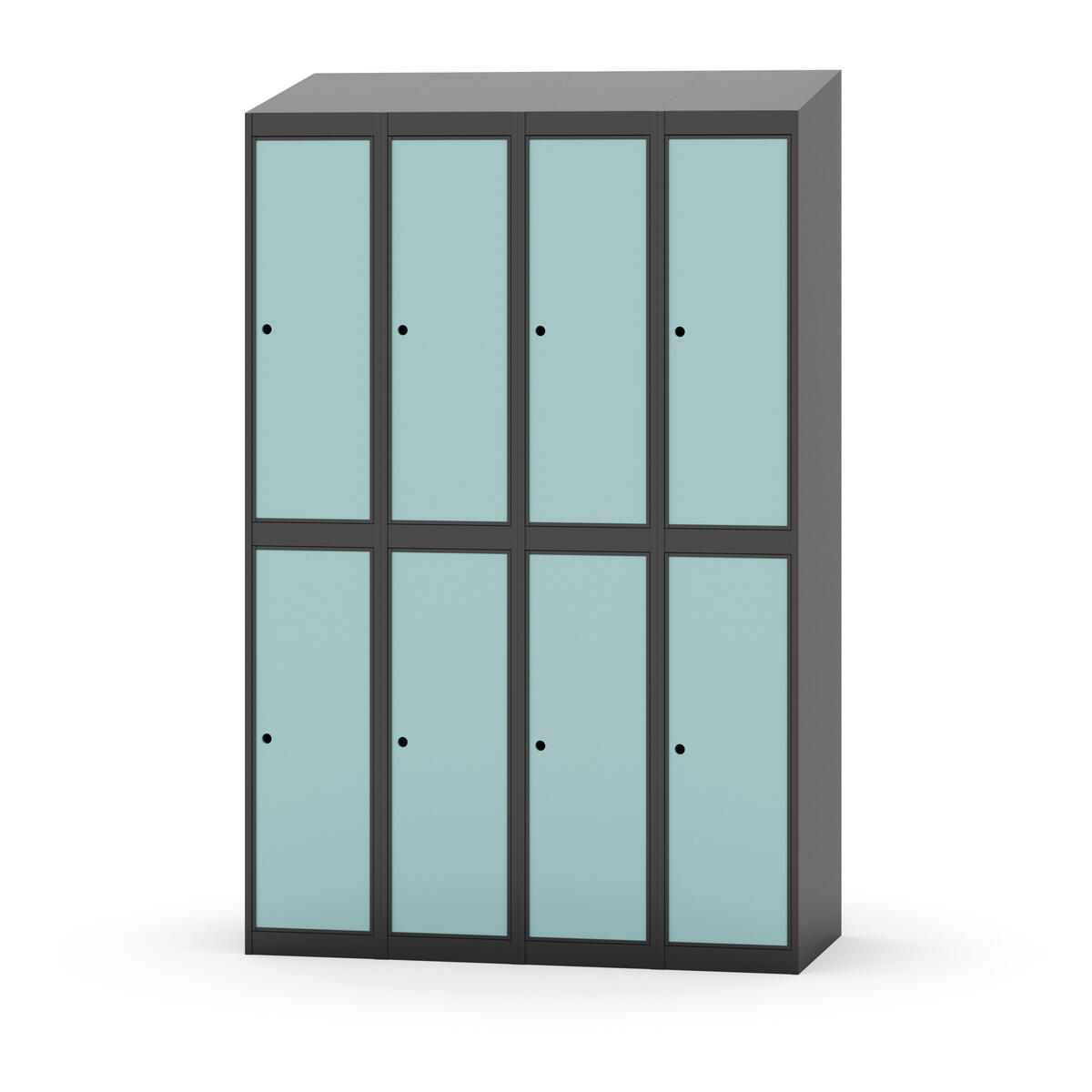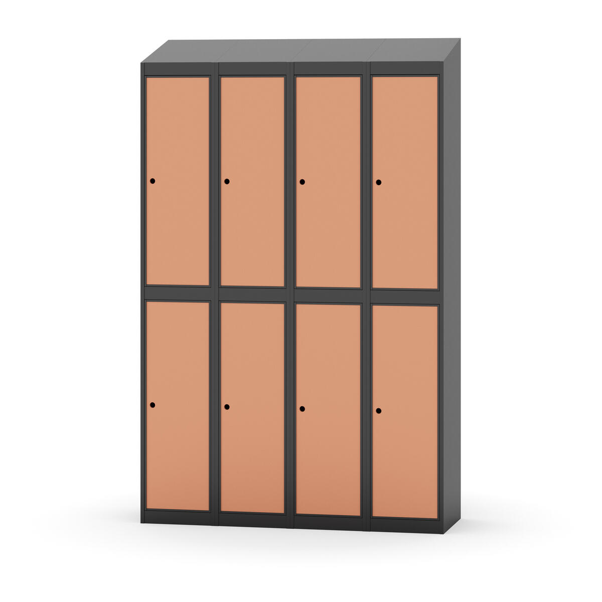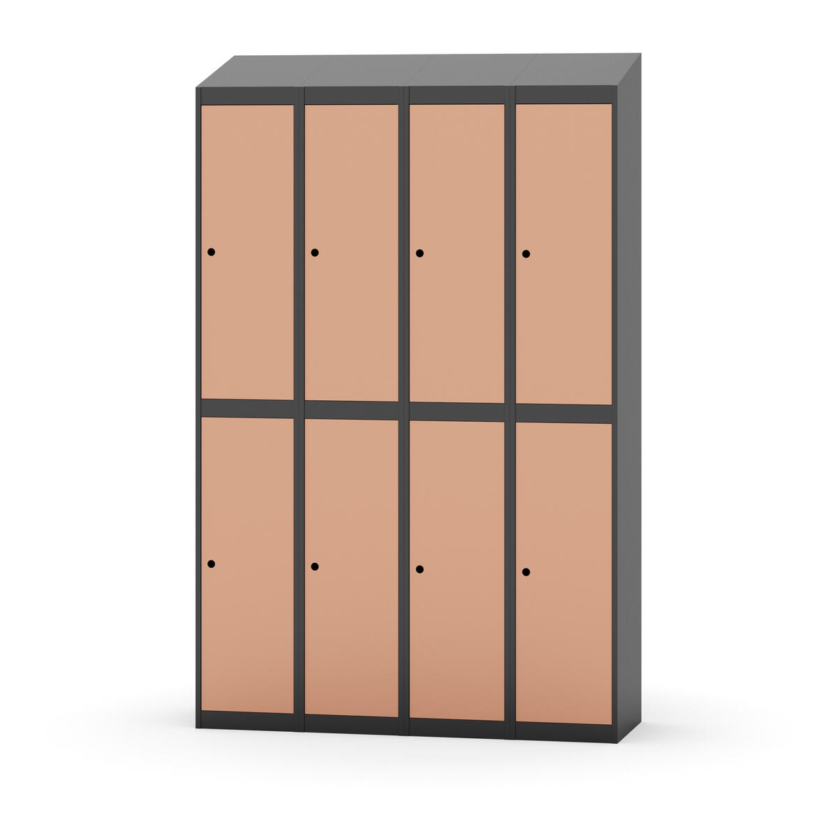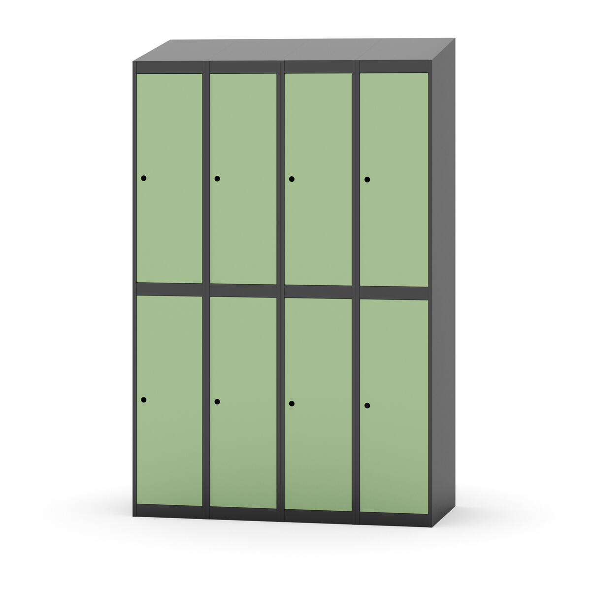 Klädskåp med helsvetsad stomme. Välj mellan plåt eller laminatdörr. Plåtdörren är försedd med dörrstopp i stål och infälld förstärkning kring låshålet. Laminatdörr infälld i stålram försedd med dörrstopp i stål. Dörrar är öppningsbara 90 grader. Inredning: Hyllplan och klädstång med två ankarkrokar. Slät golvyta utan tröskel. Ventilation genom hål i tak-/bottenplåt. Observera att lås och underrede beställs på separata artikelnummer. Lås kommer att vara monterade på skåp vid leverans. Valt underrede monteras på plats.