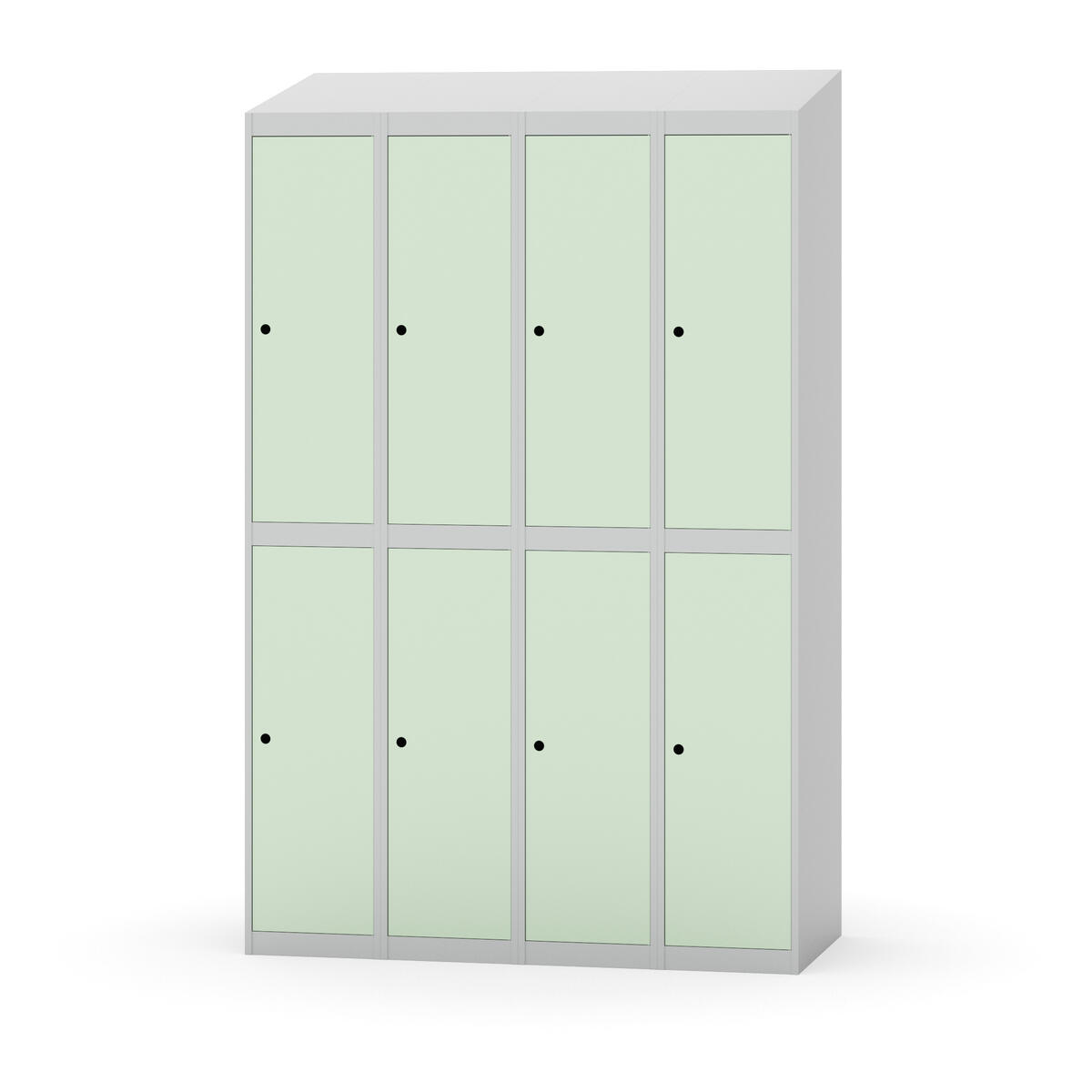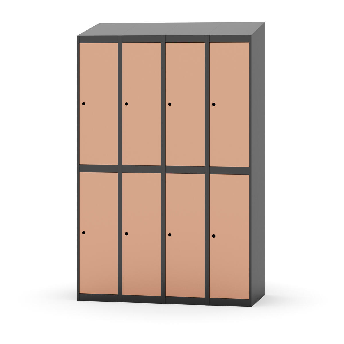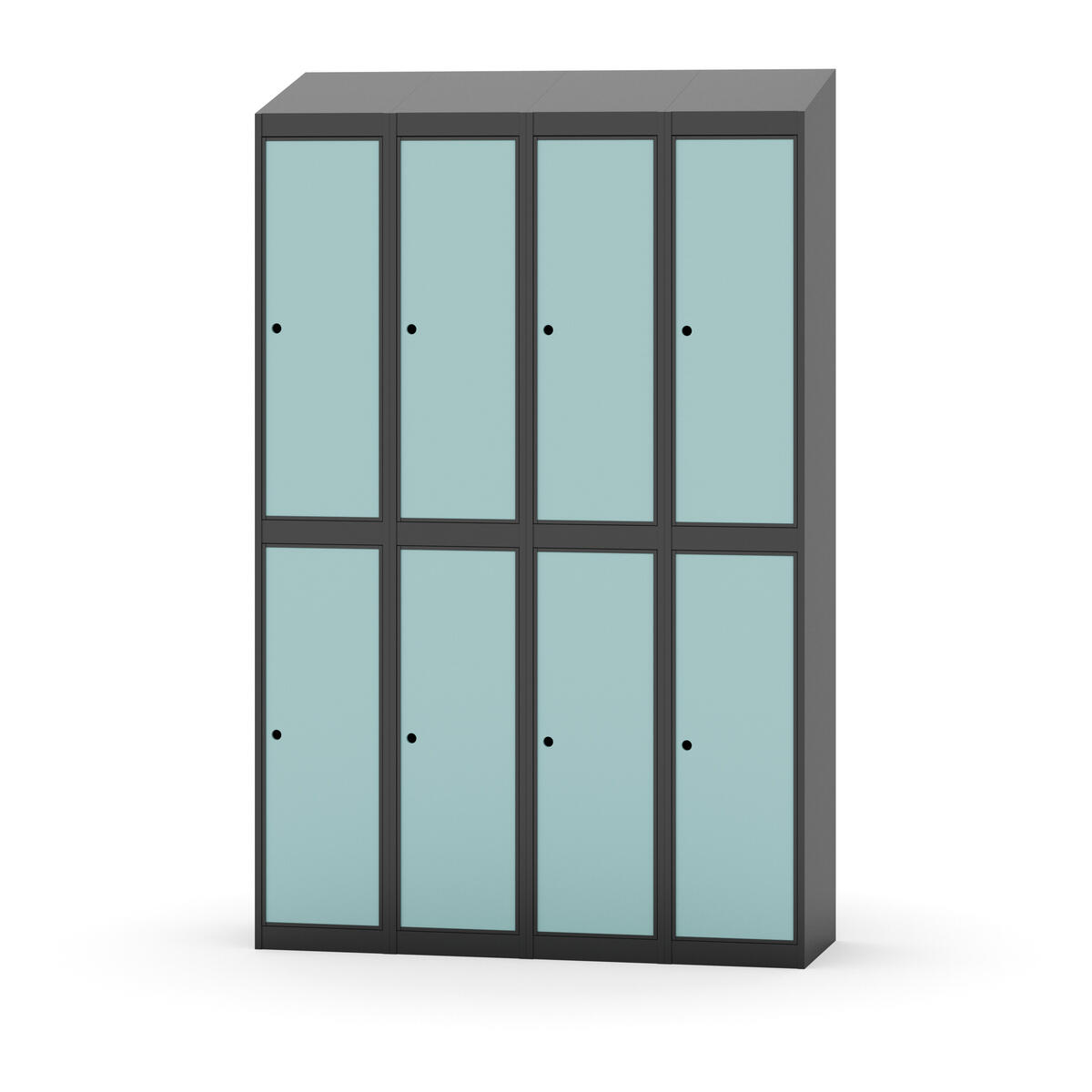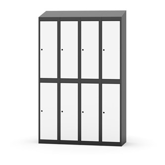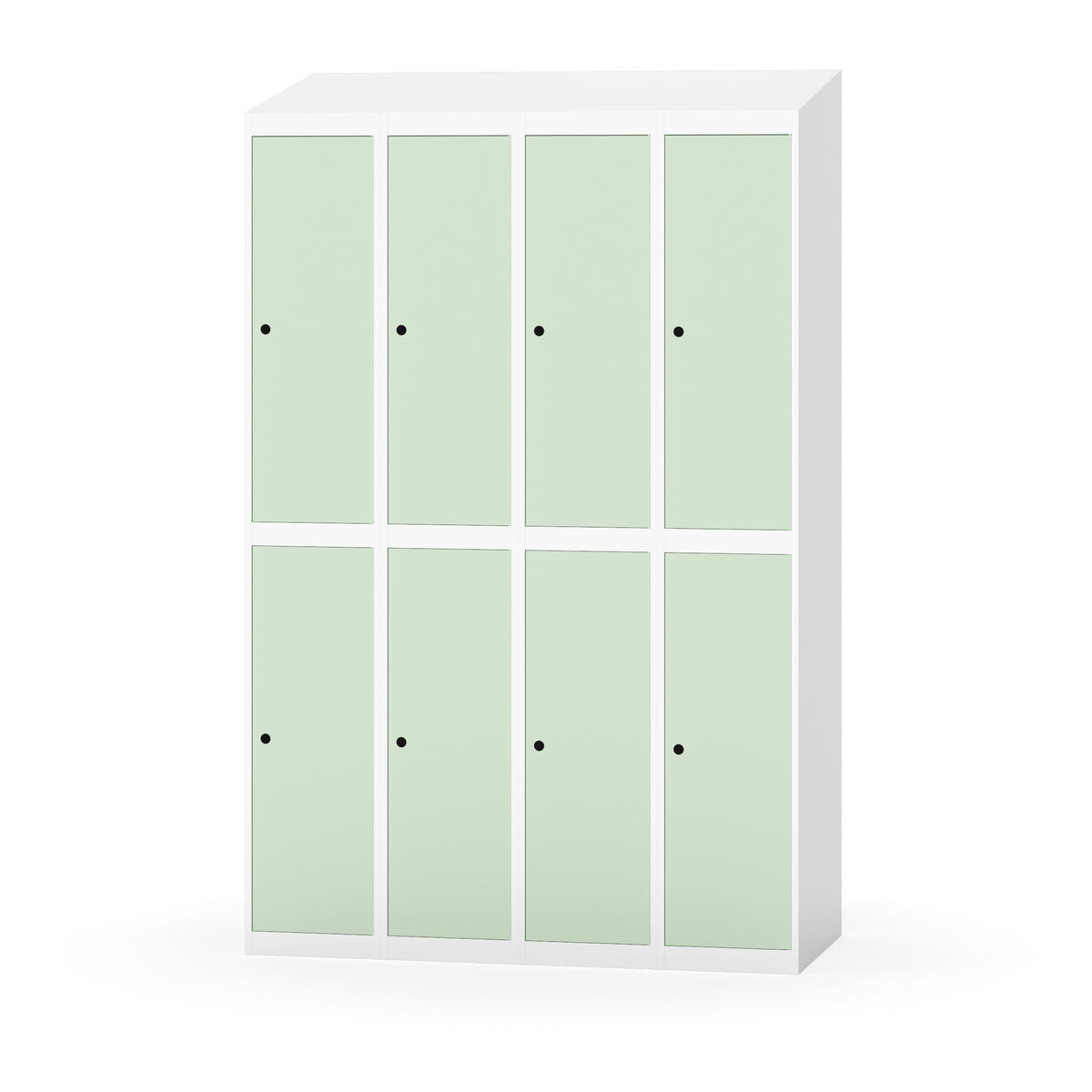 Klädskåp med helsvetsad stomme. Välj mellan plåt eller laminatdörr. Plåtdörren är försedd med dörrstopp i stål och infälld förstärkning kring låshålet. Laminatdörr infälld i stålram försedd med dörrstopp i stål. Dörrar är öppningsbara 90 grader. Inredning: Hyllplan och klädstång med två ankarkrokar. Slät golvyta utan tröskel. Ventilation genom hål i tak-/bottenplåt. Observera att lås och underrede beställs på separata artikelnummer. Lås kommer att vara monterade på skåp vid leverans. Valt underrede monteras på plats.