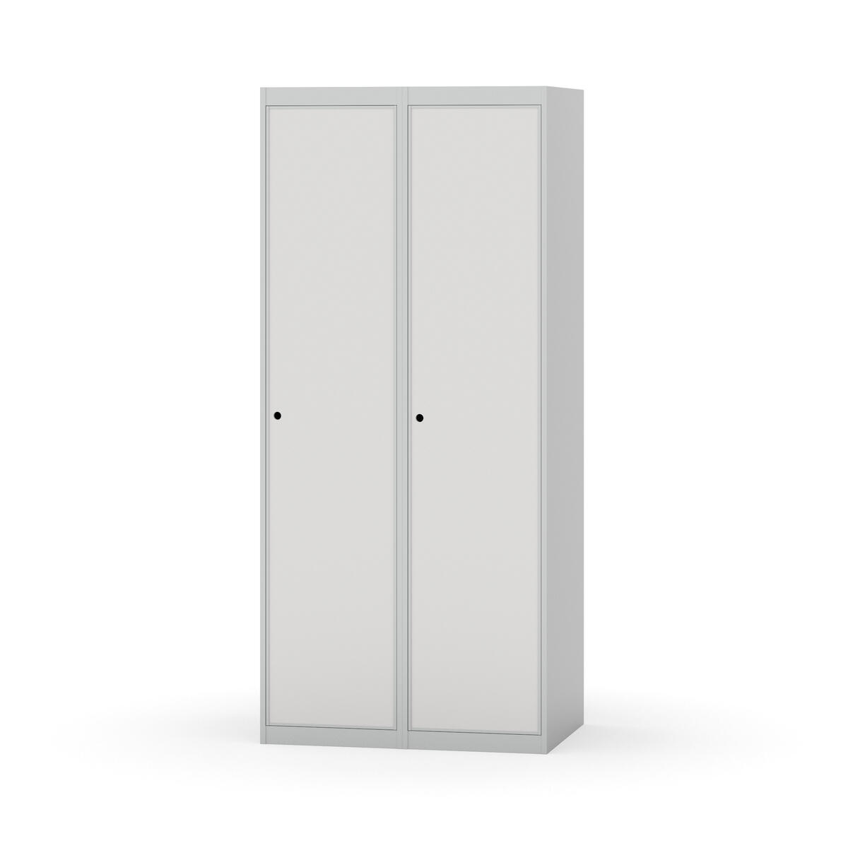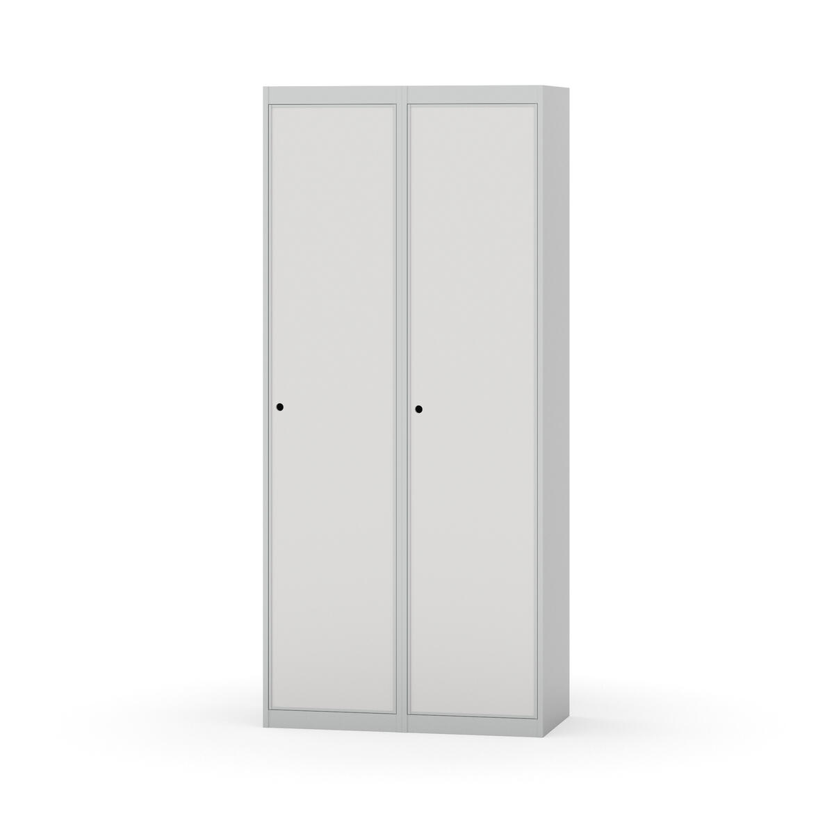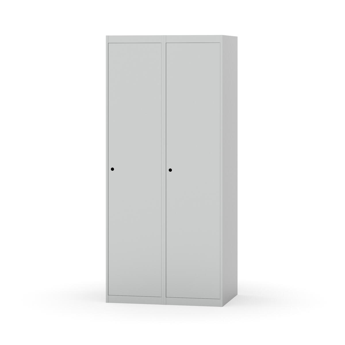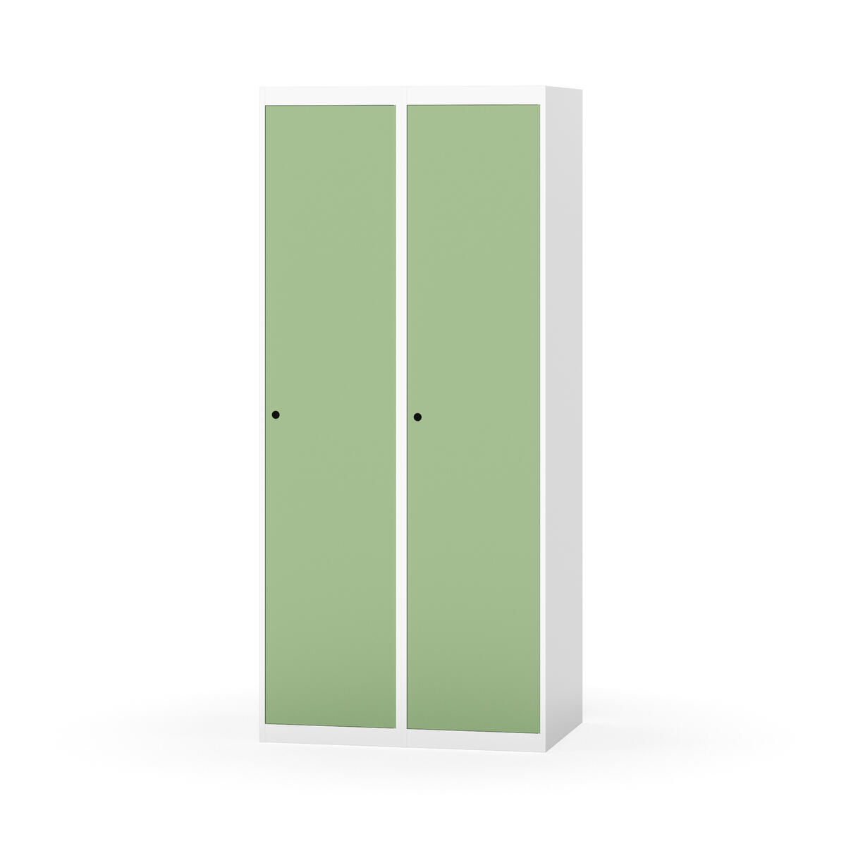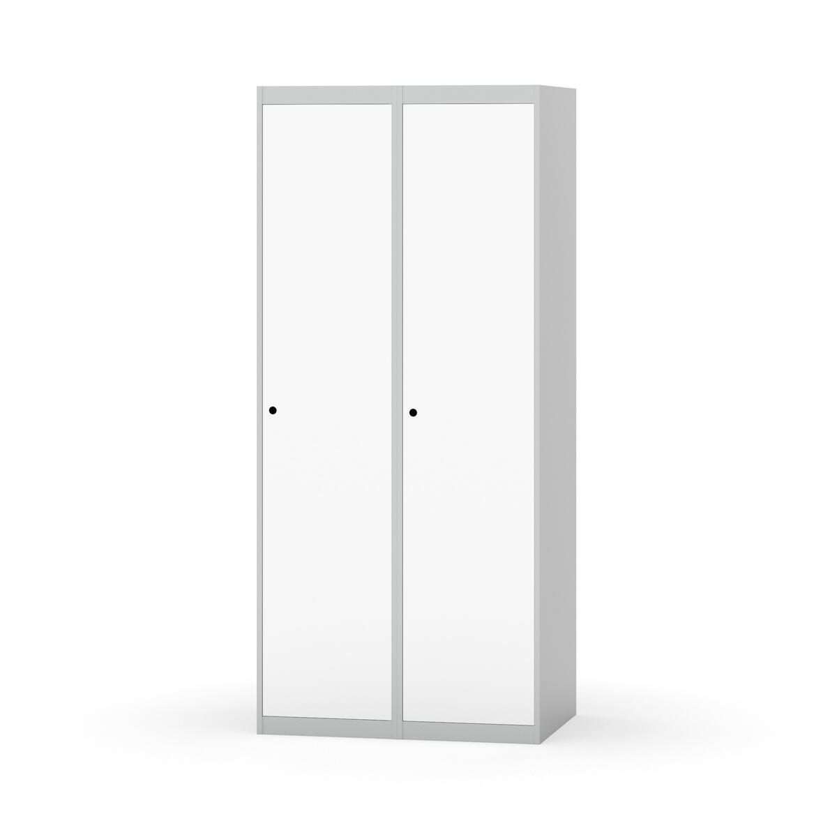 Klädskåp med helsvetsad stomme. Välj mellan plåt eller laminatdörr. Plåtdörren är försedd med dörrstopp i stål och infälld förstärkning kring låshålet. Laminatdörr infälld i stålram försedd med dörrstopp i stål. Dörrar är öppningsbara 90 grader. Inredning: Hyllplan och klädstång med två ankarkrokar. Slät golvyta utan tröskel. Ventilation genom hål i tak-/bottenplåt. Observera att lås och underrede beställs på separata artikelnummer. Lås kommer att vara monterade på skåp vid leverans. Valt underrede monteras på plats.