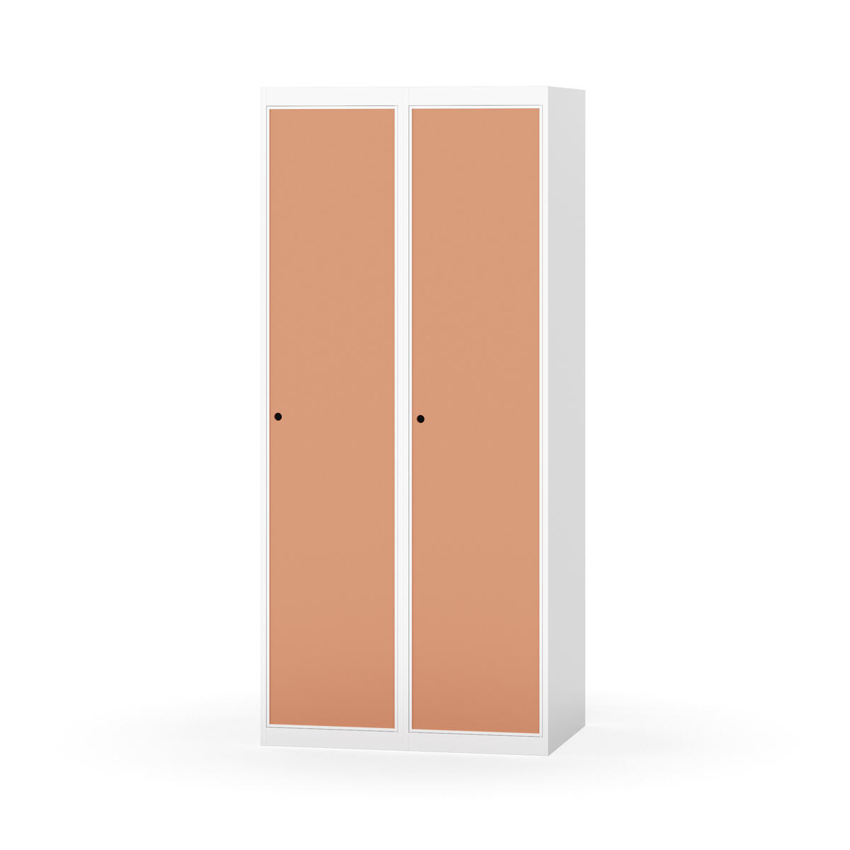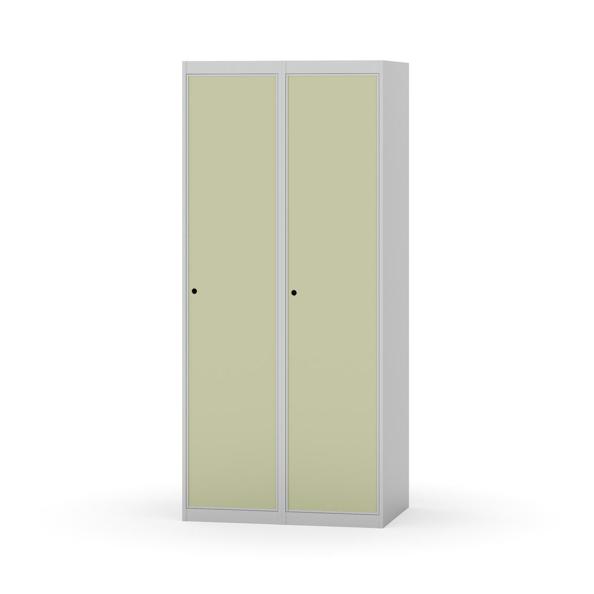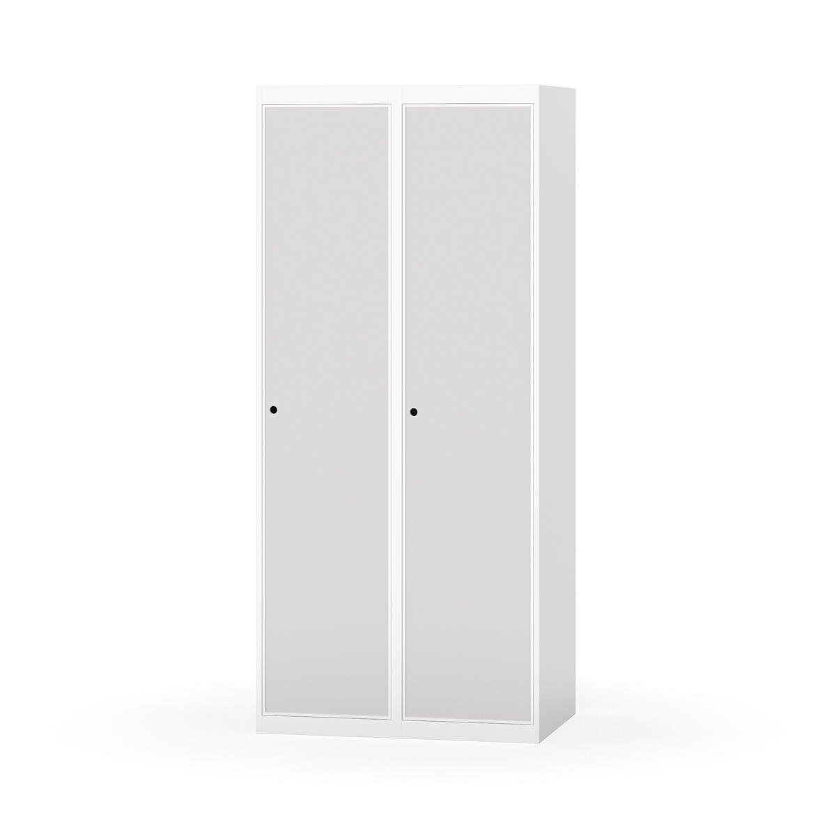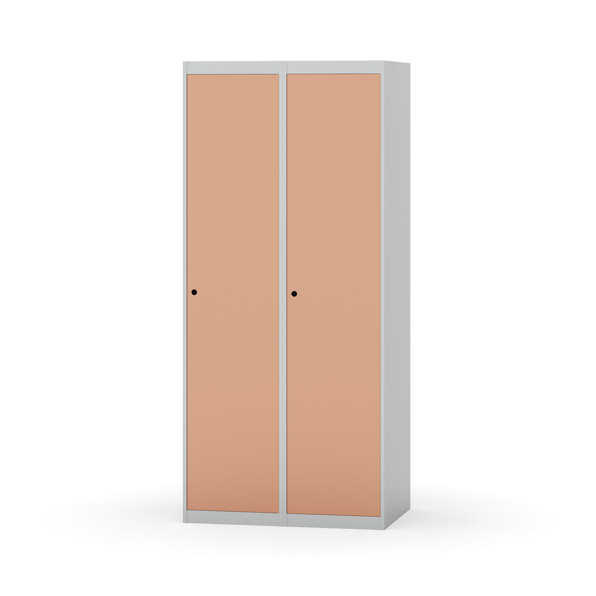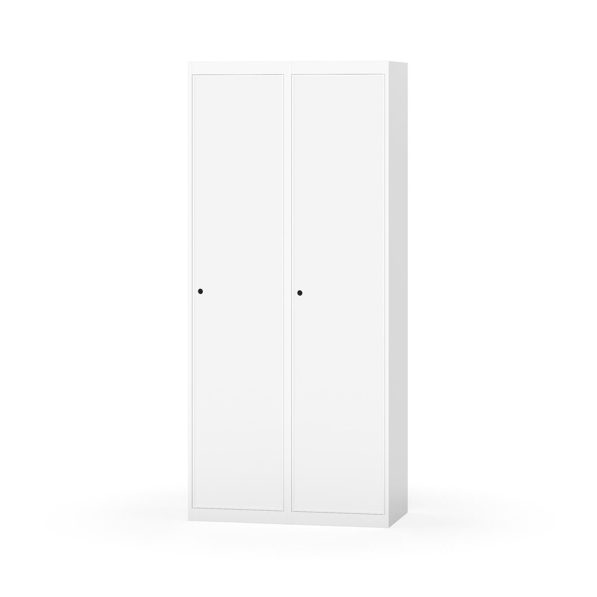Klädskåp med helsvetsad stomme. Välj mellan plåt eller laminatdörr. Plåtdörren är försedd med dörrstopp i stål och infälld förstärkning kring låshålet. Laminatdörr infälld i stålram försedd med dörrstopp i stål. Dörrar är öppningsbara 90 grader. Inredning: Hyllplan och klädstång med två ankarkrokar. Slät golvyta utan tröskel. Ventilation genom hål i tak-/bottenplåt. Observera att lås och underrede beställs på separata artikelnummer. Lås kommer att vara monterade på skåp vid leverans. Valt underrede monteras på plats.