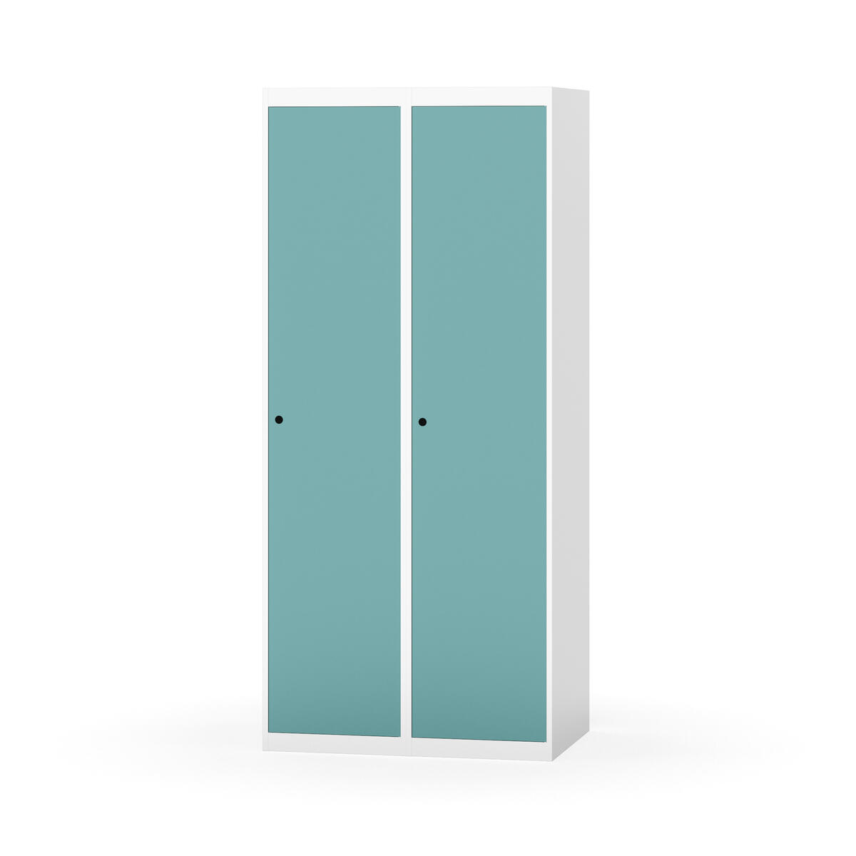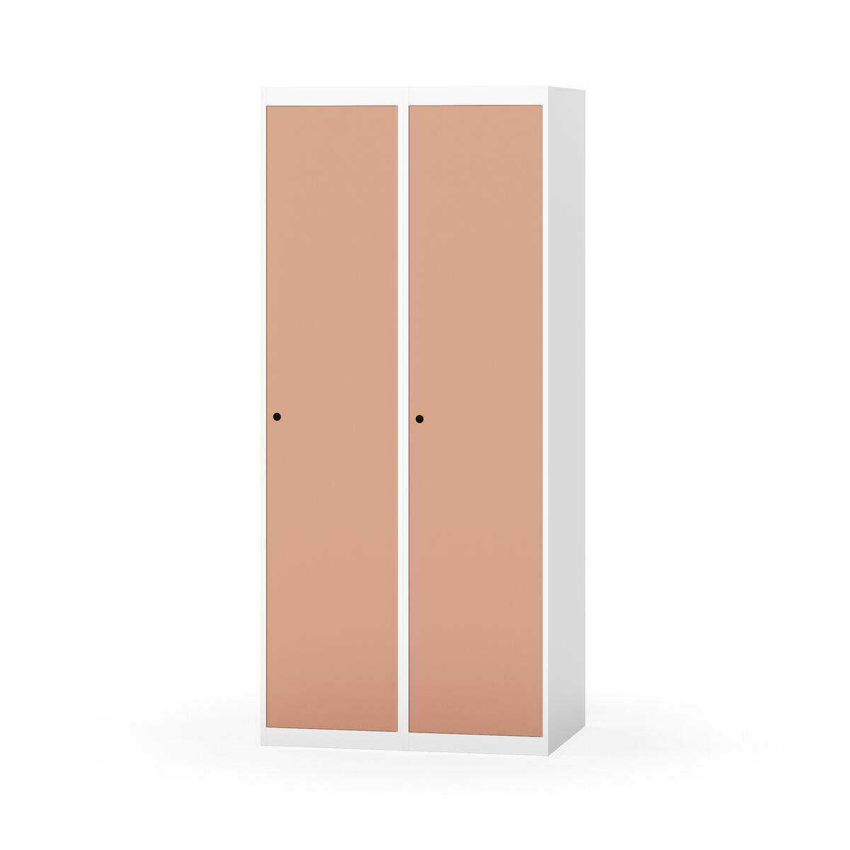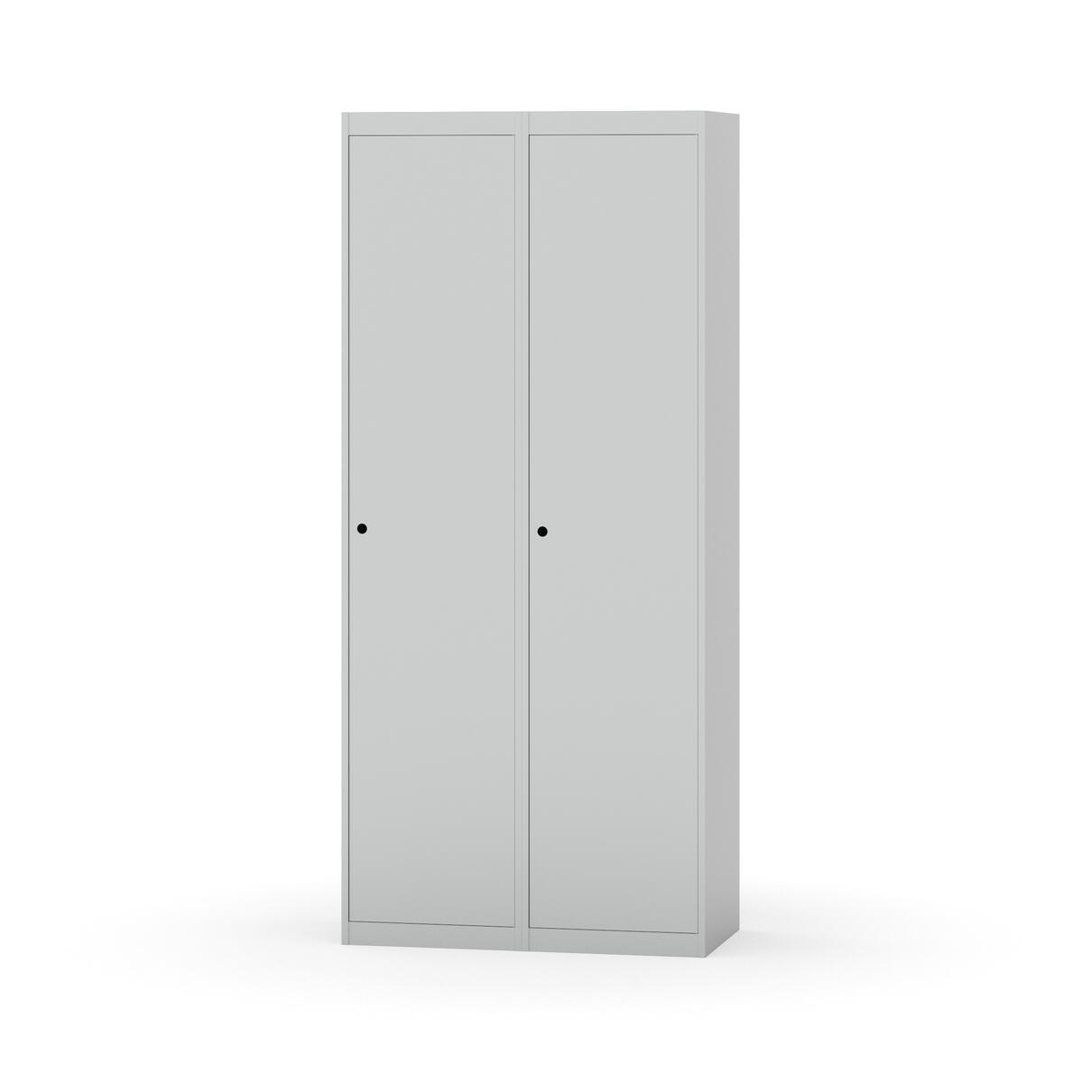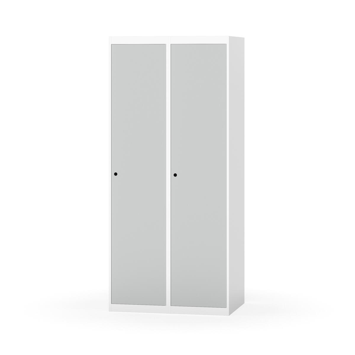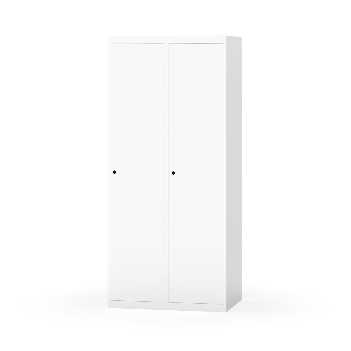 Klädskåp med helsvetsad stomme. Välj mellan plåt eller laminatdörr. Plåtdörren är försedd med dörrstopp i stål och infälld förstärkning kring låshålet. Laminatdörr infälld i stålram försedd med dörrstopp i stål. Dörrar är öppningsbara 90 grader. Inredning: Hyllplan och klädstång med två ankarkrokar. Slät golvyta utan tröskel. Ventilation genom hål i tak-/bottenplåt. Observera att lås och underrede beställs på separata artikelnummer. Lås kommer att vara monterade på skåp vid leverans. Valt underrede monteras på plats.