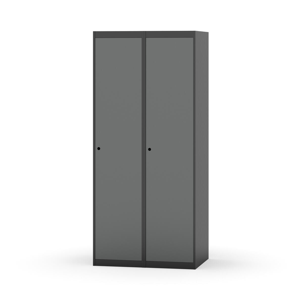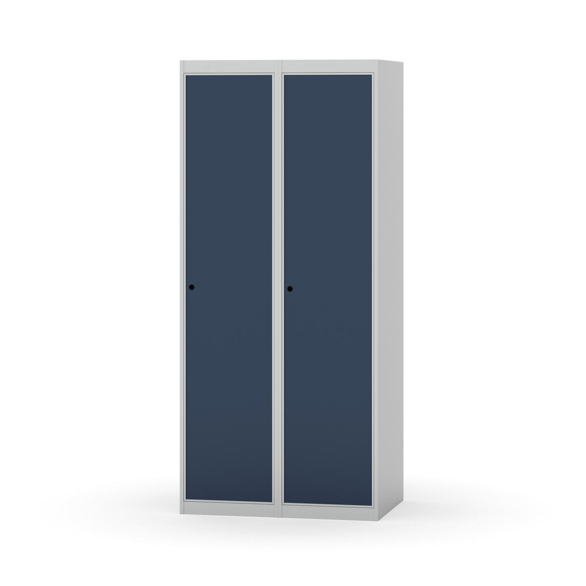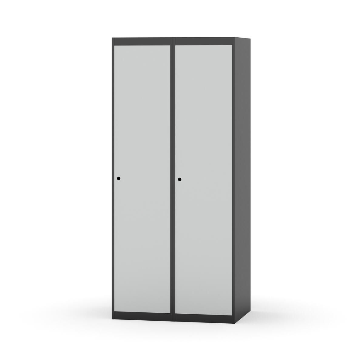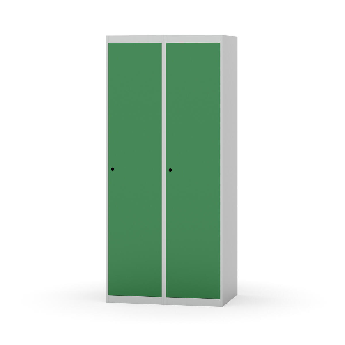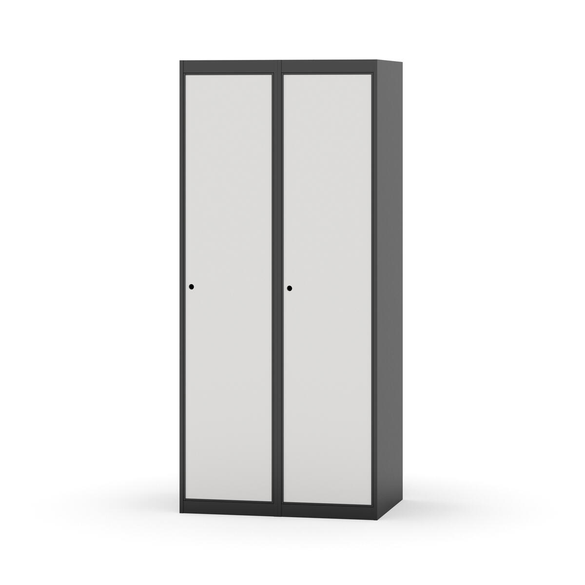 Klädskåp med helsvetsad stomme. Välj mellan plåt eller laminatdörr. Plåtdörren är försedd med dörrstopp i stål och infälld förstärkning kring låshålet. Laminatdörr infälld i stålram försedd med dörrstopp i stål. Dörrar är öppningsbara 90 grader. Inredning: Hyllplan och klädstång med två ankarkrokar. Slät golvyta utan tröskel. Ventilation genom hål i tak-/bottenplåt. Observera att lås och underrede beställs på separata artikelnummer. Lås kommer att vara monterade på skåp vid leverans. Valt underrede monteras på plats.