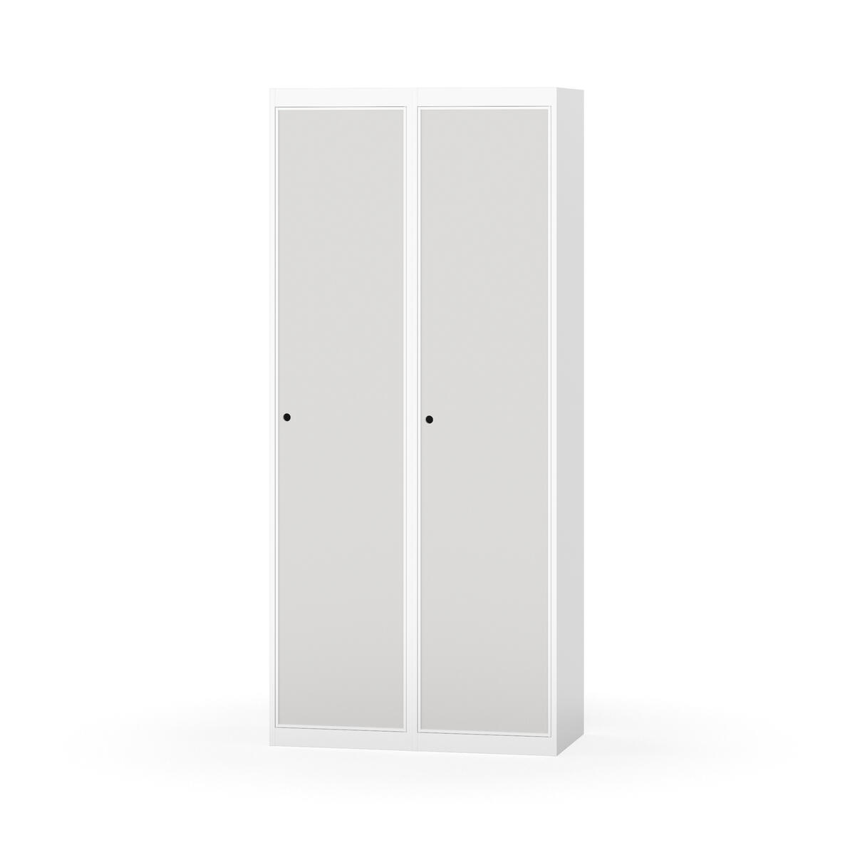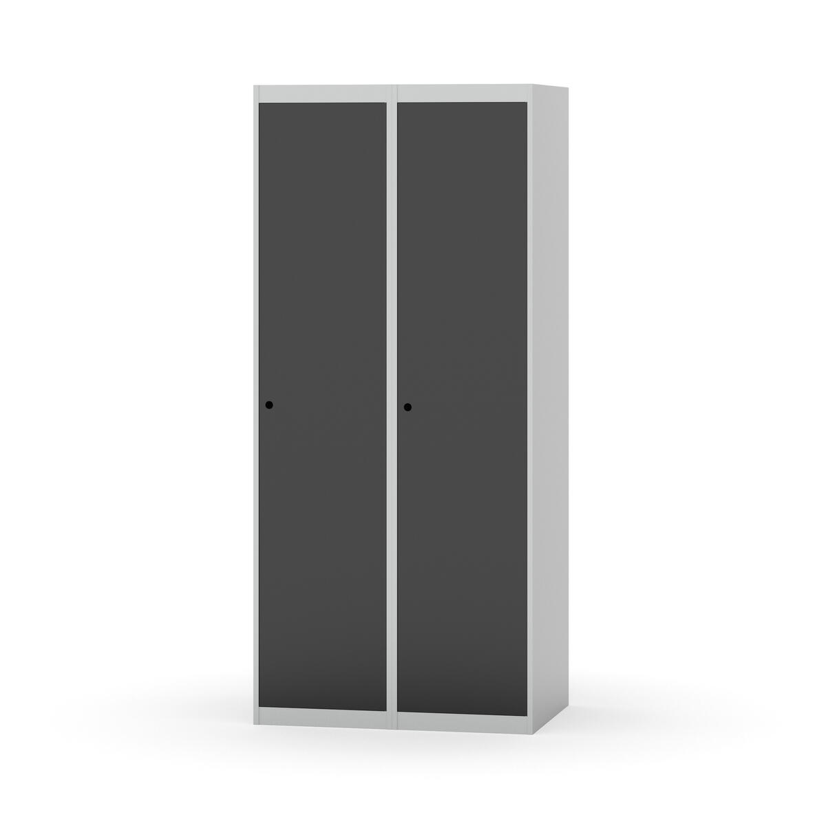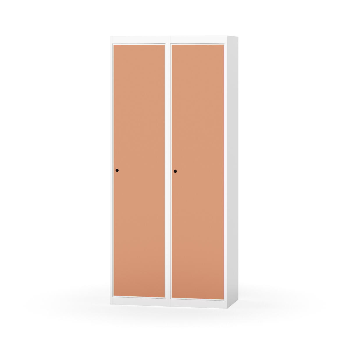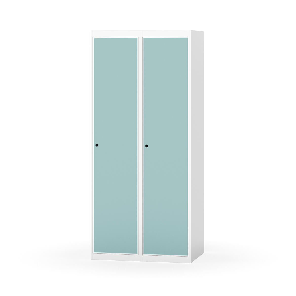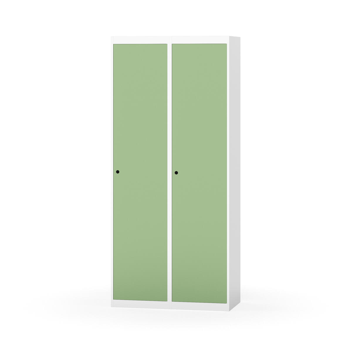 Klädskåp med helsvetsad stomme. Välj mellan plåt eller laminatdörr. Plåtdörren är försedd med dörrstopp i stål och infälld förstärkning kring låshålet. Laminatdörr infälld i stålram försedd med dörrstopp i stål. Dörrar är öppningsbara 90 grader. Inredning: Hyllplan och klädstång med två ankarkrokar. Slät golvyta utan tröskel. Ventilation genom hål i tak-/bottenplåt. Observera att lås och underrede beställs på separata artikelnummer. Lås kommer att vara monterade på skåp vid leverans. Valt underrede monteras på plats.
