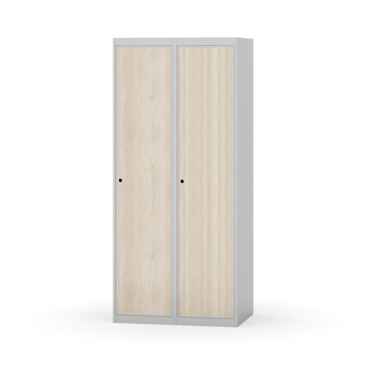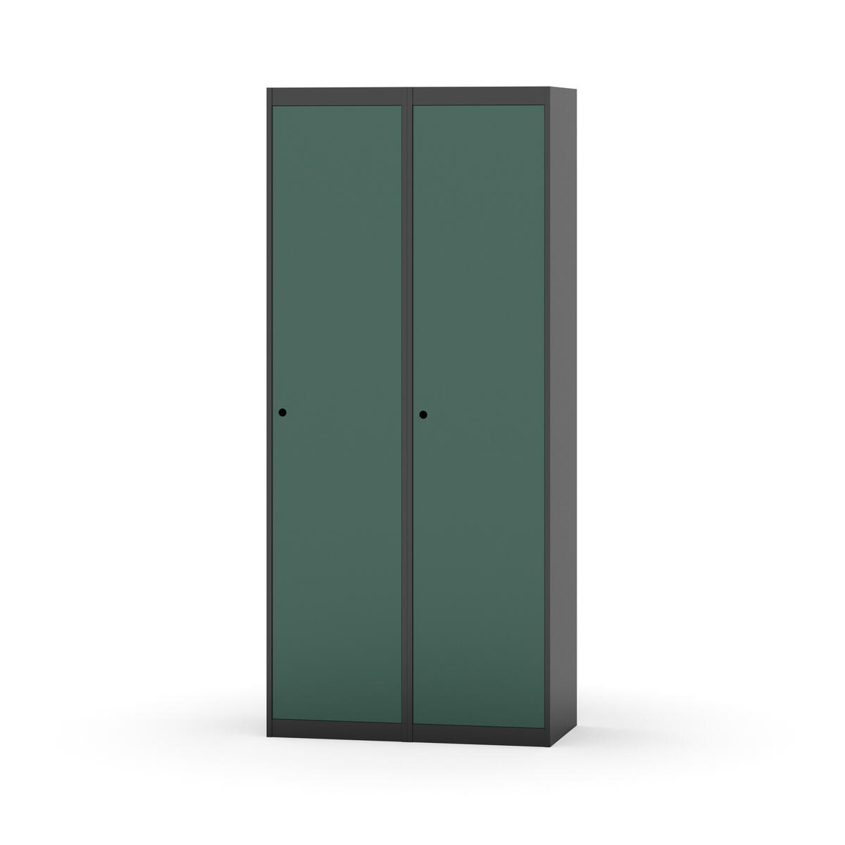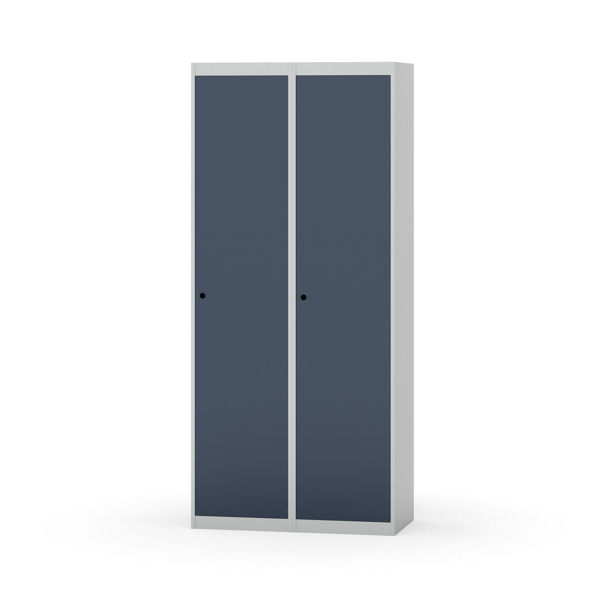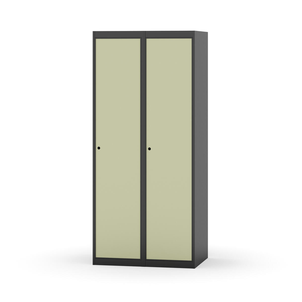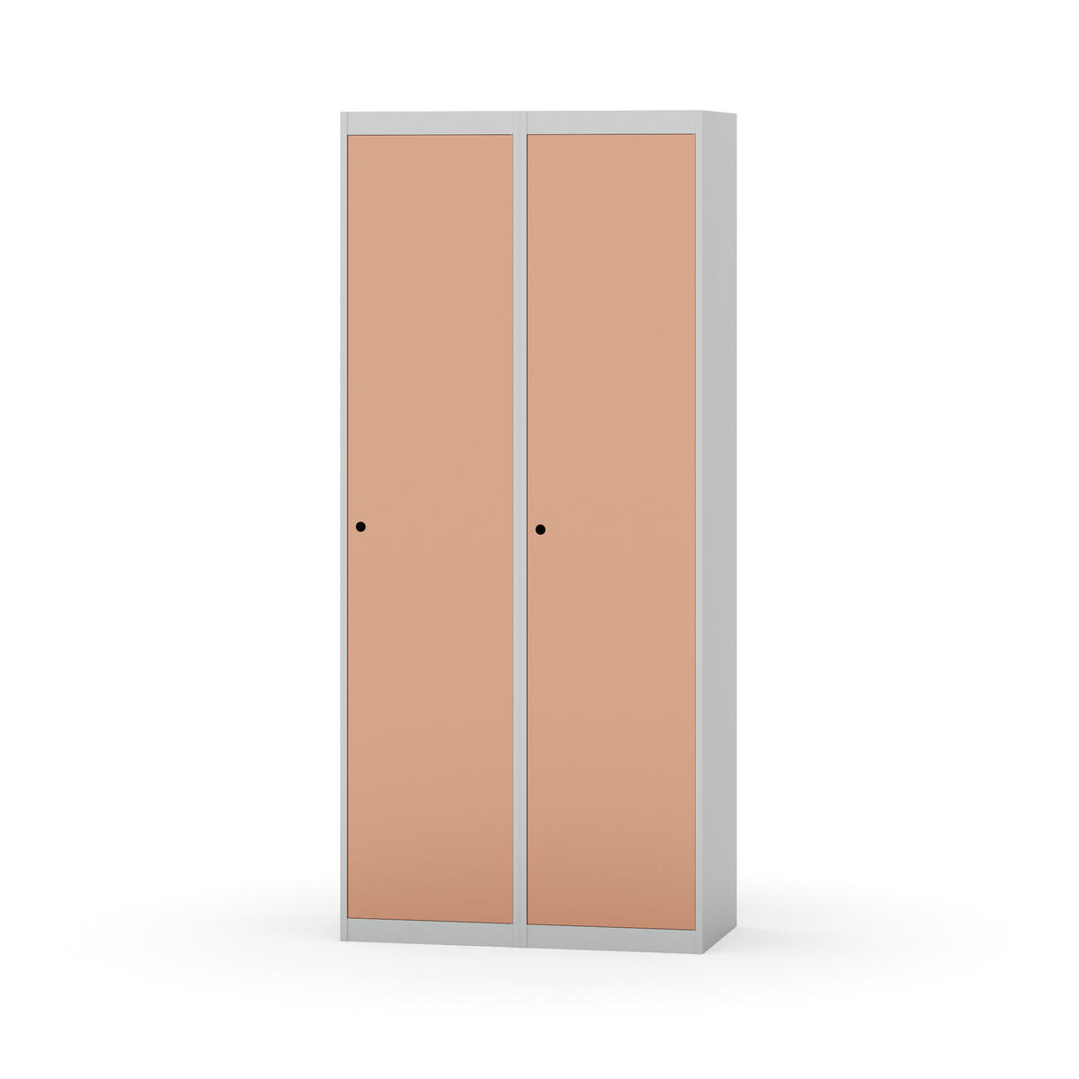 Klädskåp med helsvetsad stomme. Välj mellan plåt eller laminatdörr. Plåtdörren är försedd med dörrstopp i stål och infälld förstärkning kring låshålet. Laminatdörr infälld i stålram försedd med dörrstopp i stål. Dörrar är öppningsbara 90 grader. Inredning: Hyllplan och klädstång med två ankarkrokar. Slät golvyta utan tröskel. Ventilation genom hål i tak-/bottenplåt. Observera att lås och underrede beställs på separata artikelnummer. Lås kommer att vara monterade på skåp vid leverans. Valt underrede monteras på plats.