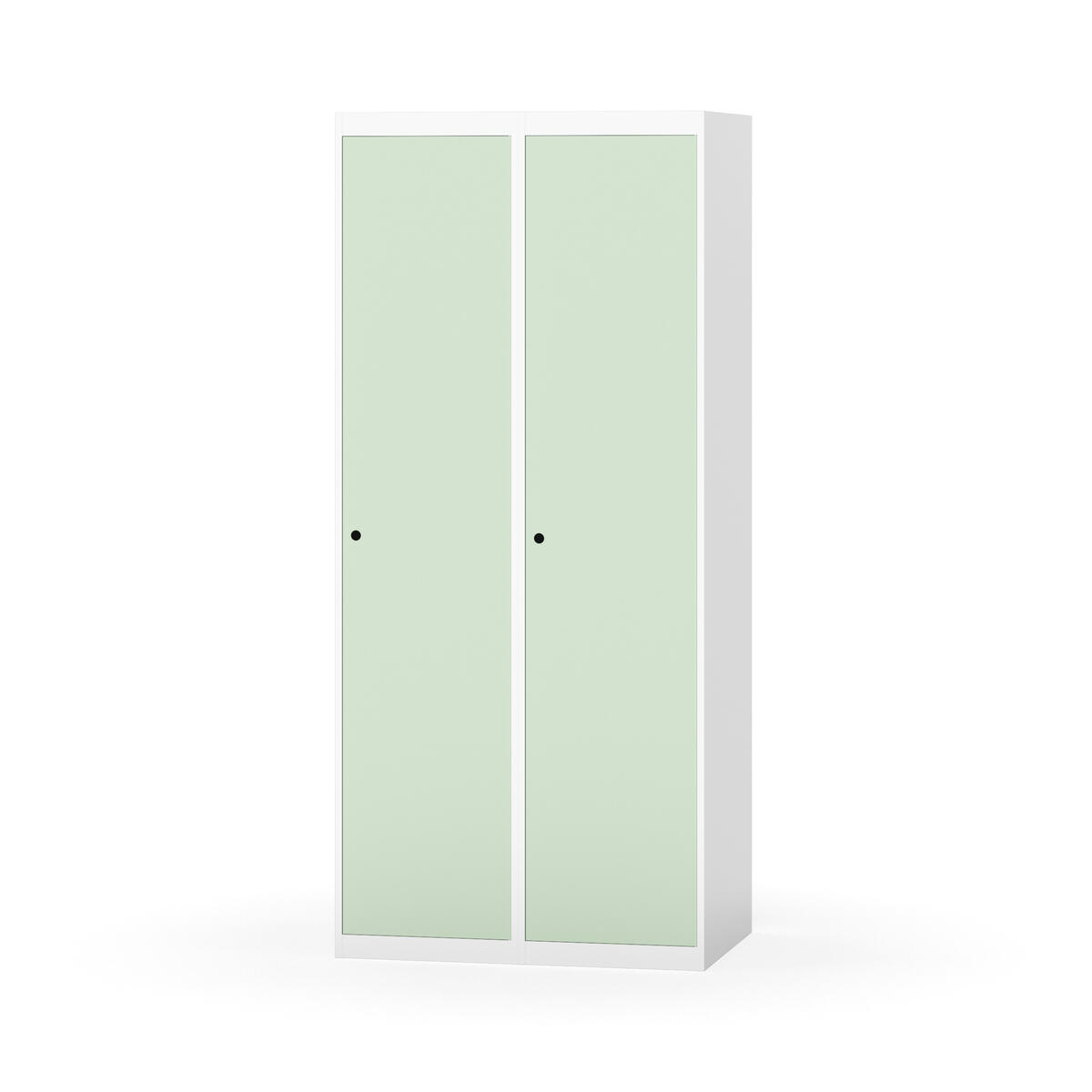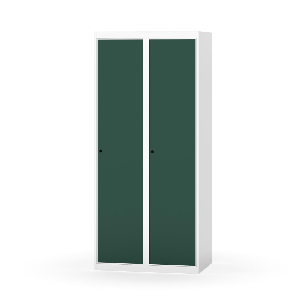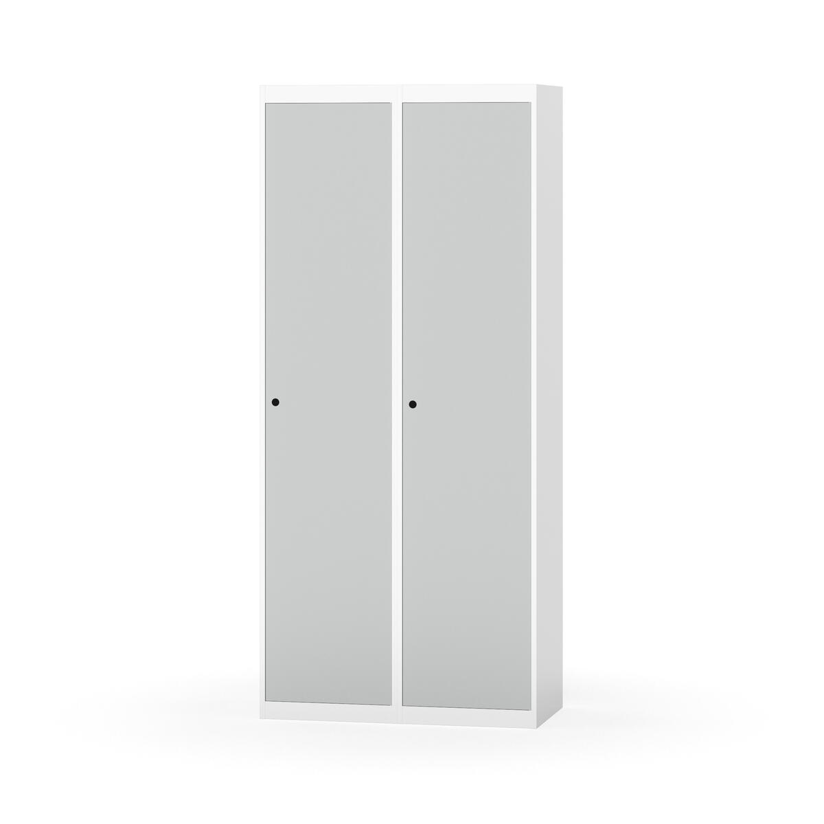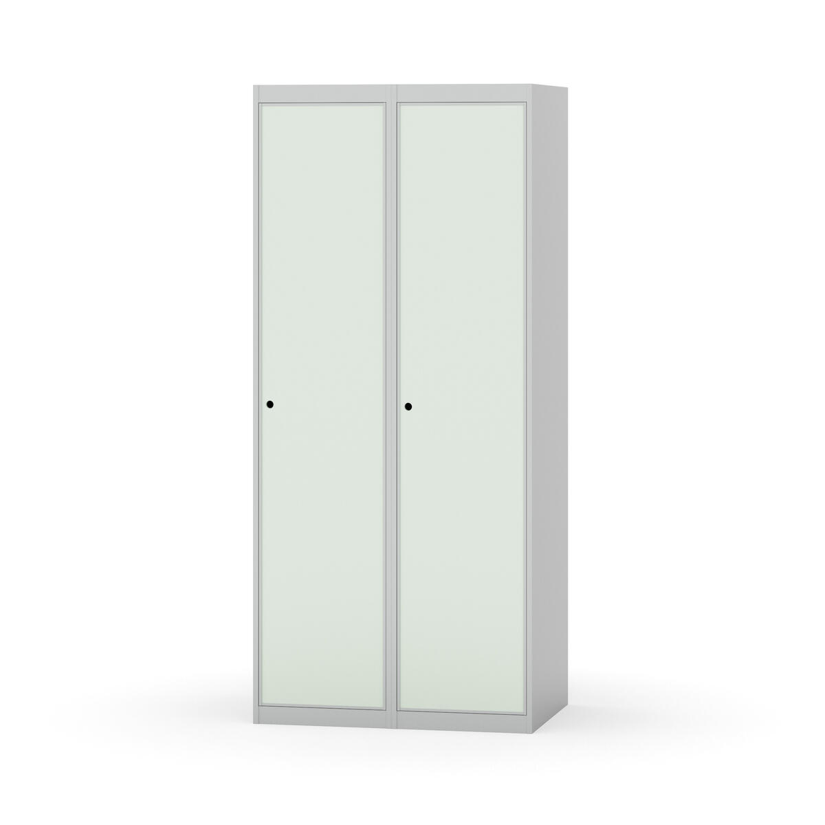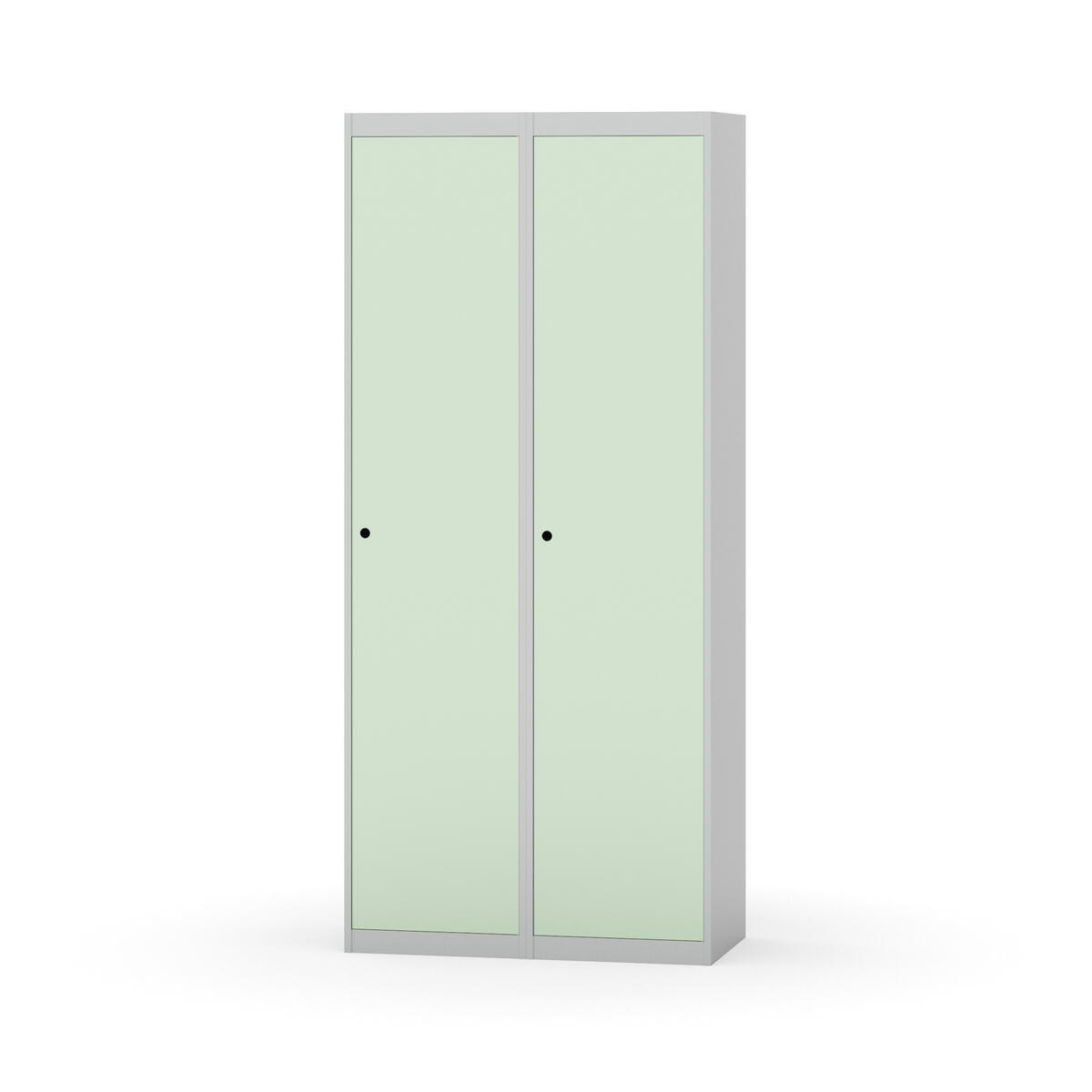 Klädskåp med helsvetsad stomme. Välj mellan plåt eller laminatdörr. Plåtdörren är försedd med dörrstopp i stål och infälld förstärkning kring låshålet. Laminatdörr infälld i stålram försedd med dörrstopp i stål. Dörrar är öppningsbara 90 grader. Inredning: Hyllplan och klädstång med två ankarkrokar. Slät golvyta utan tröskel. Ventilation genom hål i tak-/bottenplåt. Observera att lås och underrede beställs på separata artikelnummer. Lås kommer att vara monterade på skåp vid leverans. Valt underrede monteras på plats.