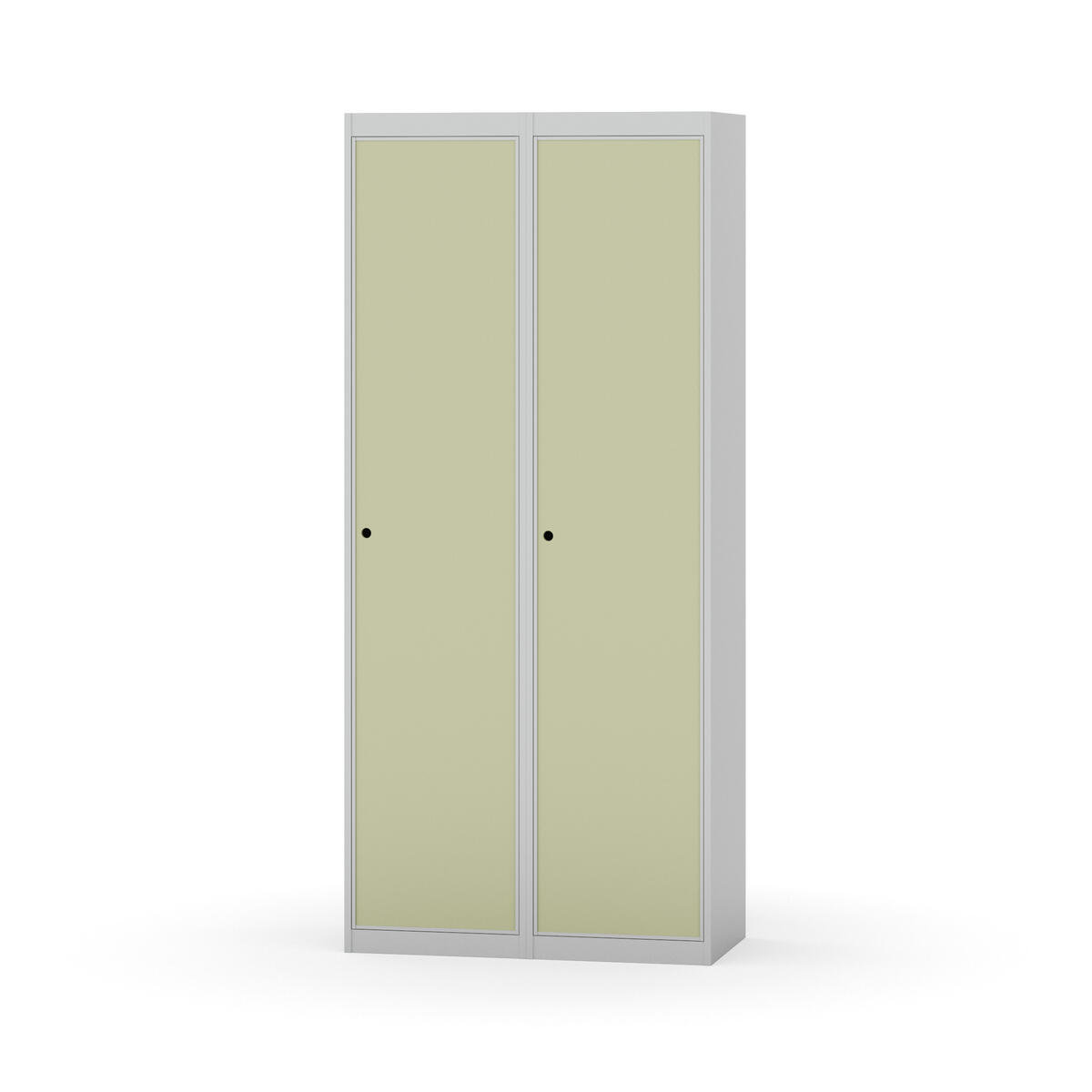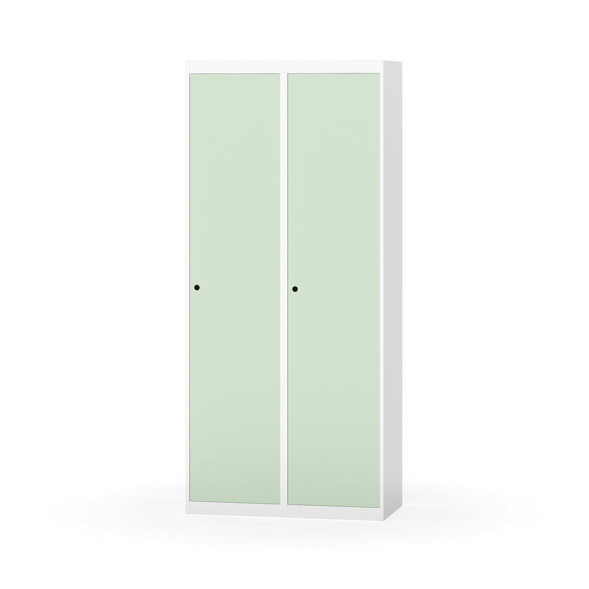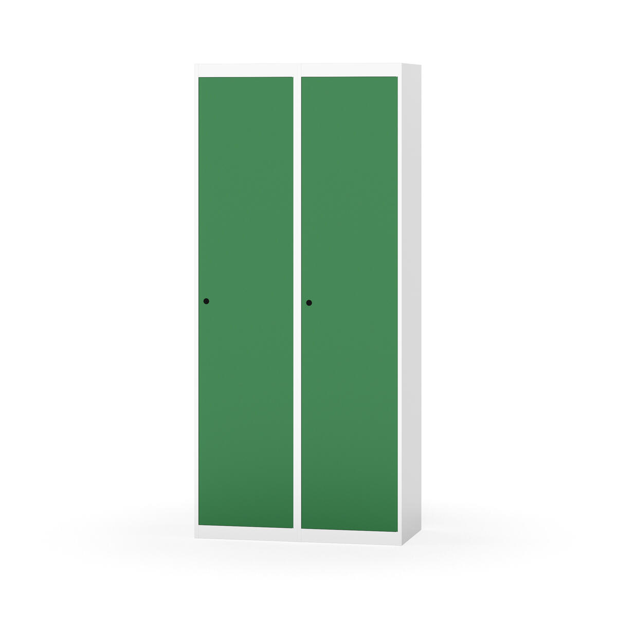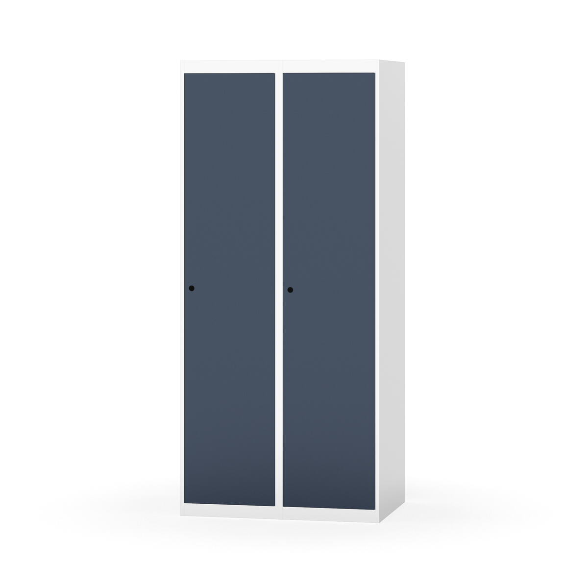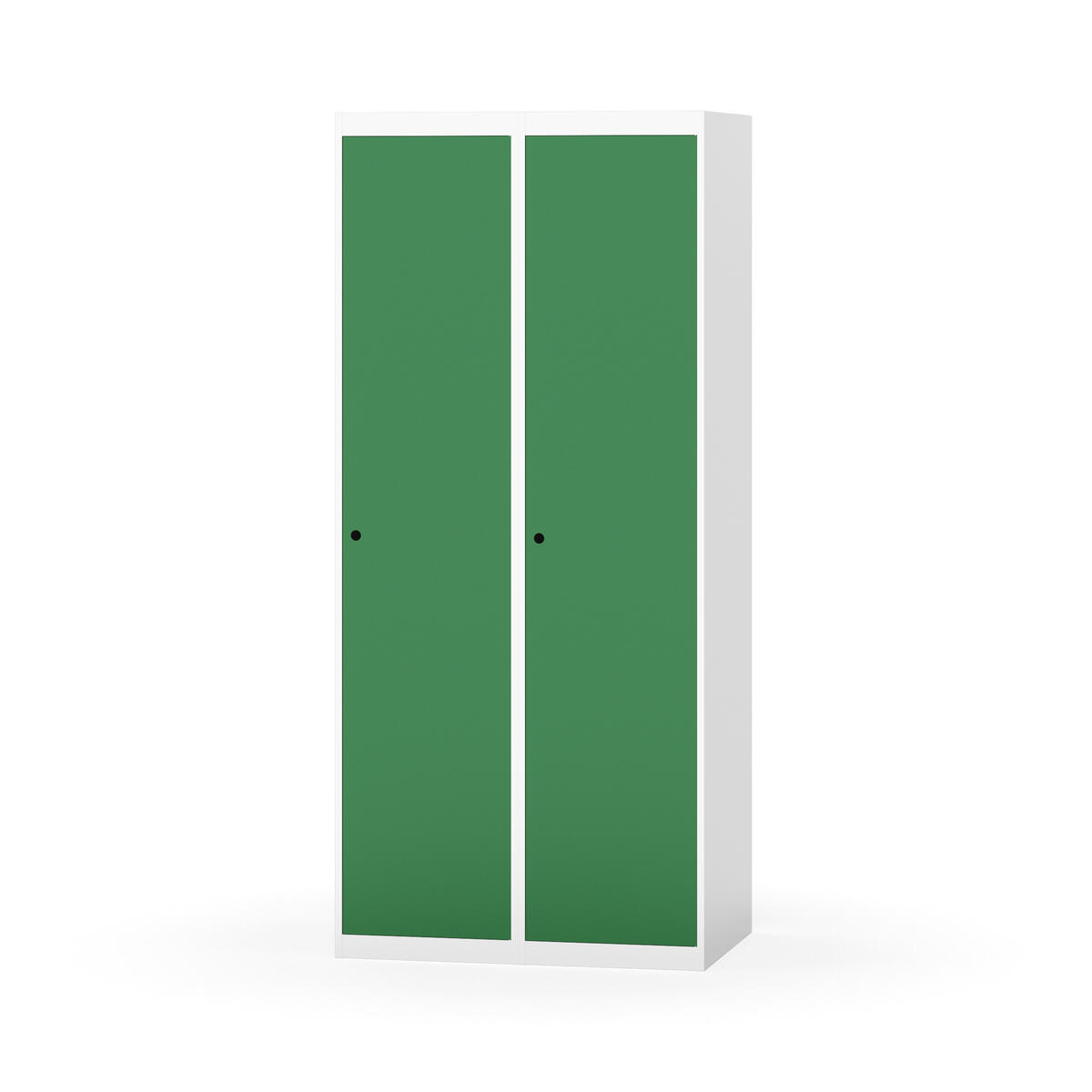 Klädskåp med helsvetsad stomme. Välj mellan plåt eller laminatdörr. Plåtdörren är försedd med dörrstopp i stål och infälld förstärkning kring låshålet. Laminatdörr infälld i stålram försedd med dörrstopp i stål. Dörrar är öppningsbara 90 grader. Inredning: Hyllplan och klädstång med två ankarkrokar. Slät golvyta utan tröskel. Ventilation genom hål i tak-/bottenplåt. Observera att lås och underrede beställs på separata artikelnummer. Lås kommer att vara monterade på skåp vid leverans. Valt underrede monteras på plats.