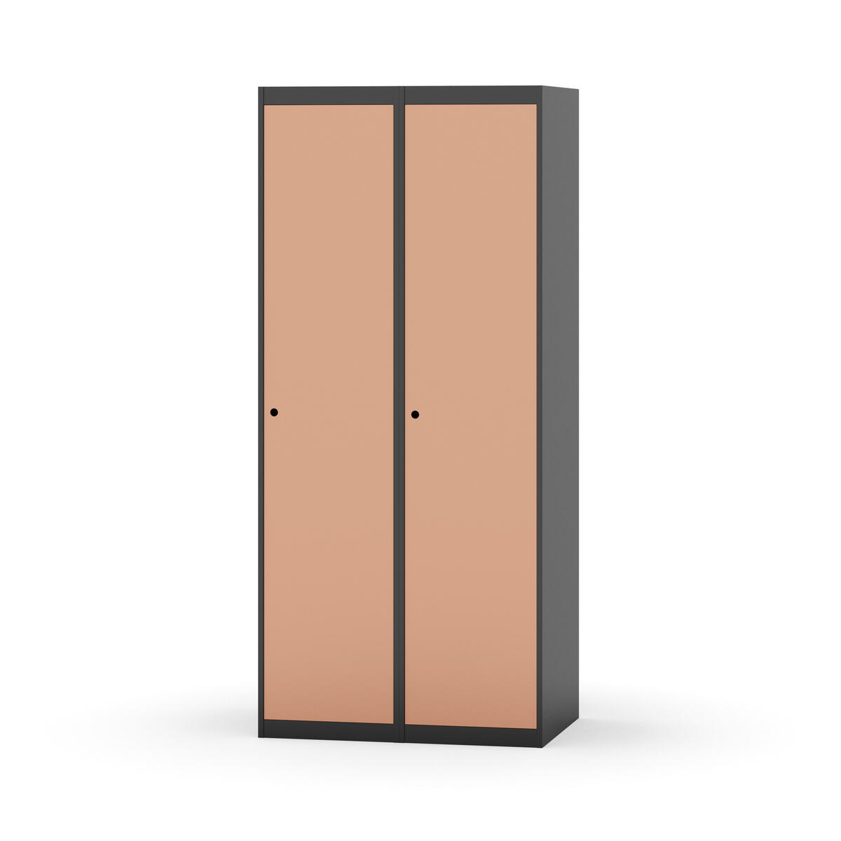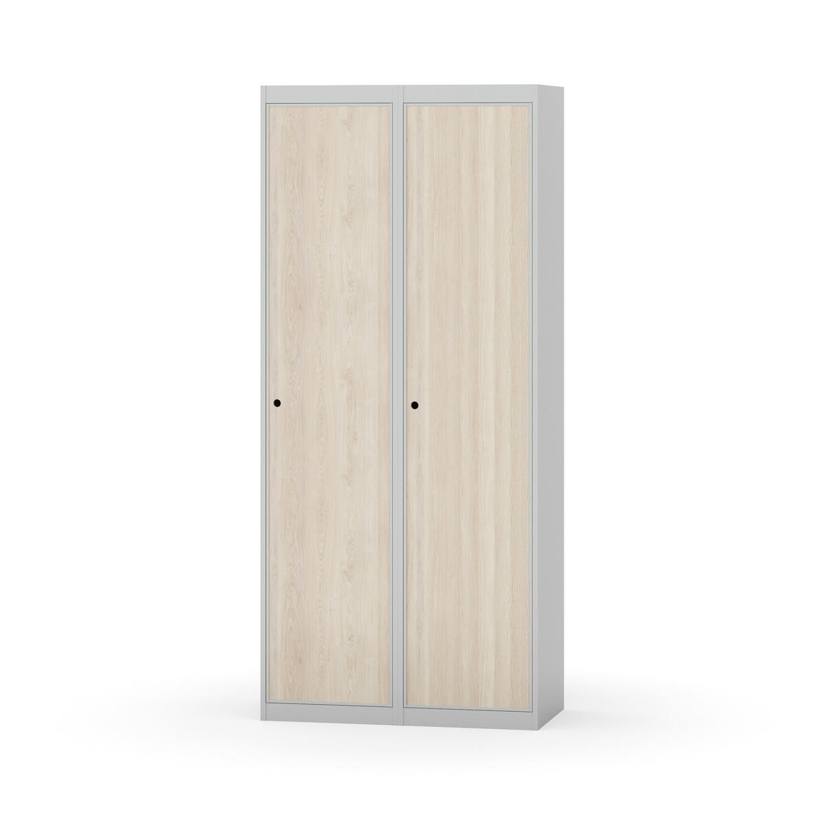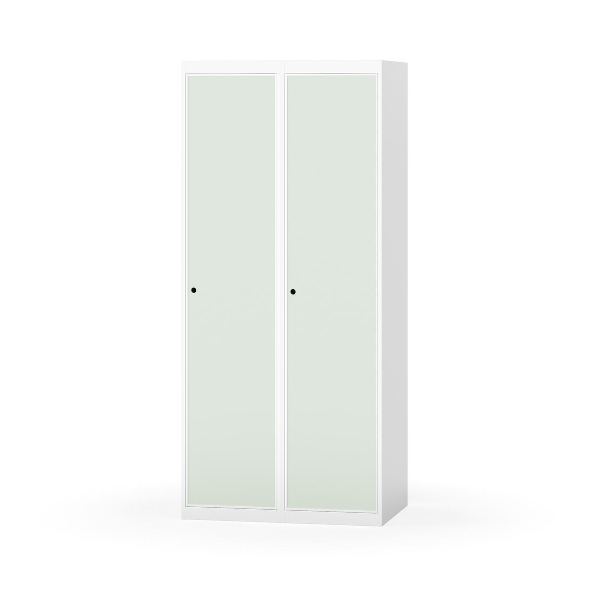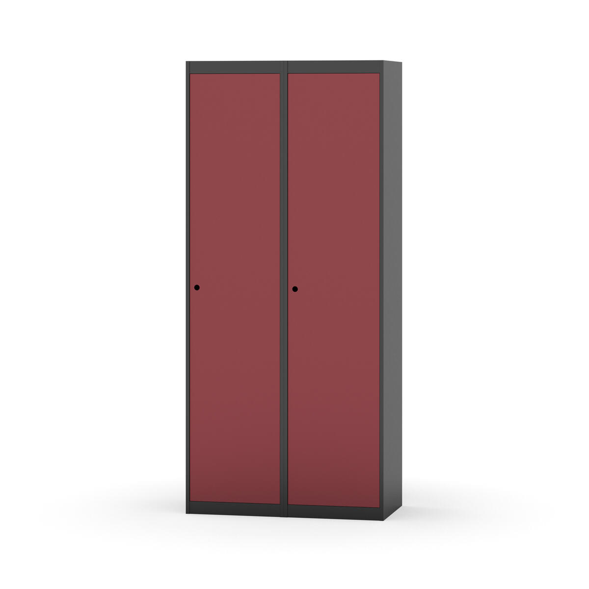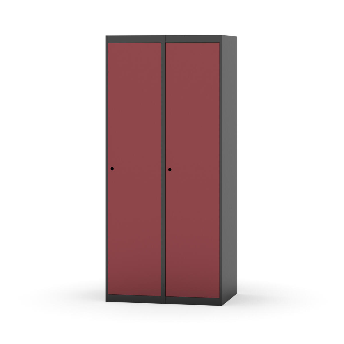 Klädskåp med helsvetsad stomme. Välj mellan plåt eller laminatdörr. Plåtdörren är försedd med dörrstopp i stål och infälld förstärkning kring låshålet. Laminatdörr infälld i stålram försedd med dörrstopp i stål. Dörrar är öppningsbara 90 grader. Inredning: Hyllplan och klädstång med två ankarkrokar. Slät golvyta utan tröskel. Ventilation genom hål i tak-/bottenplåt. Observera att lås och underrede beställs på separata artikelnummer. Lås kommer att vara monterade på skåp vid leverans. Valt underrede monteras på plats.
