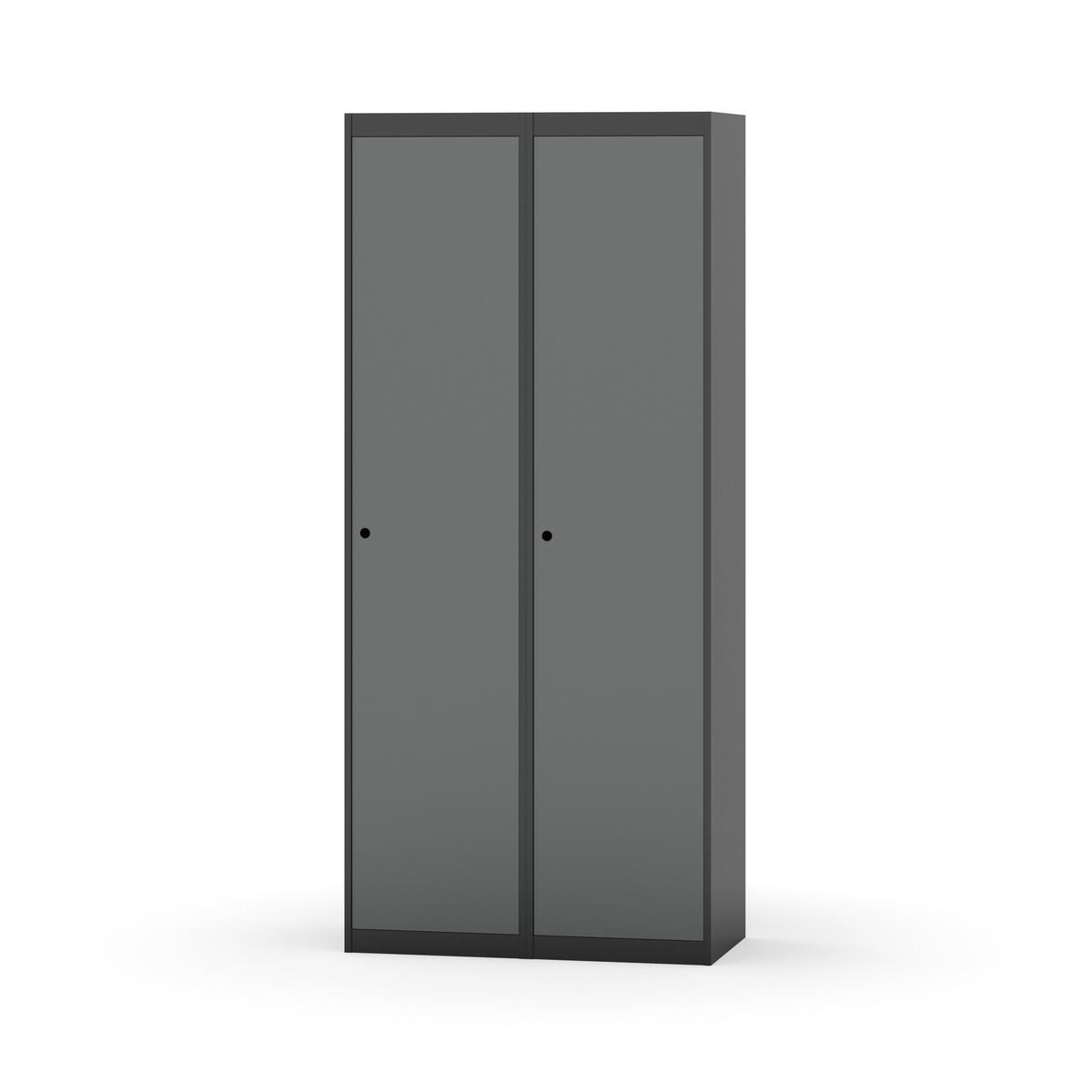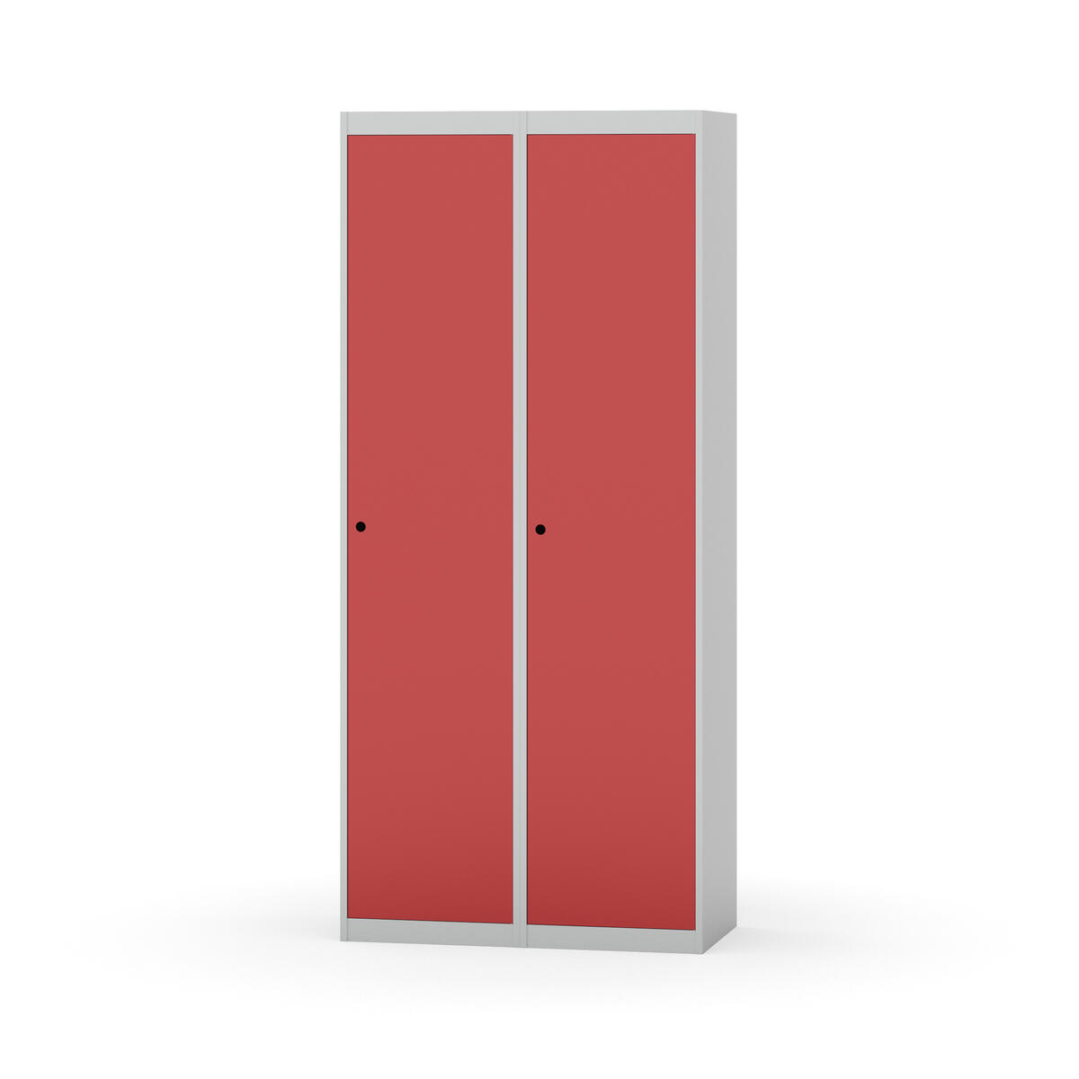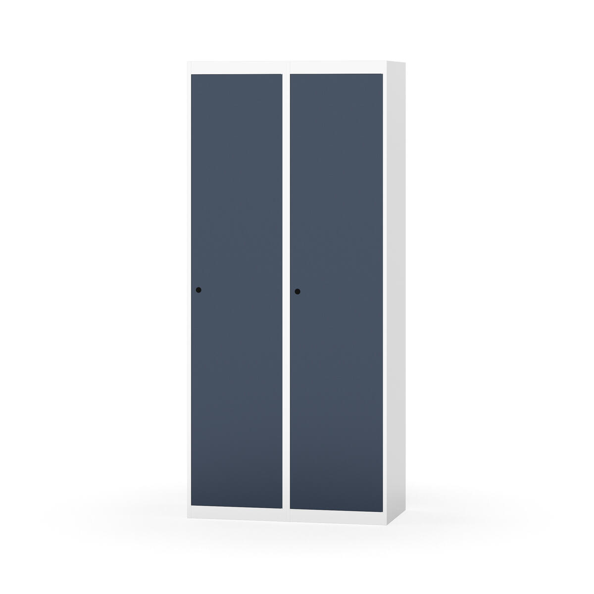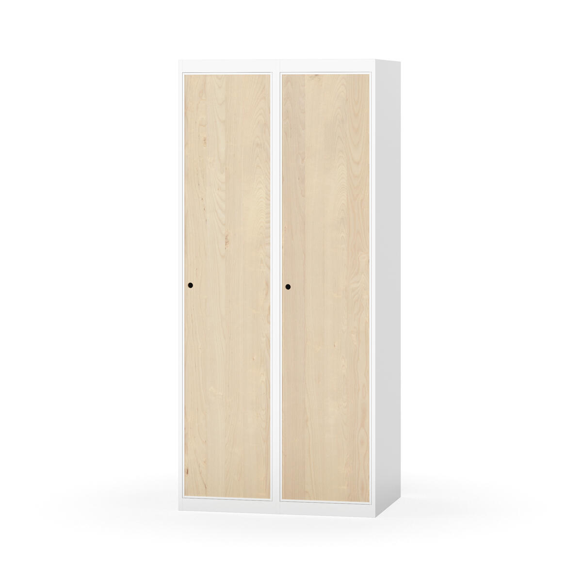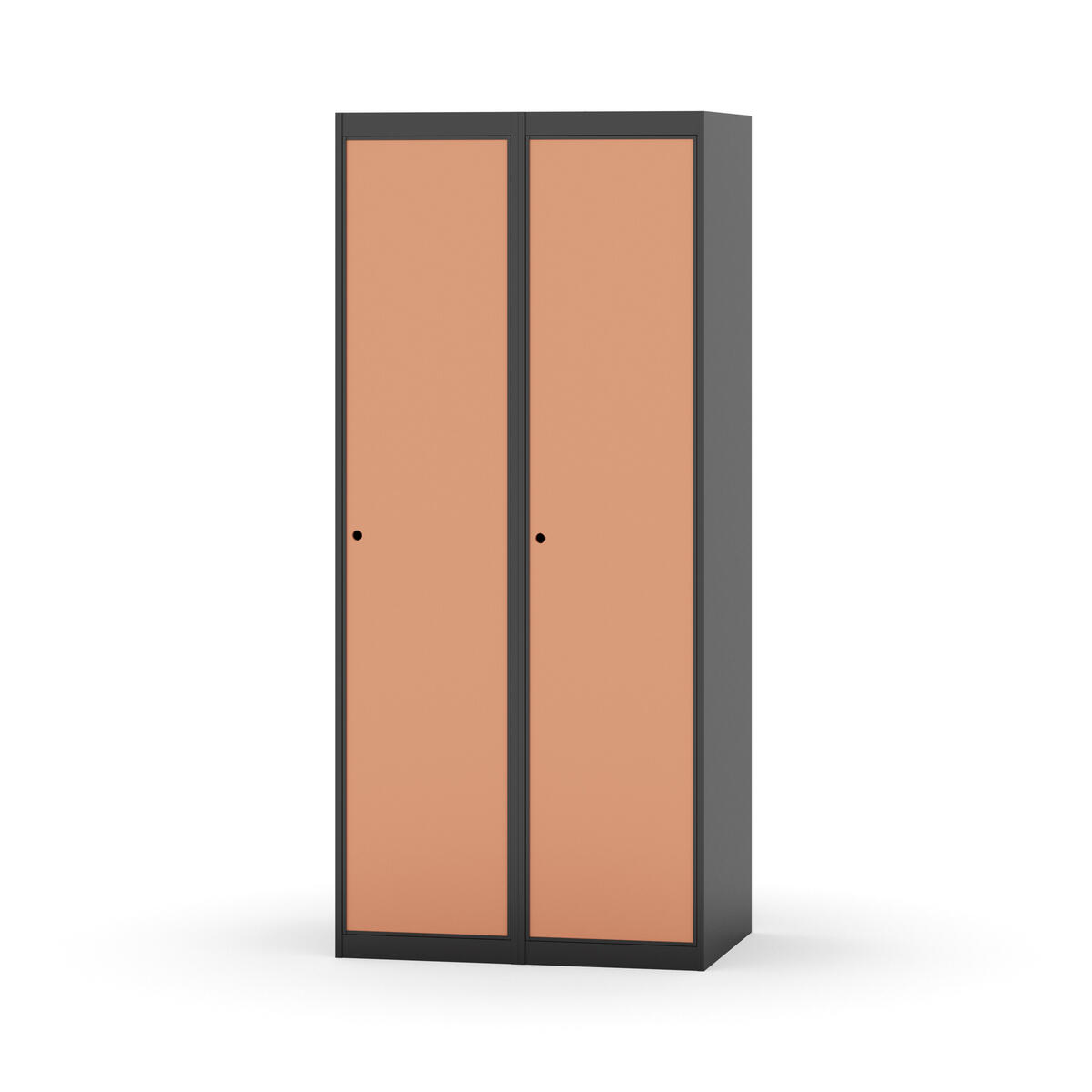 Klädskåp med helsvetsad stomme. Välj mellan plåt eller laminatdörr. Plåtdörren är försedd med dörrstopp i stål och infälld förstärkning kring låshålet. Laminatdörr infälld i stålram försedd med dörrstopp i stål. Dörrar är öppningsbara 90 grader. Inredning: Hyllplan och klädstång med två ankarkrokar. Slät golvyta utan tröskel. Ventilation genom hål i tak-/bottenplåt. Observera att lås och underrede beställs på separata artikelnummer. Lås kommer att vara monterade på skåp vid leverans. Valt underrede monteras på plats.