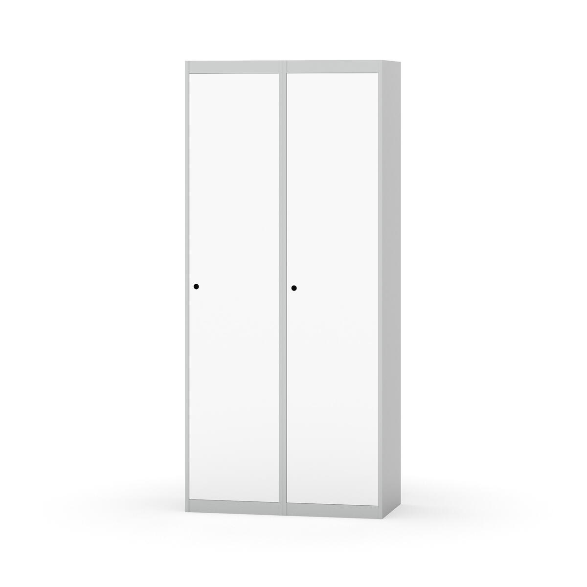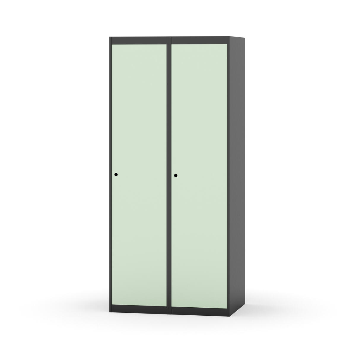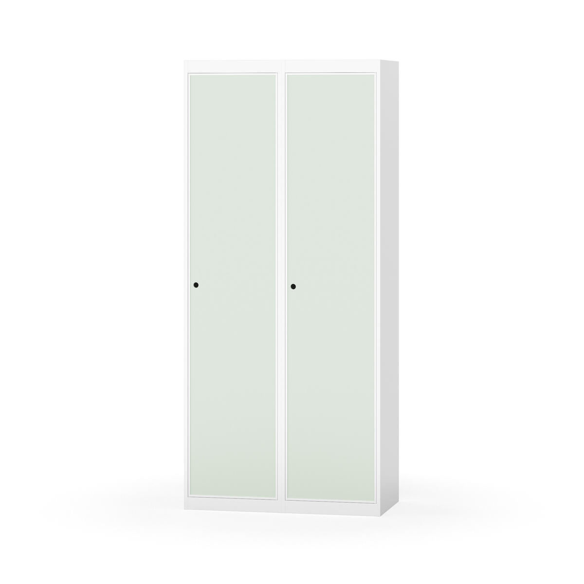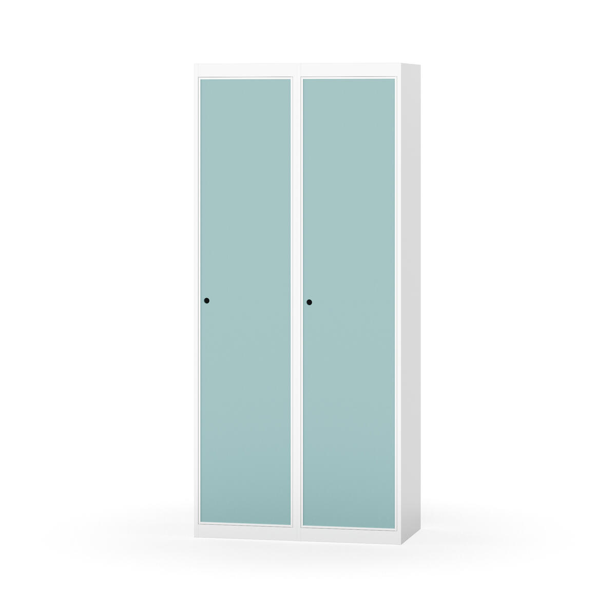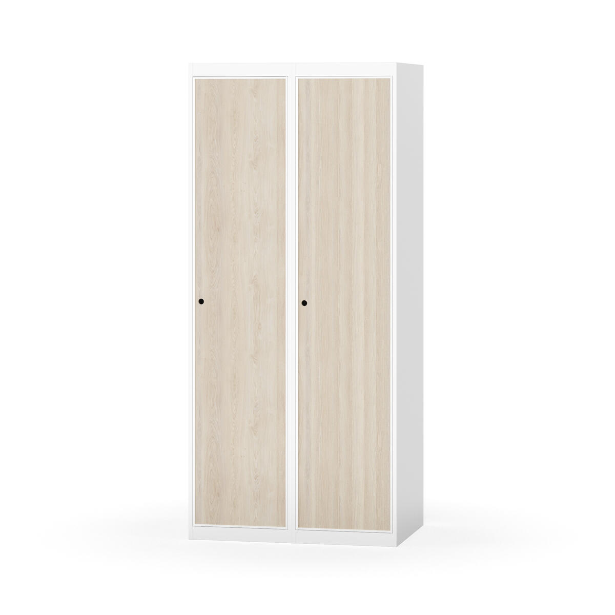 Klädskåp med helsvetsad stomme. Välj mellan plåt eller laminatdörr. Plåtdörren är försedd med dörrstopp i stål och infälld förstärkning kring låshålet. Laminatdörr infälld i stålram försedd med dörrstopp i stål. Dörrar är öppningsbara 90 grader. Inredning: Hyllplan och klädstång med två ankarkrokar. Slät golvyta utan tröskel. Ventilation genom hål i tak-/bottenplåt. Observera att lås och underrede beställs på separata artikelnummer. Lås kommer att vara monterade på skåp vid leverans. Valt underrede monteras på plats.