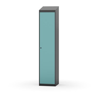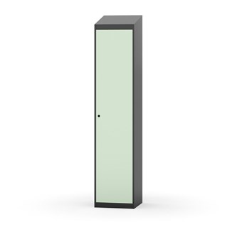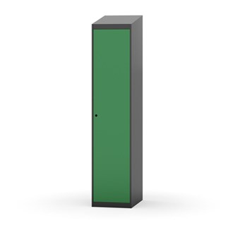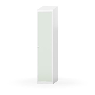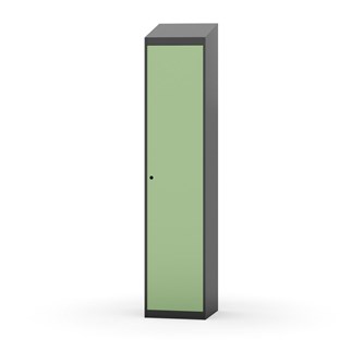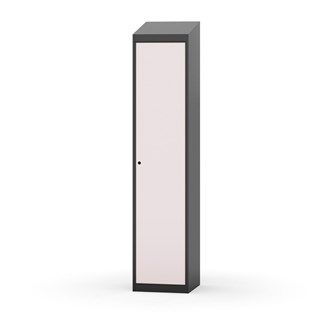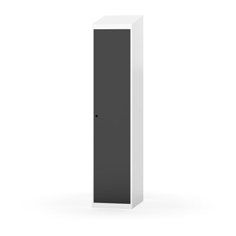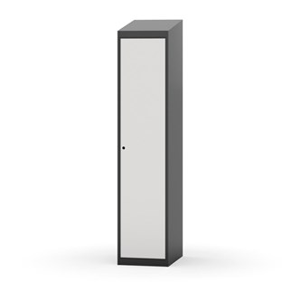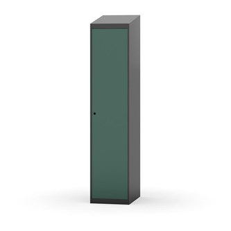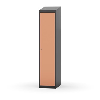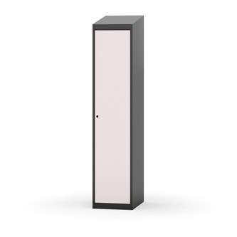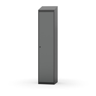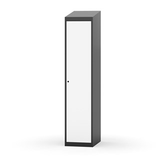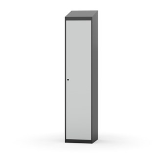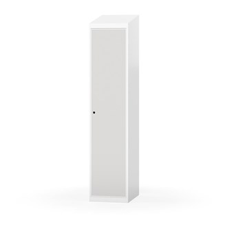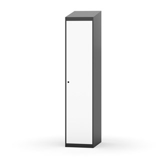 Klädskåp med helsvetsad stomme. Välj mellan plåt eller laminatdörr. Plåtdörren är försedd med dörrstopp i stål och infälld förstärkning kring låshålet. Laminatdörr infälld i stålram försedd med dörrstopp i stål. Dörrar är öppningsbara 90 grader. Inredning: Hyllplan och klädstång med två ankarkrokar. Slät golvyta utan tröskel. Ventilation genom hål i tak-/bottenplåt. Observera att lås och underrede beställs på separata artikelnummer. Lås kommer att vara monterade på skåp vid leverans. Valt underrede monteras på plats.