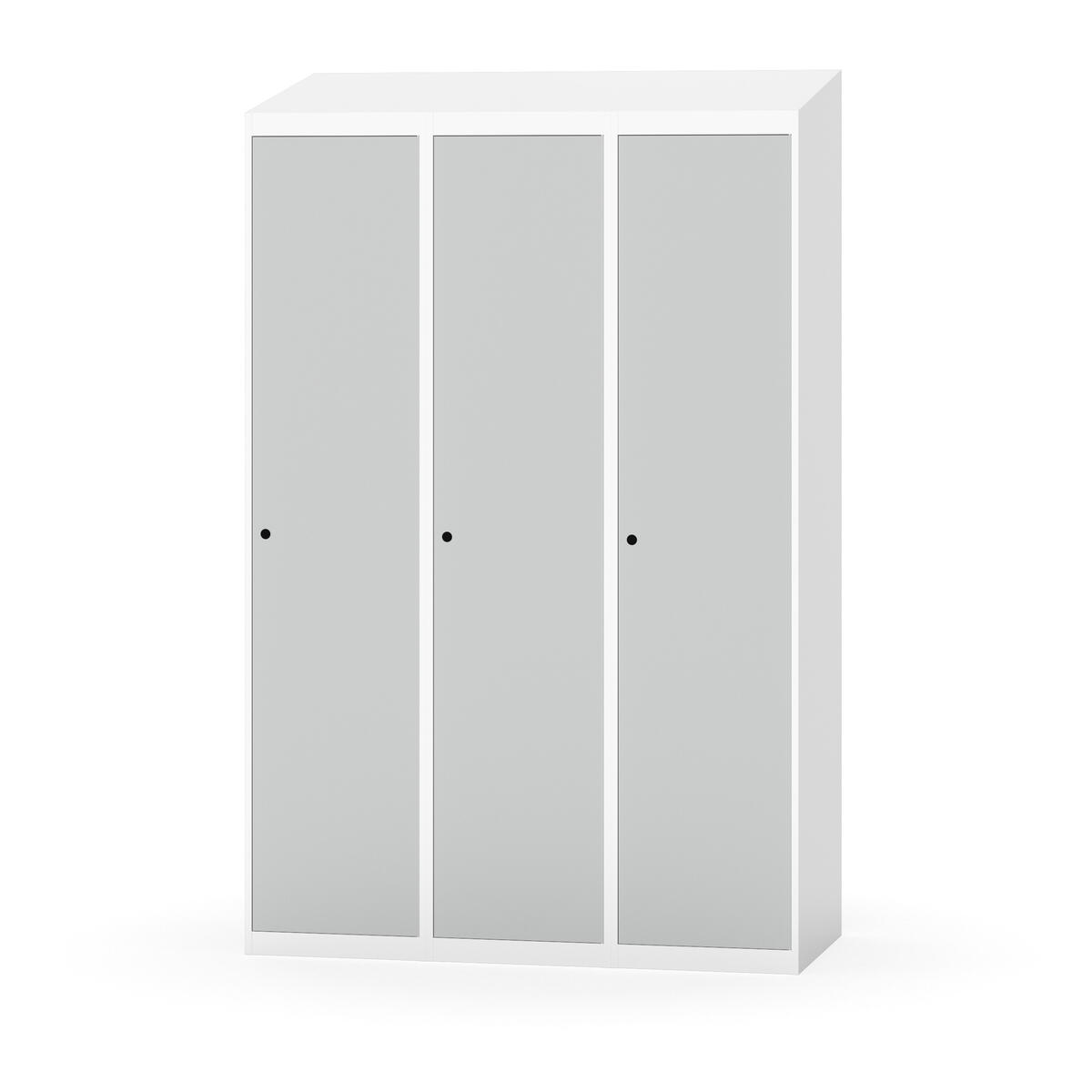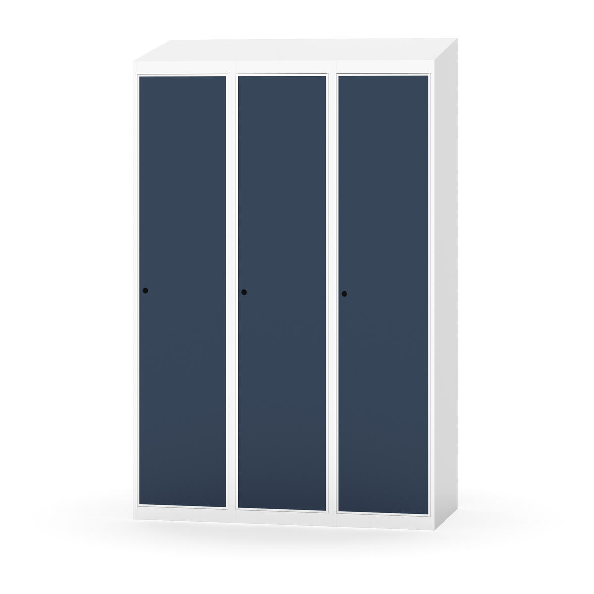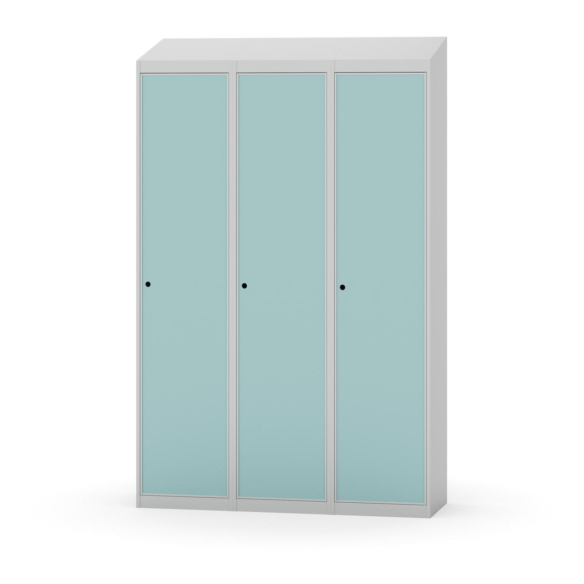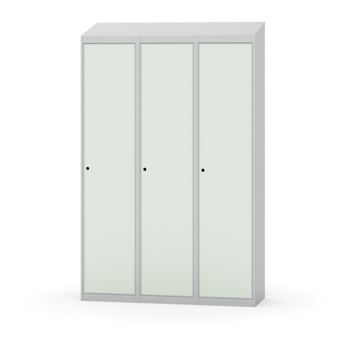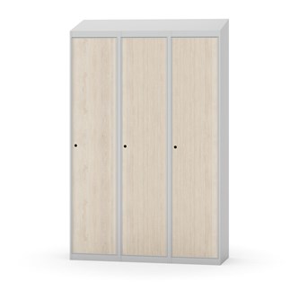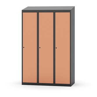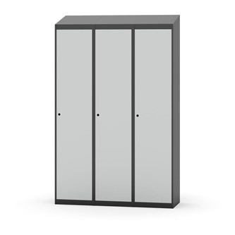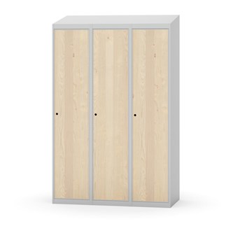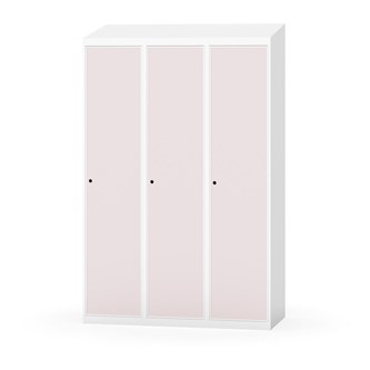 Klädskåp med helsvetsad stomme. Välj mellan plåt eller laminatdörr. Plåtdörren är försedd med dörrstopp i stål och infälld förstärkning kring låshålet. Laminatdörr infälld i stålram försedd med dörrstopp i stål. Dörrar är öppningsbara 90 grader. Inredning: Hyllplan och klädstång med två ankarkrokar. Slät golvyta utan tröskel. Ventilation genom hål i tak-/bottenplåt. Observera att lås och underrede beställs på separata artikelnummer. Lås kommer att vara monterade på skåp vid leverans. Valt underrede monteras på plats.