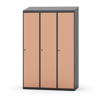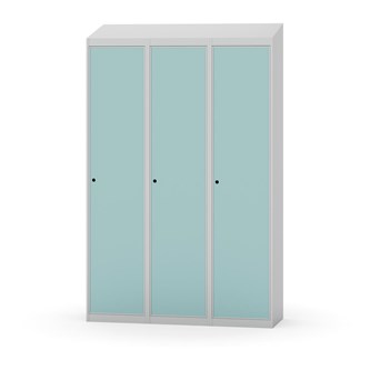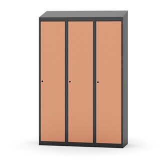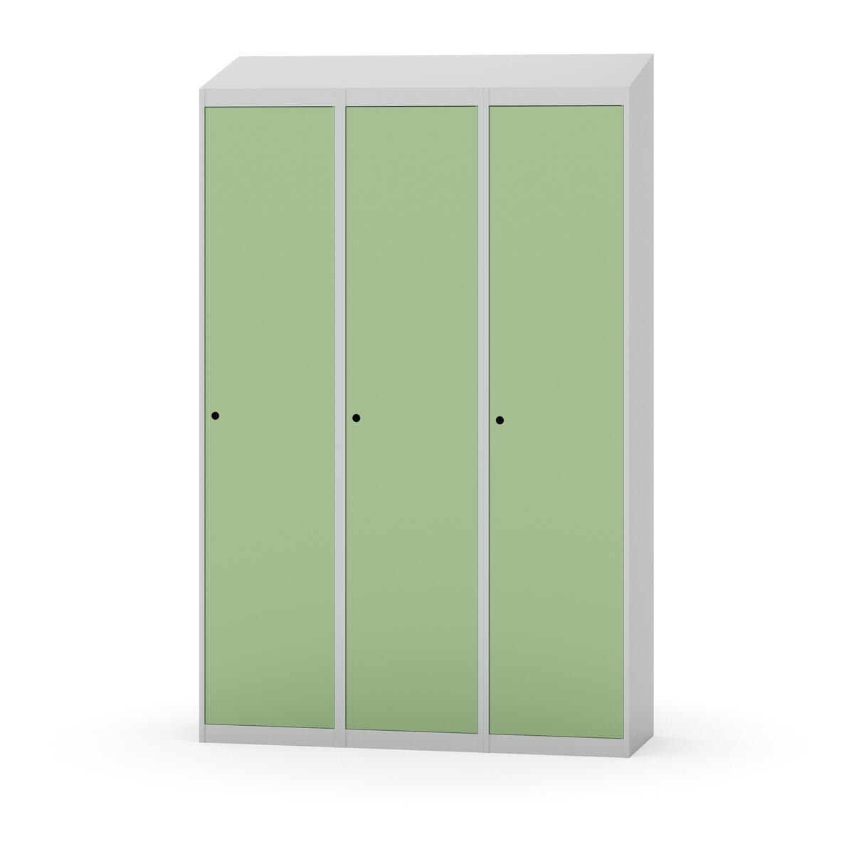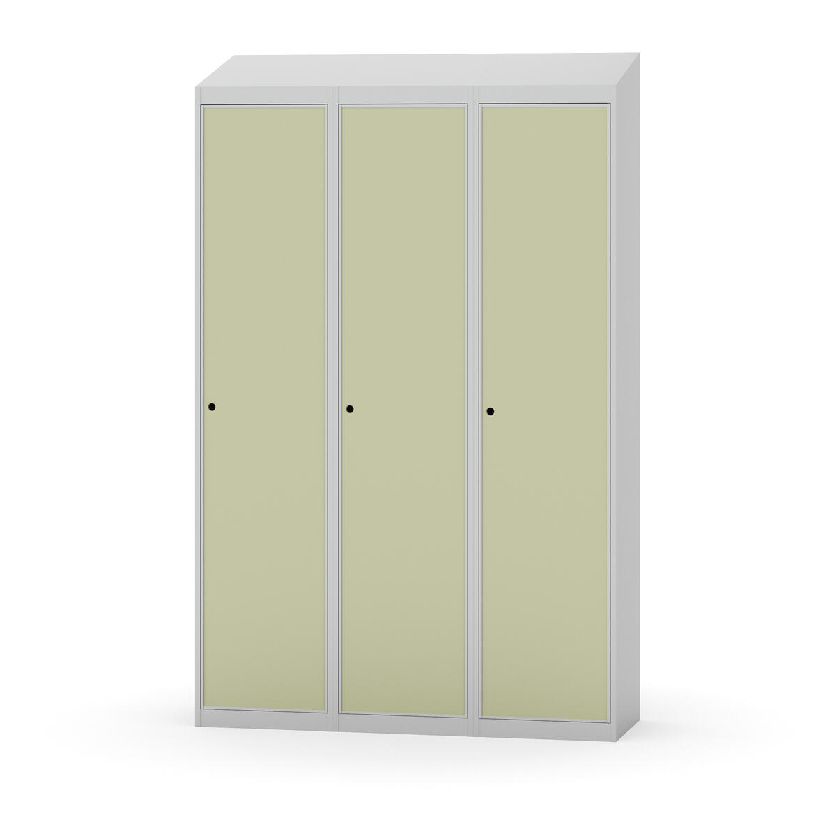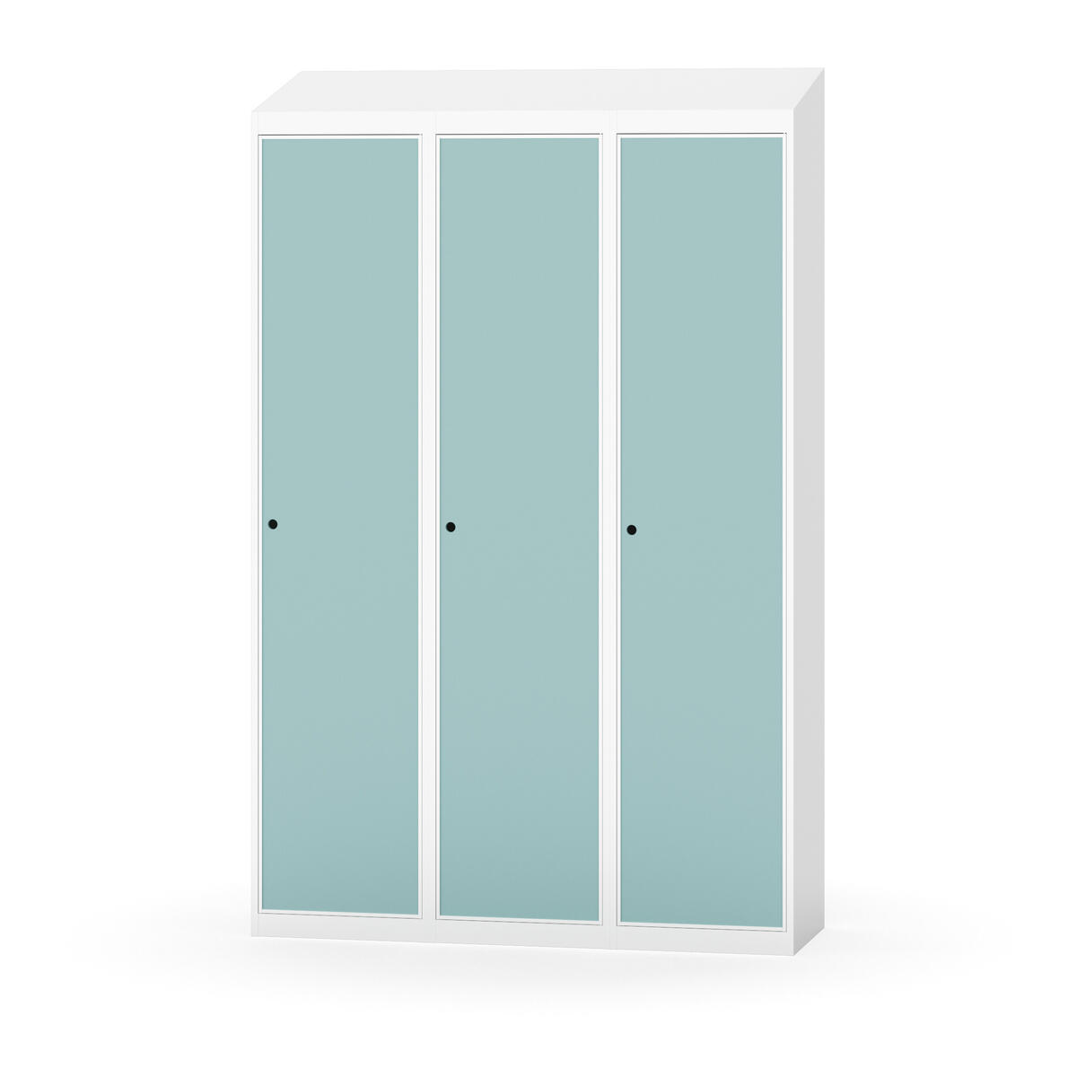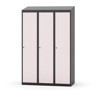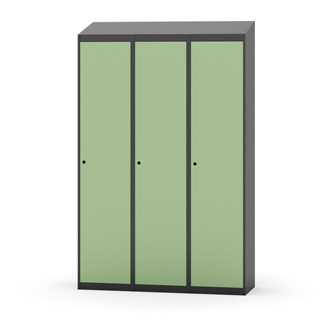 Klädskåp med helsvetsad stomme. Välj mellan plåt eller laminatdörr. Plåtdörren är försedd med dörrstopp i stål och infälld förstärkning kring låshålet. Laminatdörr infälld i stålram försedd med dörrstopp i stål. Dörrar är öppningsbara 90 grader. Inredning: Hyllplan och klädstång med två ankarkrokar. Slät golvyta utan tröskel. Ventilation genom hål i tak-/bottenplåt. Observera att lås och underrede beställs på separata artikelnummer. Lås kommer att vara monterade på skåp vid leverans. Valt underrede monteras på plats.