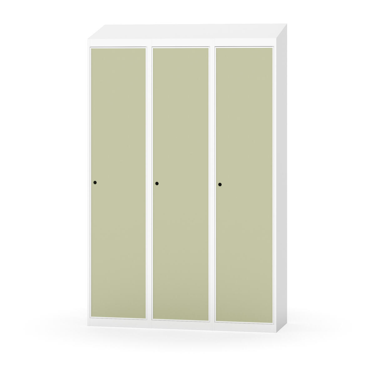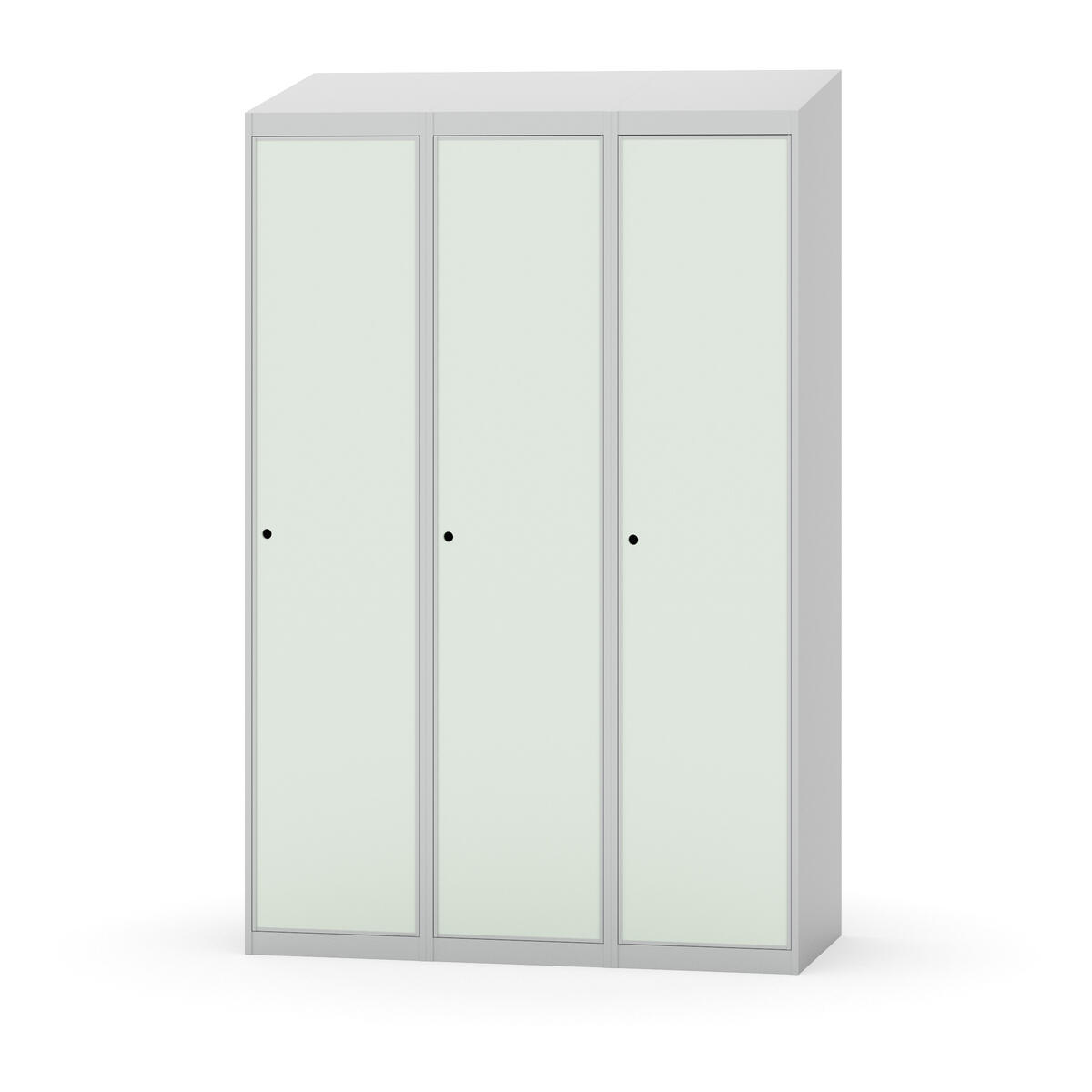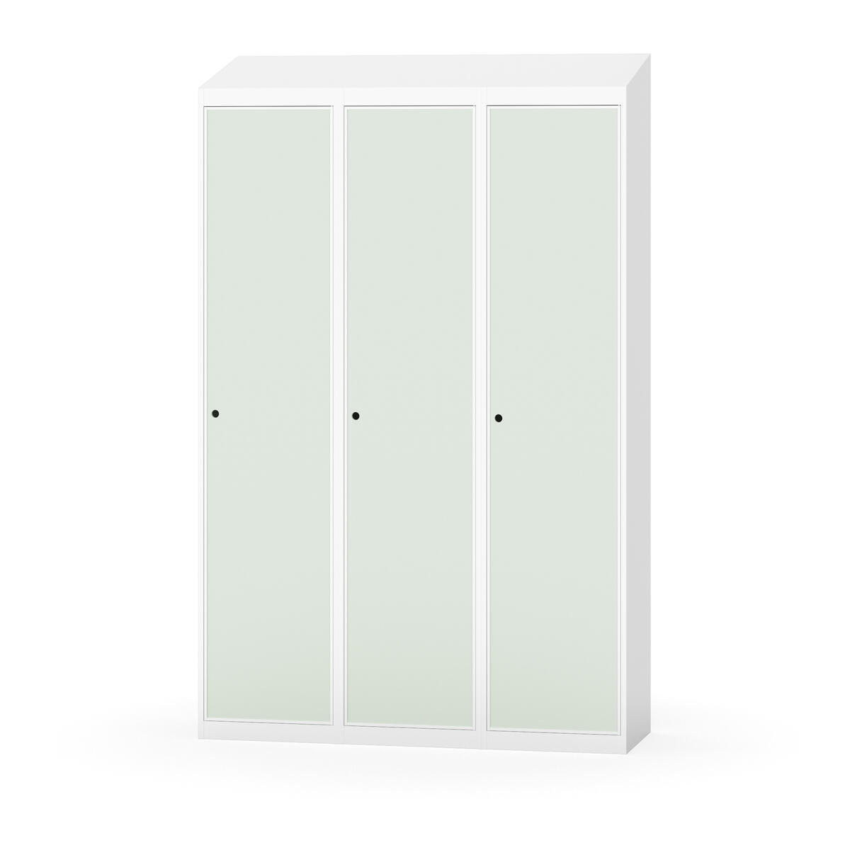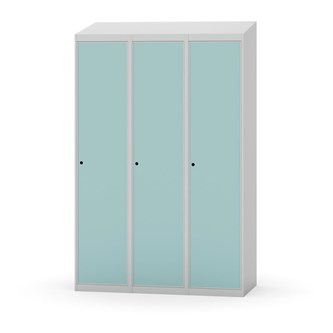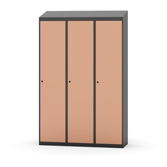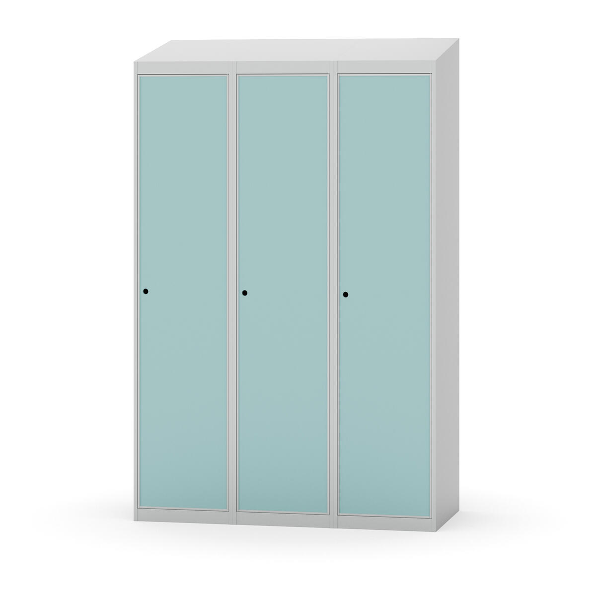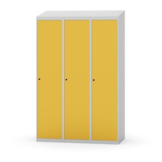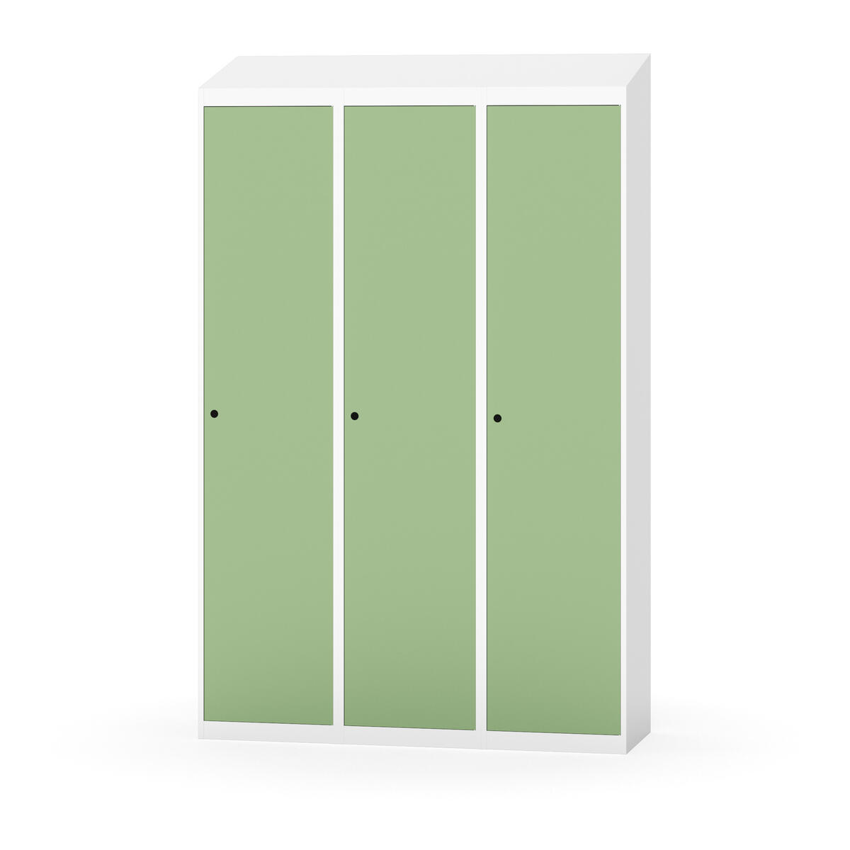 Klädskåp med helsvetsad stomme. Välj mellan plåt eller laminatdörr. Plåtdörren är försedd med dörrstopp i stål och infälld förstärkning kring låshålet. Laminatdörr infälld i stålram försedd med dörrstopp i stål. Dörrar är öppningsbara 90 grader. Inredning: Hyllplan och klädstång med två ankarkrokar. Slät golvyta utan tröskel. Ventilation genom hål i tak-/bottenplåt. Observera att lås och underrede beställs på separata artikelnummer. Lås kommer att vara monterade på skåp vid leverans. Valt underrede monteras på plats.