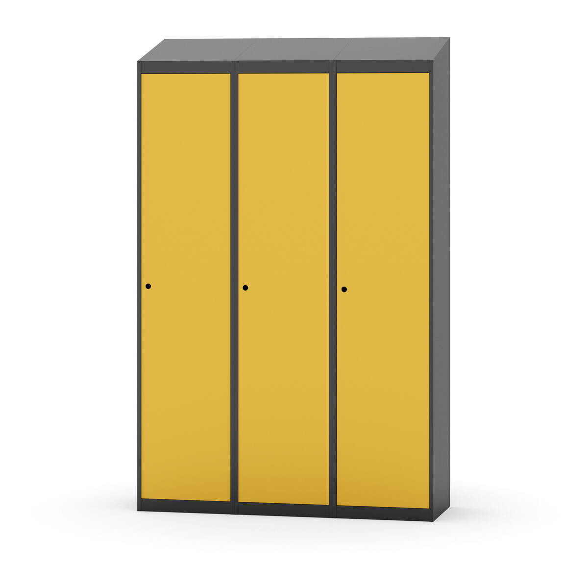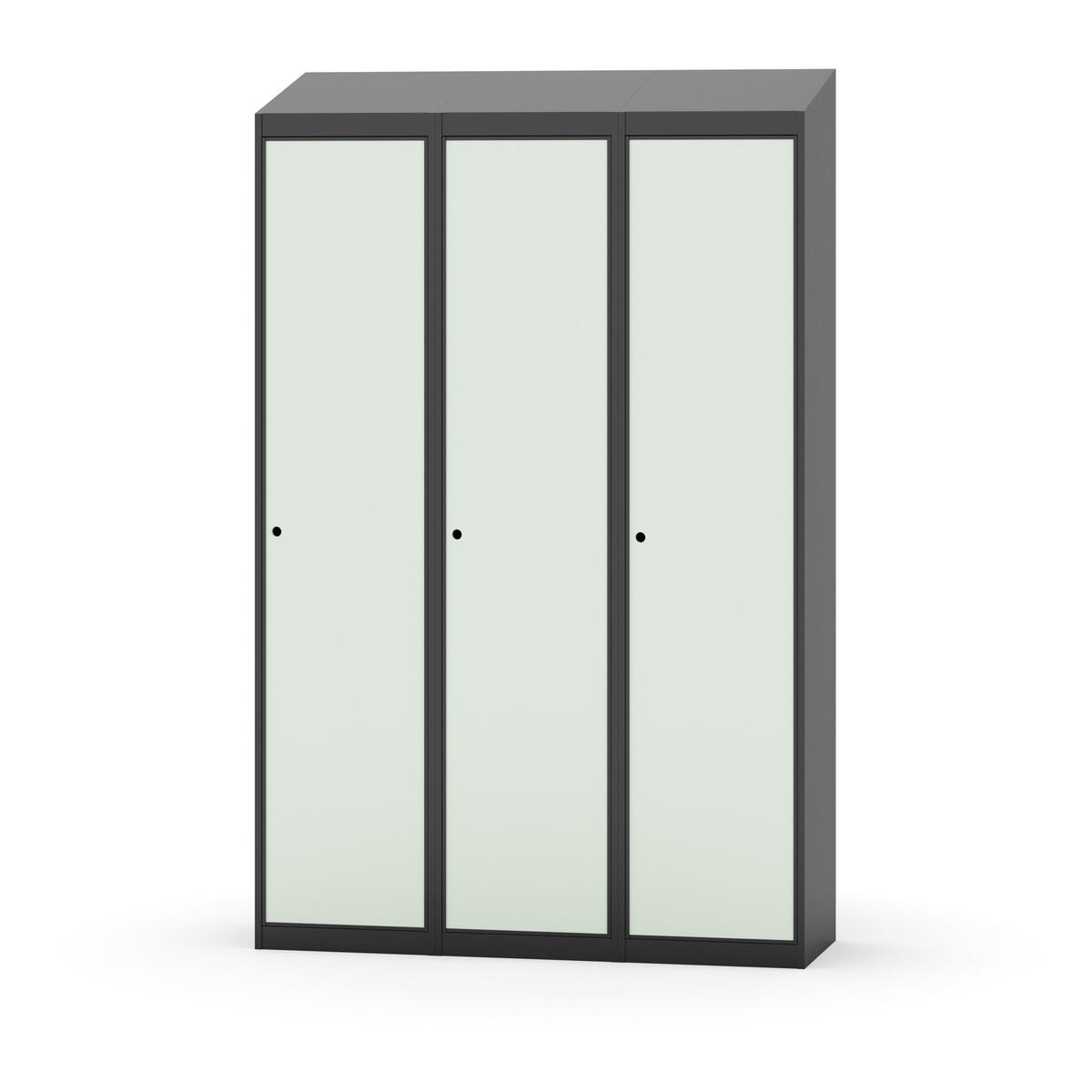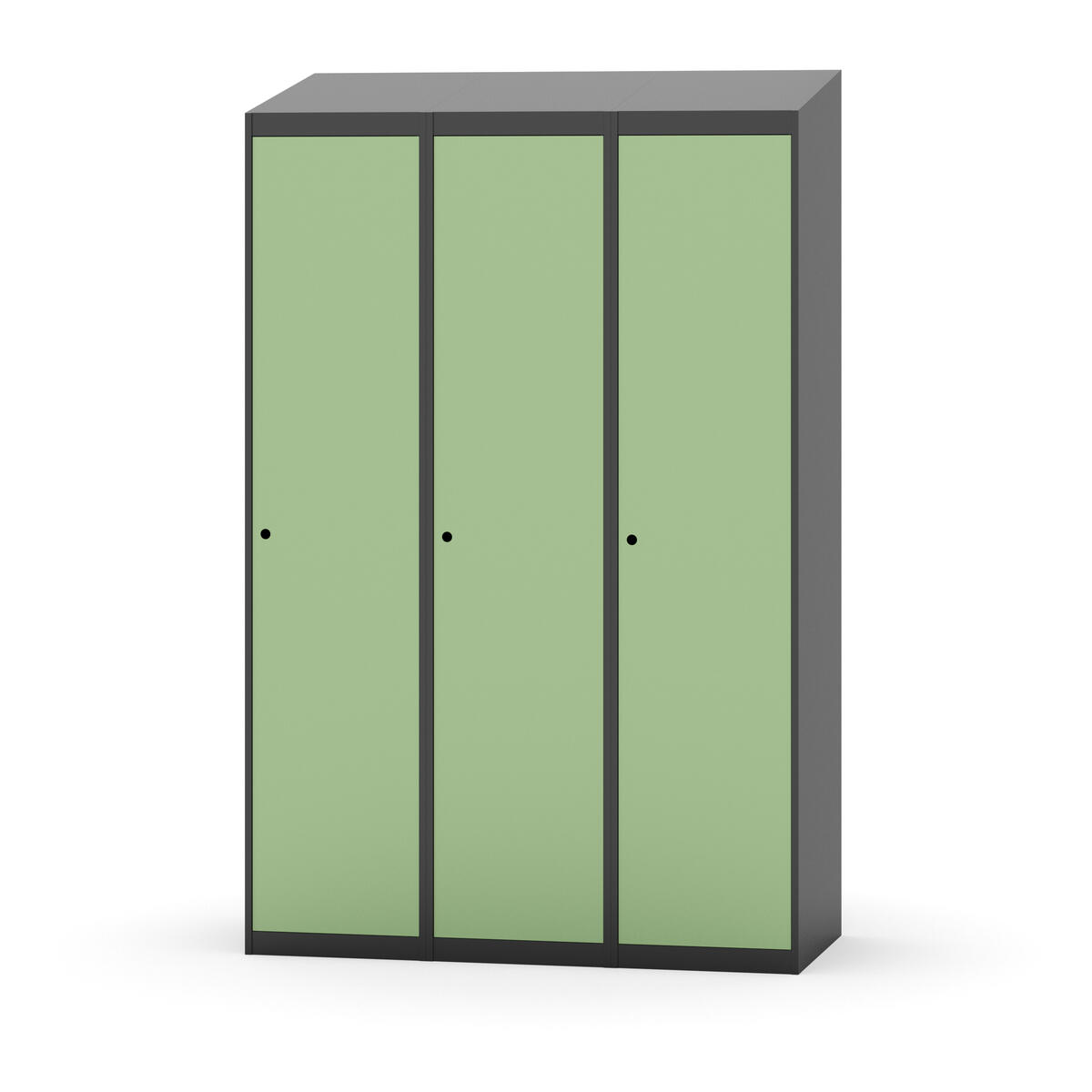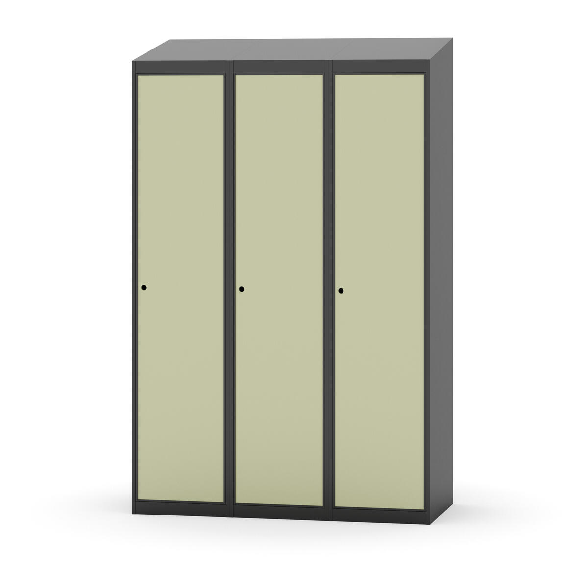 Klädskåp med helsvetsad stomme. Välj mellan plåt eller laminatdörr. Plåtdörren är försedd med dörrstopp i stål och infälld förstärkning kring låshålet. Laminatdörr infälld i stålram försedd med dörrstopp i stål. Dörrar är öppningsbara 90 grader. Inredning: Hyllplan och klädstång med två ankarkrokar. Slät golvyta utan tröskel. Ventilation genom hål i tak-/bottenplåt. Observera att lås och underrede beställs på separata artikelnummer. Lås kommer att vara monterade på skåp vid leverans. Valt underrede monteras på plats.