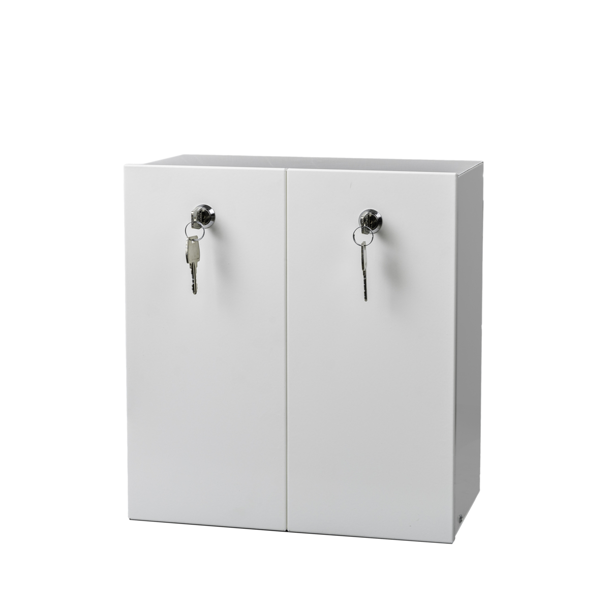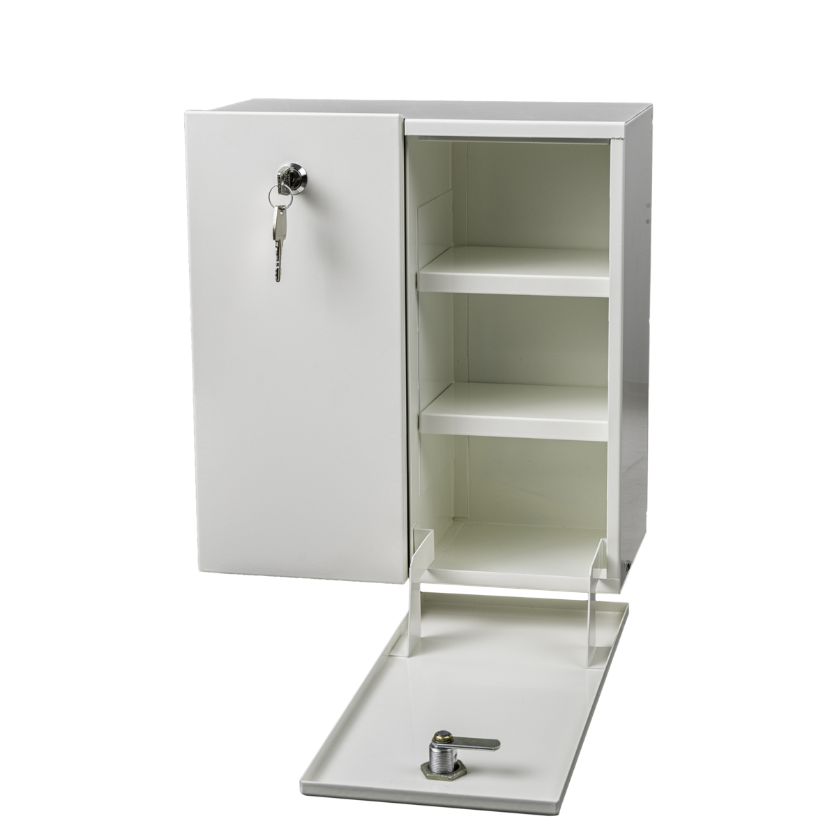 Ett sjukvårdsskåp i snygg design. Två fack för förvaring av första hjälpen-artiklar. Skåpet är låsbart och två nycklar ingår. Borstad aluminium. Mått: 28x30x12 cm. Levereras utan innehåll.