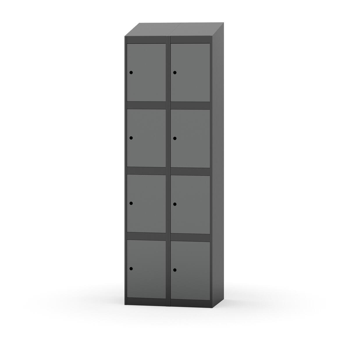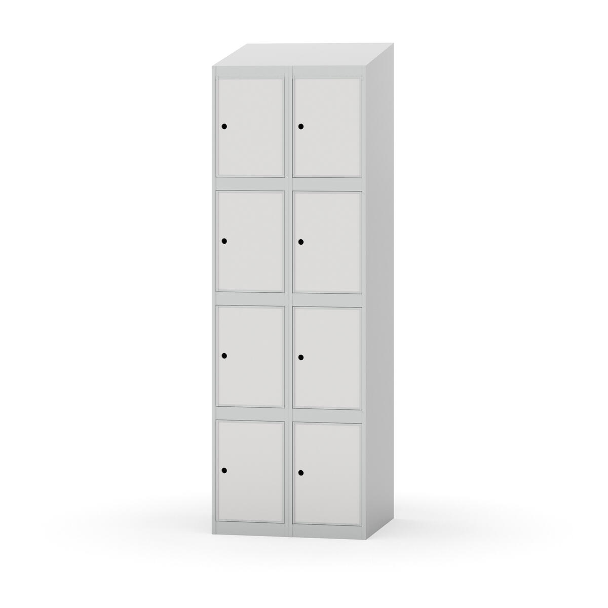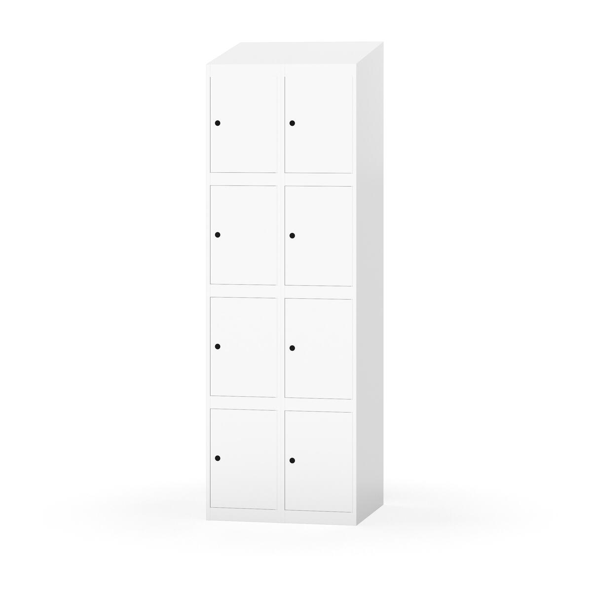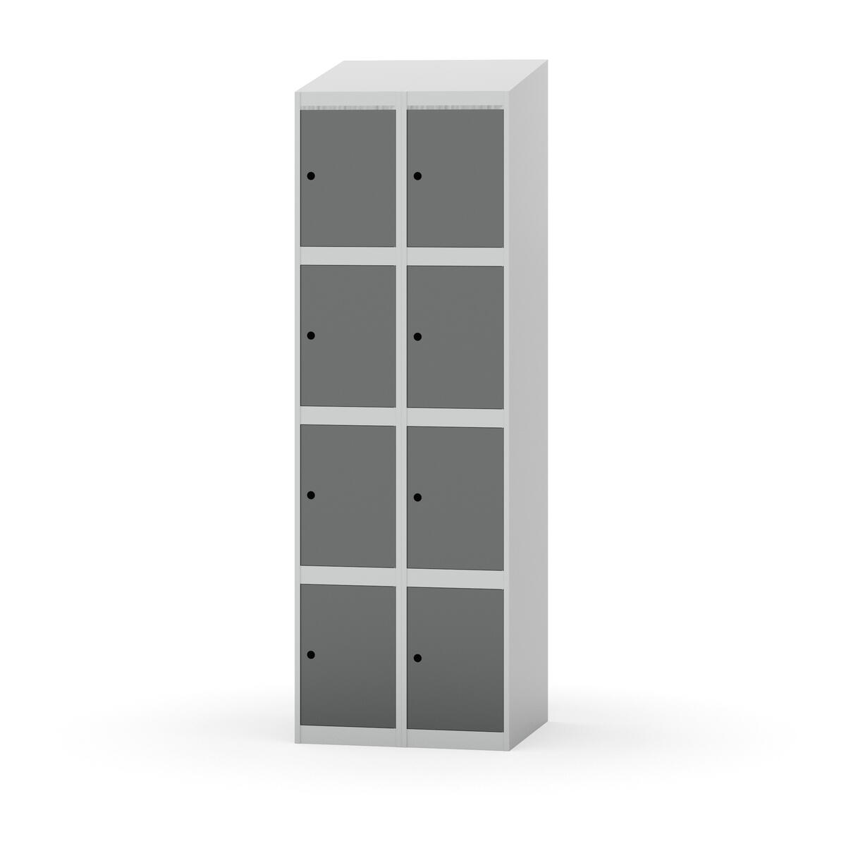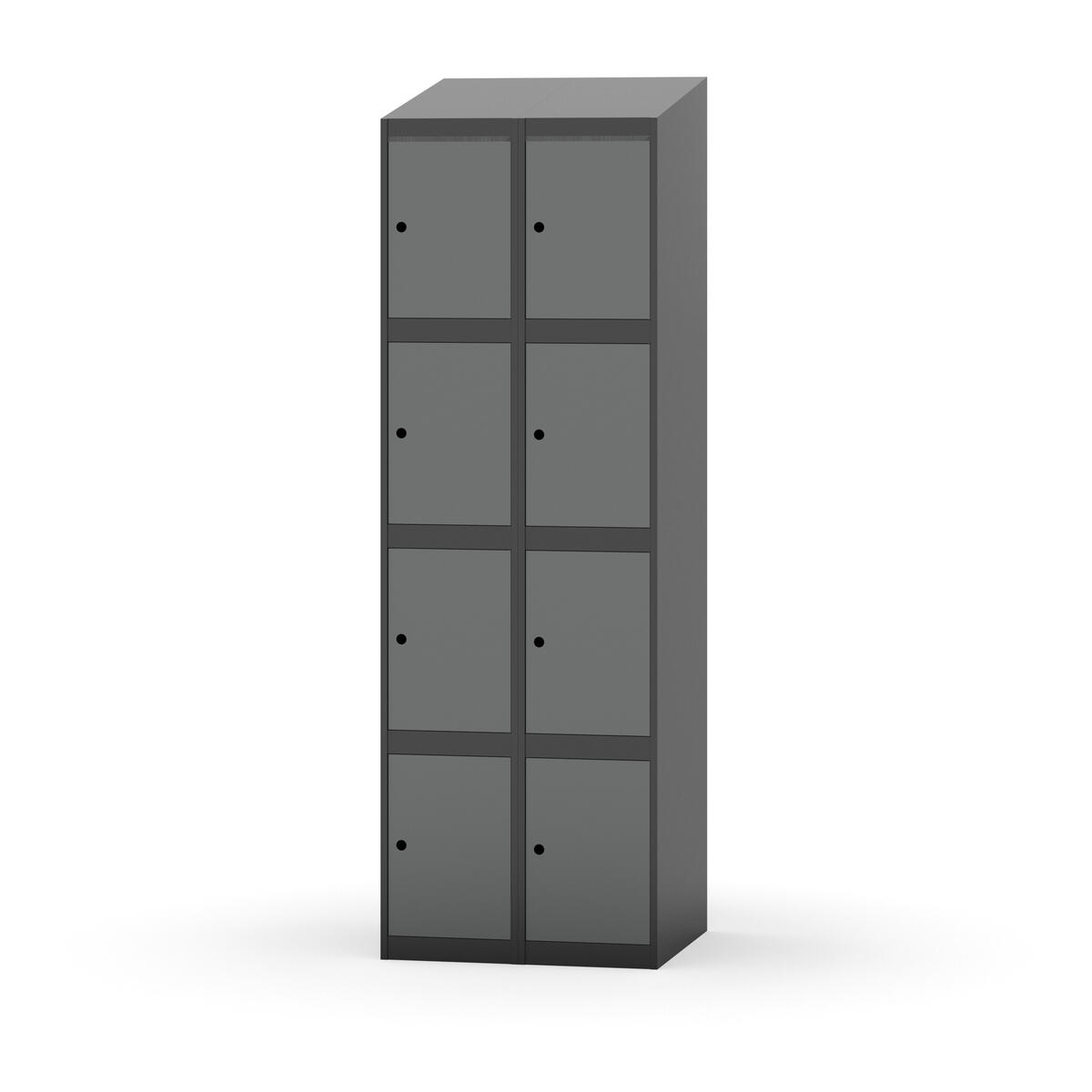Boxskåp med helsvetsad stomme. Välj mellan plåt eller laminatdörr. Plåtdörren är försedd med dörrstopp i stål och infälld förstärkning kring låshålet. Laminatdörr infälld i stålram försedd med dörrstopp i stål. Dörrar är öppningsbara 90 grader. Inredning: Ingen. Slät golvyta utan tröskel. Ventilation genom hål i tak-/bottenplåt. Observera att lås och underrede beställs på separata artikelnummer. Lås kommer att vara monterade på skåp vid leverans. Valt underrede monteras på plats.