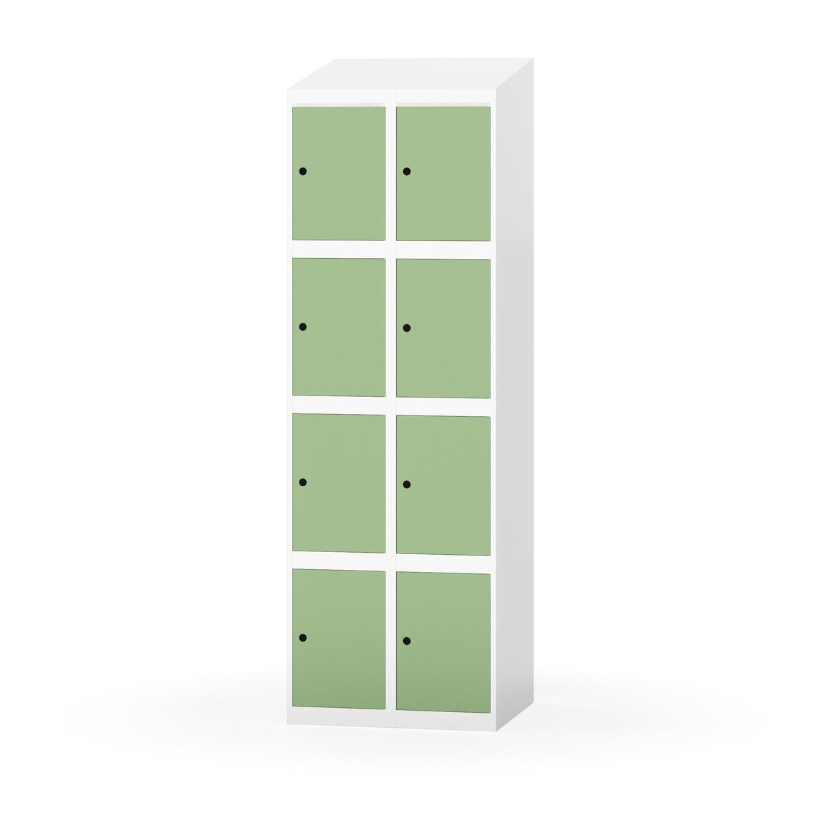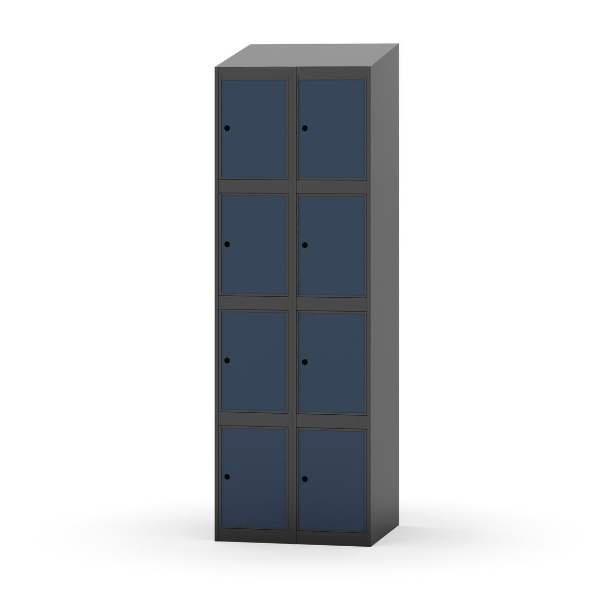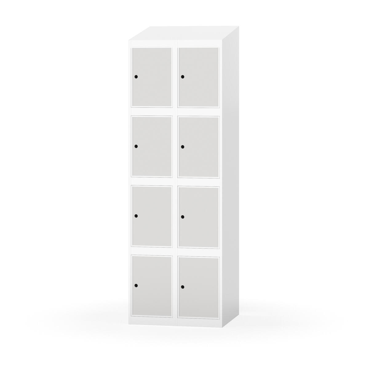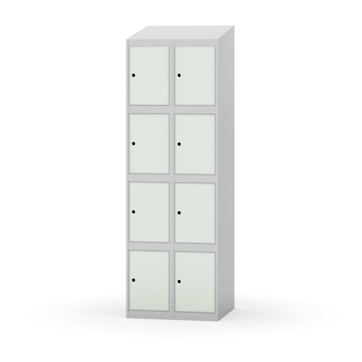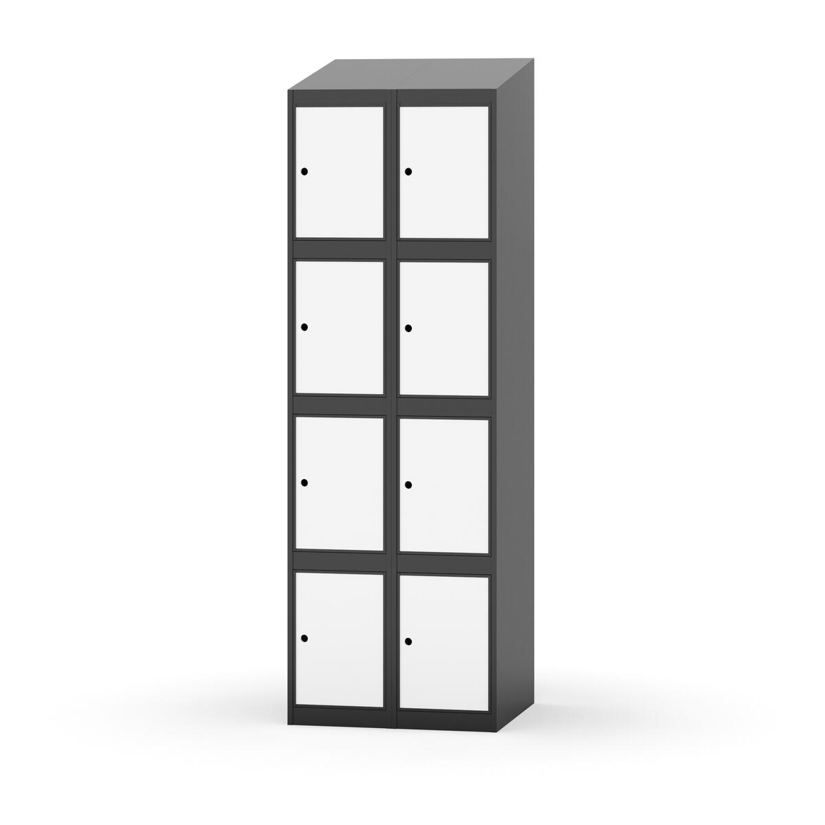 Boxskåp med helsvetsad stomme. Välj mellan plåt eller laminatdörr. Plåtdörren är försedd med dörrstopp i stål och infälld förstärkning kring låshålet. Laminatdörr infälld i stålram försedd med dörrstopp i stål. Dörrar är öppningsbara 90 grader. Inredning: Ingen. Slät golvyta utan tröskel. Ventilation genom hål i tak-/bottenplåt. Observera att lås och underrede beställs på separata artikelnummer. Lås kommer att vara monterade på skåp vid leverans. Valt underrede monteras på plats.