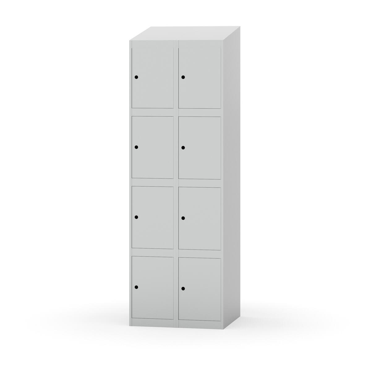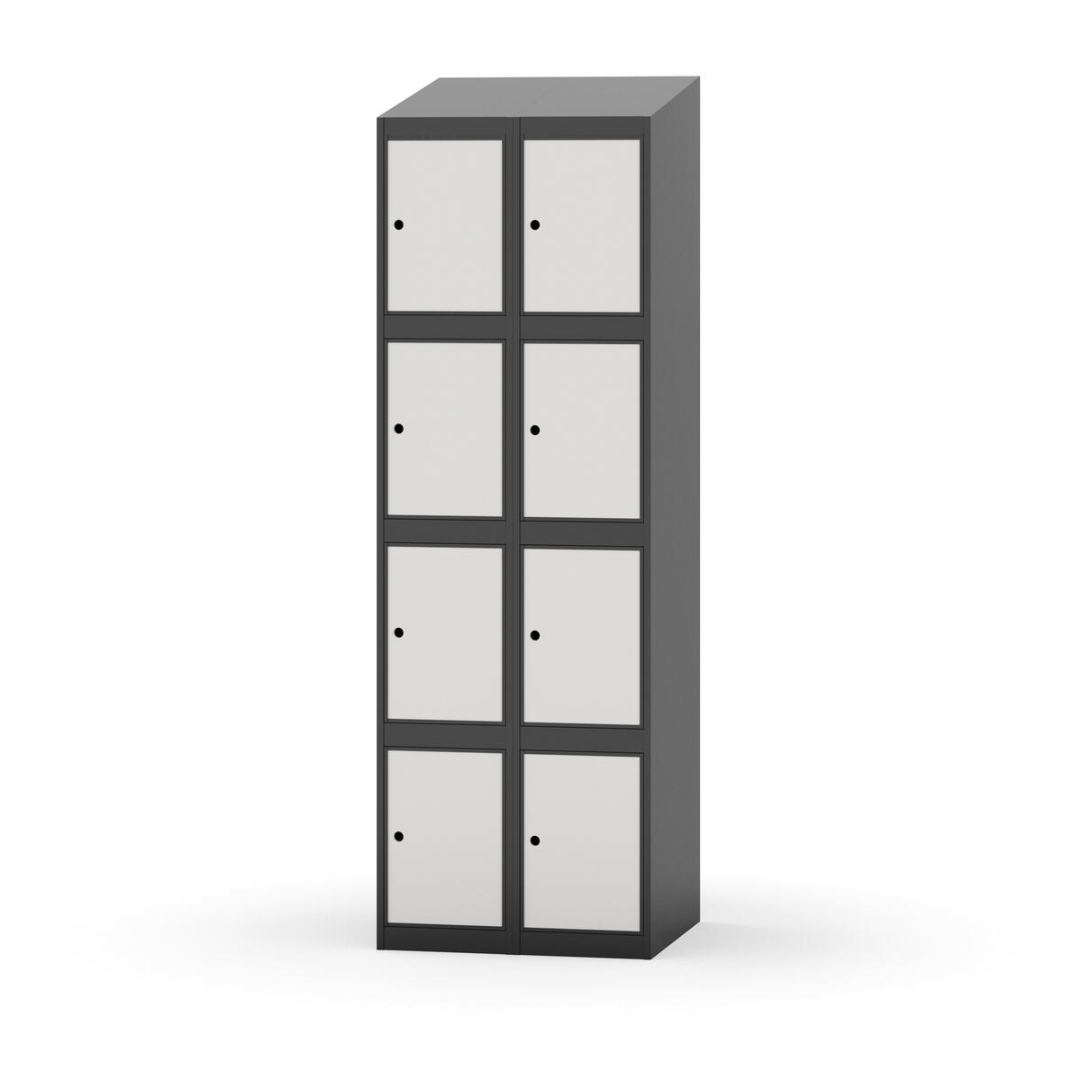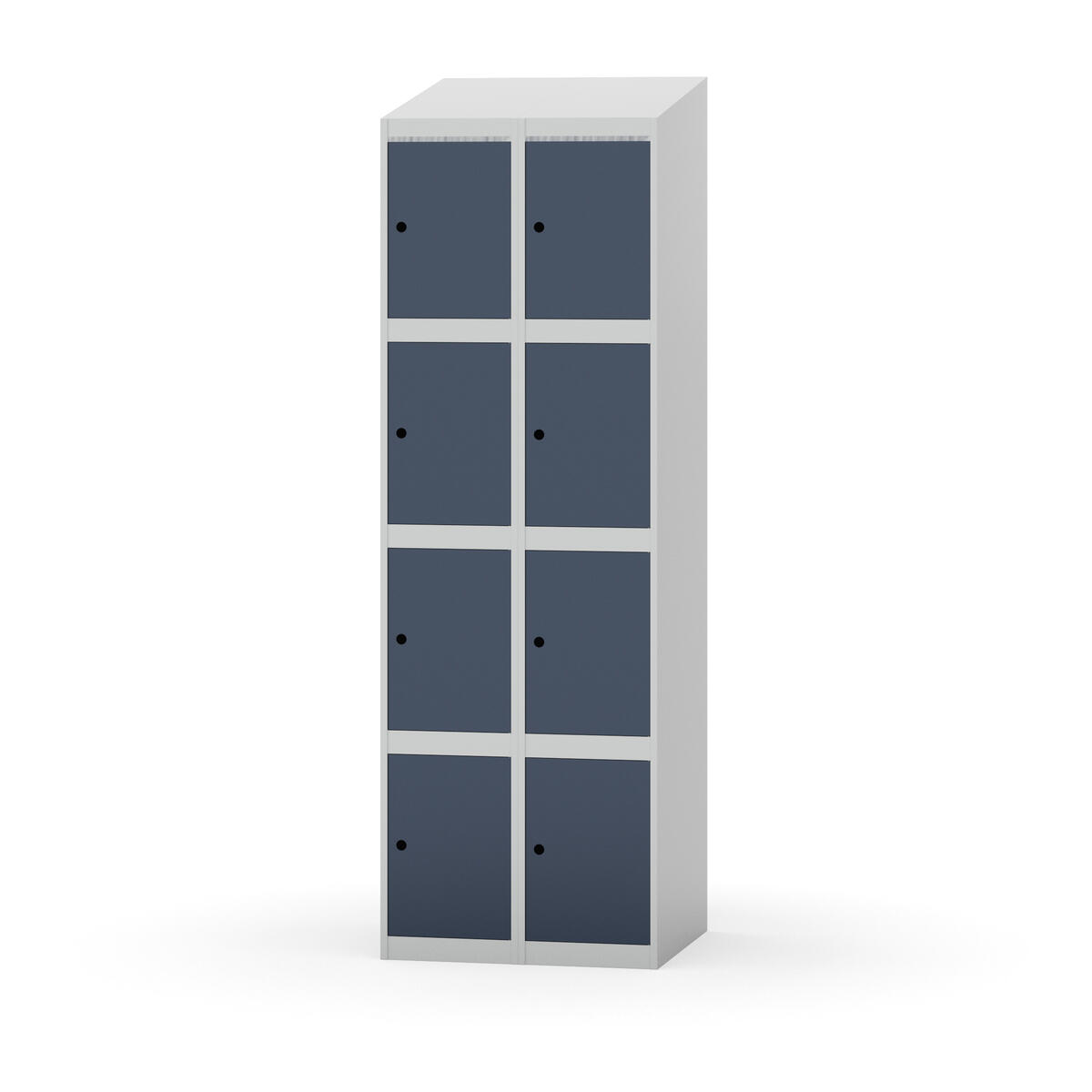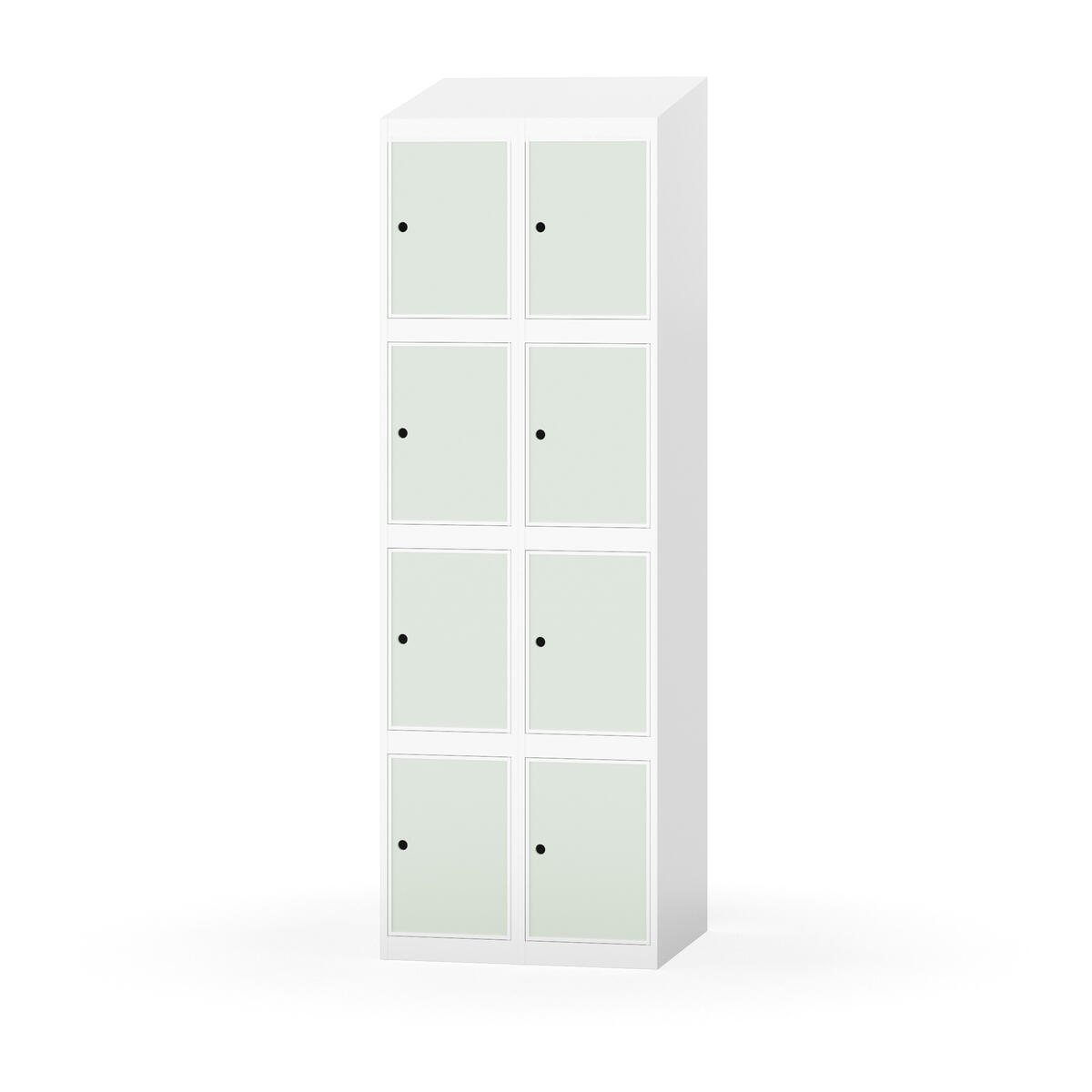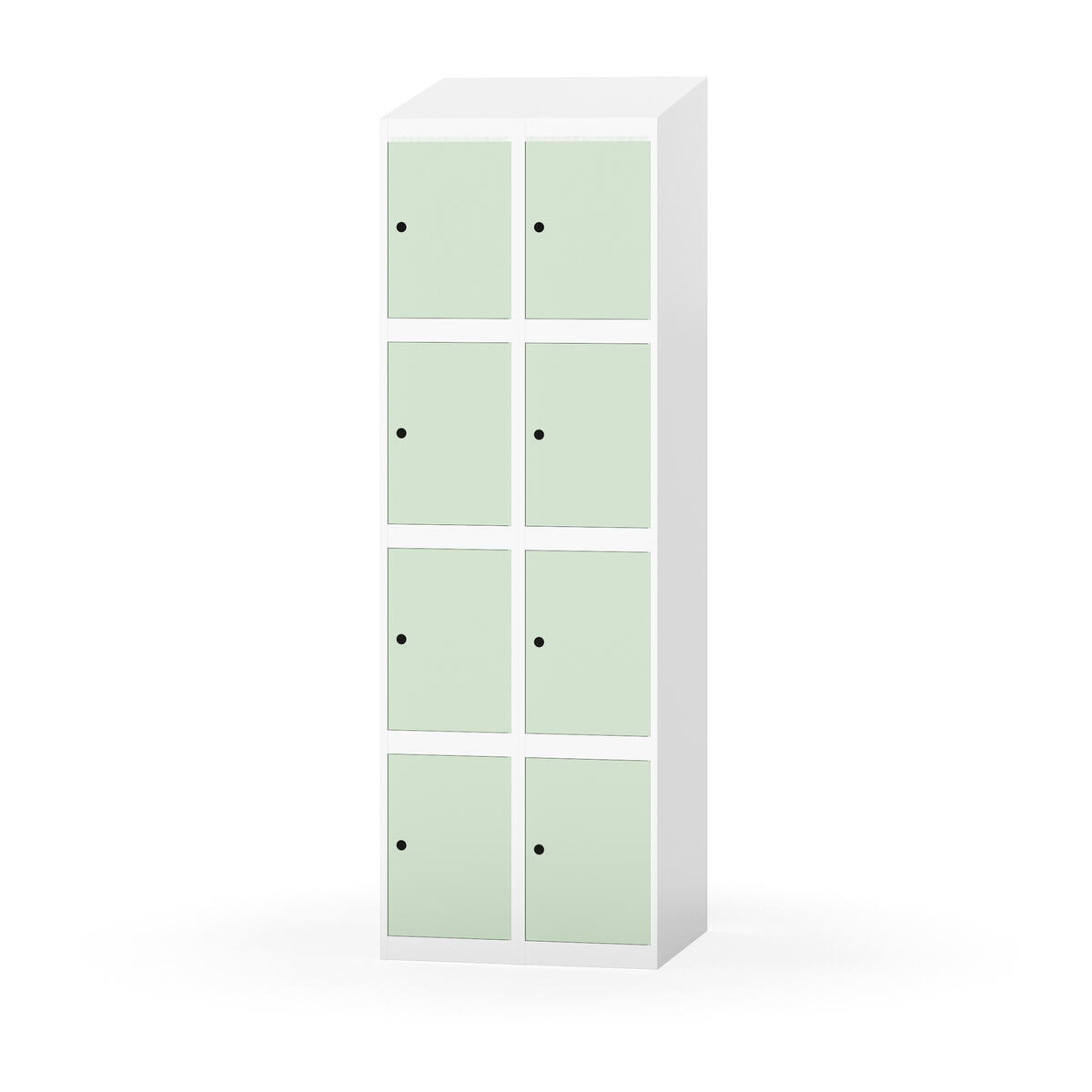 Boxskåp med helsvetsad stomme. Välj mellan plåt eller laminatdörr. Plåtdörren är försedd med dörrstopp i stål och infälld förstärkning kring låshålet. Laminatdörr infälld i stålram försedd med dörrstopp i stål. Dörrar är öppningsbara 90 grader. Inredning: Ingen. Slät golvyta utan tröskel. Ventilation genom hål i tak-/bottenplåt. Observera att lås och underrede beställs på separata artikelnummer. Lås kommer att vara monterade på skåp vid leverans. Valt underrede monteras på plats.