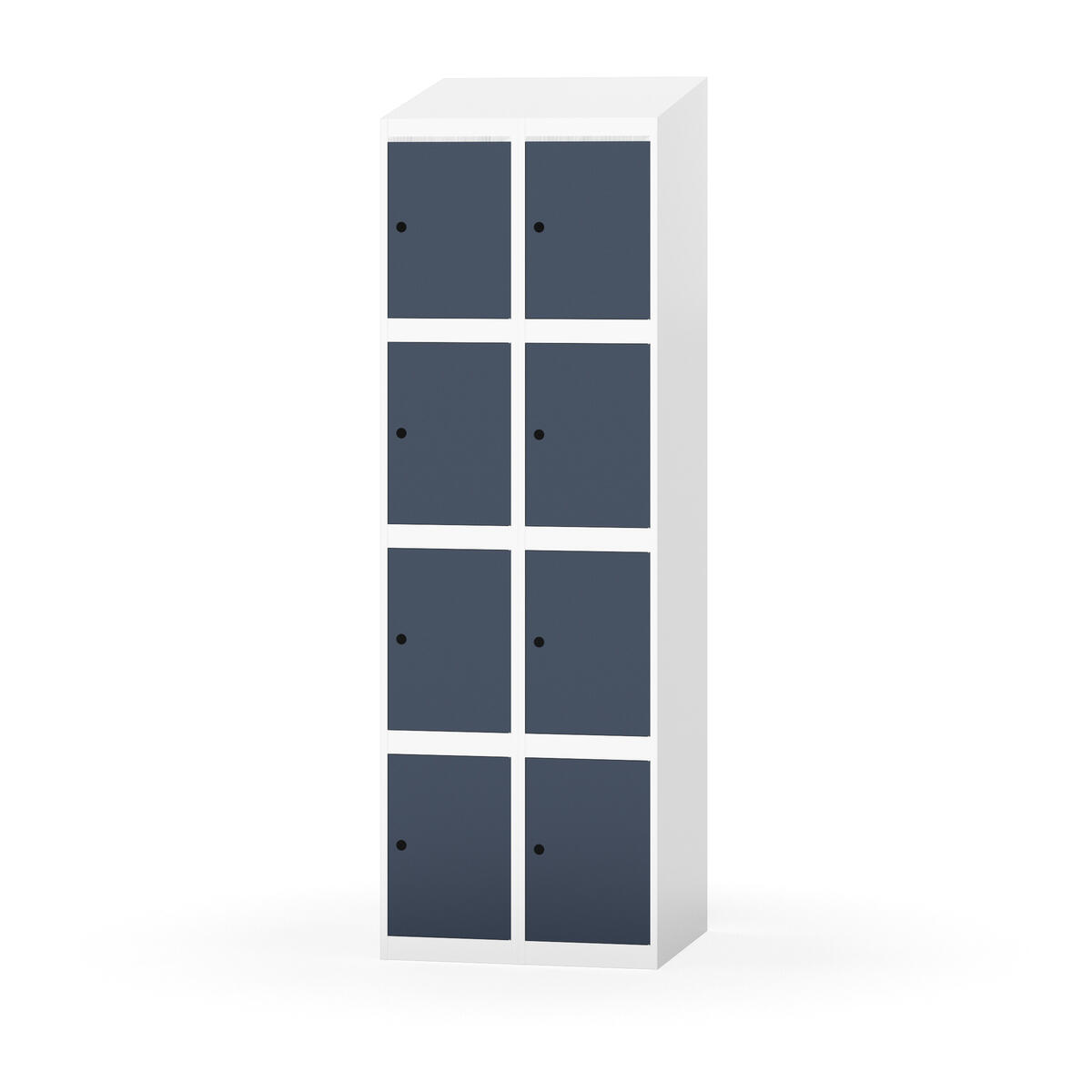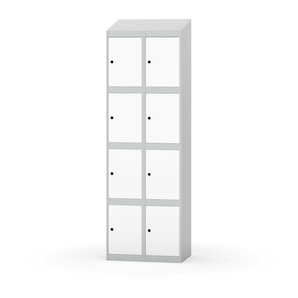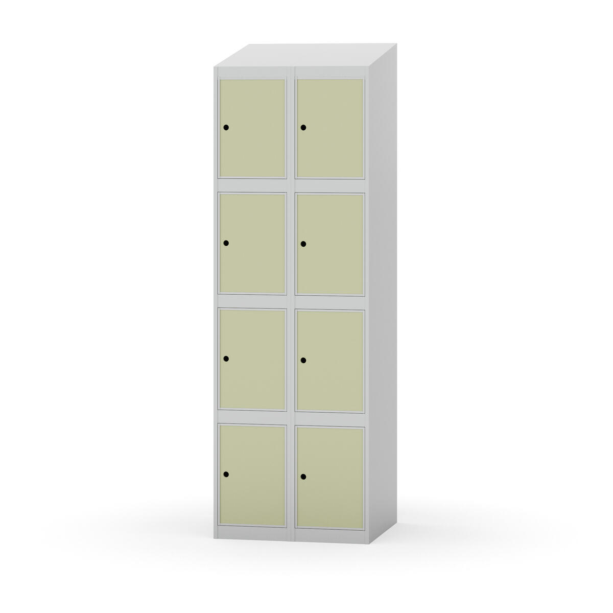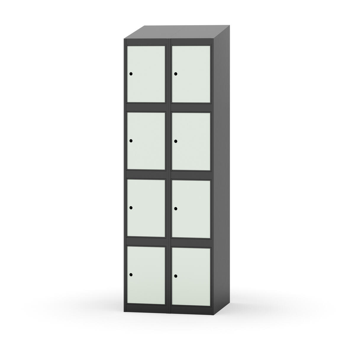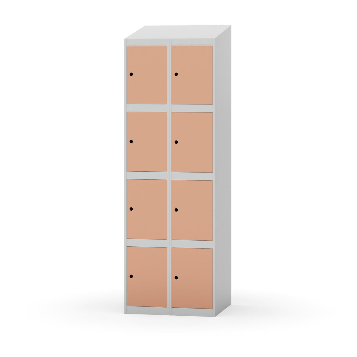 Boxskåp med helsvetsad stomme. Välj mellan plåt eller laminatdörr. Plåtdörren är försedd med dörrstopp i stål och infälld förstärkning kring låshålet. Laminatdörr infälld i stålram försedd med dörrstopp i stål. Dörrar är öppningsbara 90 grader. Inredning: Ingen. Slät golvyta utan tröskel. Ventilation genom hål i tak-/bottenplåt. Observera att lås och underrede beställs på separata artikelnummer. Lås kommer att vara monterade på skåp vid leverans. Valt underrede monteras på plats.